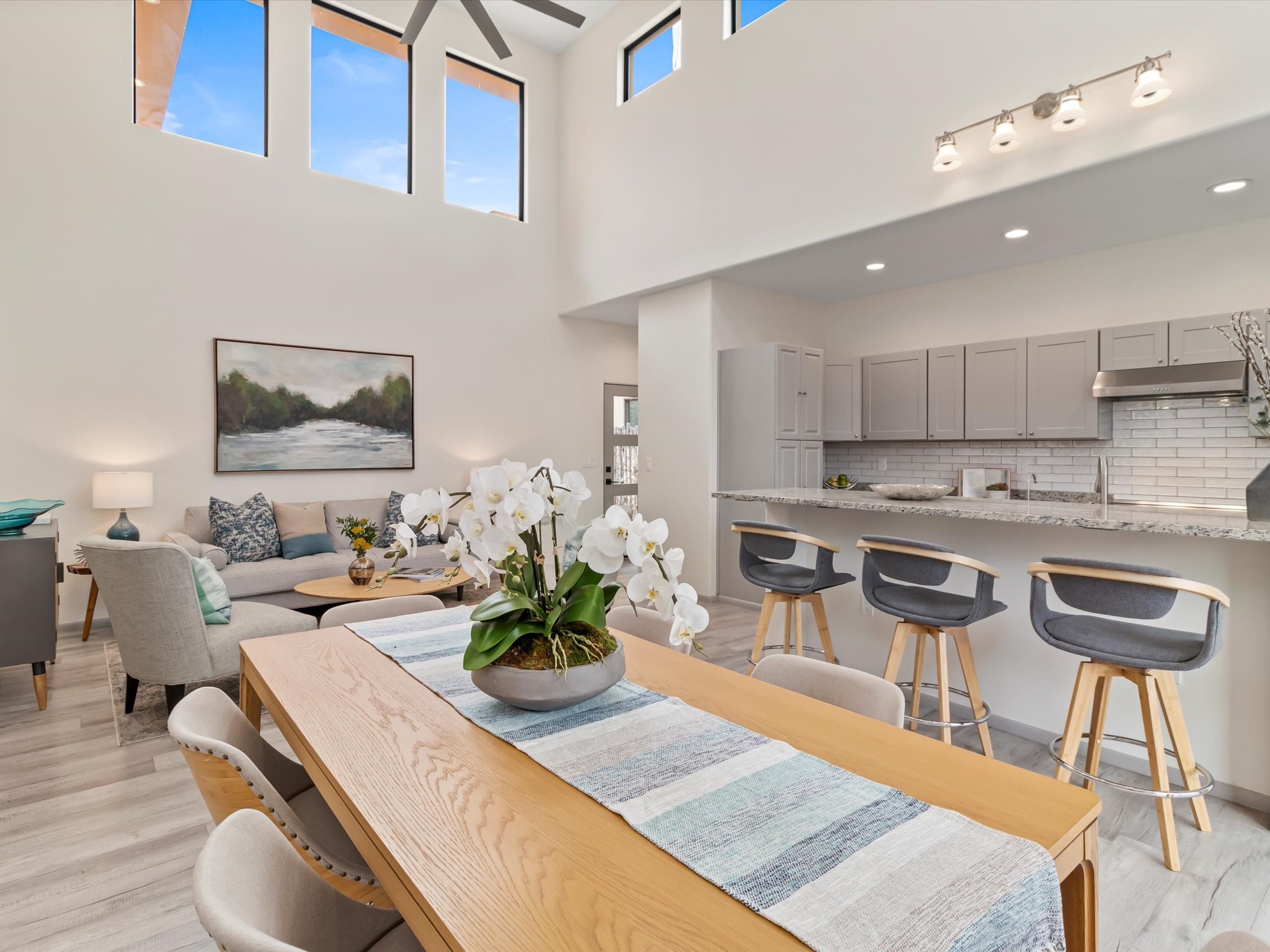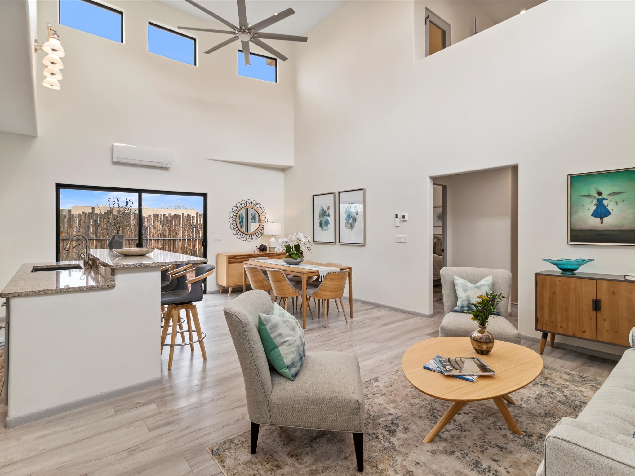 Experience exceptional Santa Fe living in this beautiful, Active Solar, contemporary condominium designed by the current owner. This all Electric, Energy Positive home boasts an Emerald Green NM Certification, Reverse Osmosis water system, new 50 AMP Electric car charger, Radiant Floor Heat (including the garage), Mitsubishi Mini splits and EnergyStar Bosch Kitchen appliances. Top of the line TPO roof with a traction layer covers the wrap-around outdoor deck where you can relax and enjoy views of the Sangre de Cristo mountains. Located in the no-outlet, highly desirable Rio Sendero Complex and nestled up against the Santa Fe River Walk Trail. The River Walk Trail accesses Downtown (1.2 miles); closely connected to two of Santa Fe's most valued areas: The Santa Fe Railyard Area with its restaurants and galleries, and the vibrant, ever-popular Santa Fe Farmers Market (1.1 miles) or go west to enjoy miles of open connected trails. For daily needs, across the street, are restaurants, groceries and a new gastro-pub. At home, the open-plan kitchen and living areas have beautiful soaring ceilings and access to a lovely ground floor rear patio. A downstairs bedroom could double as an office and the primary upstairs bedroom feels separate and cozy with its en suite bath. Low water landscape on drip irrigation. Less than five years old, this home is truly one of a kind and will garner much interest. Must see!The County Assessor shows Square footage at 1231 which differs from the builder's plans. Neither Listing Broker or Seller warrant the square footage of the lot or building. If the size of the home or lot is of material consideration to the Buyer, then the Buyer should have them measured.