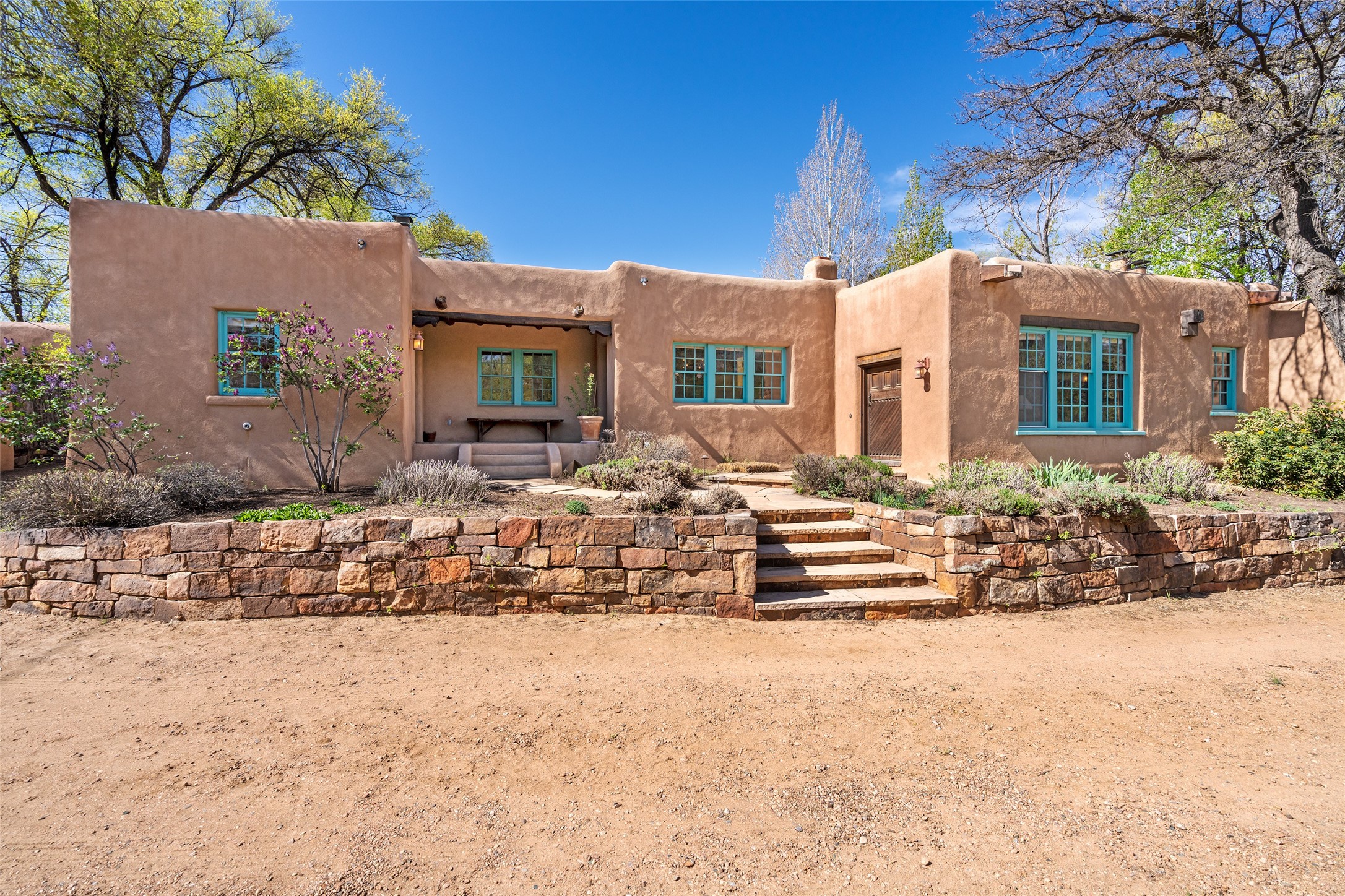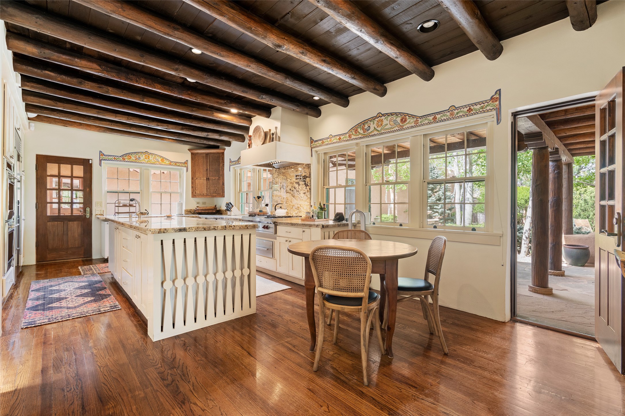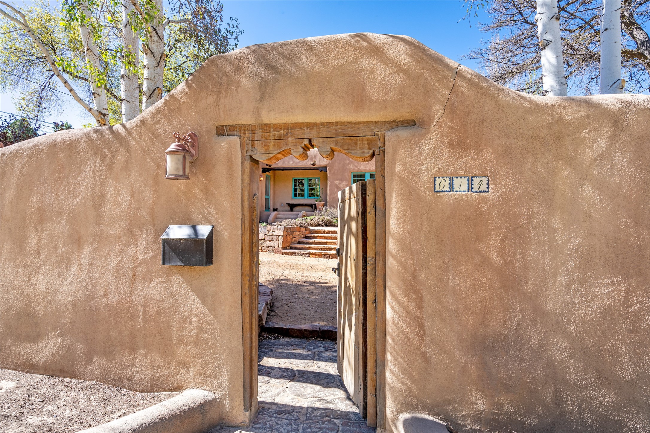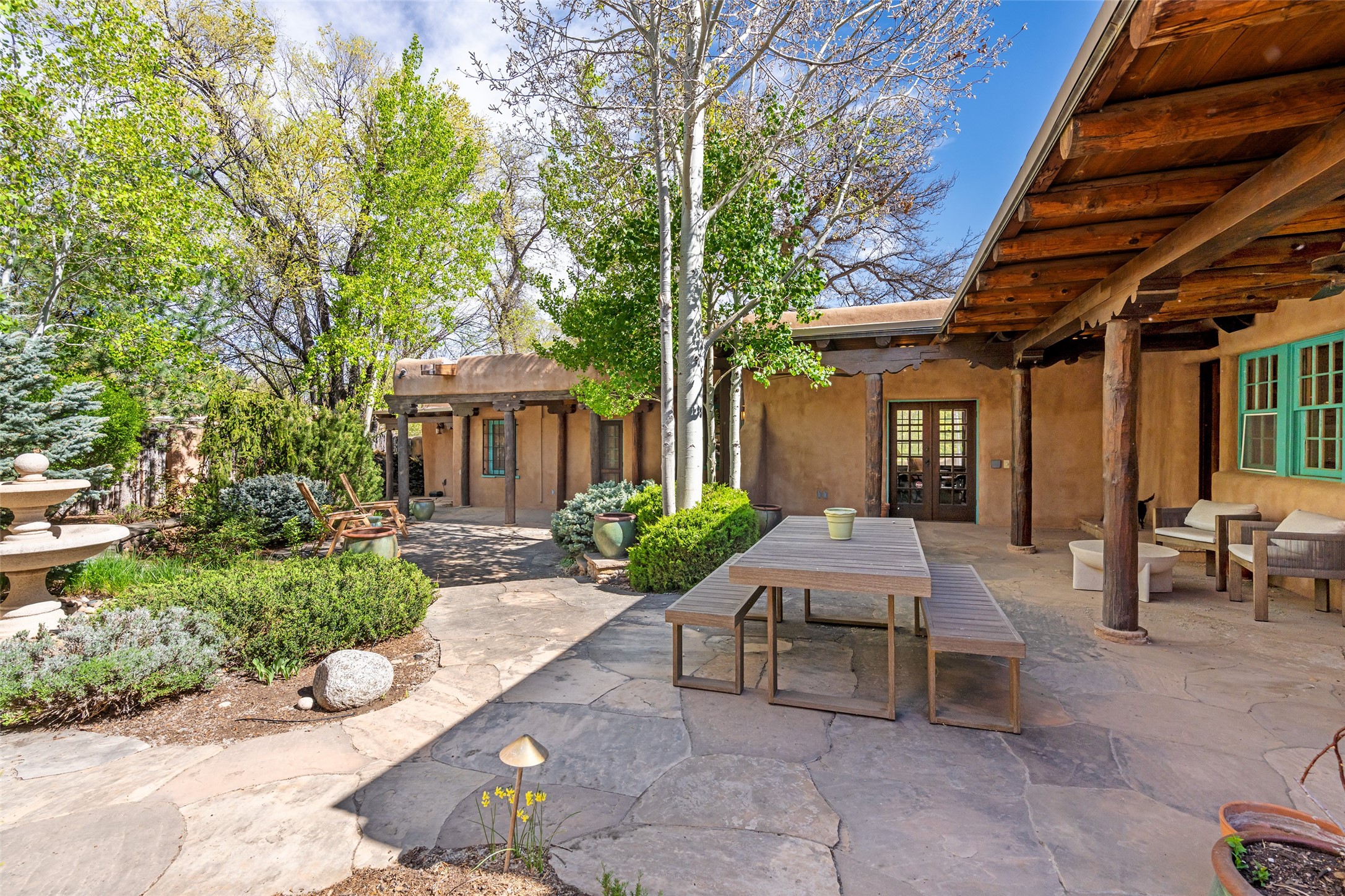 Tucked discreetly behind gates on the quiet, unpaved stretch of East Alameda, this exceptional property offers a rare chance to own one of Santa Fe's Historic Eastside compounds. Centered around a private, lushly landscaped courtyard, the residence includes a classic 3-bedroom main house and a charming casita. The main home is steeped in rich history--its 1929 addition is believe to be the first commission awarded to renowned architect John Gaw Meem. Authentic New Mexican details abound, from hand-hewn vigas to rich wood floors, adobe walls and hand-poured glass windows that speak to the home's timeless character. The chef's kitchen anchors the main house, featuring granite countertops, Wolf and Subzero appliances, and luxurious touches such as a pot filler, wine cooler, wet bar, and generous workspace. There's a small room off the front portal with its own kiva fireplace - an ideal office. The third bedroom has shelving, a sink and extra studio lighting. Added later the casita mirrors the charm of the main house with classic finishes blended seamlessly with modern comforts. Designed to function as a deluxe primary suite, it boasts two elegant bathrooms, a second bedroom that could be used as workout room. The primary bedroom has a kiva and doors opening to the courtyard. The central courtyard, ringed with mature aspens and vibrant flowering plants, offers an enchanting backdrop for al fresco dining or quiet moments of reflection. With a new roof in spring 2024 and mini splits this home is ready for its new owners to move in. It's rare to find these oversized lots in the Historic Eastside, a one-car garage with extra storage and ample parking--so close to the historic Plaza. Located just steps from the Santa Fe River Trail, Canyon Road galleries and restaurants; this walled compound offers an unparalleled blend of privacy and classic Santa Fe charm in one of the city's most beloved neighborhoods.
