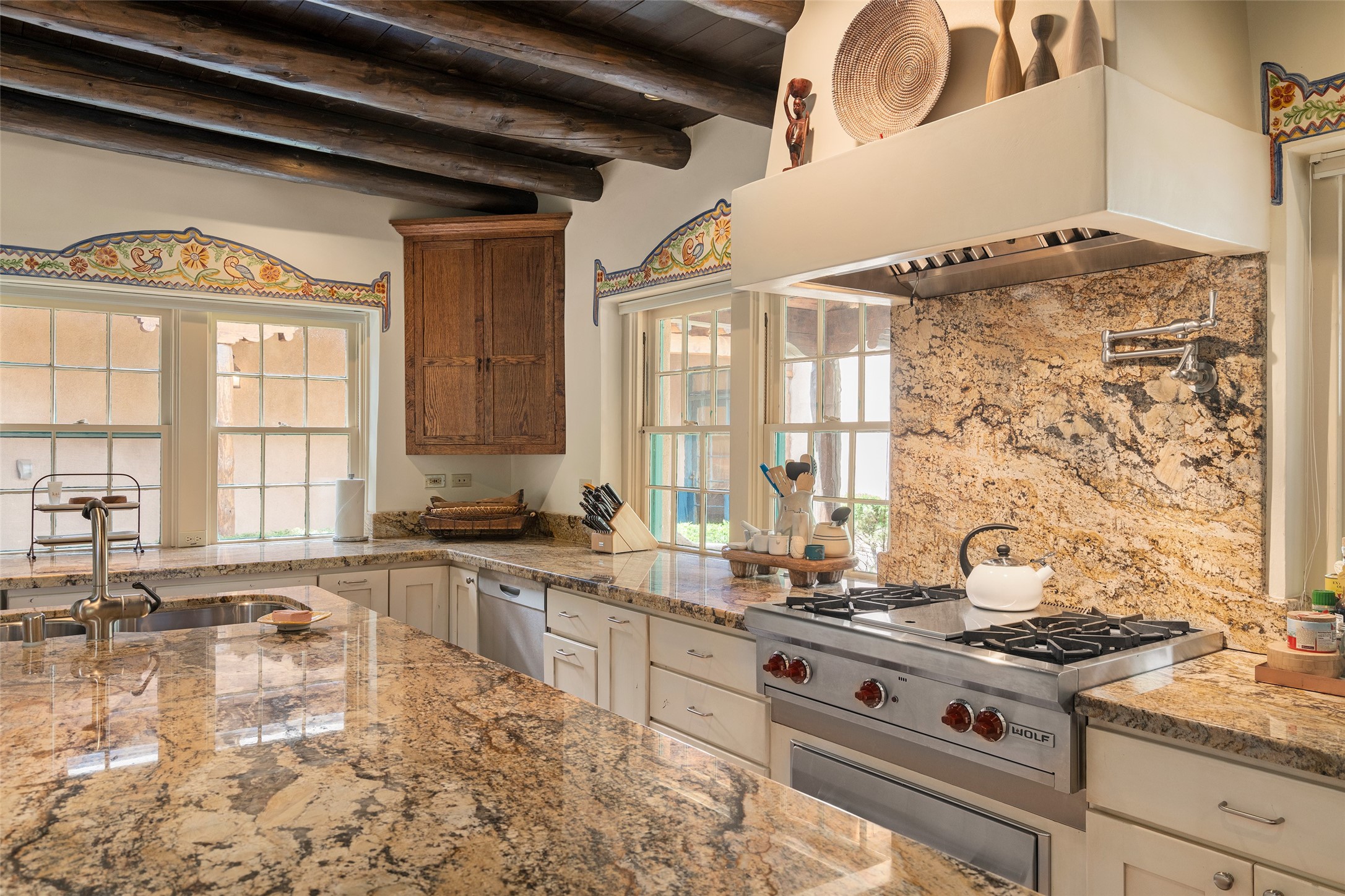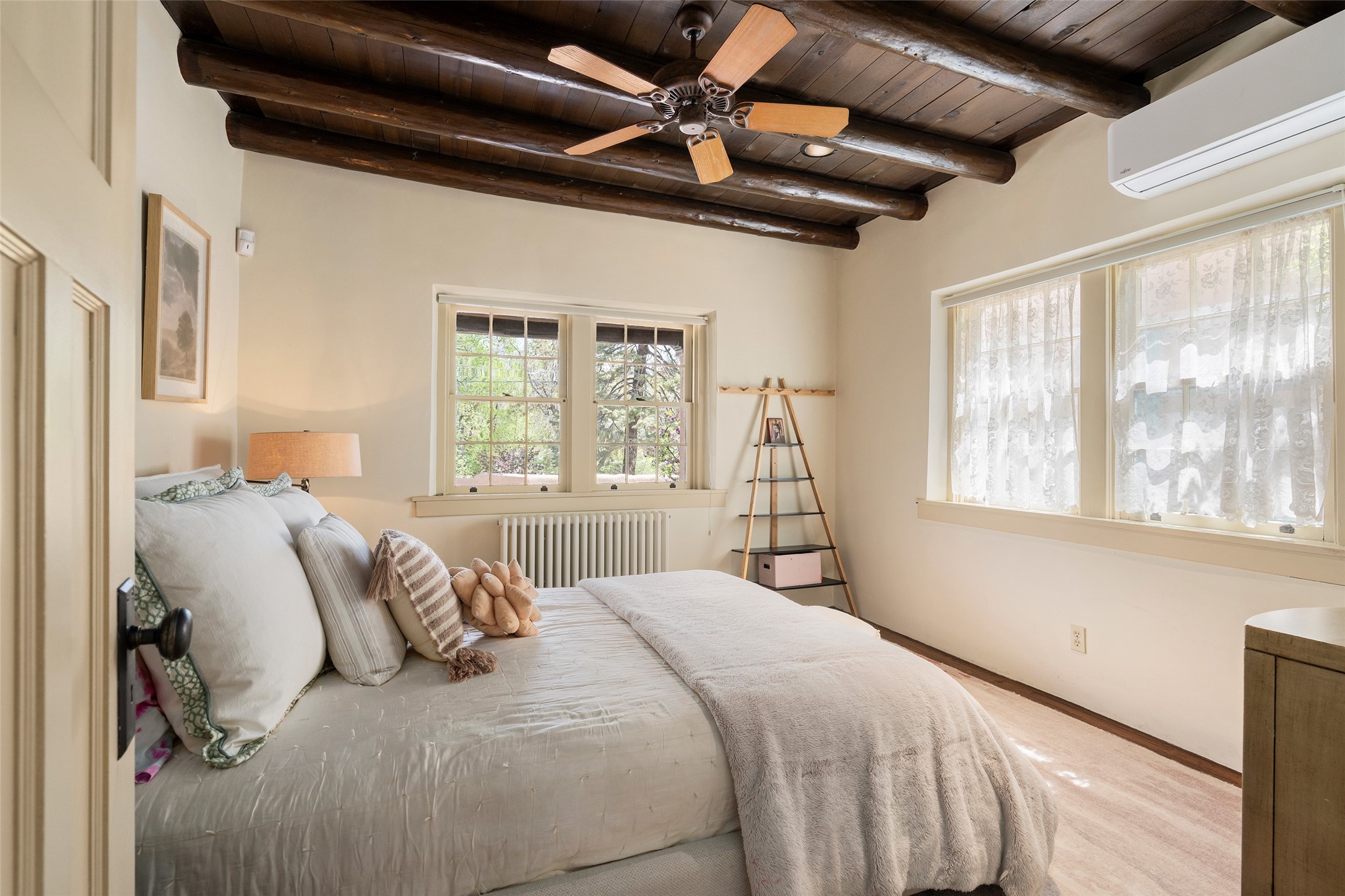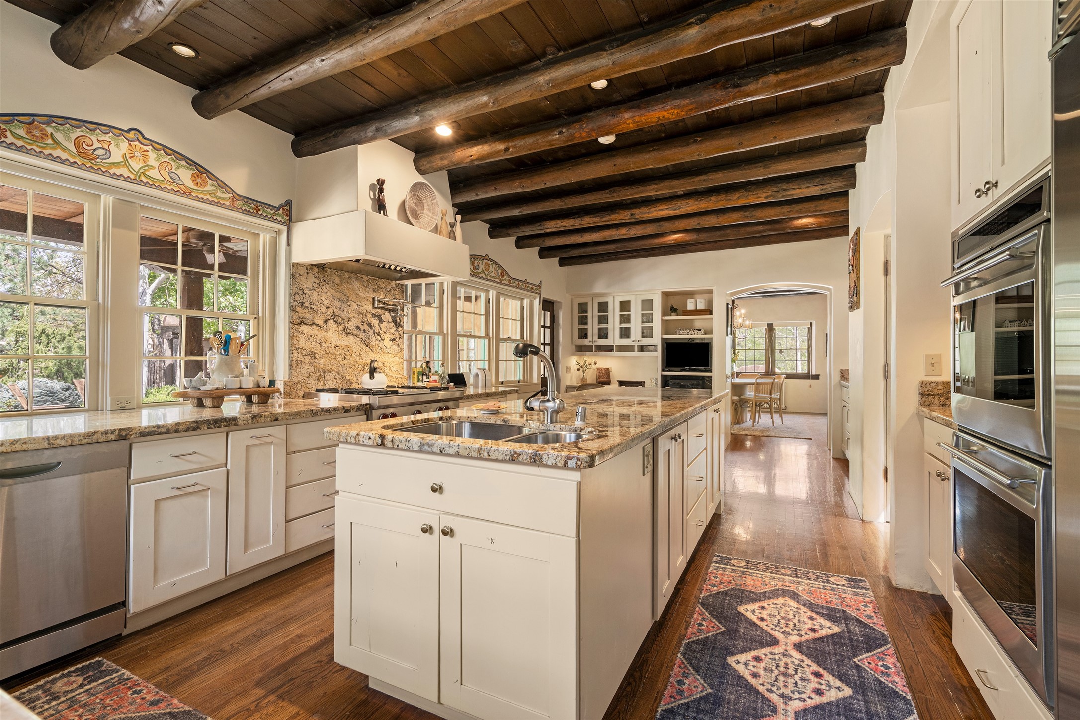 Tucked discreetly behind gates on the quiet, unpaved stretch of East Alameda, this exceptional property offers a rare chance to own one of Santa Fe's Historic Eastside compounds. Centered around a private, lushly landscaped courtyard, the residence includes a classic 3-bedroom main house and a charming casita. The main home is steeped in rich history--its 1929 addition is believe to be the first commission awarded to renowned architect John Gaw Meem. Authentic New Mexican details abound, from hand-hewn vigas to rich wood floors, adobe walls and hand-poured glass windows that speak to the home's timeless character. The chef's kitchen anchors the main house, featuring granite countertops, Wolf and Subzero appliances, and luxurious touches such as a pot filler, wine cooler, wet bar, and generous workspace. There's a small room off the front portal with its own kiva fireplace - an ideal office. The third bedroom has shelving, a sink and extra studio lighting. Added later the casita mirrors the charm of the main house with classic finishes blended seamlessly with modern comforts. Designed to function as a deluxe primary suite, it boasts two elegant bathrooms, a second bedroom that could be used as workout room. The primary bedroom has a kiva and doors opening to the courtyard. The central courtyard, ringed with mature aspens and vibrant flowering plants, offers an enchanting backdrop for al fresco dining or quiet moments of reflection. With a new roof in spring 2024 and mini splits this home is ready for its new owners to move in. It's rare to find these oversized lots in the Historic Eastside, a one-car garage with extra storage and ample parking--so close to the historic Plaza. Located just steps from the Santa Fe River Trail, Canyon Road galleries and restaurants; this walled compound offers an unparalleled blend of privacy and classic Santa Fe charm in one of the city's most beloved neighborhoods.