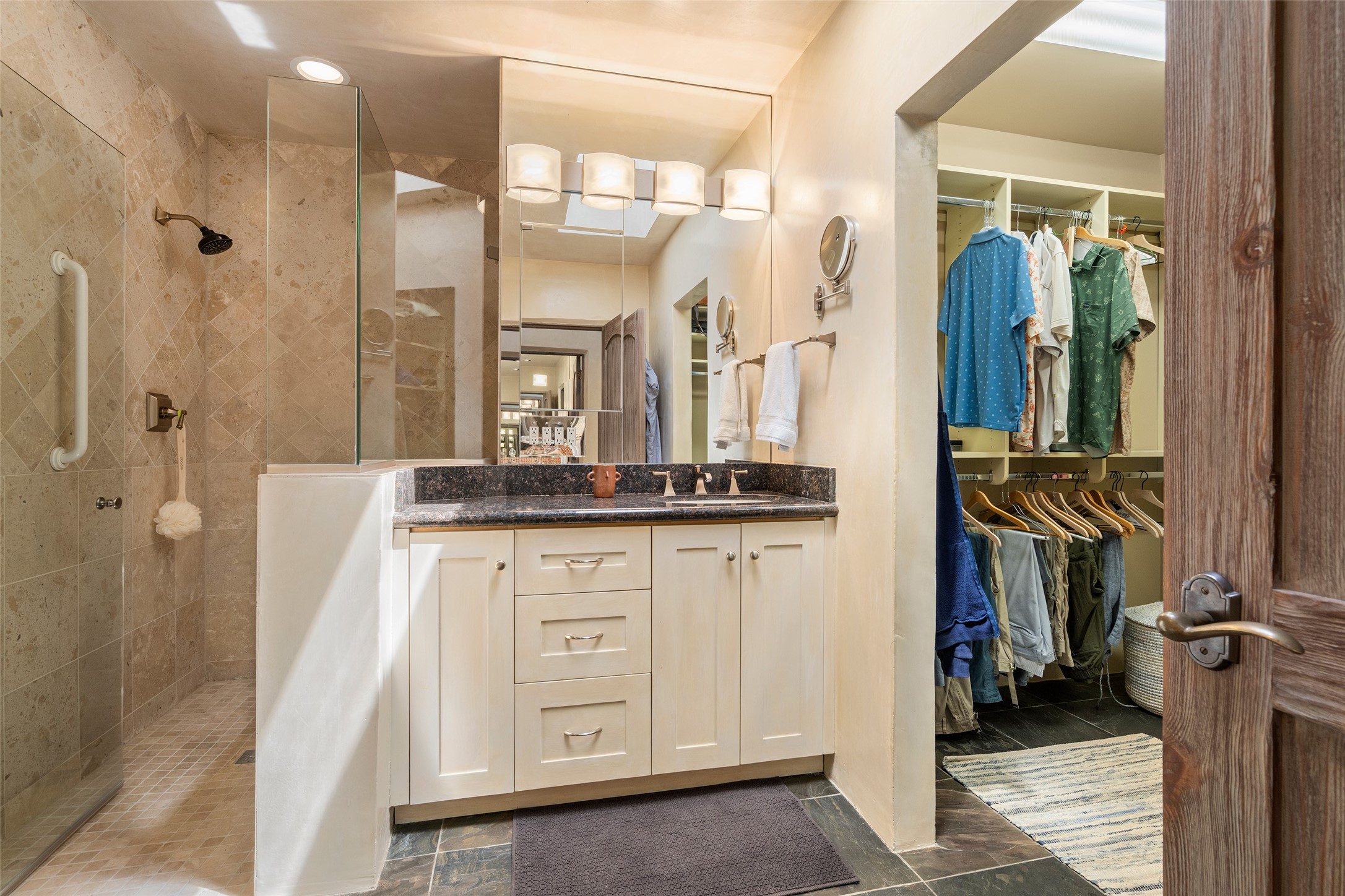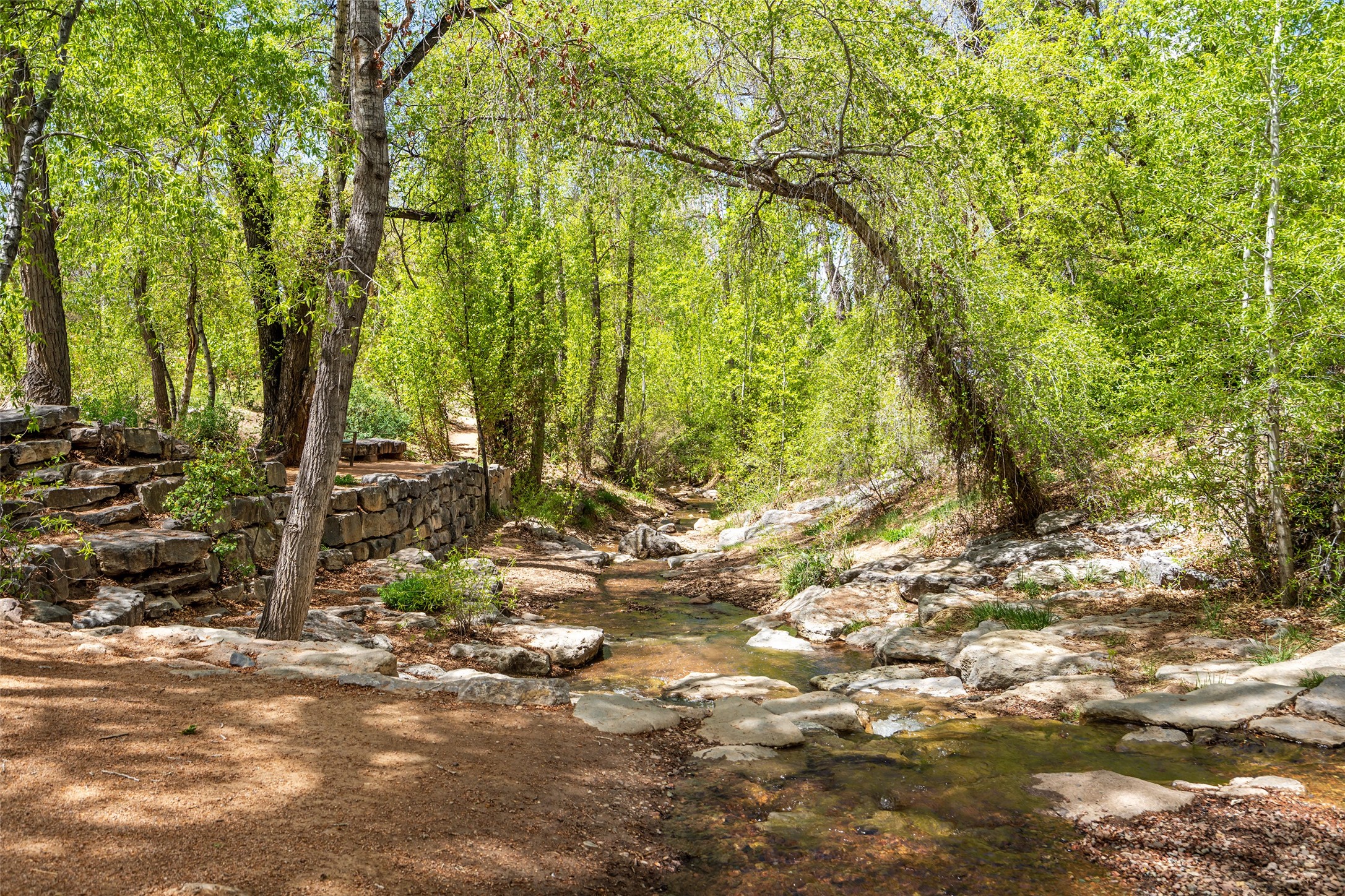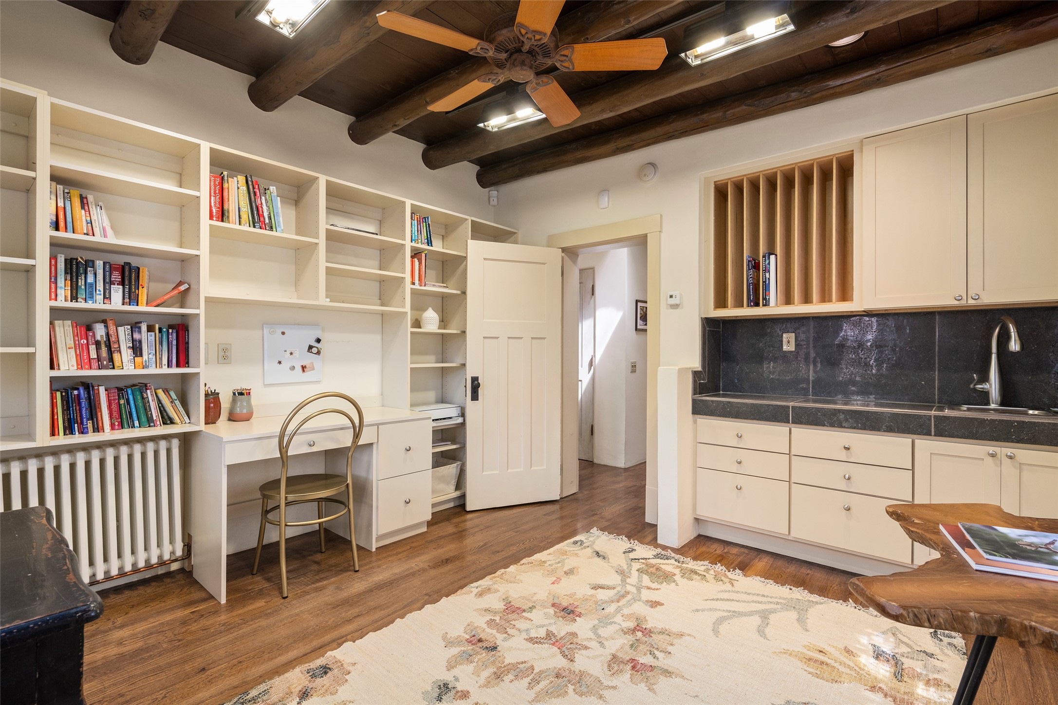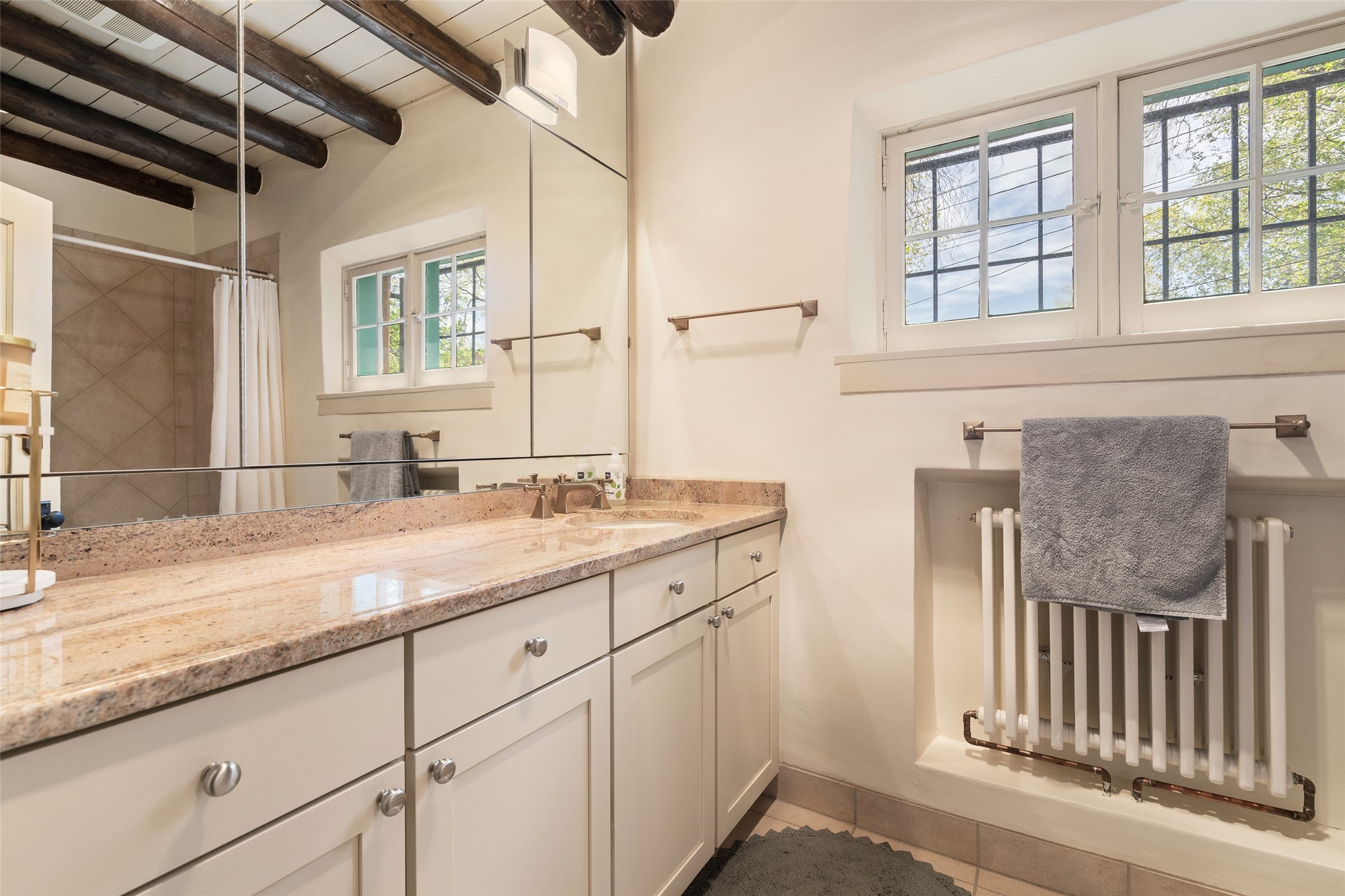 Tucked discreetly behind gates on the quiet, unpaved stretch of East Alameda, this exceptional property offers a rare chance to own one of Santa Fe's Historic Eastside compounds. Centered around a private, lushly landscaped courtyard, the residence includes a classic 3-bedroom main house and a charming casita. The main home is steeped in rich history--its 1929 addition is believe to be the first commission awarded to renowned architect John Gaw Meem. Authentic New Mexican details abound, from hand-hewn vigas to rich wood floors, adobe walls and hand-poured glass windows that speak to the home's timeless character. The chef's kitchen anchors the main house, featuring granite countertops, Wolf and Subzero appliances, and luxurious touches such as a pot filler, wine cooler, wet bar, and generous workspace. There's a small room off the front portal with its own kiva fireplace - an ideal office. The third bedroom has shelving, a sink and extra studio lighting. Added later the casita mirrors the charm of the main house with classic finishes blended seamlessly with modern comforts. Designed to function as a deluxe primary suite, it boasts two elegant bathrooms, a second bedroom that could be used as workout room. The primary bedroom has a kiva and doors opening to the courtyard. The central courtyard, ringed with mature aspens and vibrant flowering plants, offers an enchanting backdrop for al fresco dining or quiet moments of reflection. With a new roof in spring 2024 and mini splits this home is ready for its new owners to move in. It's rare to find these oversized lots in the Historic Eastside, a one-car garage with extra storage and ample parking--so close to the historic Plaza. Located just steps from the Santa Fe River Trail, Canyon Road galleries and restaurants; this walled compound offers an unparalleled blend of privacy and classic Santa Fe charm in one of the city's most beloved neighborhoods.