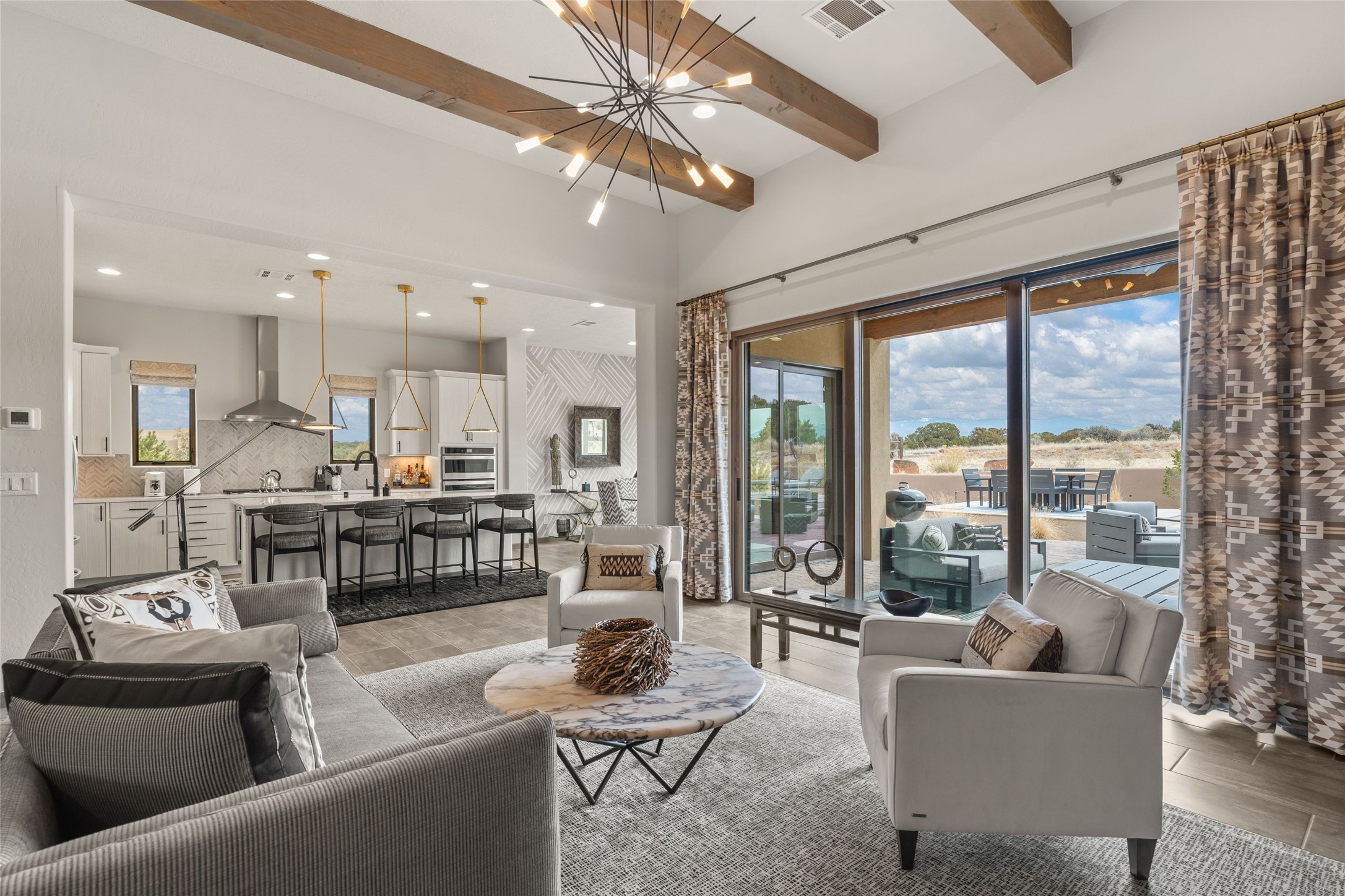 This immaculate home in Las Campanas offers a wonderful blend of privacy, space, and striking Sangre de Cristo Mountain views. Set on one of the most desirable lots in the neighborhood, the home's outdoor living spaces are a highlight. Thoughtfully designed, it balances traditional Santa Fe elements--vigas and beams--with a clean, contemporary finish. The open, light-filled interior features upgraded lighting, designer window treatments, and desirable finishes throughout. With three bedrooms and four bathrooms, including a guest suite with its own living area, the home offers both flexibility and function. A spacious additional room off the main living area provides options for a media room, library, office, or game room. The bright kitchen boasts white quartz countertops, light wood cabinetry, and a spacious pantry. The beautifully landscaped outdoor spaces with brick and stone lined dining and relaxation areas flow from the interior creating seamless indoor-outdoor living. Located just minutes from The Club at Las Campanas, the home offers convenient access to dining, golf, the Spa and Fitness Center, tennis, and pickleball, for the owner who chooses to join the Club. The current owner's Equity Golf membership is available for purchase by the new owner of the beautiful home.