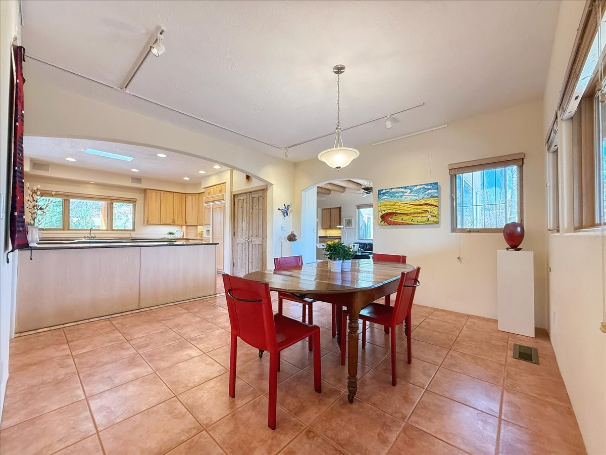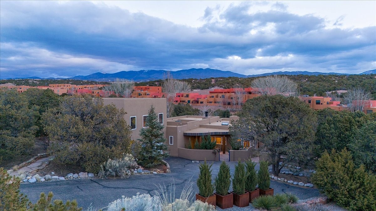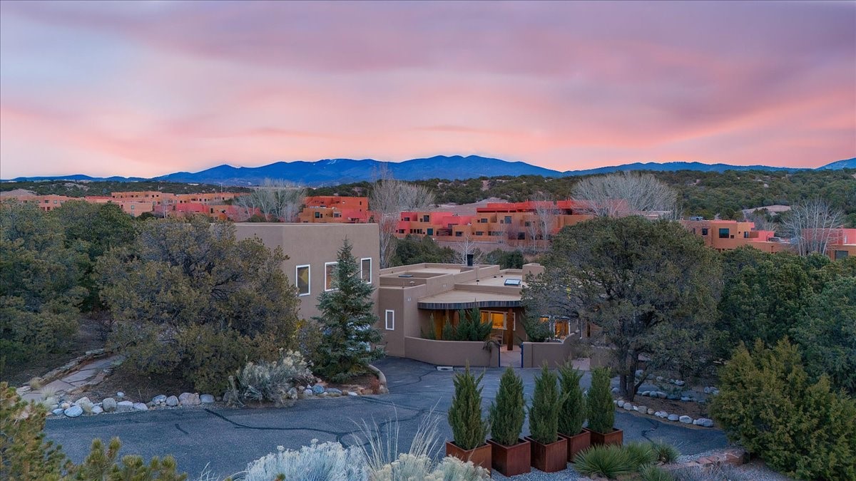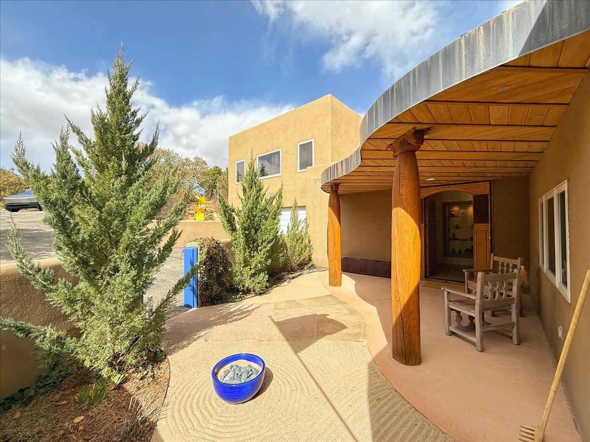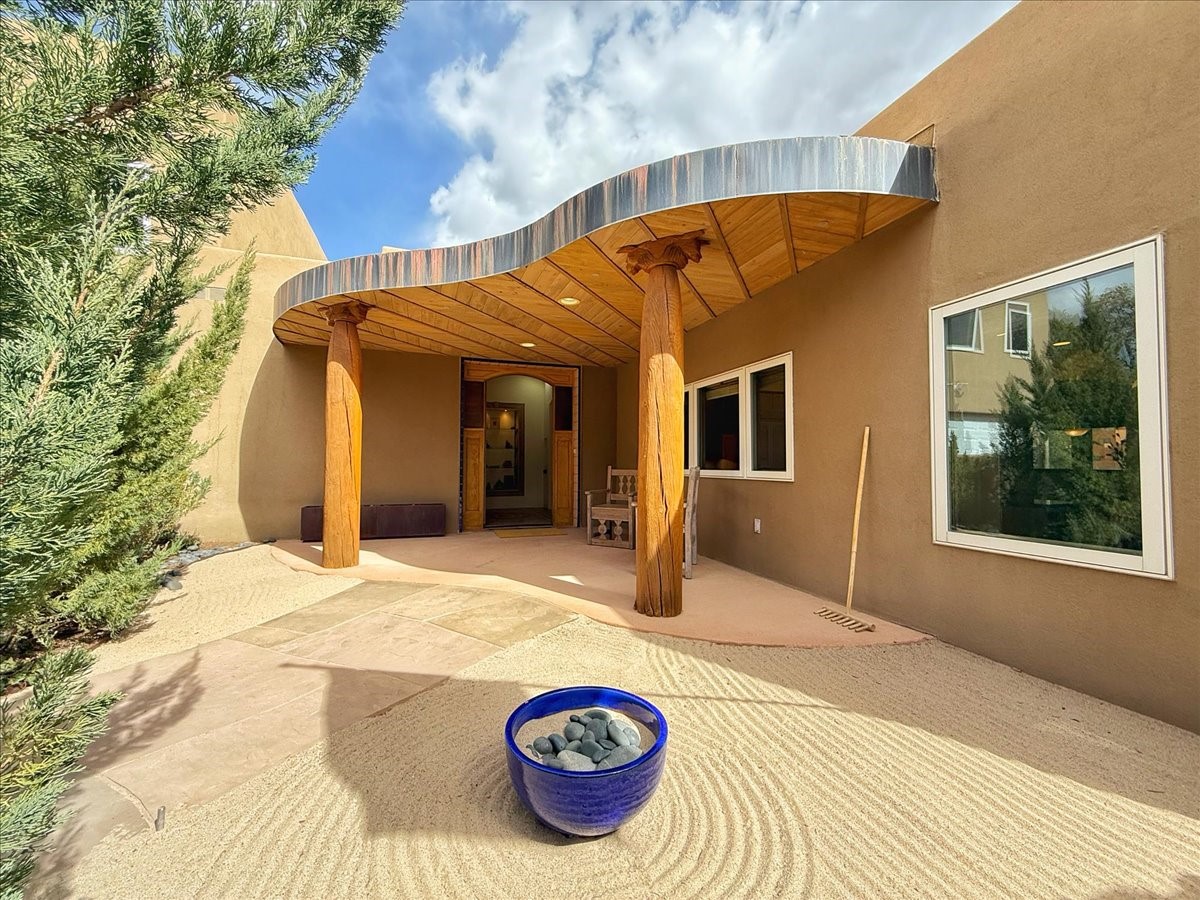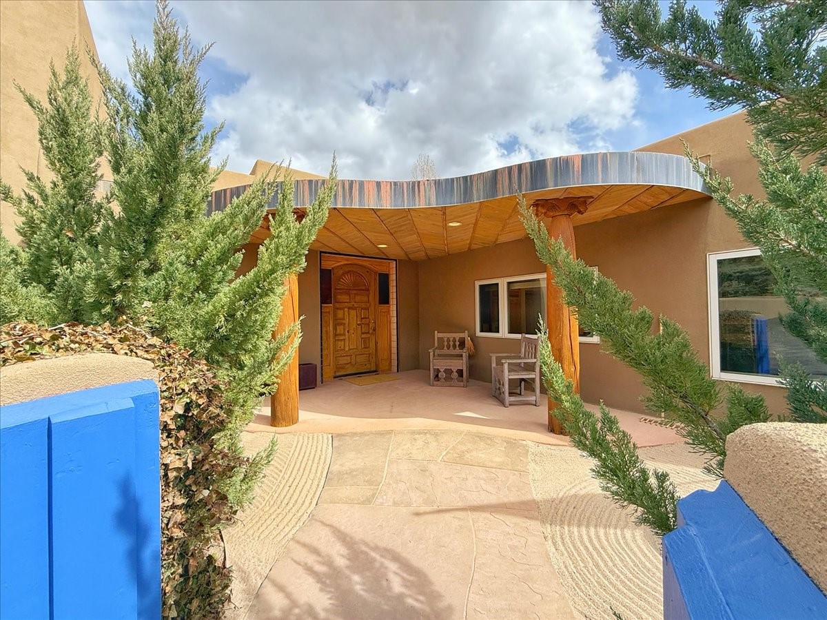 Nestled on Santa Fe's coveted north side, this exceptional home blends artistic charm with classic Southwestern elegance. The 2,929 sq. ft. main house welcomes you with a one-of-a-kind mosaic floor entry, which sets the stage for the stunning details that follow. Tiled stair risers, soaring ceilings, and vigas add warmth and character throughout. The thoughtfully designed layout includes a primary suite with a bonus sunroom and two inviting guest rooms.An 800 sq. ft. guest house, which can be accessed from within the home or through a private entrance, provides additional space for visitors, an art studio, or a private retreat. Conveniently located near the Plaza, shopping and highway access, this home offers both tranquility and accessibility. A truly unique Santa Fe gem!