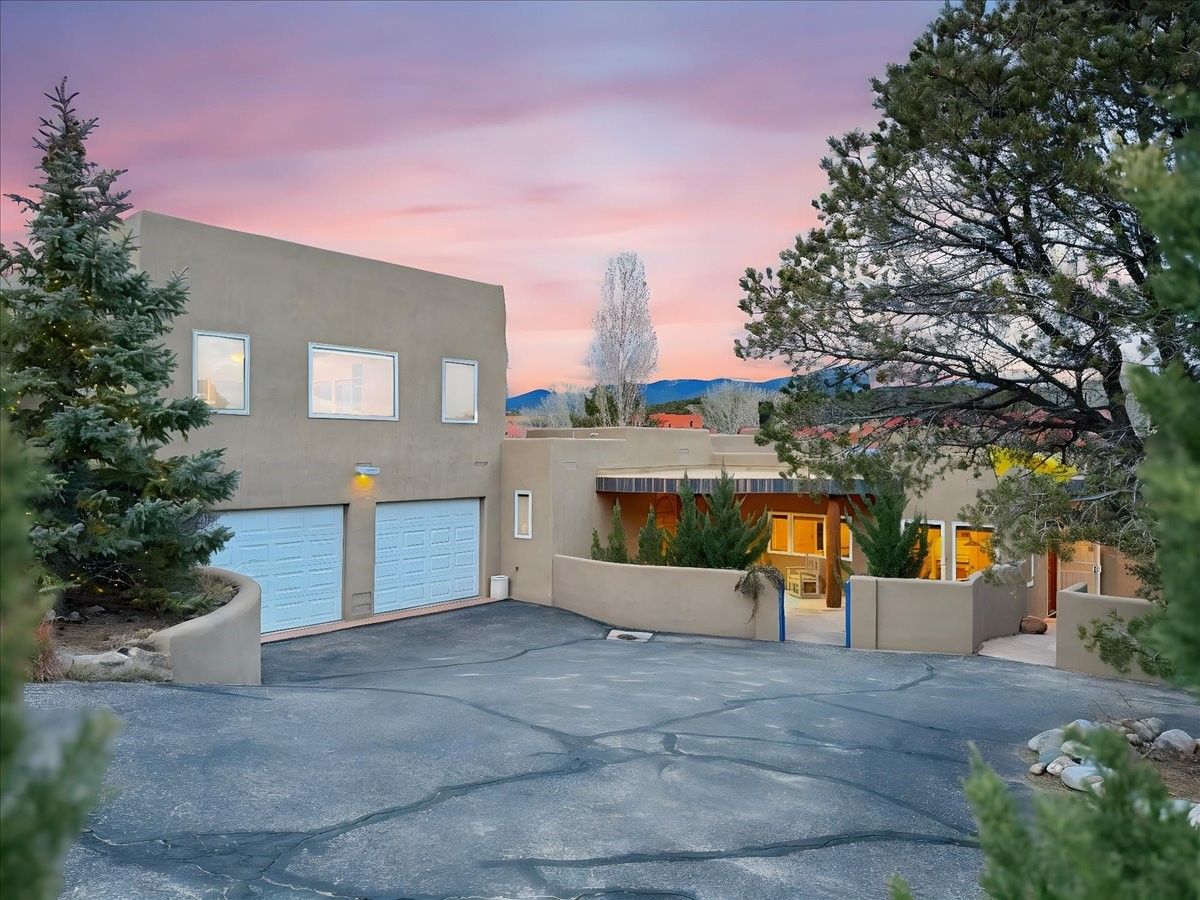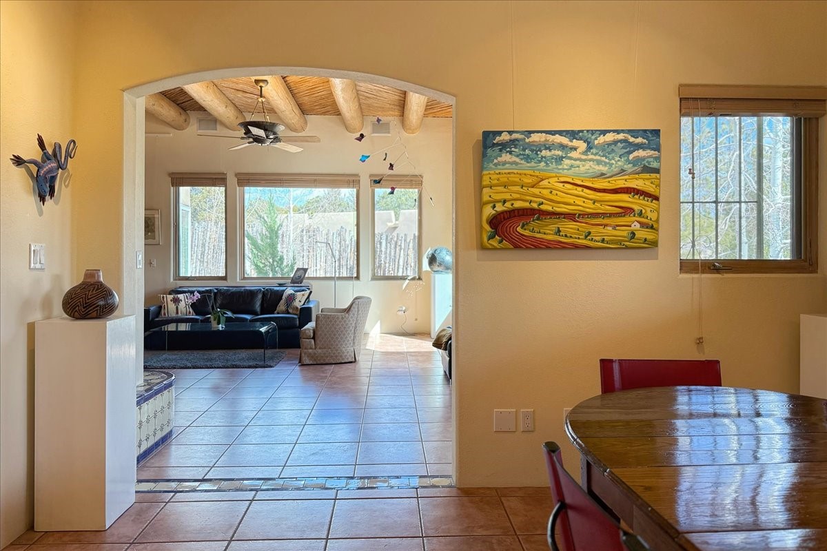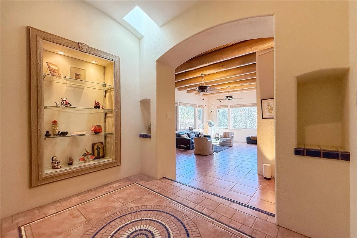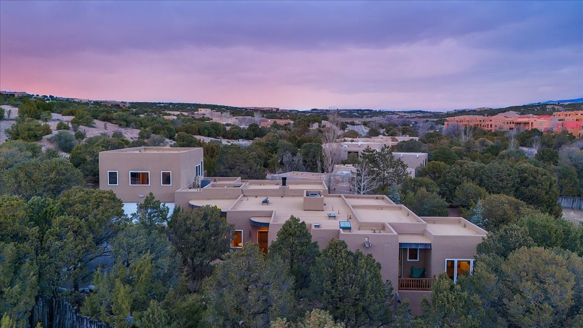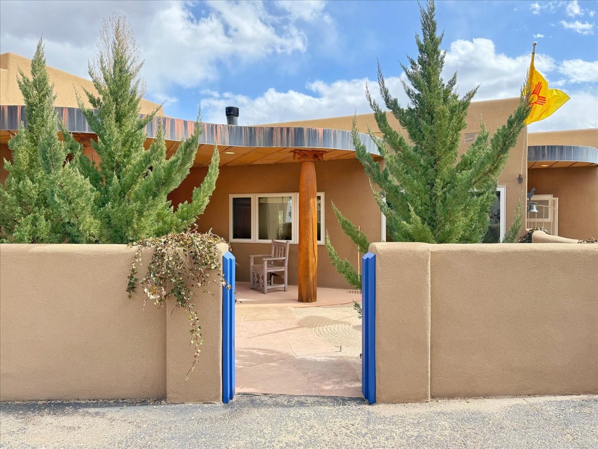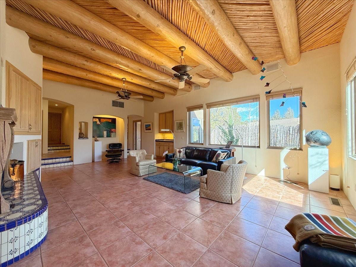 Nestled on Santa Fe's coveted north side, this exceptional home blends artistic charm with classic Southwestern elegance. The 2,929 sq. ft. main house welcomes you with a one-of-a-kind mosaic floor entry, which sets the stage for the stunning details that follow. Tiled stair risers, soaring ceilings, and vigas add warmth and character throughout. The thoughtfully designed layout includes a primary suite with a bonus sunroom and two inviting guest rooms.An 800 sq. ft. guest house, which can be accessed from within the home or through a private entrance, provides additional space for visitors, an art studio, or a private retreat. Conveniently located near the Plaza, shopping and highway access, this home offers both tranquility and accessibility. A truly unique Santa Fe gem!