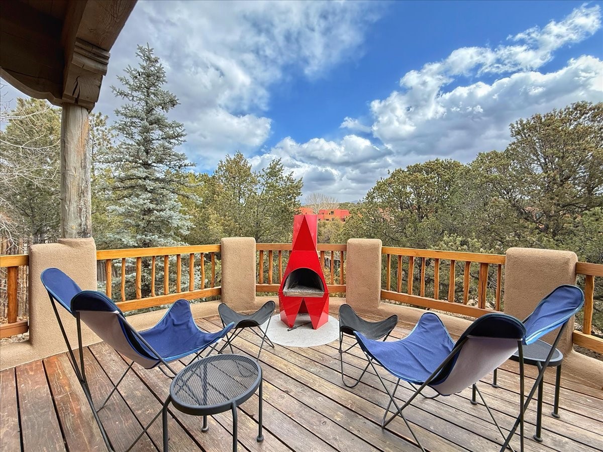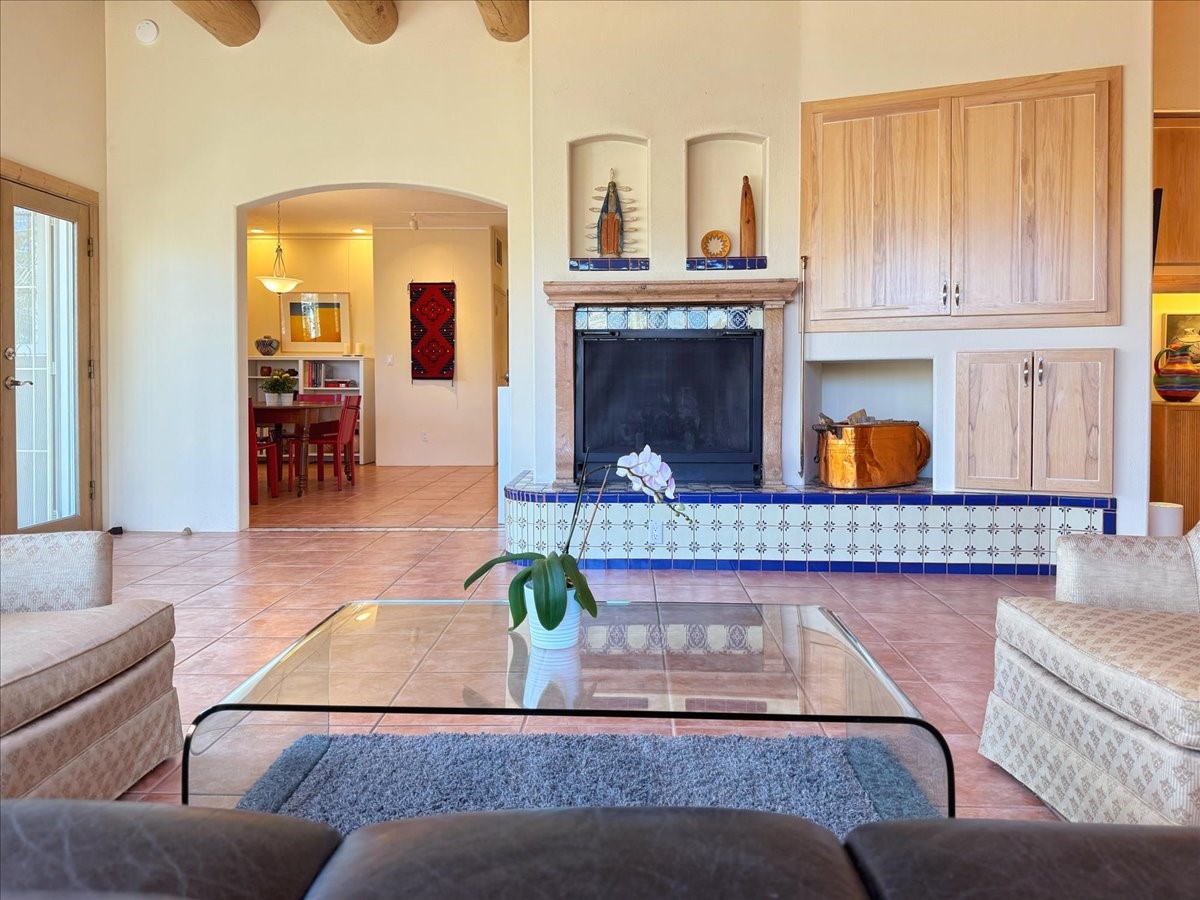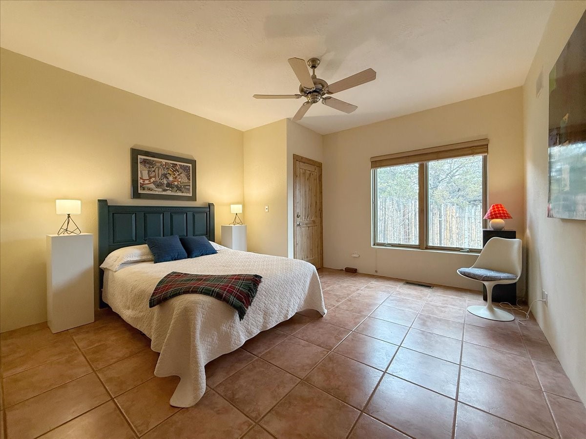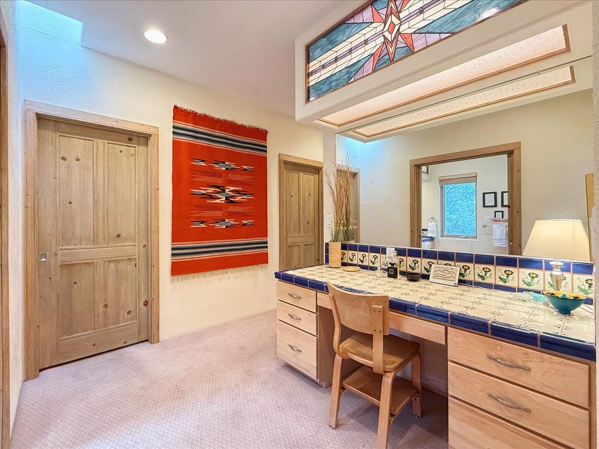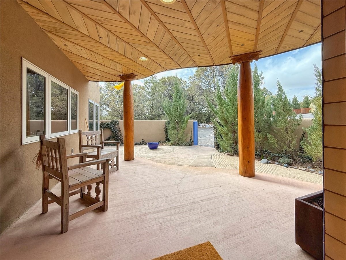 Nestled on Santa Fe's coveted north side, this exceptional home blends artistic charm with classic Southwestern elegance. The 2,929 sq. ft. main house welcomes you with a one-of-a-kind mosaic floor entry, which sets the stage for the stunning details that follow. Tiled stair risers, soaring ceilings, and vigas add warmth and character throughout. The thoughtfully designed layout includes a primary suite with a bonus sunroom and two inviting guest rooms.An 800 sq. ft. guest house, which can be accessed from within the home or through a private entrance, provides additional space for visitors, an art studio, or a private retreat. Conveniently located near the Plaza, shopping and highway access, this home offers both tranquility and accessibility. A truly unique Santa Fe gem!