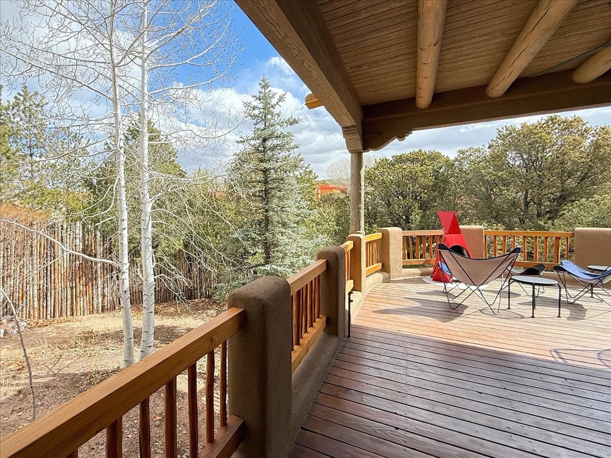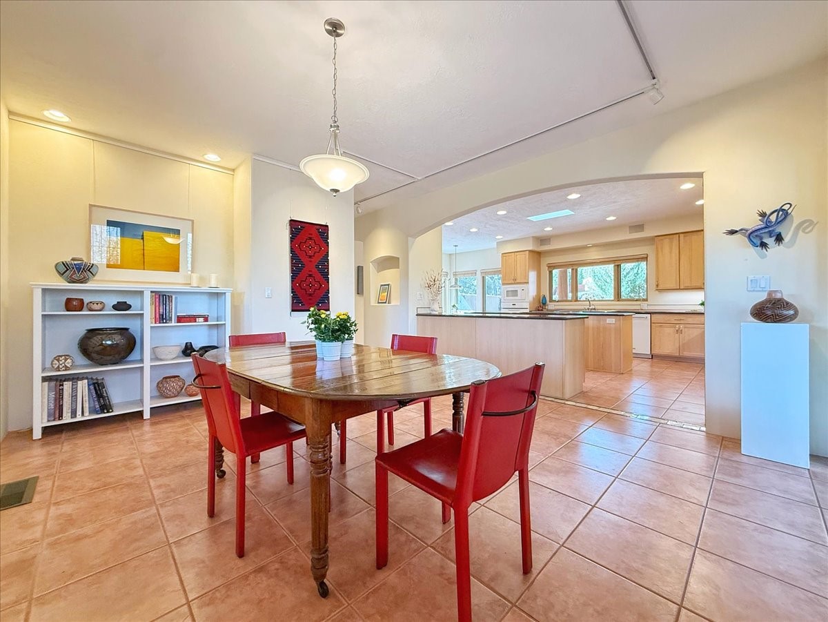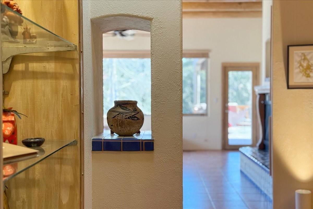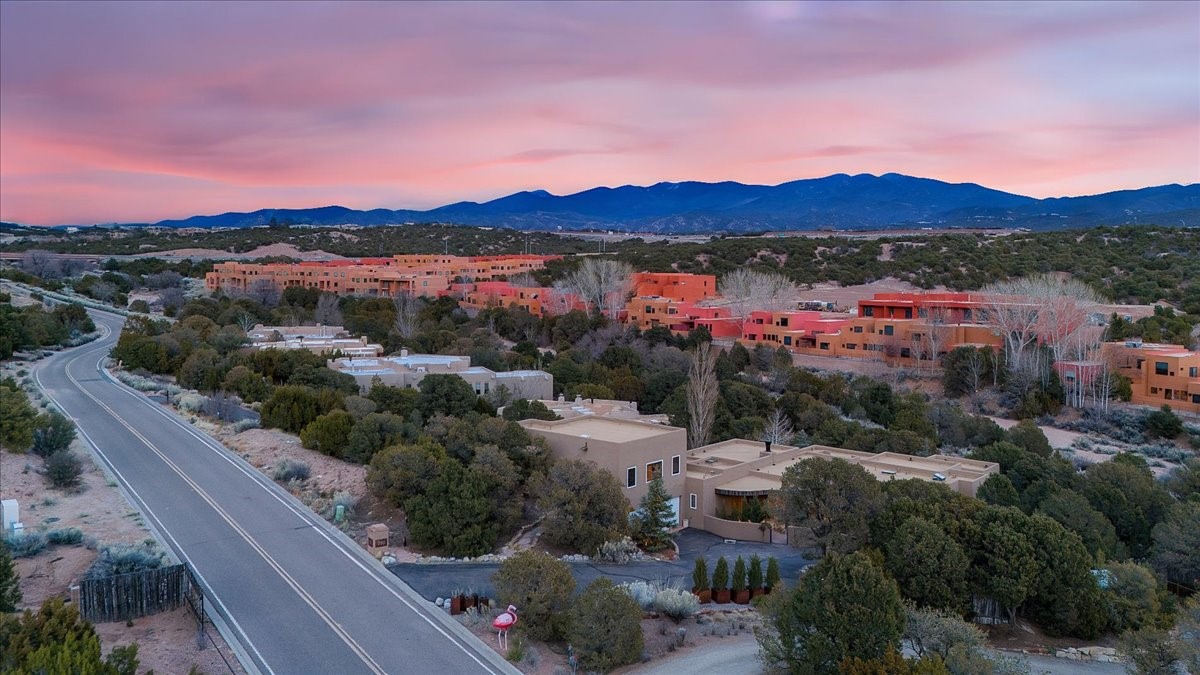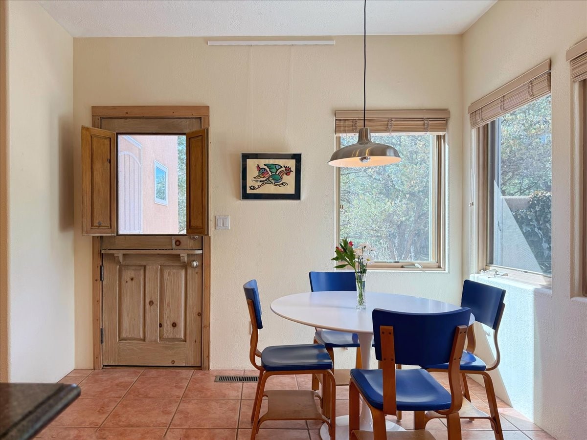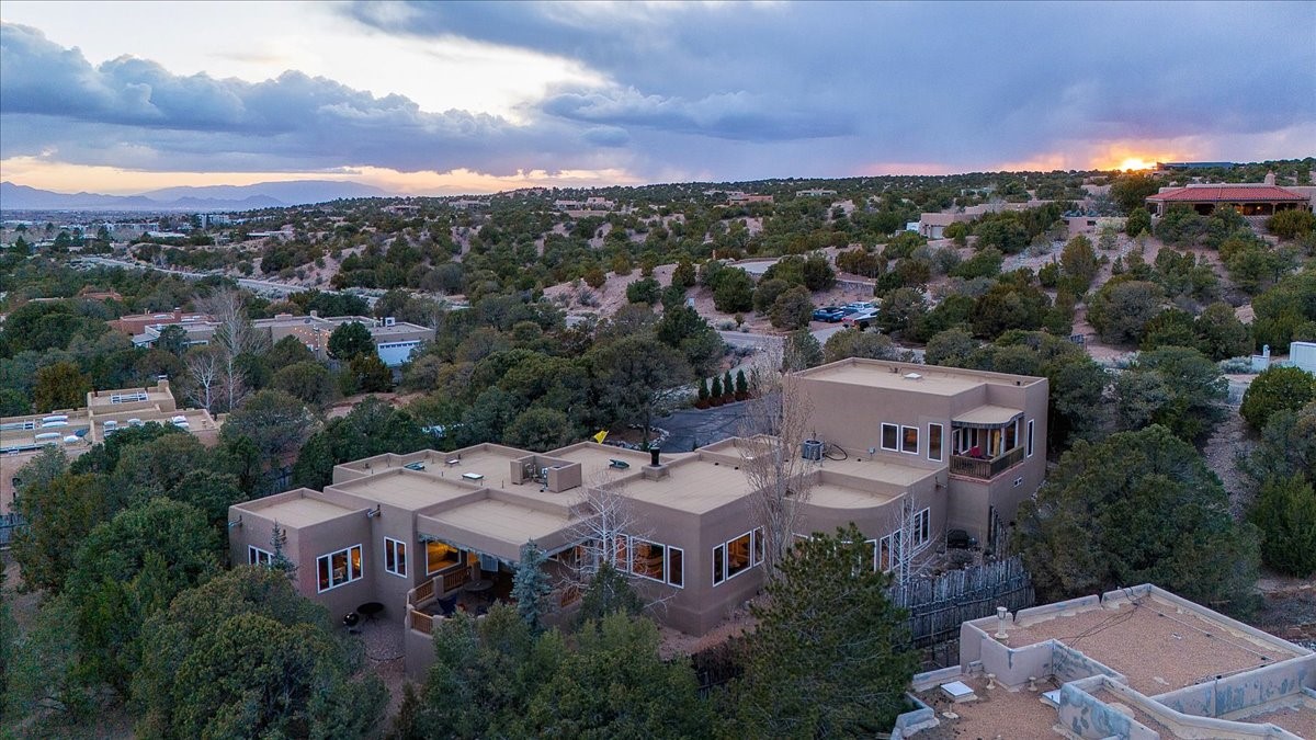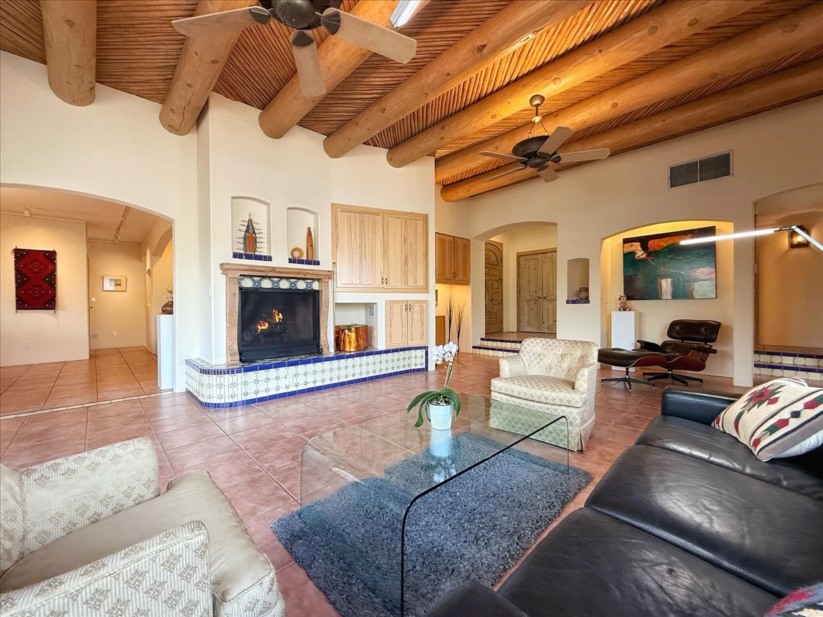 Nestled on Santa Fe's coveted north side, this exceptional home blends artistic charm with classic Southwestern elegance. The 2,929 sq. ft. main house welcomes you with a one-of-a-kind mosaic floor entry, which sets the stage for the stunning details that follow. Tiled stair risers, soaring ceilings, and vigas add warmth and character throughout. The thoughtfully designed layout includes a primary suite with a bonus sunroom and two inviting guest rooms.An 800 sq. ft. guest house, which can be accessed from within the home or through a private entrance, provides additional space for visitors, an art studio, or a private retreat. Conveniently located near the Plaza, shopping and highway access, this home offers both tranquility and accessibility. A truly unique Santa Fe gem!