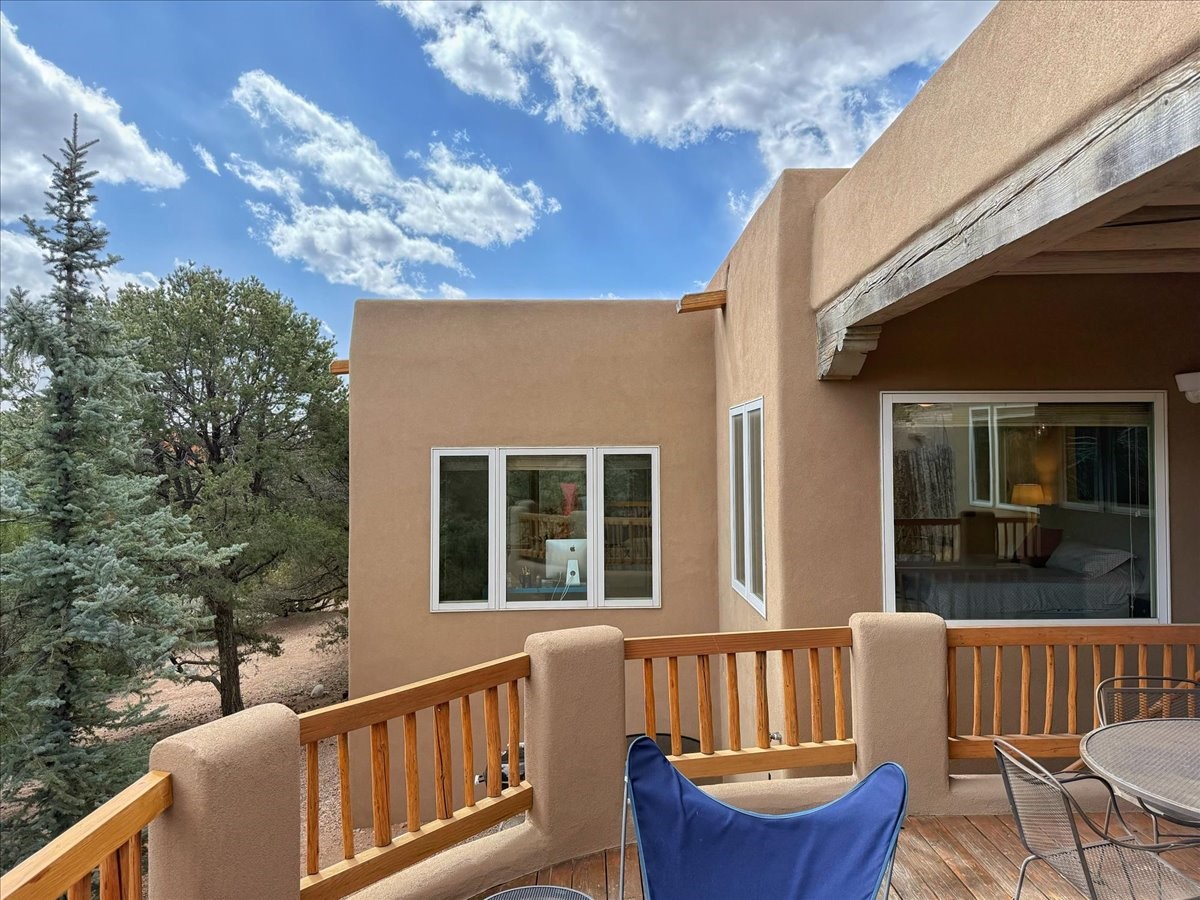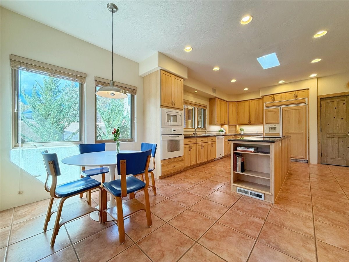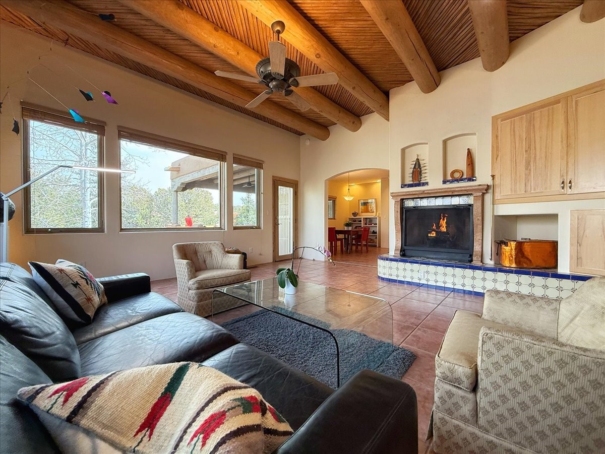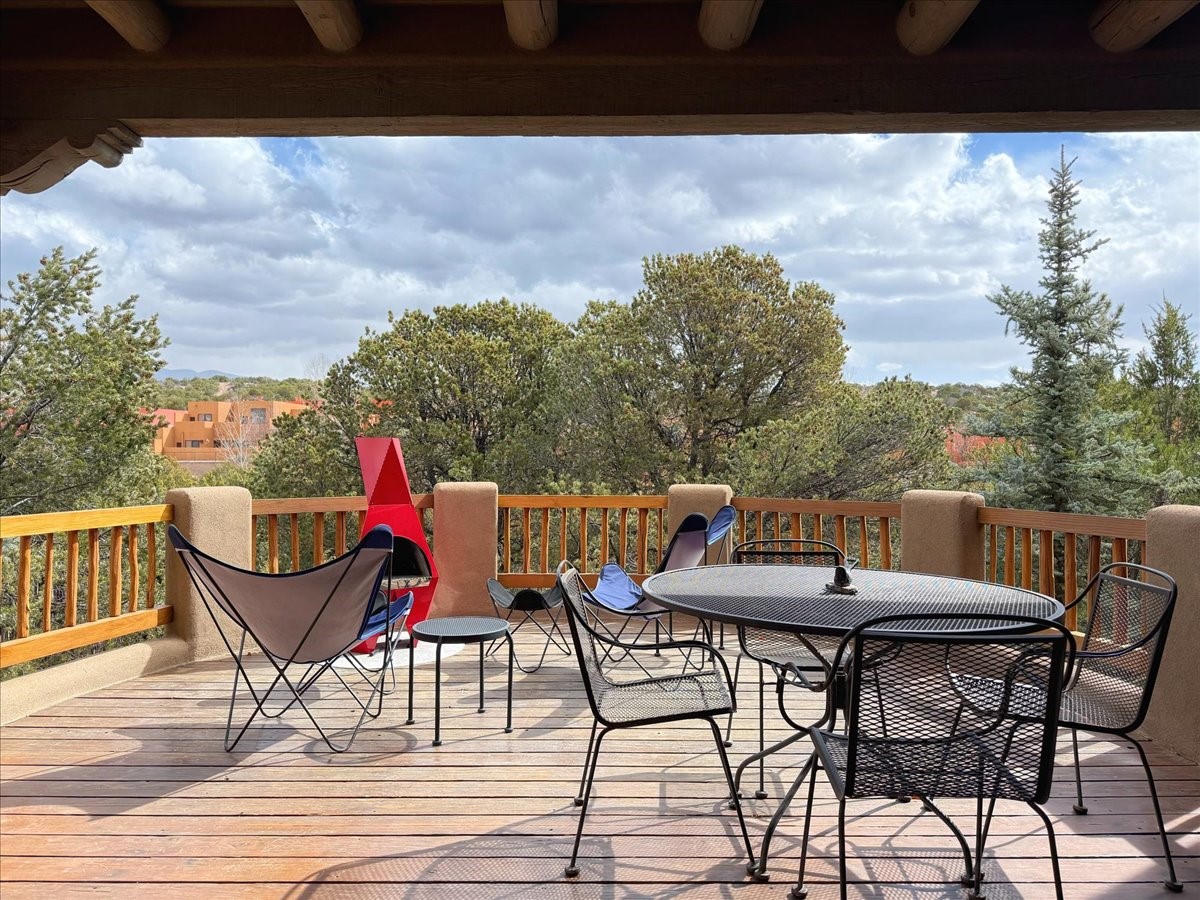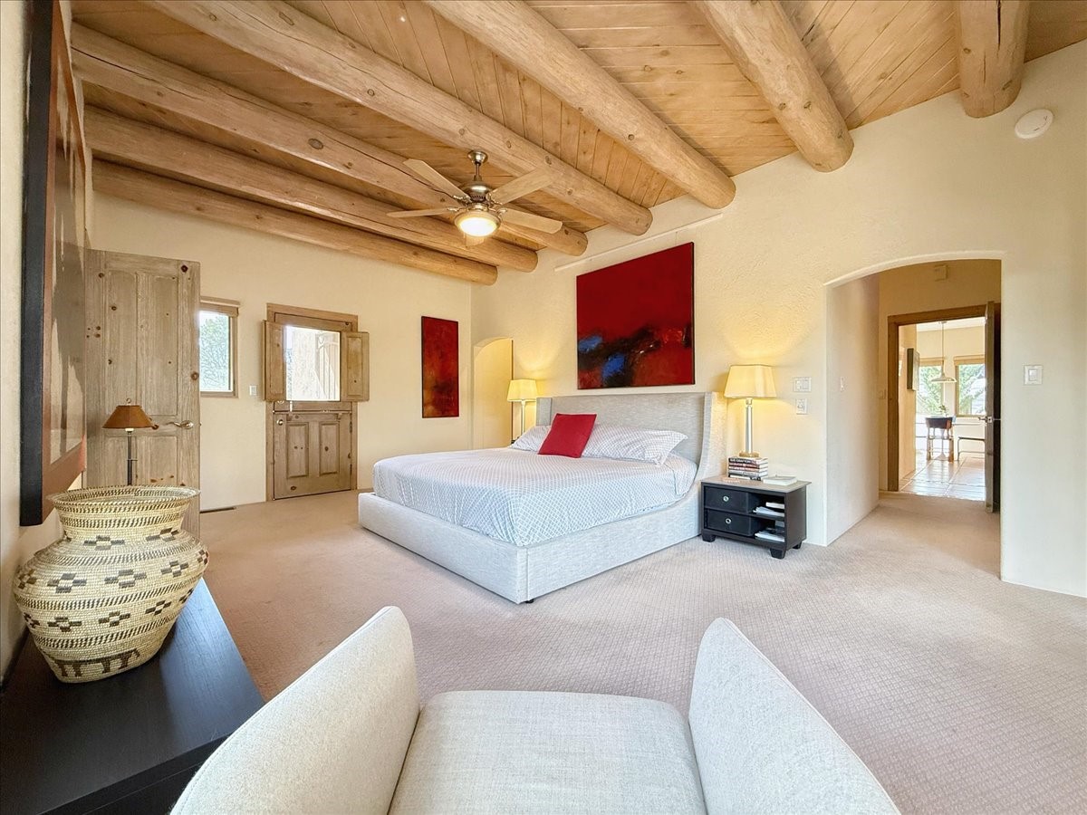 Nestled on Santa Fe's coveted north side, this exceptional home blends artistic charm with classic Southwestern elegance. The 2,929 sq. ft. main house welcomes you with a one-of-a-kind mosaic floor entry, which sets the stage for the stunning details that follow. Tiled stair risers, soaring ceilings, and vigas add warmth and character throughout. The thoughtfully designed layout includes a primary suite with a bonus sunroom and two inviting guest rooms.An 800 sq. ft. guest house, which can be accessed from within the home or through a private entrance, provides additional space for visitors, an art studio, or a private retreat. Conveniently located near the Plaza, shopping and highway access, this home offers both tranquility and accessibility. A truly unique Santa Fe gem!