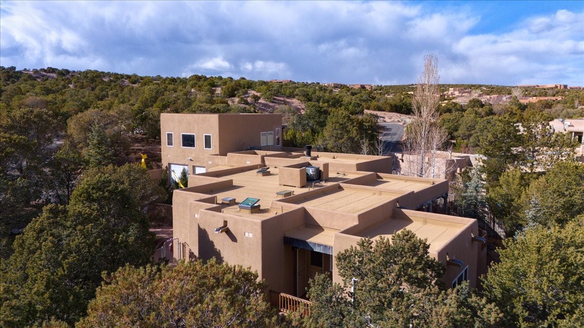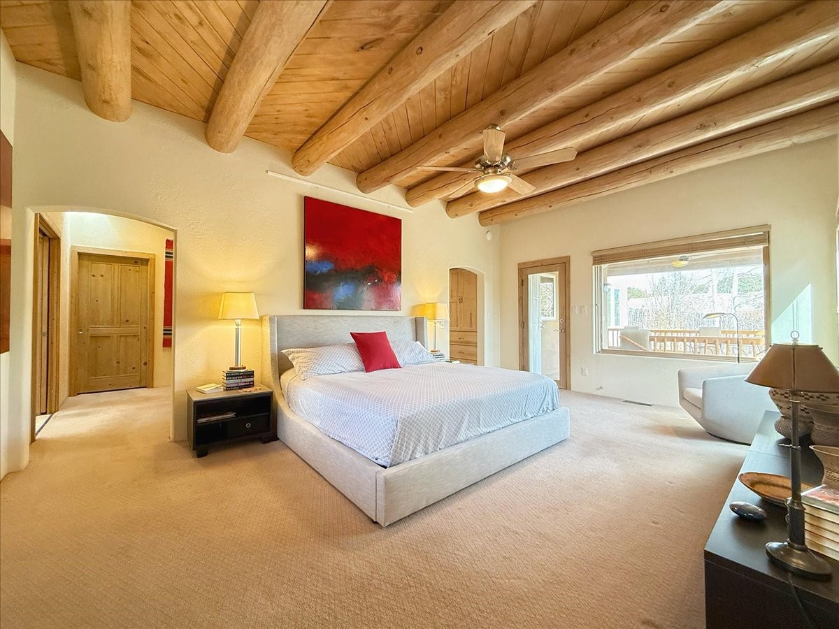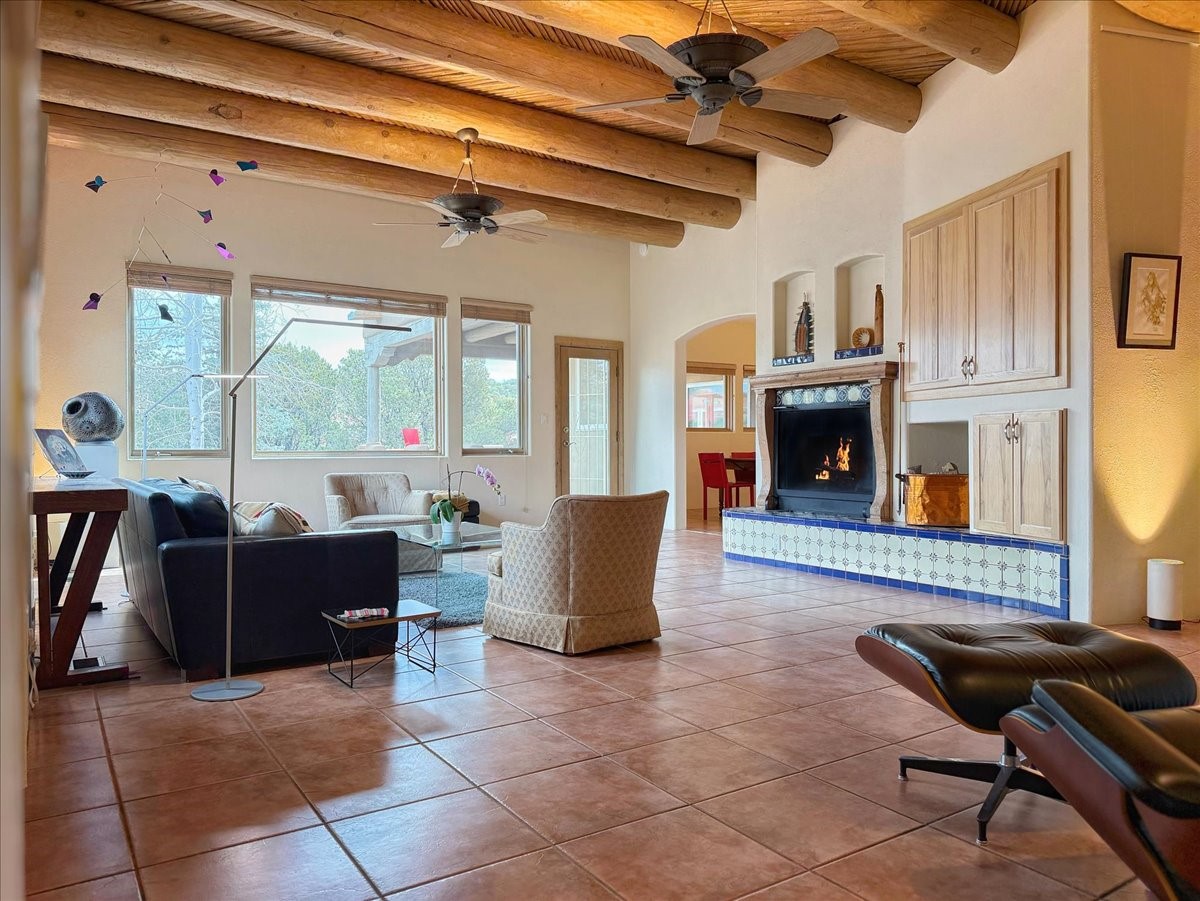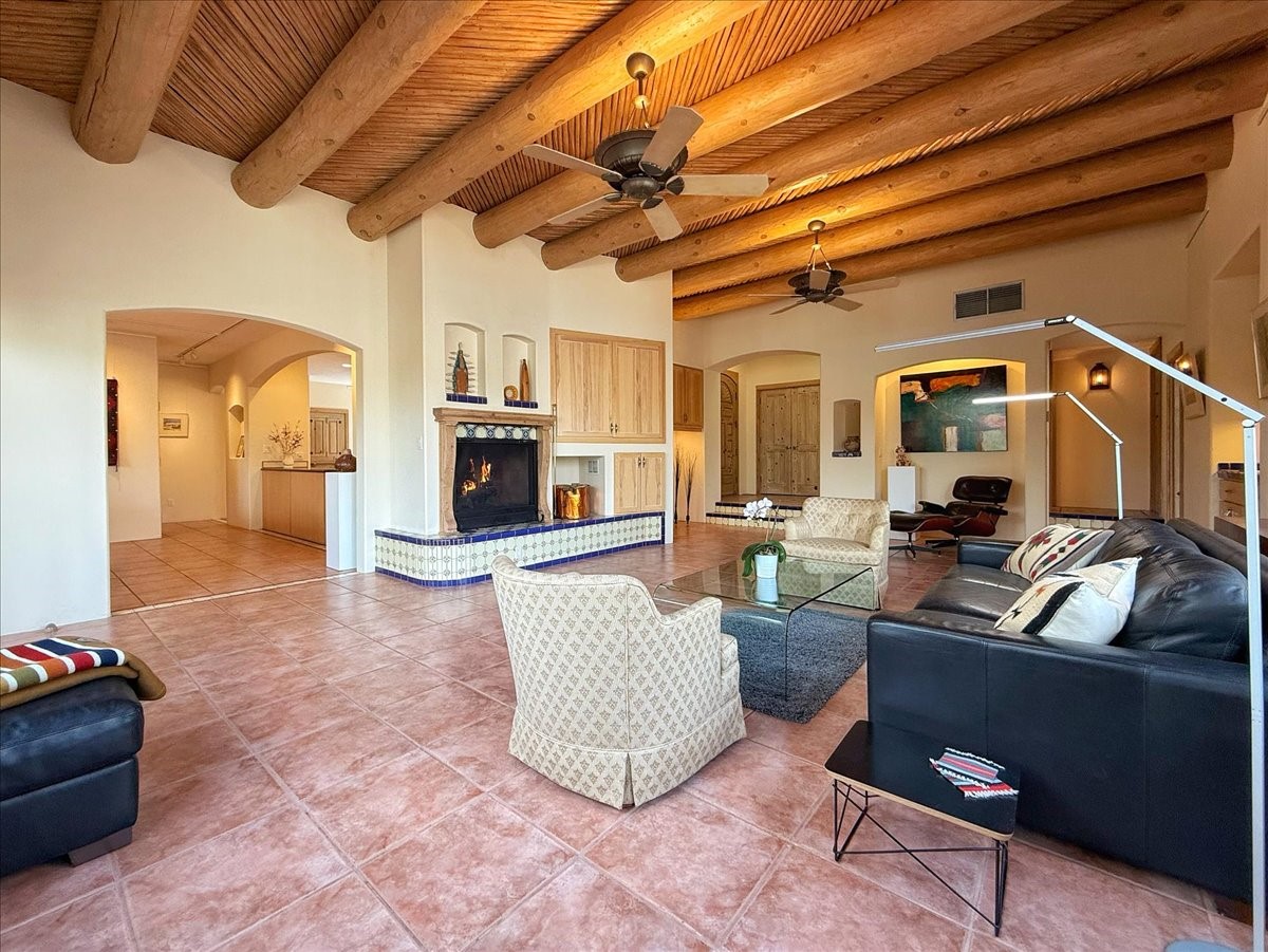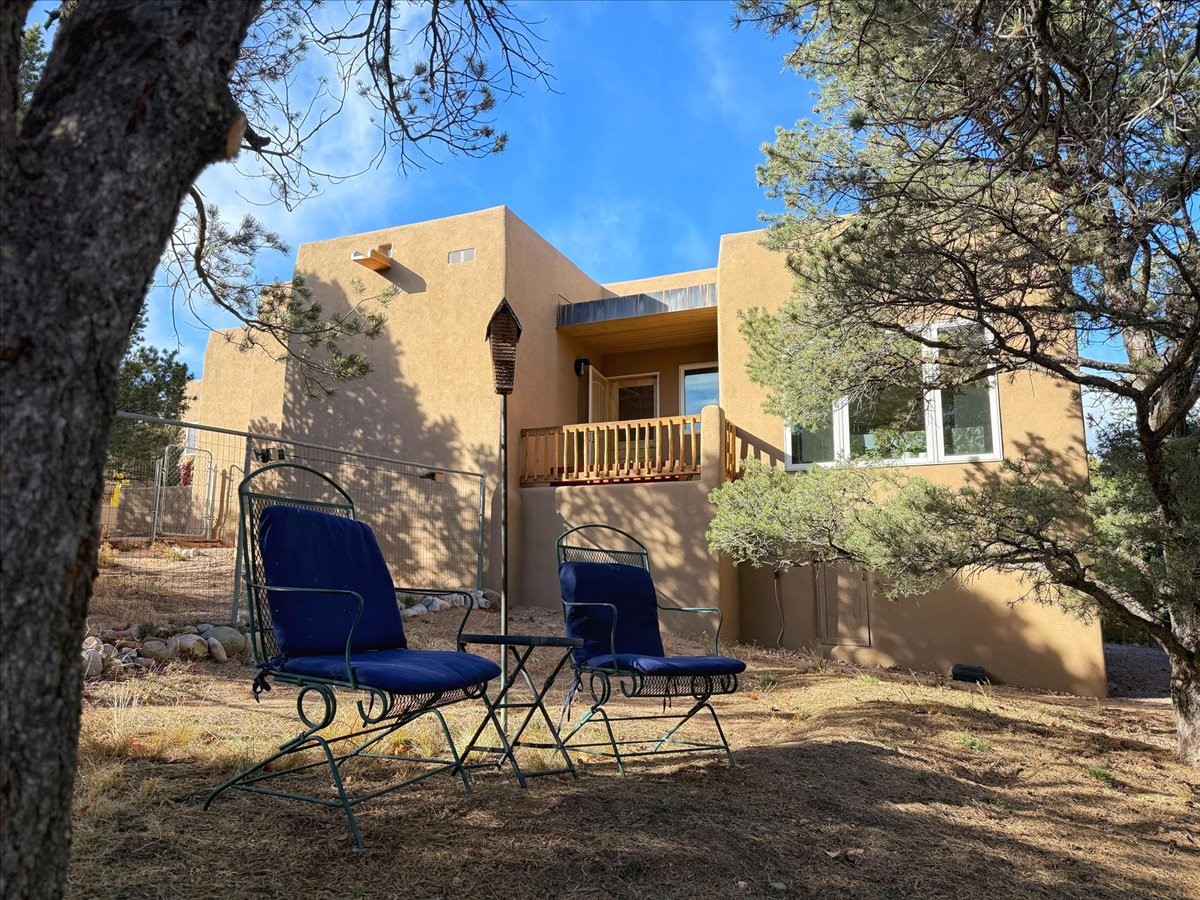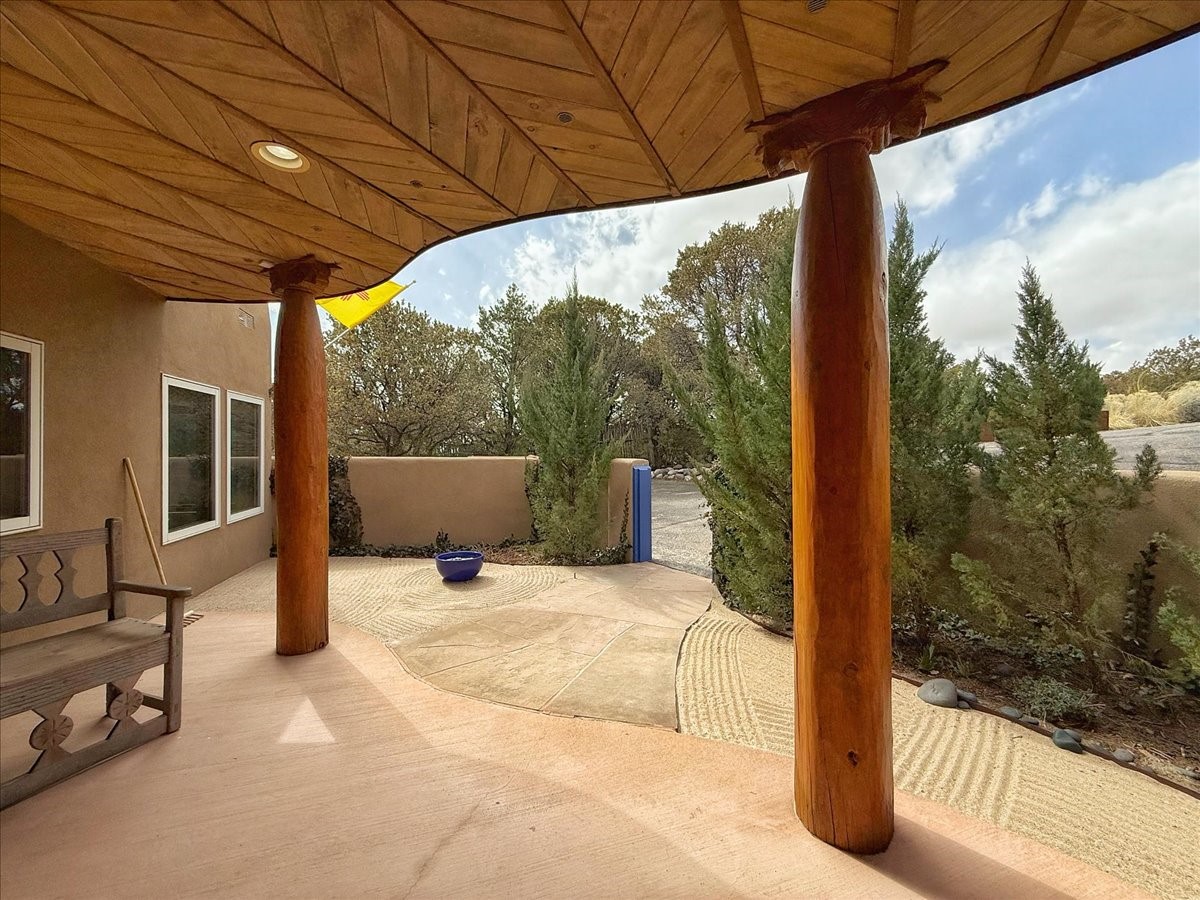Nestled on Santa Fe's coveted north side, this exceptional home blends artistic charm with classic Southwestern elegance. The 2,929 sq. ft. main house welcomes you with a one-of-a-kind mosaic floor entry, which sets the stage for the stunning details that follow. Tiled stair risers, soaring ceilings, and vigas add warmth and character throughout. The thoughtfully designed layout includes a primary suite with a bonus sunroom and two inviting guest rooms.An 800 sq. ft. guest house, which can be accessed from within the home or through a private entrance, provides additional space for visitors, an art studio, or a private retreat. Conveniently located near the Plaza, shopping and highway access, this home offers both tranquility and accessibility. A truly unique Santa Fe gem!