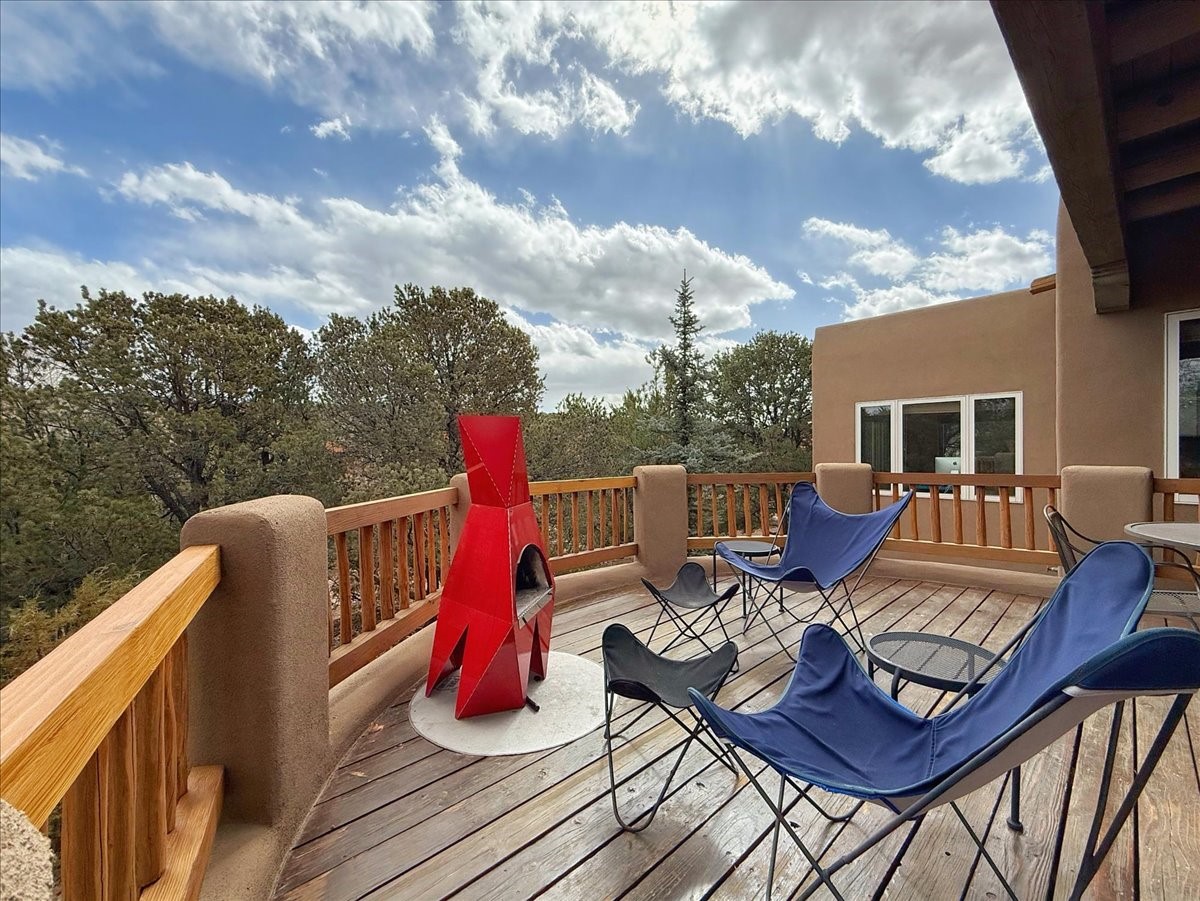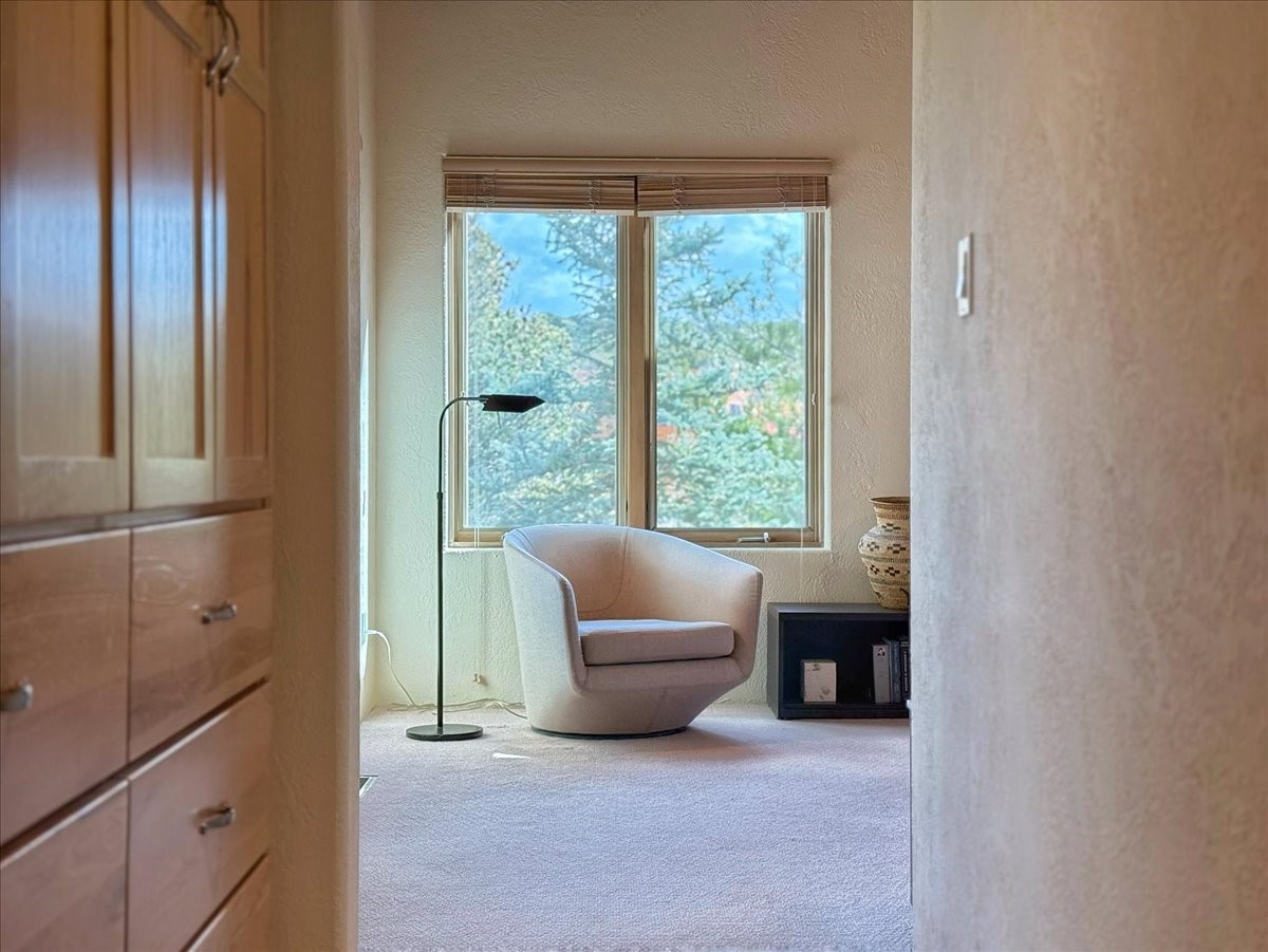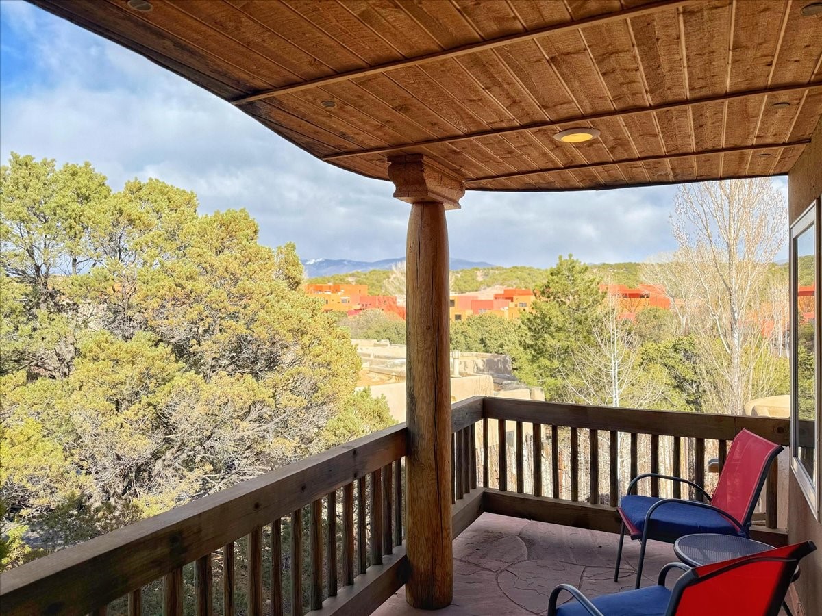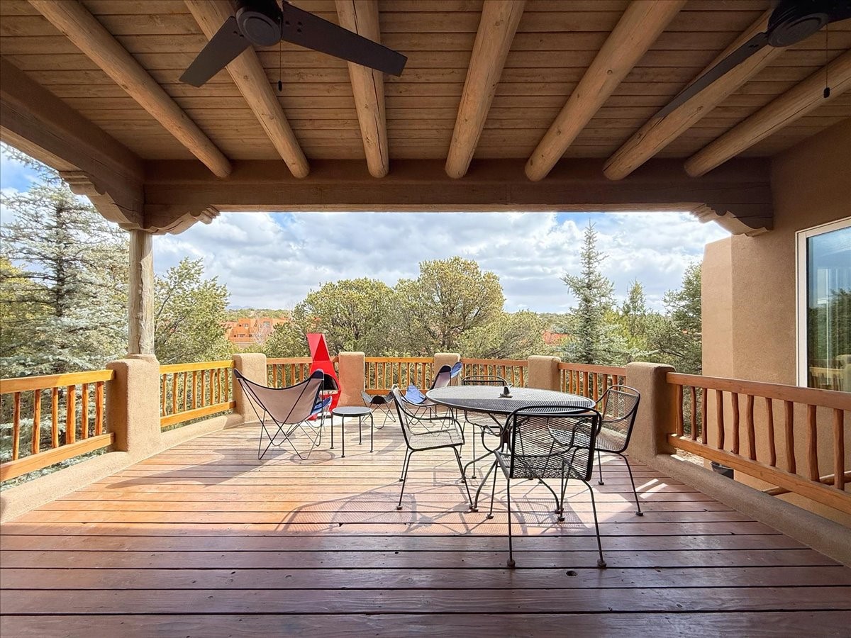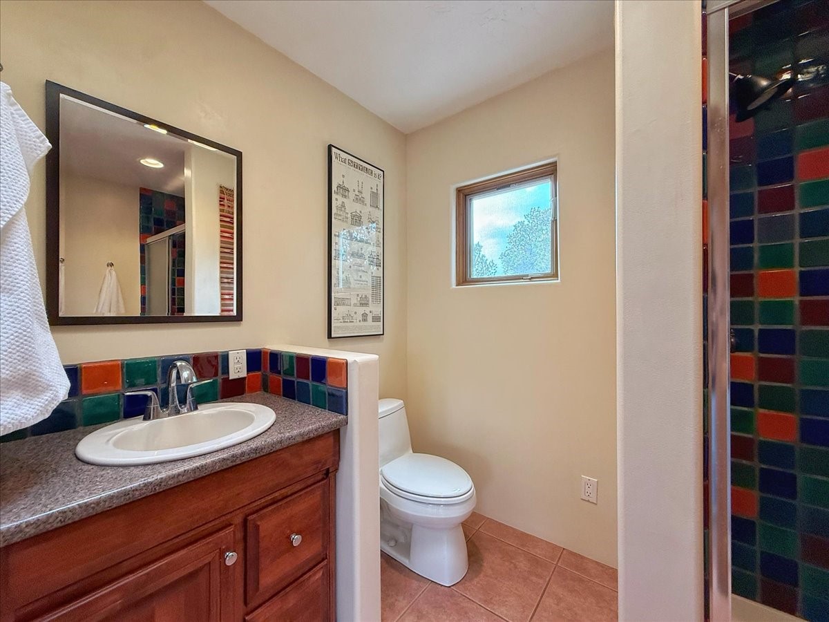Nestled on Santa Fe's coveted north side, this exceptional home blends artistic charm with classic Southwestern elegance. The 2,929 sq. ft. main house welcomes you with a one-of-a-kind mosaic floor entry, which sets the stage for the stunning details that follow. Tiled stair risers, soaring ceilings, and vigas add warmth and character throughout. The thoughtfully designed layout includes a primary suite with a bonus sunroom and two inviting guest rooms.An 800 sq. ft. guest house, which can be accessed from within the home or through a private entrance, provides additional space for visitors, an art studio, or a private retreat. Conveniently located near the Plaza, shopping and highway access, this home offers both tranquility and accessibility. A truly unique Santa Fe gem!
