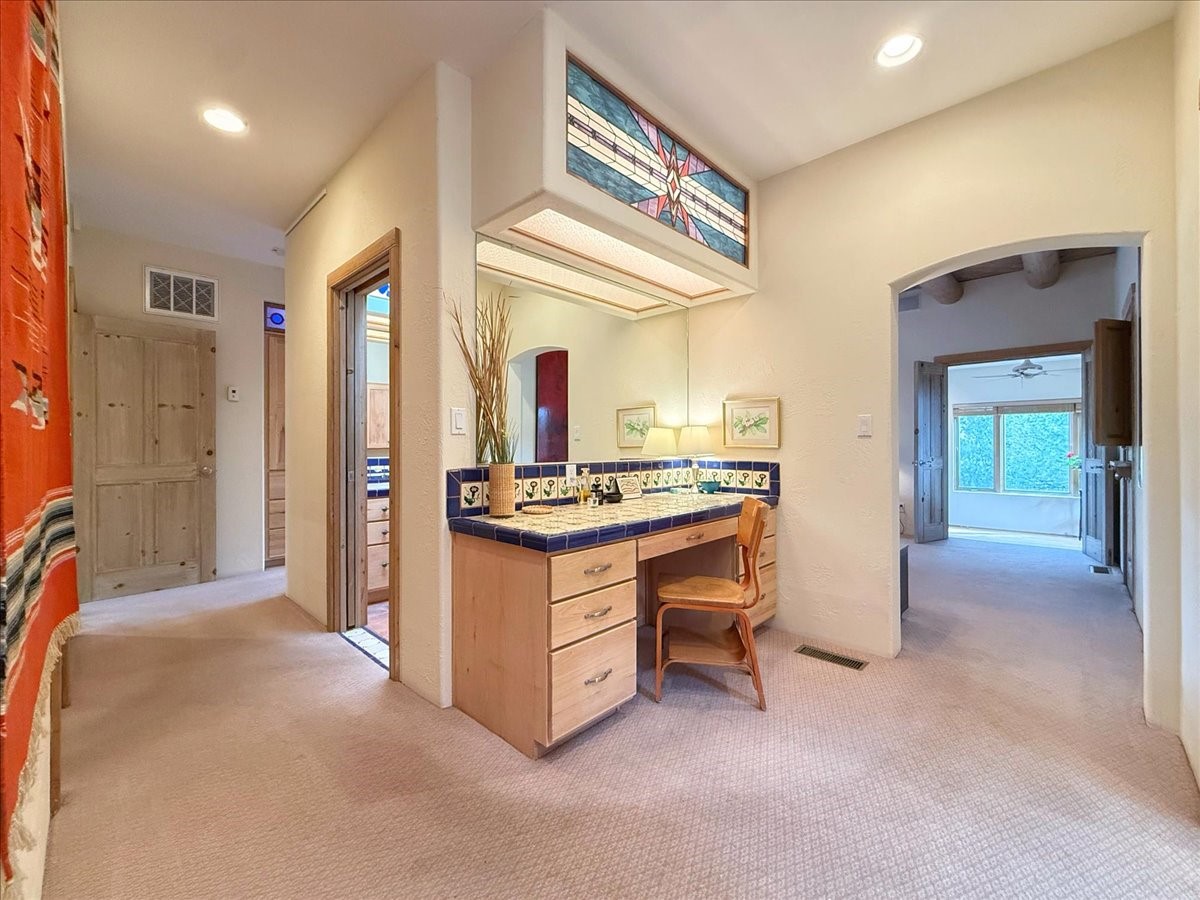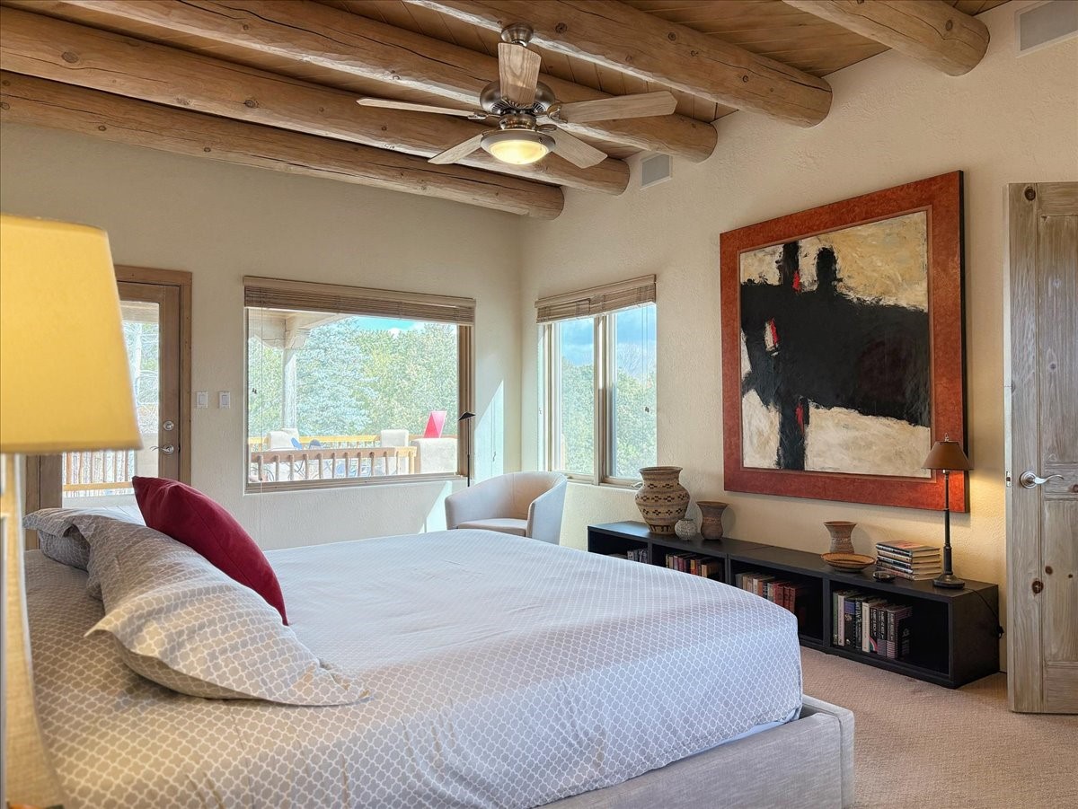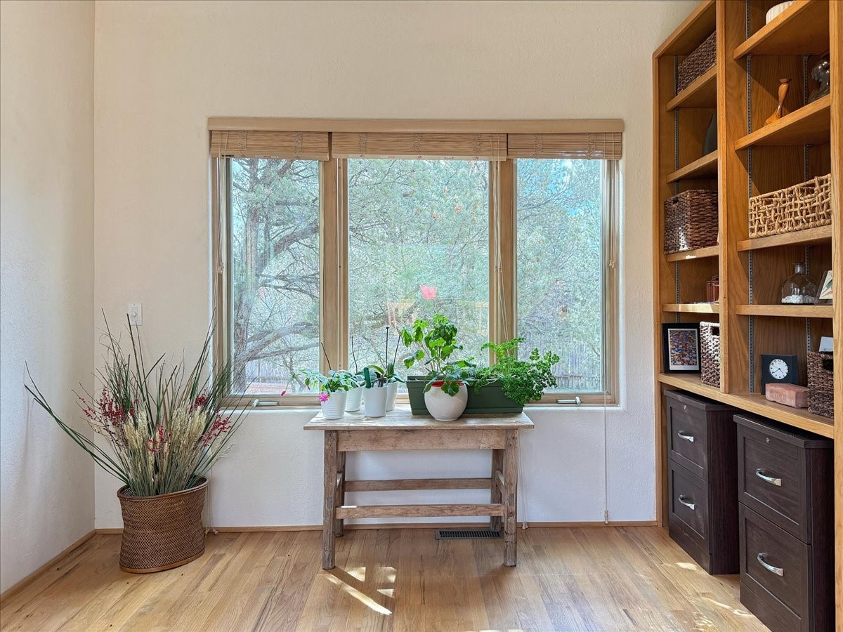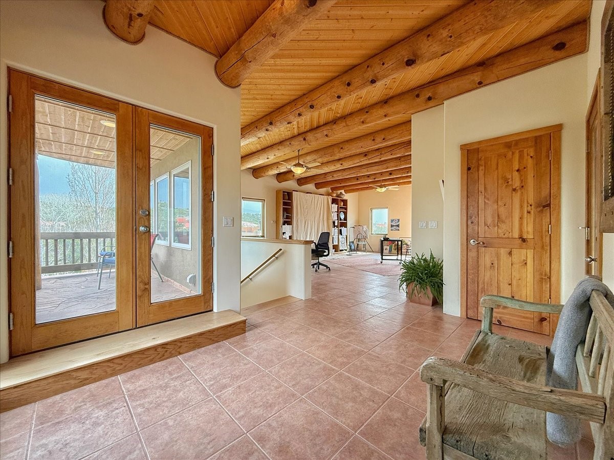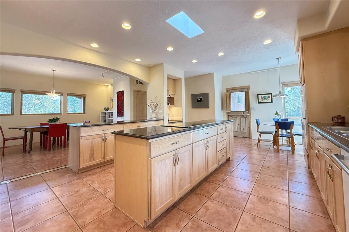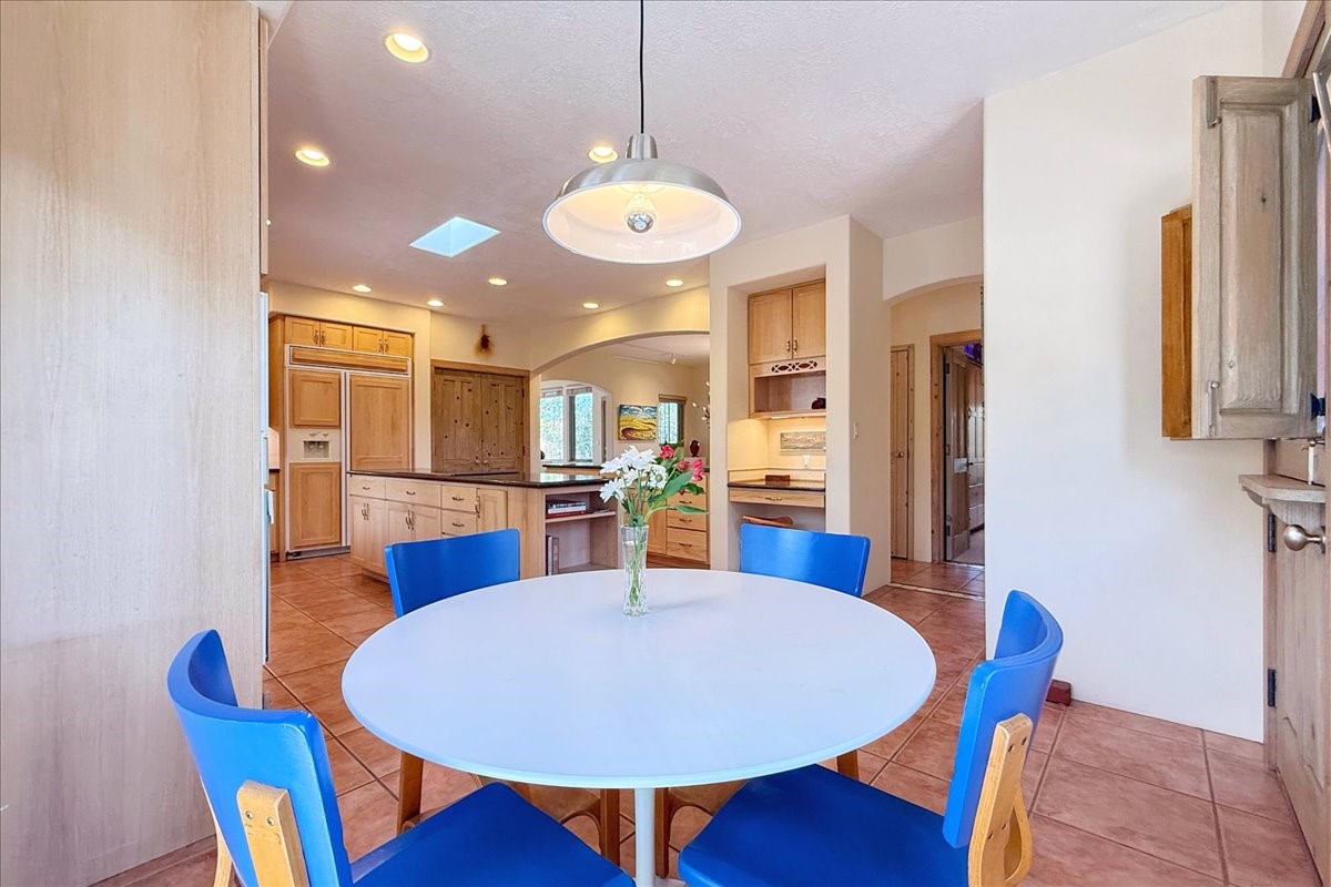 Nestled on Santa Fe's coveted north side, this exceptional home blends artistic charm with classic Southwestern elegance. The 2,929 sq. ft. main house welcomes you with a one-of-a-kind mosaic floor entry, which sets the stage for the stunning details that follow. Tiled stair risers, soaring ceilings, and vigas add warmth and character throughout. The thoughtfully designed layout includes a primary suite with a bonus sunroom and two inviting guest rooms.An 800 sq. ft. guest house, which can be accessed from within the home or through a private entrance, provides additional space for visitors, an art studio, or a private retreat. Conveniently located near the Plaza, shopping and highway access, this home offers both tranquility and accessibility. A truly unique Santa Fe gem!