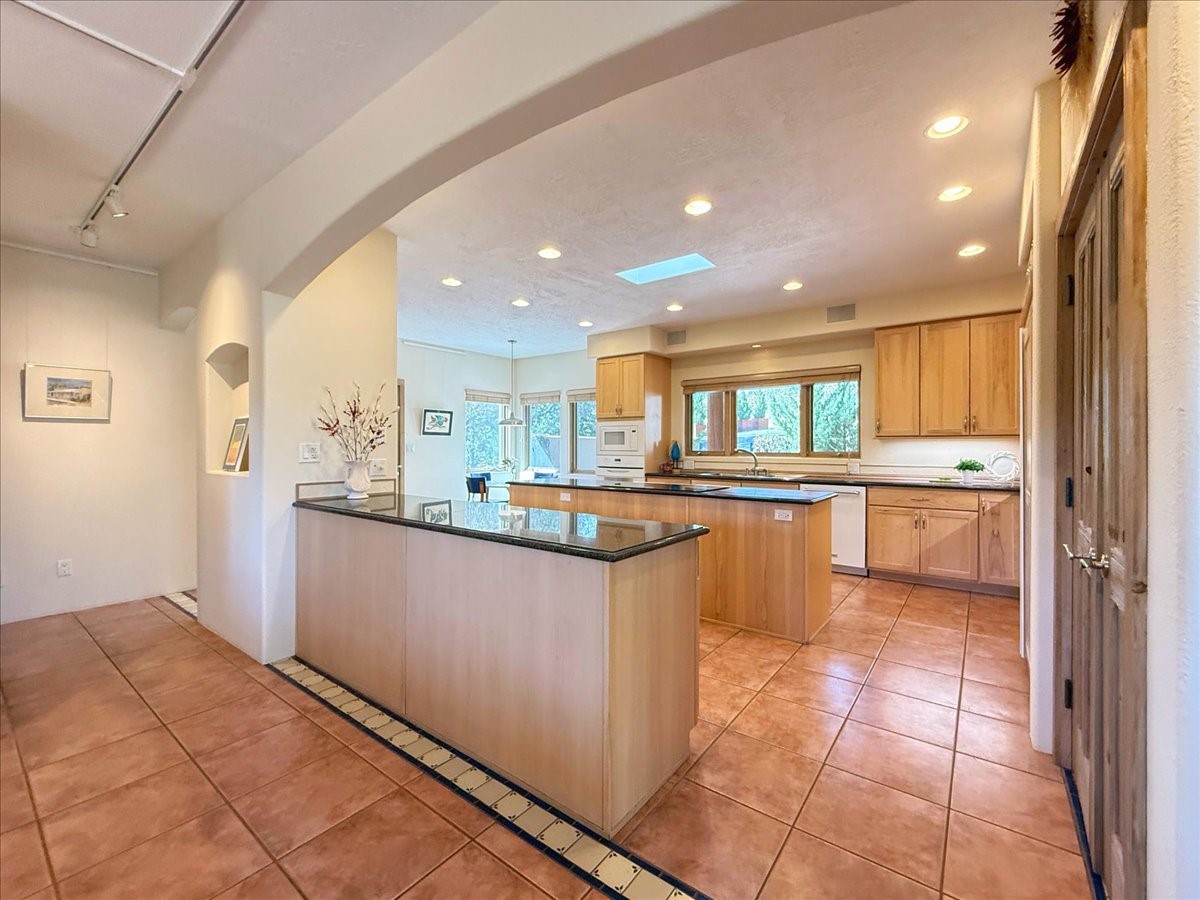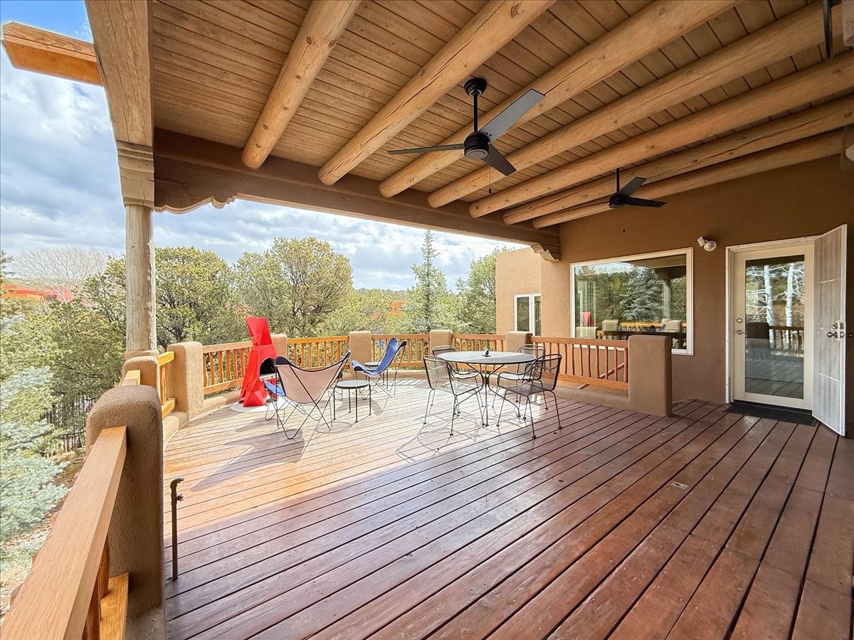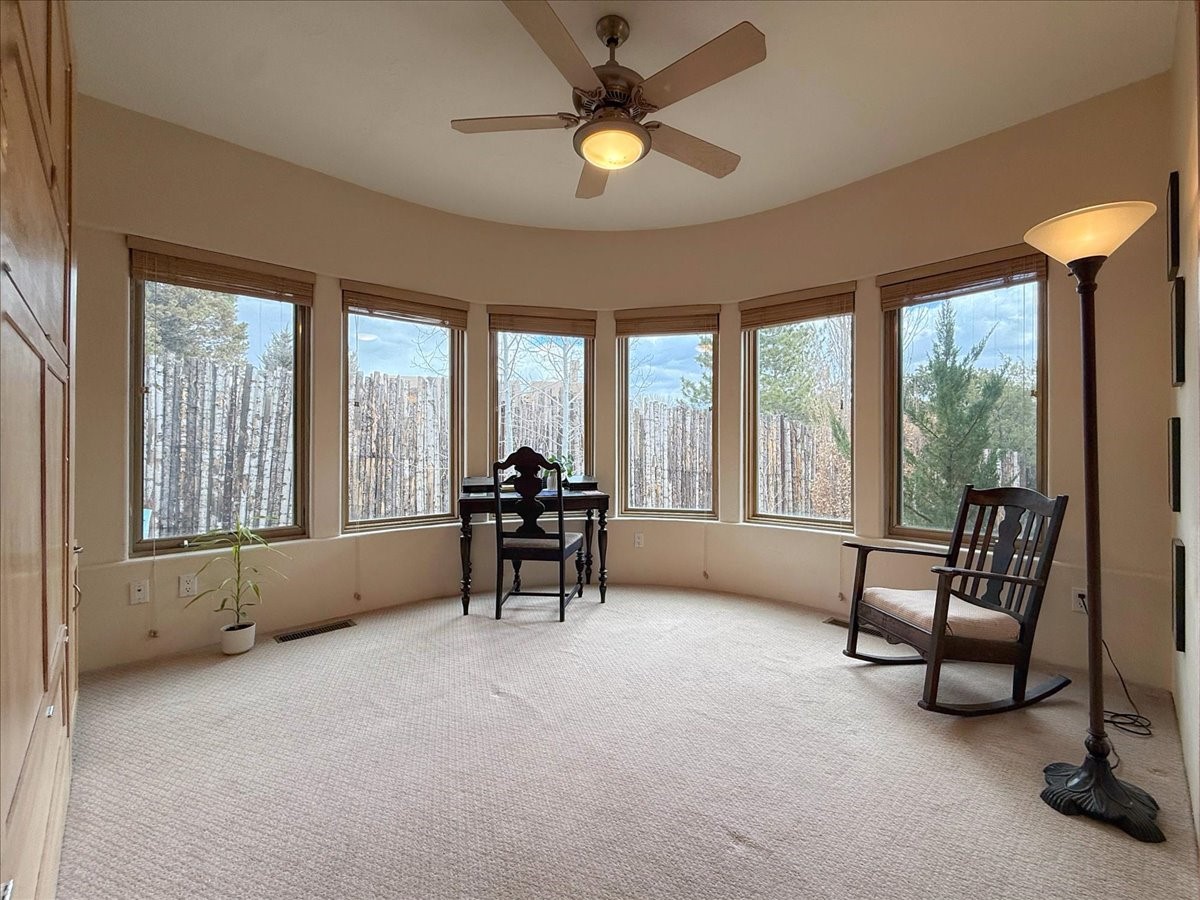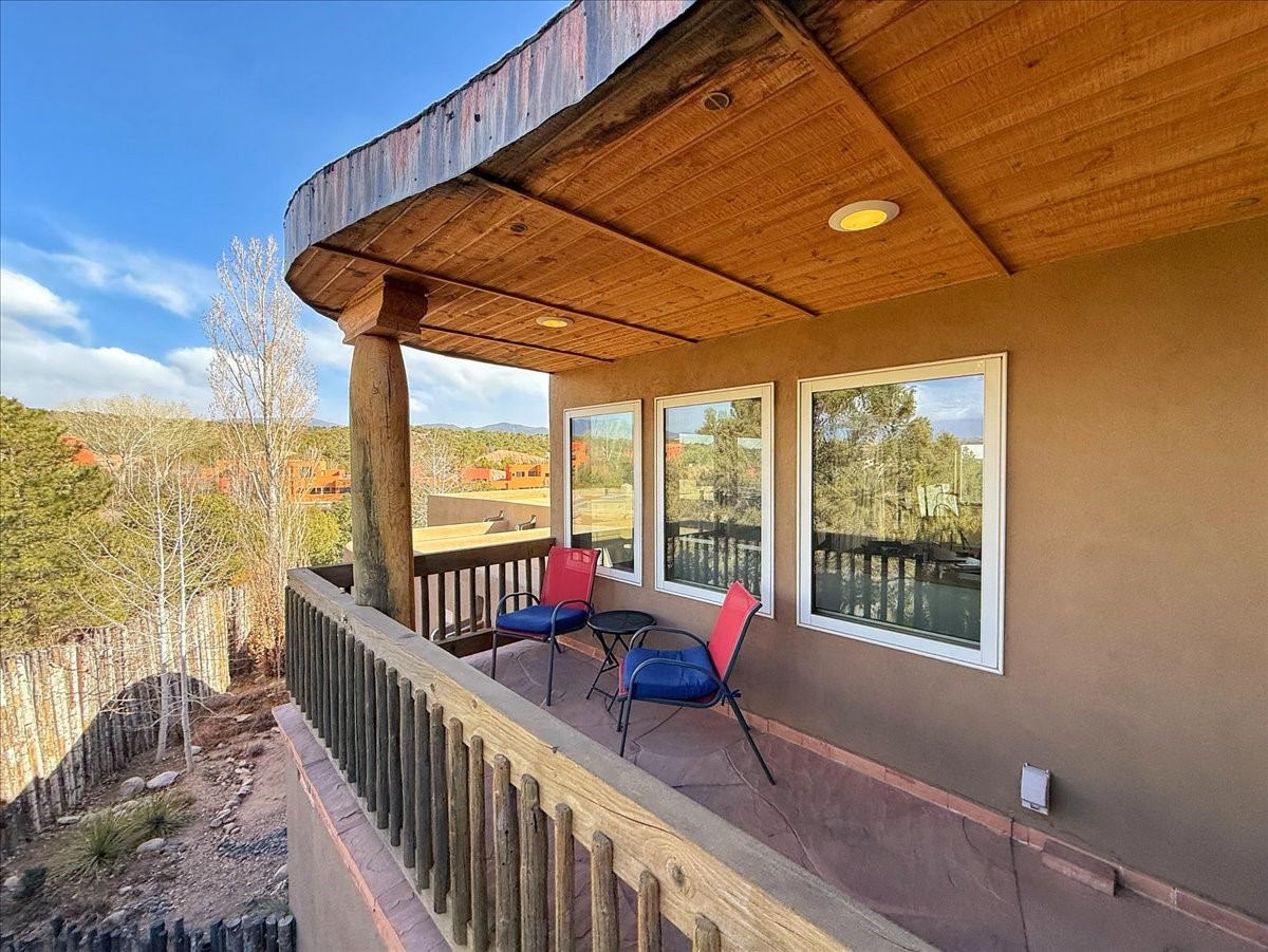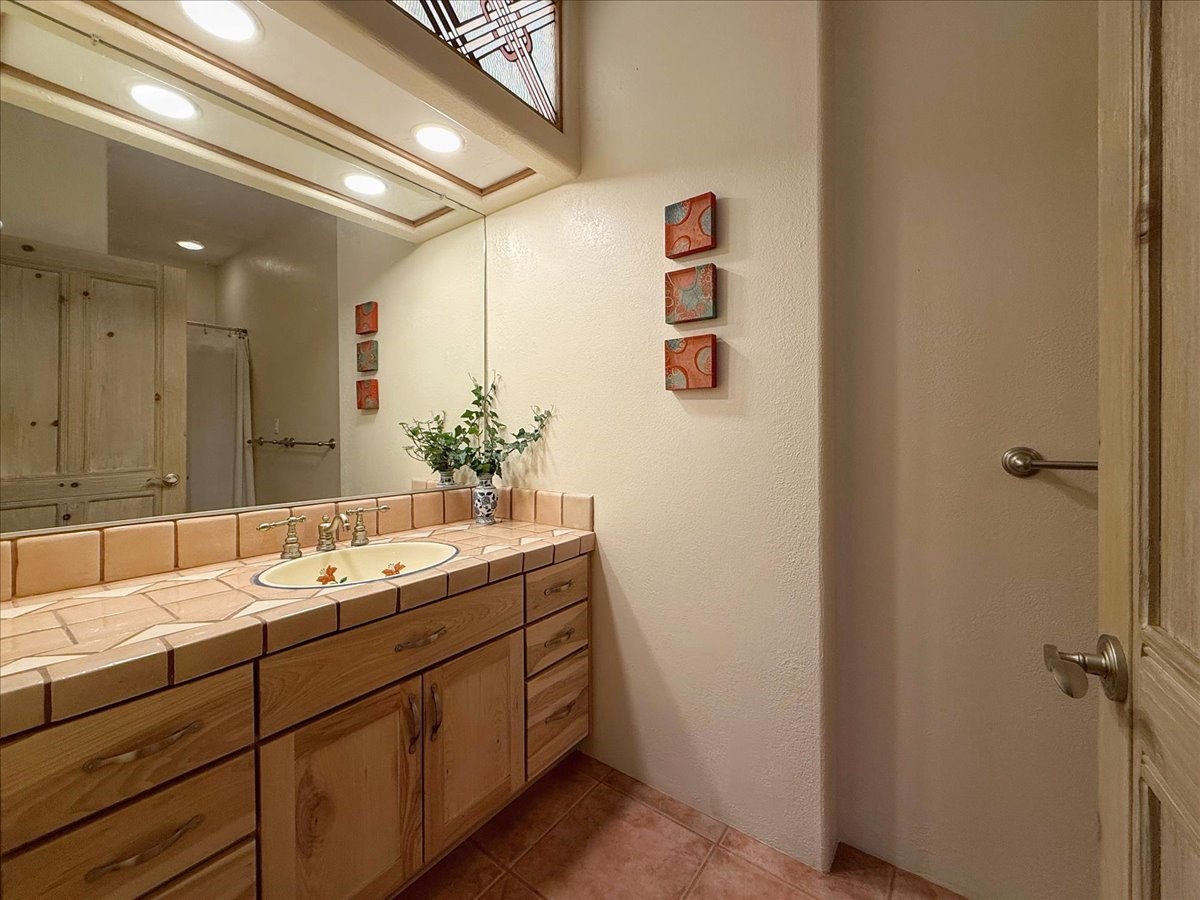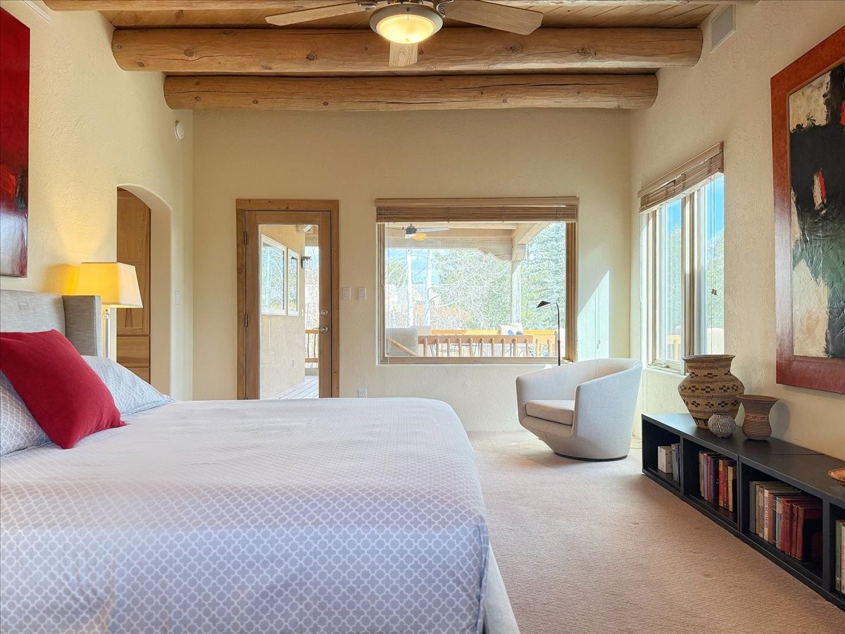 Nestled on Santa Fe's coveted north side, this exceptional home blends artistic charm with classic Southwestern elegance. The 2,929 sq. ft. main house welcomes you with a one-of-a-kind mosaic floor entry, which sets the stage for the stunning details that follow. Tiled stair risers, soaring ceilings, and vigas add warmth and character throughout. The thoughtfully designed layout includes a primary suite with a bonus sunroom and two inviting guest rooms.An 800 sq. ft. guest house, which can be accessed from within the home or through a private entrance, provides additional space for visitors, an art studio, or a private retreat. Conveniently located near the Plaza, shopping and highway access, this home offers both tranquility and accessibility. A truly unique Santa Fe gem!