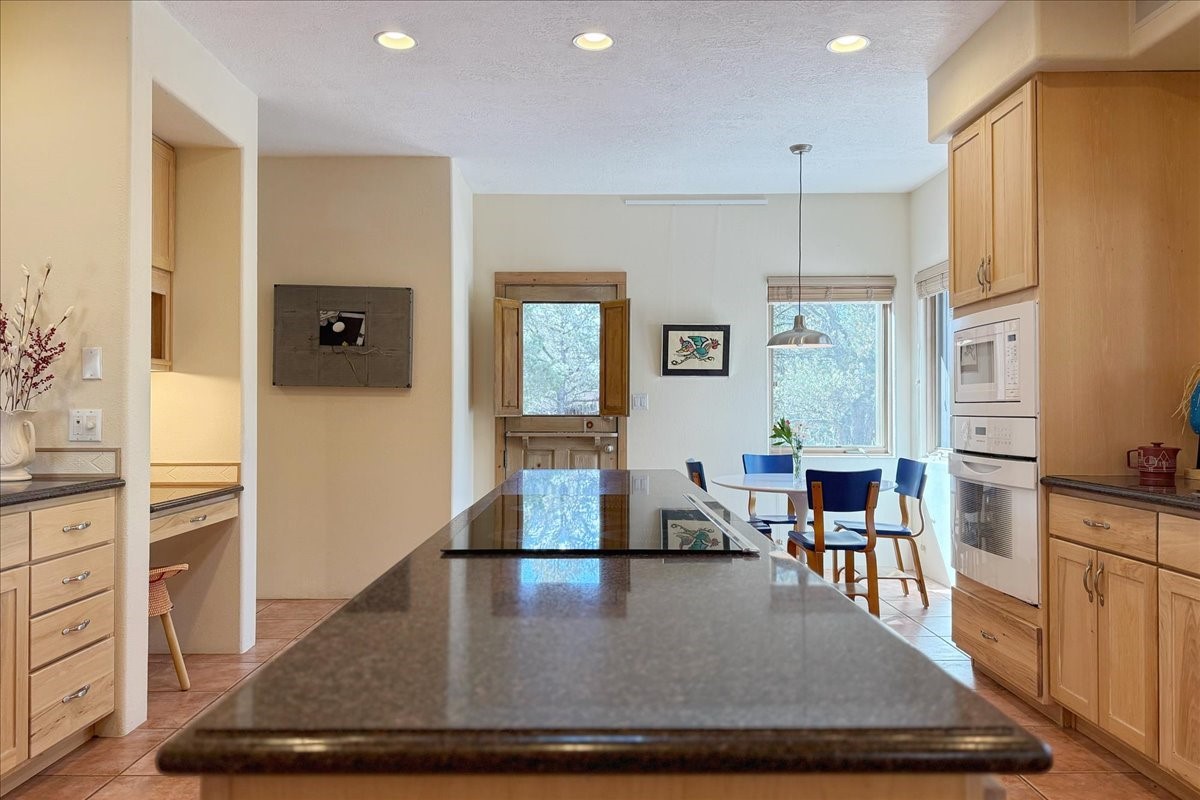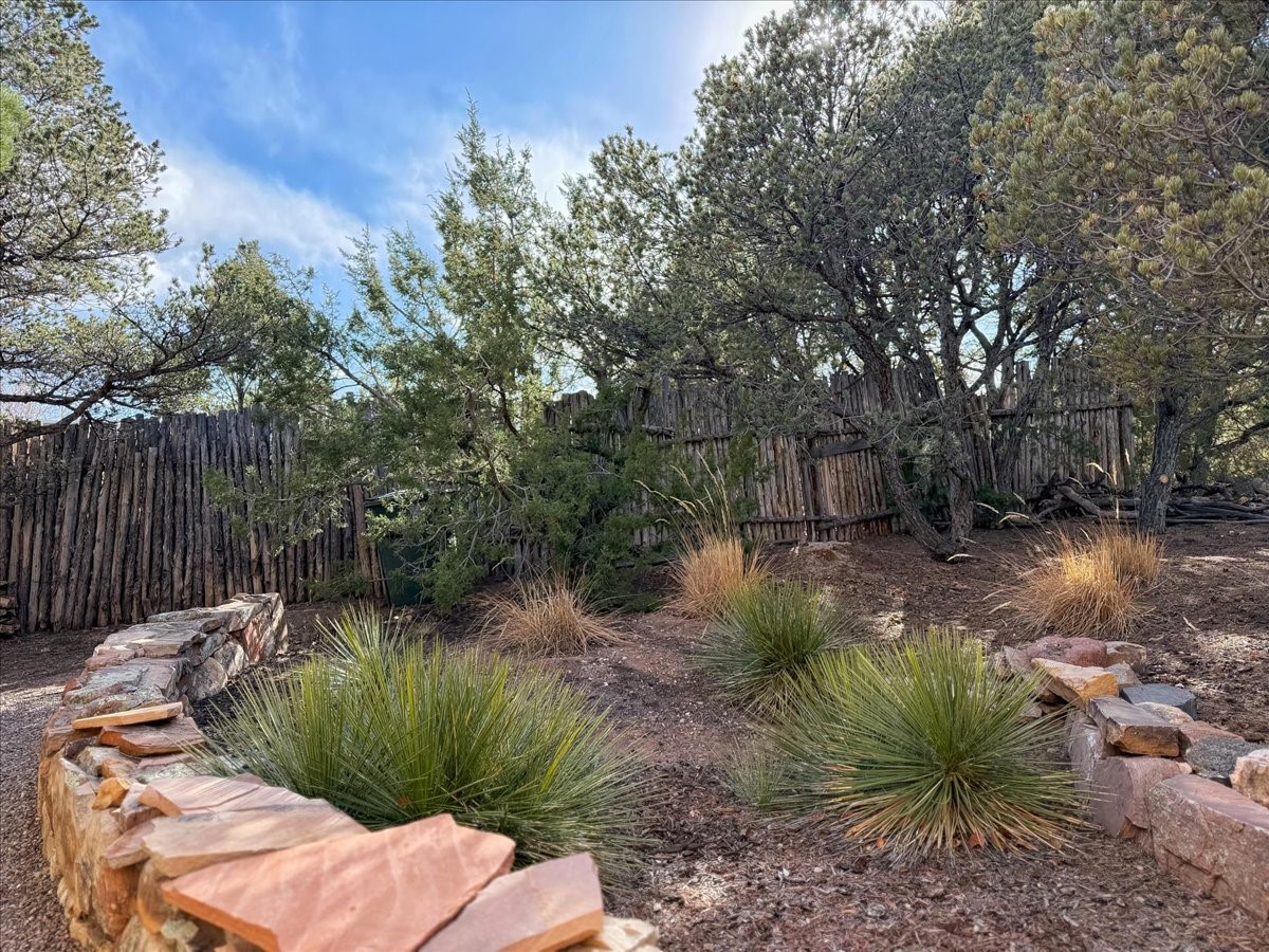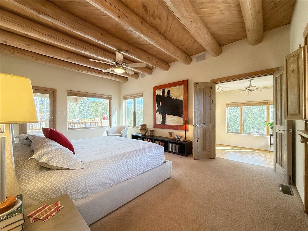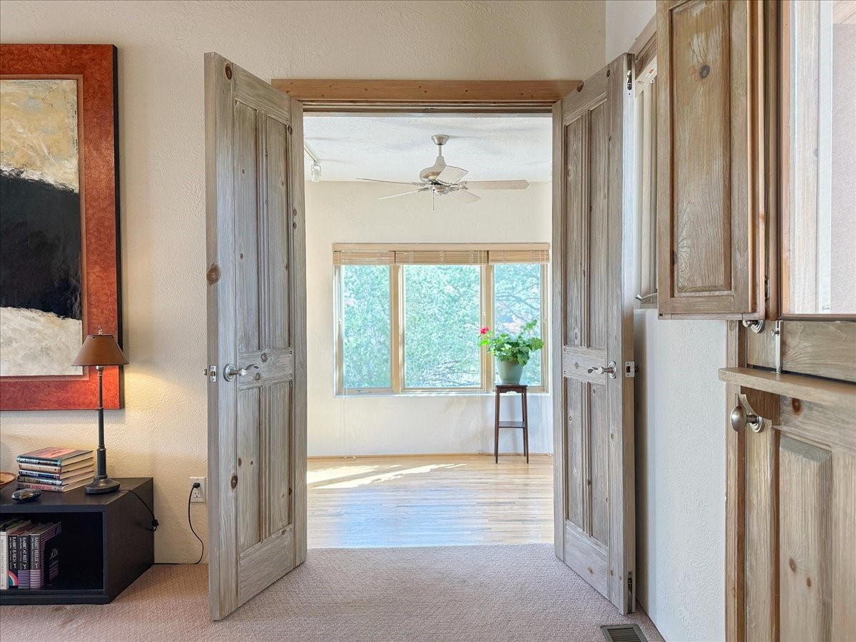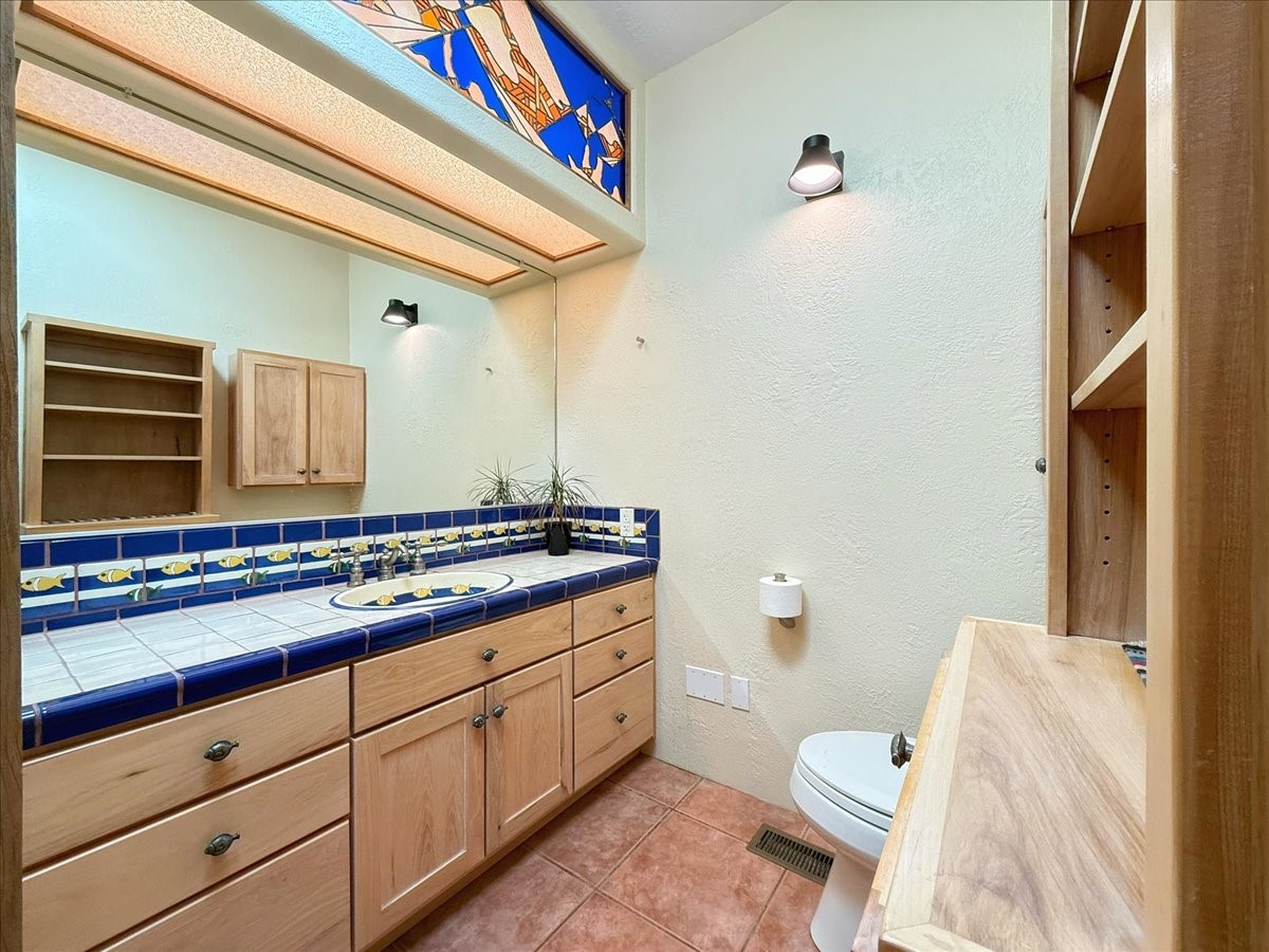 Nestled on Santa Fe's coveted north side, this exceptional home blends artistic charm with classic Southwestern elegance. The 2,929 sq. ft. main house welcomes you with a one-of-a-kind mosaic floor entry, which sets the stage for the stunning details that follow. Tiled stair risers, soaring ceilings, and vigas add warmth and character throughout. The thoughtfully designed layout includes a primary suite with a bonus sunroom and two inviting guest rooms.An 800 sq. ft. guest house, which can be accessed from within the home or through a private entrance, provides additional space for visitors, an art studio, or a private retreat. Conveniently located near the Plaza, shopping and highway access, this home offers both tranquility and accessibility. A truly unique Santa Fe gem!