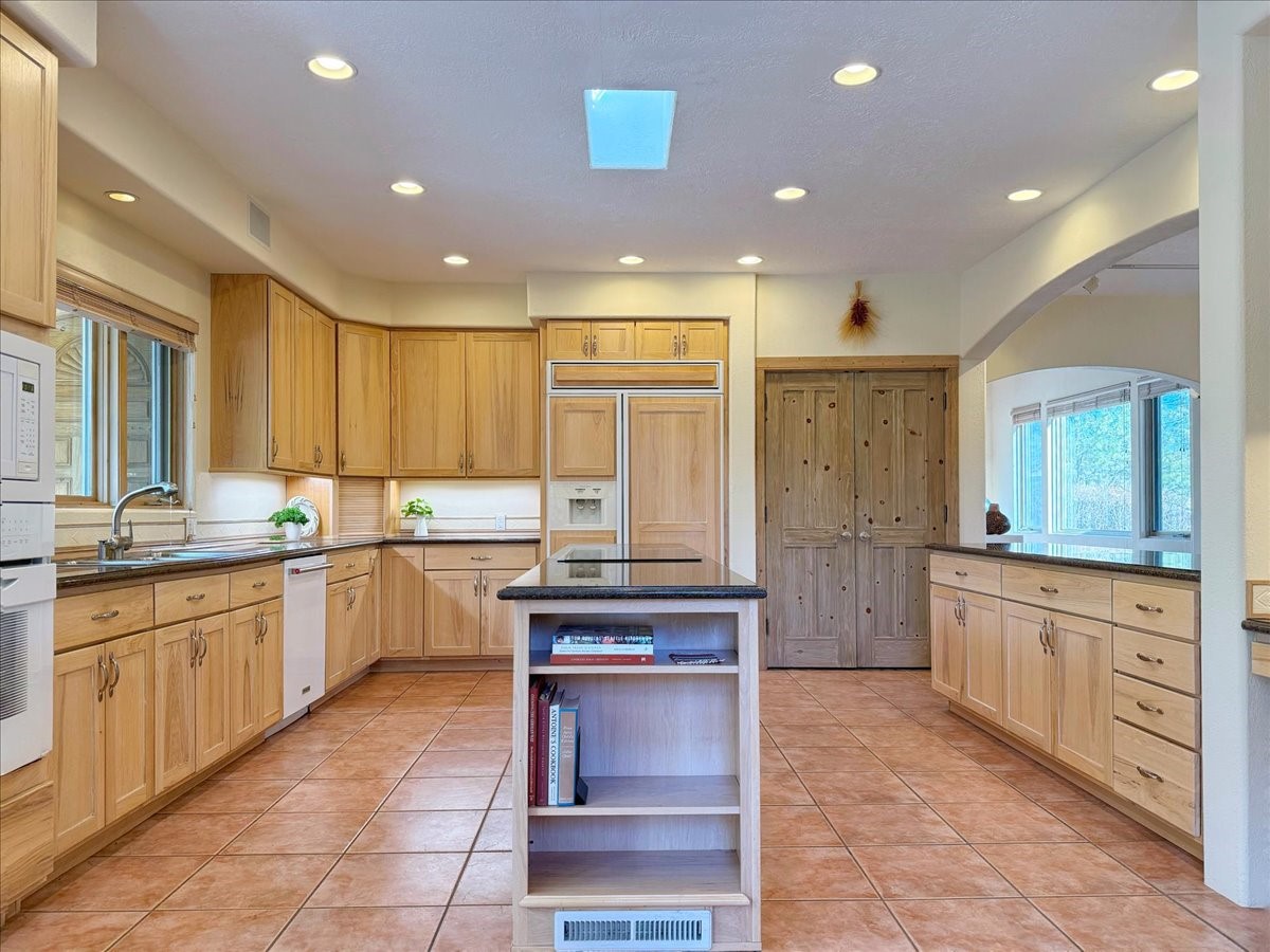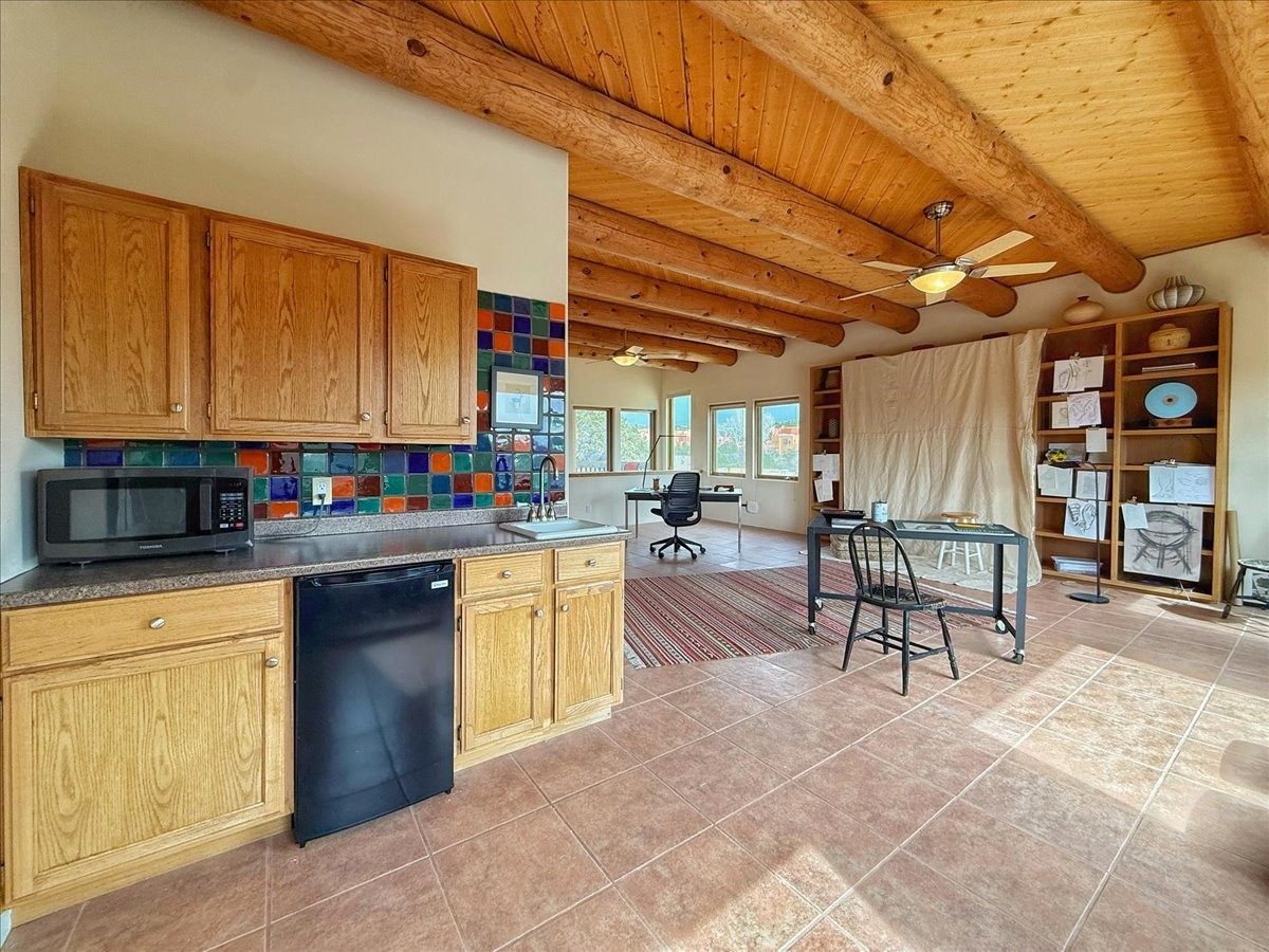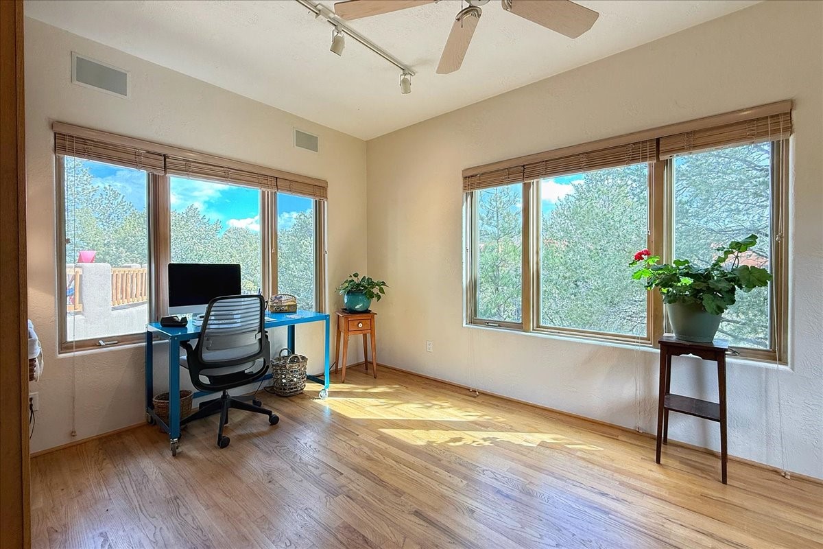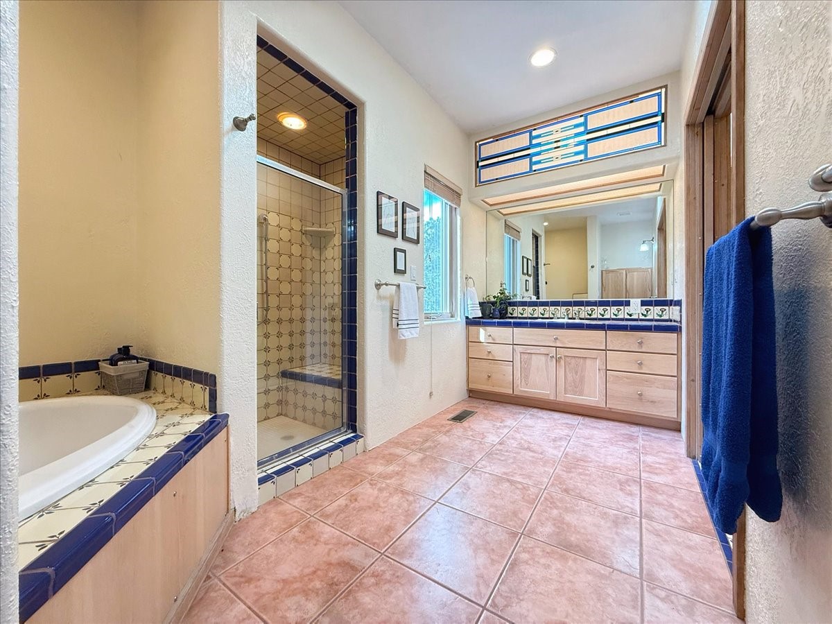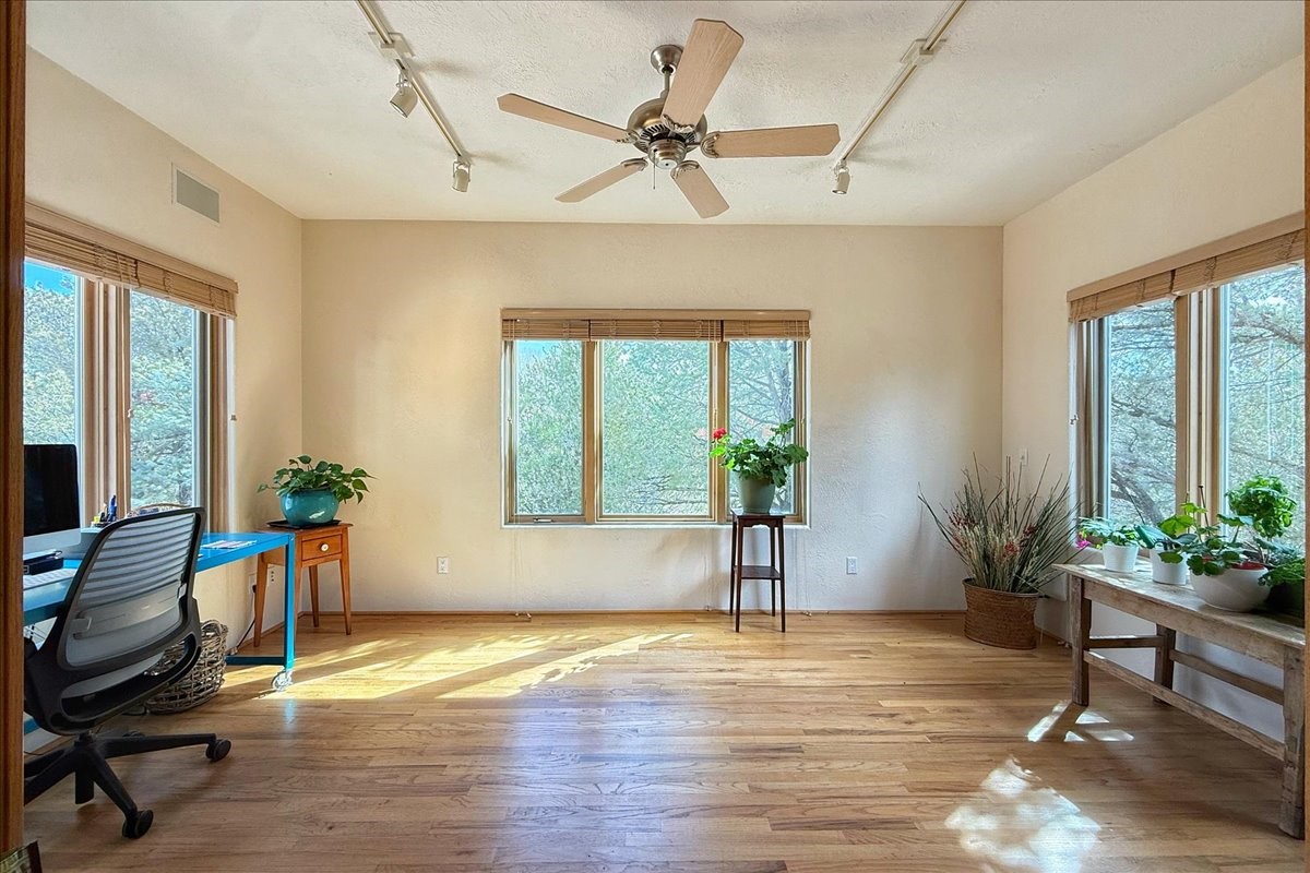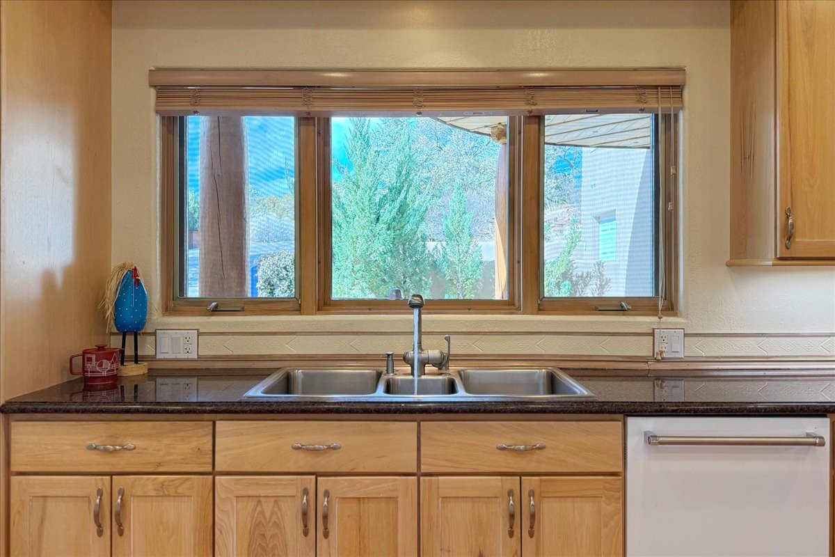 Nestled on Santa Fe's coveted north side, this exceptional home blends artistic charm with classic Southwestern elegance. The 2,929 sq. ft. main house welcomes you with a one-of-a-kind mosaic floor entry, which sets the stage for the stunning details that follow. Tiled stair risers, soaring ceilings, and vigas add warmth and character throughout. The thoughtfully designed layout includes a primary suite with a bonus sunroom and two inviting guest rooms.An 800 sq. ft. guest house, which can be accessed from within the home or through a private entrance, provides additional space for visitors, an art studio, or a private retreat. Conveniently located near the Plaza, shopping and highway access, this home offers both tranquility and accessibility. A truly unique Santa Fe gem!