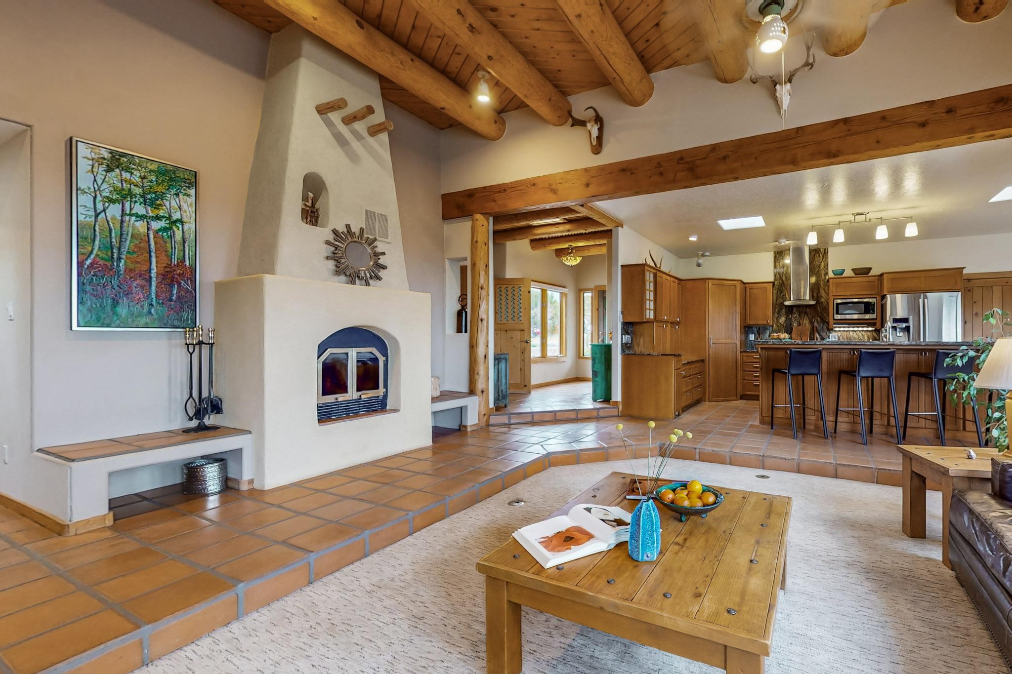 At the very end of a private road, where the world quiets and the landscape opens wide, you'll discover a hidden gem--an exceptional home perched above a sweeping arroyo, offering complete privacy and awe-inspiring panoramic views. This beautifully designed 4-bedroom, 3-bath home sits on 10 pristine acres in a small enclave that has been cherished by a single owner. From nearly every window and outdoor space, you'll be captivated by unobstructed vistas that stretch across the Galisteo Basin, Ortiz Mountains, Sandias, the majestic Sangre de Cristo range. Here, the sunsets paint the sky with color and the stars shine brighter than you've ever seen. Crafted by Jade Enterprises, the home features warm Southwest architectural touches, including hand-hewn vigas, high ceilings, and custom wood doors by local artisan Larry DeLeon. The open-concept kitchen with elegant serpentine stone countertops flows seamlessly into a generous living area, anchored by a beautiful fireplace and oriented toward some of the home's best views. The private primary suite occupies its own wing and includes a luxurious ensuite bath with a soaking tub, two-headed shower, walk-in closet, and a serene private patio. Two additional bedrooms at the rear of the home share a Jack-and-Jill bathroom and are joined by a flexible entertainment room with a wet bar and access to both the front and back outdoor living spaces. The oversized 2-car garage has cabinets, ample storage space, and a custom workbench. Outside, a fenced yard features a cozy flagstone fire-pit with seating, a spacious patio ideal for outdoor cooking, and a garden space ready for your vision. Every angle of this home was thoughtfully designed to celebrate the natural beauty that surrounds it. This is more than a home--it's a rare opportunity to own a piece of the New Mexico landscape, where peace, privacy, and panoramic beauty come together in perfect harmony. Covenants allow for additional casita/studio subject to HOA approval. Come see it.