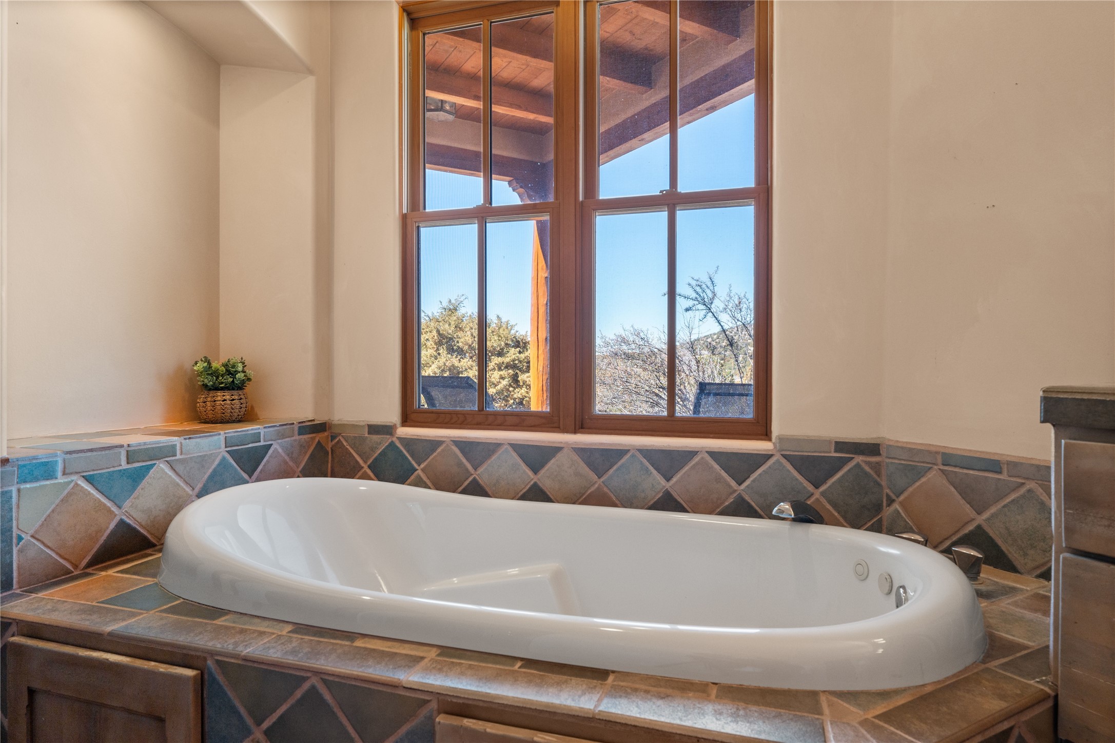 Santa Fe Sanctuary - located in the gated community of Alteza Estates just 20 minutes from the Historic Santa Fe Plaza. This stunning home boasts a living room with soaring ceilings, exposed Vigas and cozy wood-burning fireplace, perfect for gathering on chilly evenings or a blue sky summer's day. The recently remodeled kitchen is a chef's delight featuring sparkling quartz countertops, a designer tile backsplash, convenient island, electric induction range (propane stub in place), custom cabinetry with pullout shelves and undermount lighting. Enjoy casual meals in the eat-in kitchen or host elegant dinners in the formal dining room just off the kitchen and living area. The thoughtfully designed split floor plan offers privacy and comfort. A secondary bedroom and bath plus office are situated on a separate wing from the primary suite. Retreat to your private luxurious suite, featuring a wood-burning Kiva fireplace and french doors leading to a covered patio. Spa like primary bathroom with jacuzzi tub, oversized walk-in shower, dual sinks, and spacious walk-in closet. Custom details throughout this home: classic plaster walls in select areas, solid wood custom doors, ample built-in cabinetry, additional storage, and hard floor surfaces throughout. Two additional bedrooms with shared hallway bathroom. Laundry room with sink and built-ins. Property includes El Dorado water and access to Xfinity services. Stay comfortable year-round with new mini-split units installed in 2024, new boiler installed in 2025, and new tankless water heater in 2024. Outdoor living with expansive covered patio and enclosed yard, stunning views and unparalleled privacy. A front enclosed courtyard offers a welcoming entrance with lush landscaping. Oversized 2-car garage includes a workspace, storage room and EV receptacle. Experience Santa Fe living at its very finest!