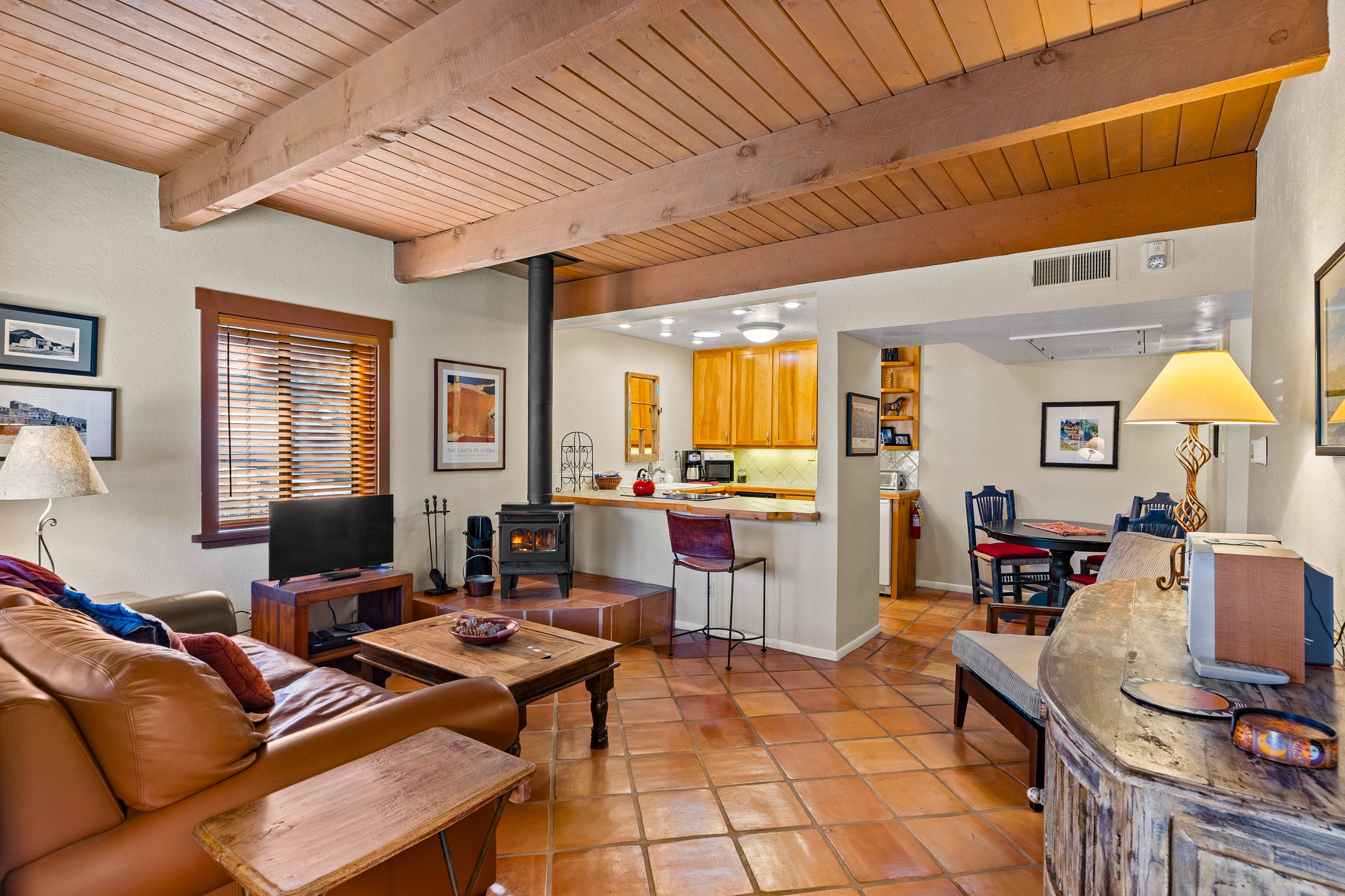 This welcoming one bedroom, one bathroom condo at the Fort Marcy Compound is just 6 blocks from the downtown plaza, and 1 block off Artist/Hyde Park road to 10,000 Waves, hiking & biking trails, and Ski Santa Fe. The pleasant interior is nicely updated, to include a washer/dryer, double sink vanity, and walk-in shower. The kitchen is open and roomy, and the wood-burning stove in the living room will keep you and your guests toasty all winter long! This end unit has no steps to access from parking, and features more windows than others, giving the interior a nice, cheery feel. New roof and HVAC system in 2024. This condo has been enjoyed by the same owner for 22 years over every season, with the east-facing porch cool for summer evenings, and walking a short distance up the hill to catch the sunset and expansive views. Although within walking distance to the downtown area, this condo provides a cozy, quiet retreat. Fort Marcy is a unique property with condos sited over 10 acres, and much of the site left in a natural state, some areas much like a small forest, right in town! This is truly a lock and leave, or can be used for short-term rentals. Full furniture [package conveys with sale at zero dollars. All contents included. Professional management company on-site offers a rental program, and manages the physical plant. Google All Seasons Resort Lodging for more information.