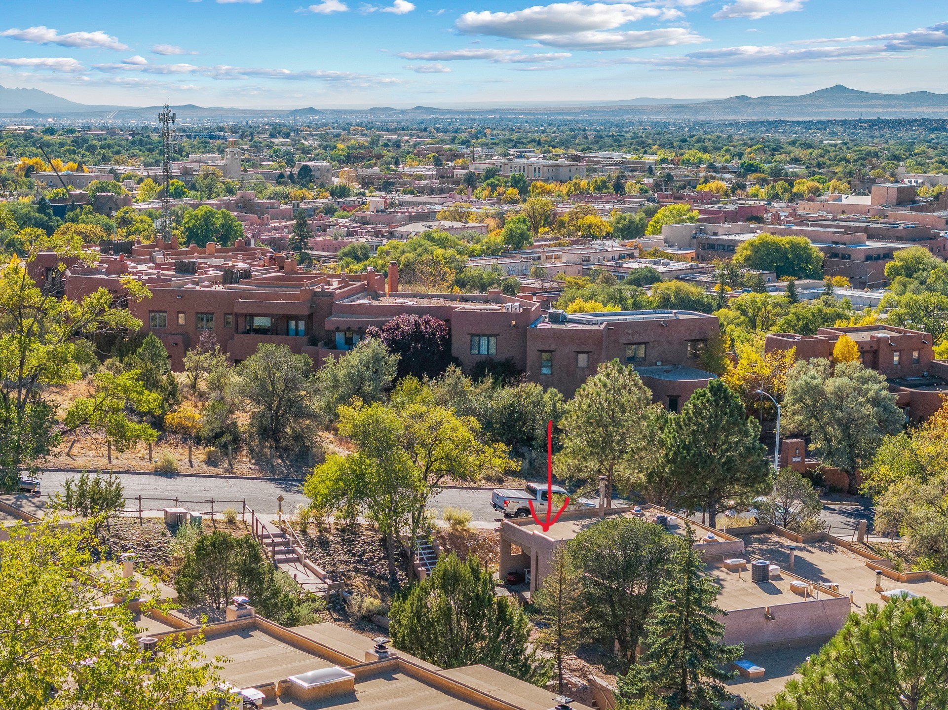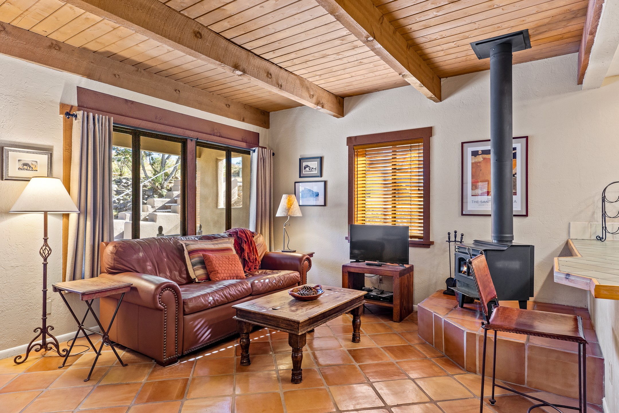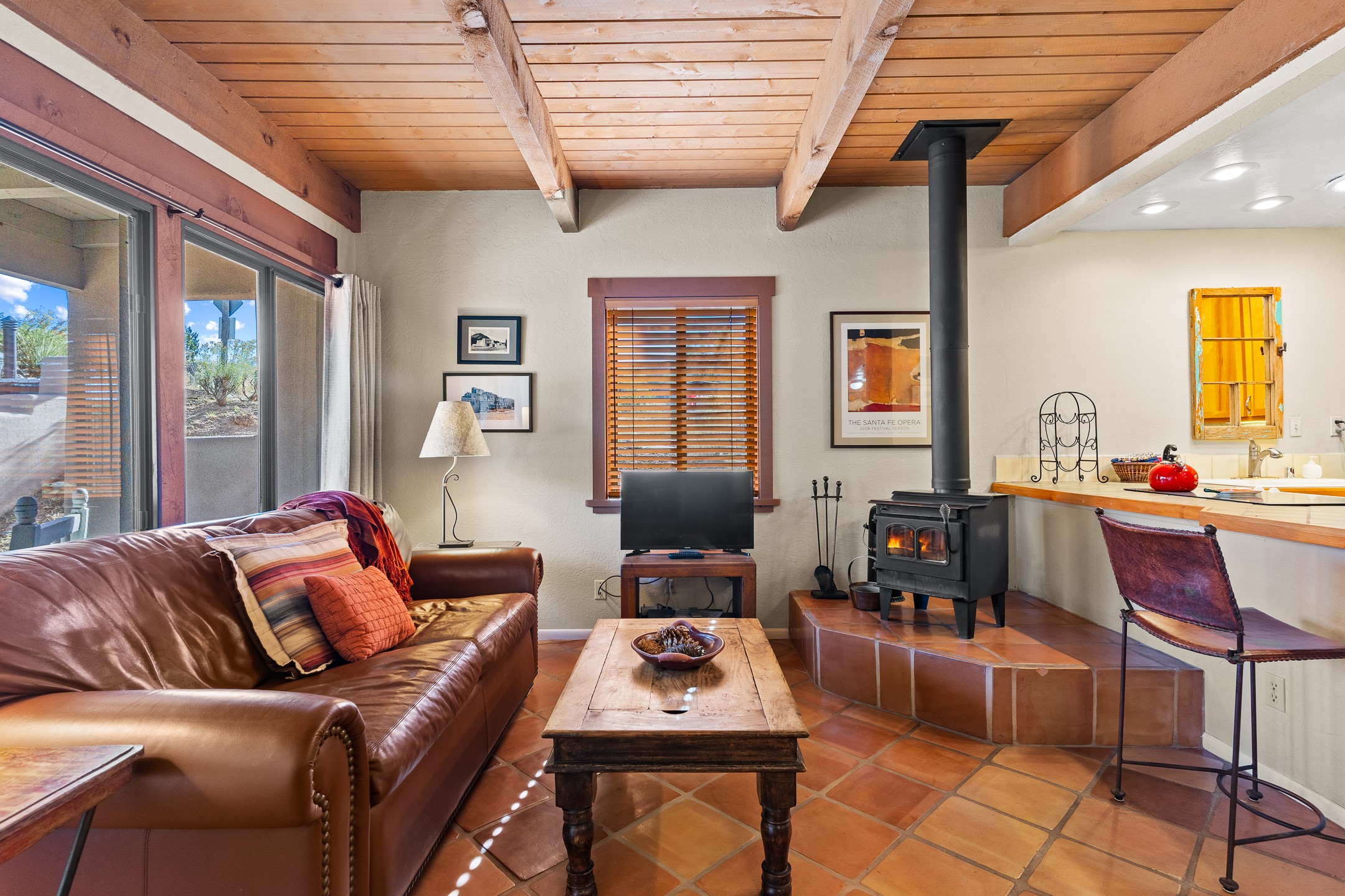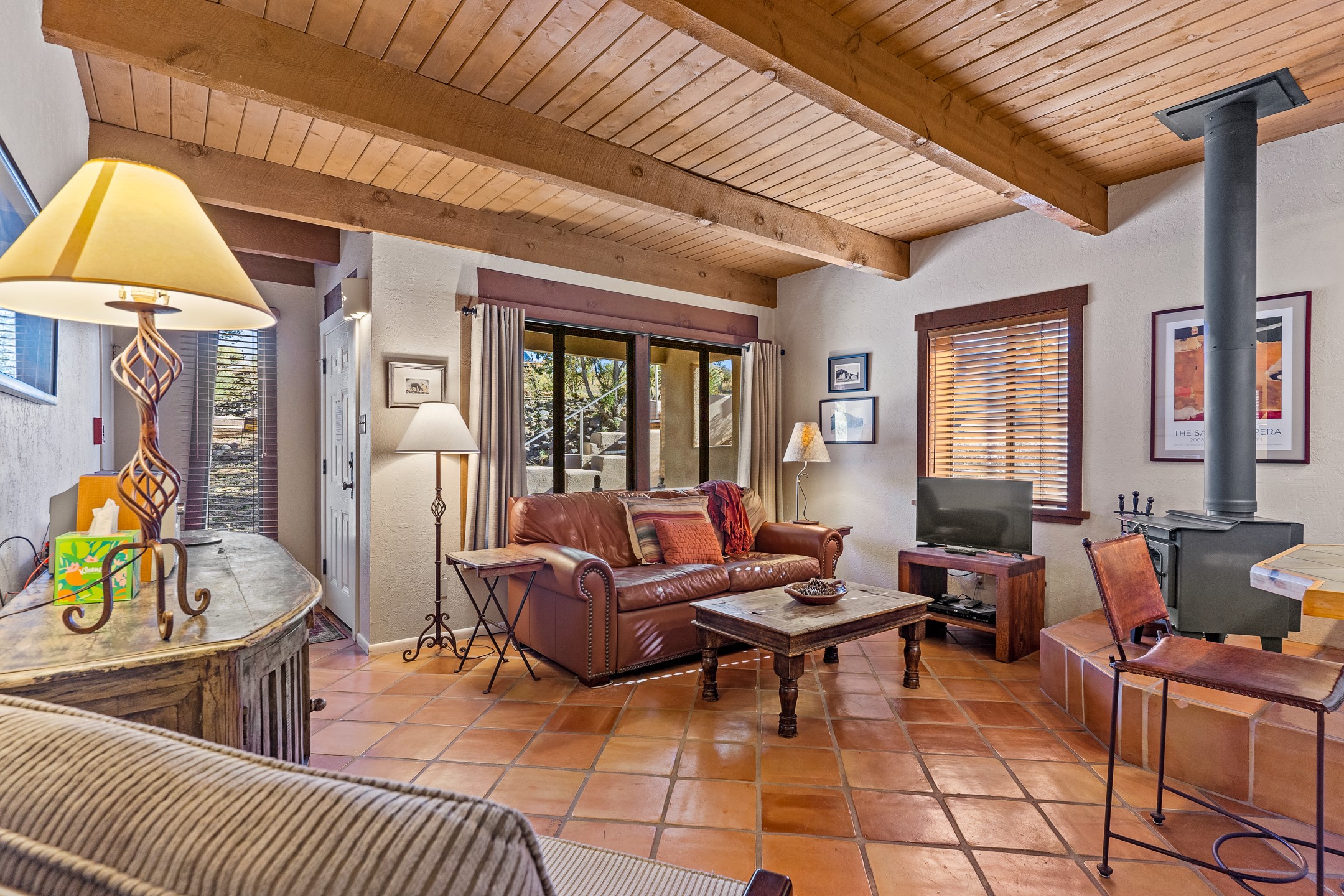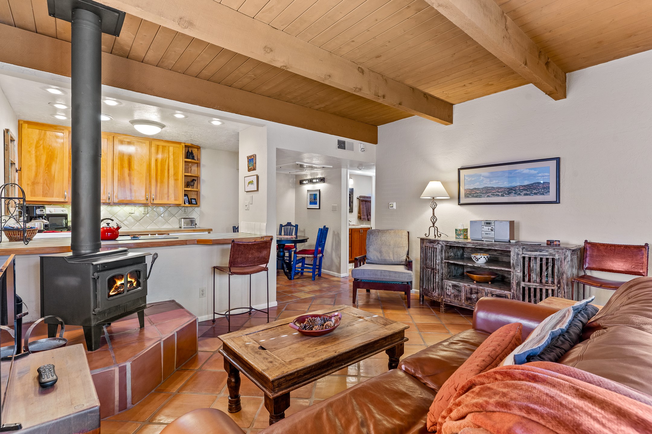 This welcoming one bedroom, one bathroom condo at the Fort Marcy Compound is just 6 blocks from the downtown plaza, and 1 block off Artist/Hyde Park road to 10,000 Waves, hiking & biking trails, and Ski Santa Fe. The pleasant interior is nicely updated, to include a washer/dryer, double sink vanity, and walk-in shower. The kitchen is open and roomy, and the wood-burning stove in the living room will keep you and your guests toasty all winter long! This end unit has no steps to access from parking, and features more windows than others, giving the interior a nice, cheery feel. New roof and HVAC system in 2024. This condo has been enjoyed by the same owner for 22 years over every season, with the east-facing porch cool for summer evenings, and walking a short distance up the hill to catch the sunset and expansive views. Although within walking distance to the downtown area, this condo provides a cozy, quiet retreat. Fort Marcy is a unique property with condos sited over 10 acres, and much of the site left in a natural state, some areas much like a small forest, right in town! This is truly a lock and leave, or can be used for short-term rentals. Full furniture [package conveys with sale at zero dollars. All contents included. Professional management company on-site offers a rental program, and manages the physical plant. Google All Seasons Resort Lodging for more information.