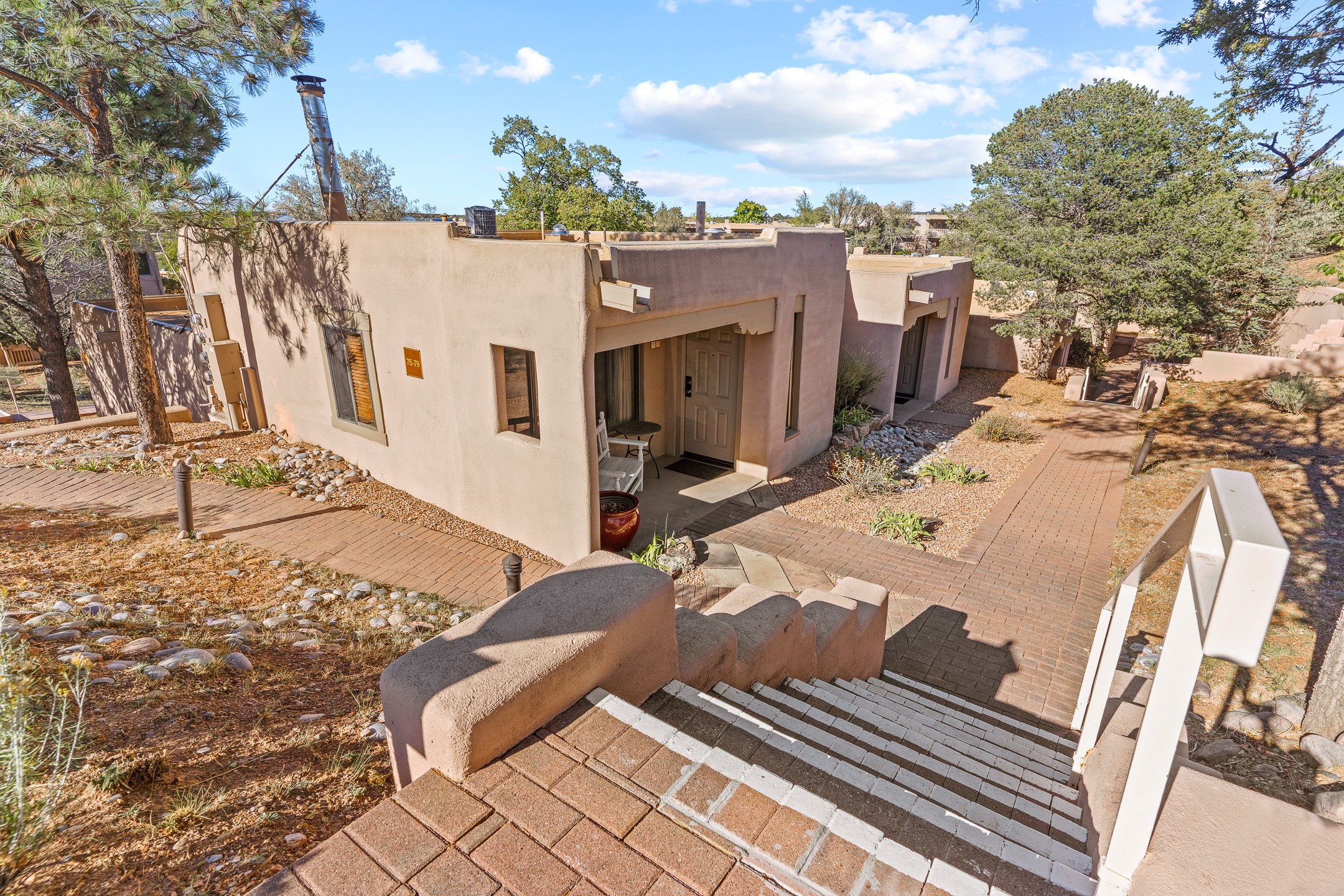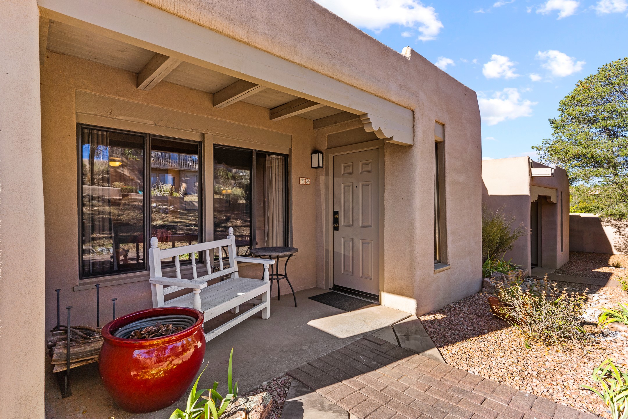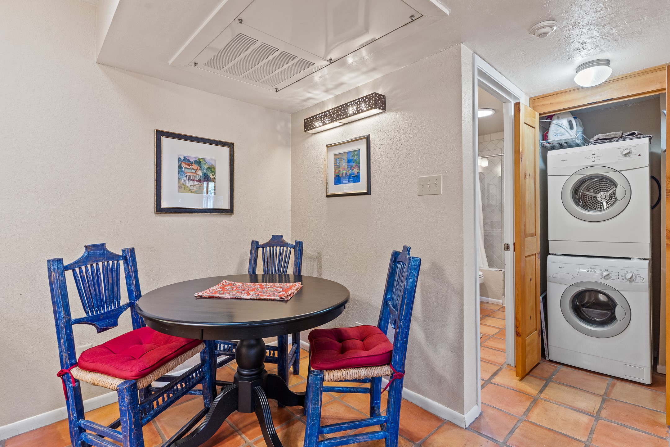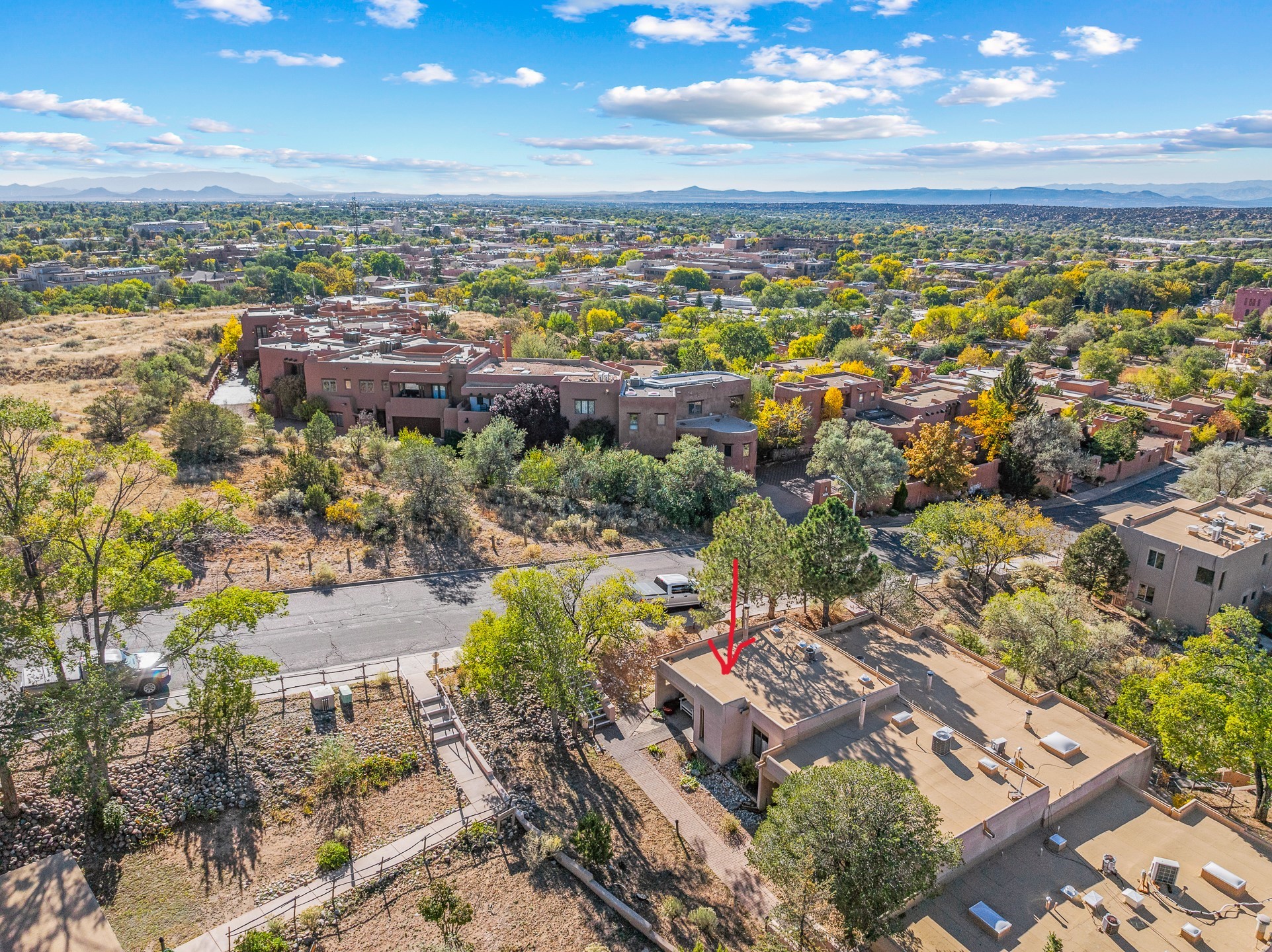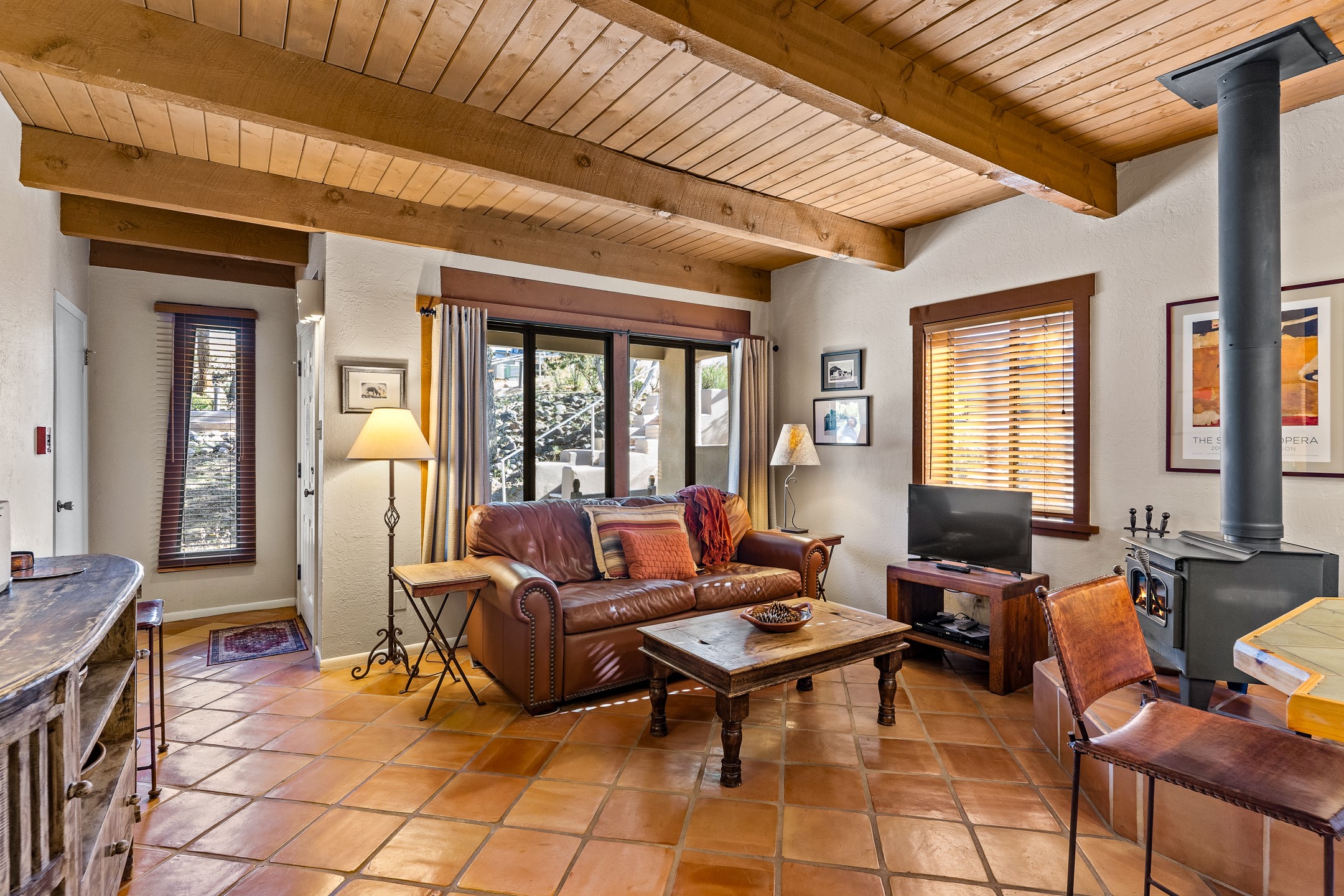 This welcoming one bedroom, one bathroom condo at the Fort Marcy Compound is just 6 blocks from the downtown plaza, and 1 block off Artist/Hyde Park road to 10,000 Waves, hiking & biking trails, and Ski Santa Fe. The pleasant interior is nicely updated, to include a washer/dryer, double sink vanity, and walk-in shower. The kitchen is open and roomy, and the wood-burning stove in the living room will keep you and your guests toasty all winter long! This end unit has no steps to access from parking, and features more windows than others, giving the interior a nice, cheery feel. New roof and HVAC system in 2024. This condo has been enjoyed by the same owner for 22 years over every season, with the east-facing porch cool for summer evenings, and walking a short distance up the hill to catch the sunset and expansive views. Although within walking distance to the downtown area, this condo provides a cozy, quiet retreat. Fort Marcy is a unique property with condos sited over 10 acres, and much of the site left in a natural state, some areas much like a small forest, right in town! This is truly a lock and leave, or can be used for short-term rentals. Full furniture [package conveys with sale at zero dollars. All contents included. Professional management company on-site offers a rental program, and manages the physical plant. Google All Seasons Resort Lodging for more information.