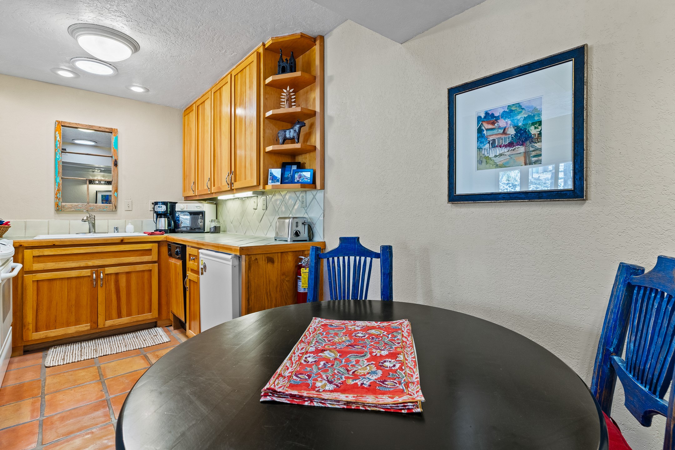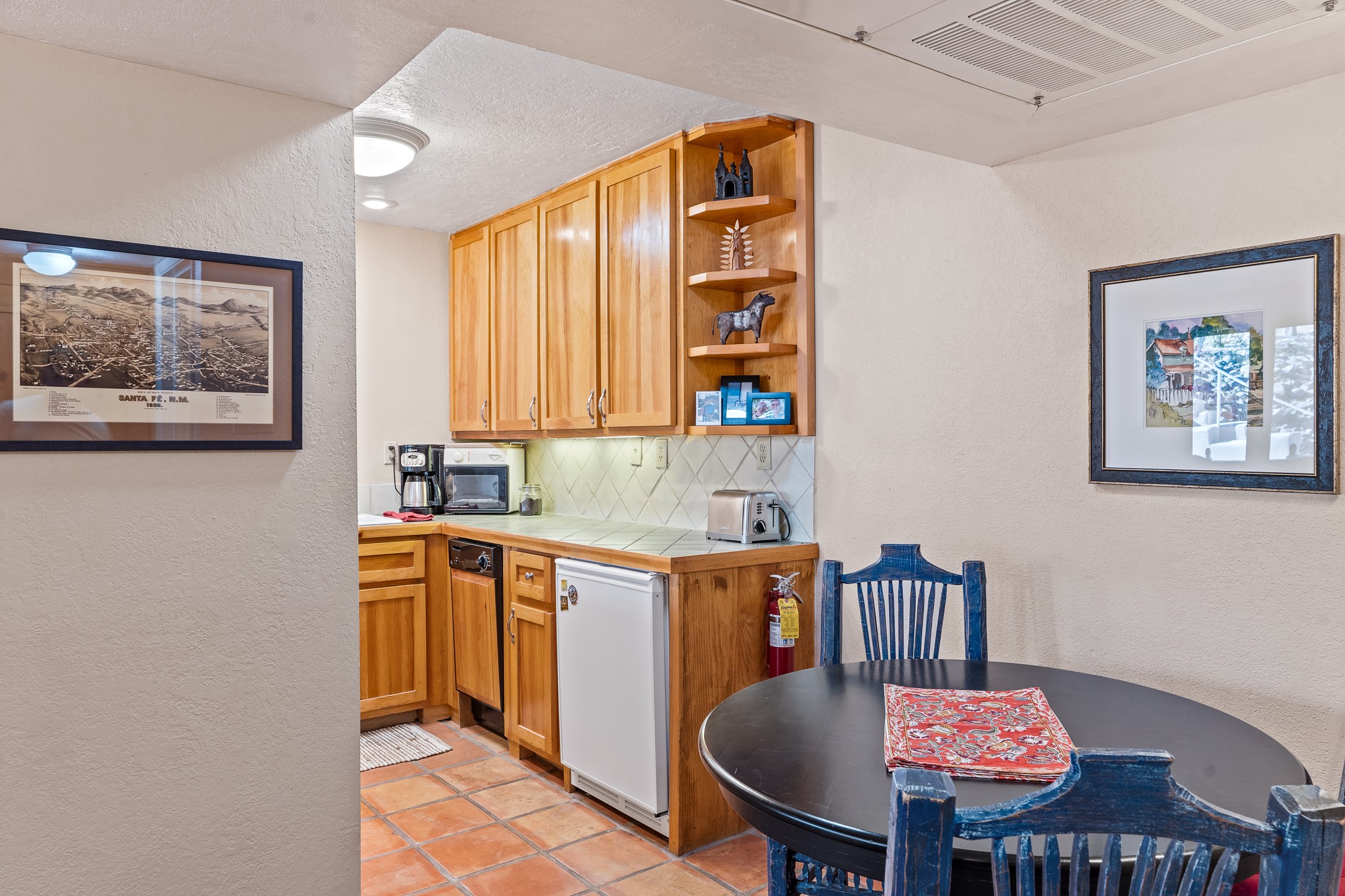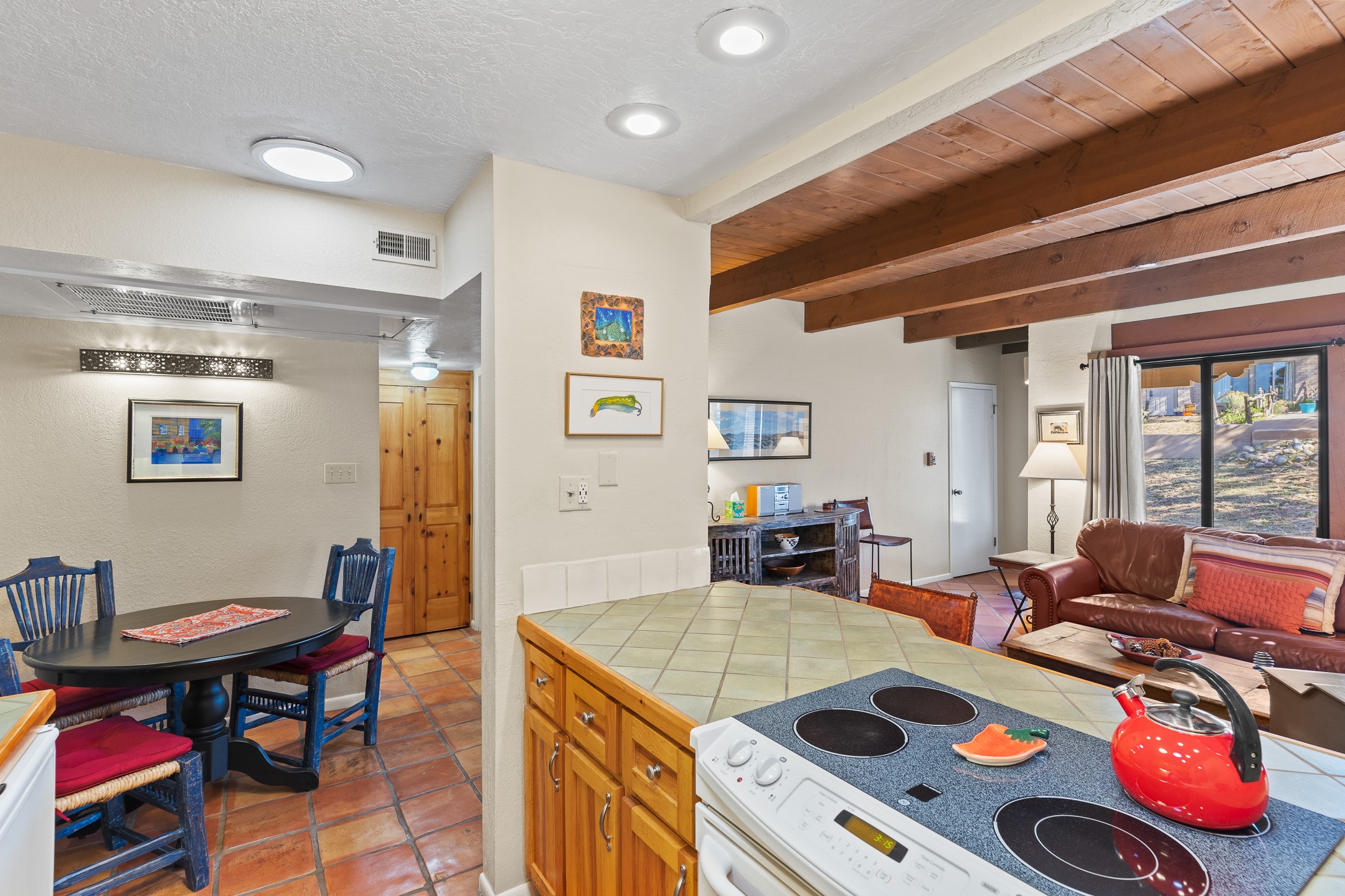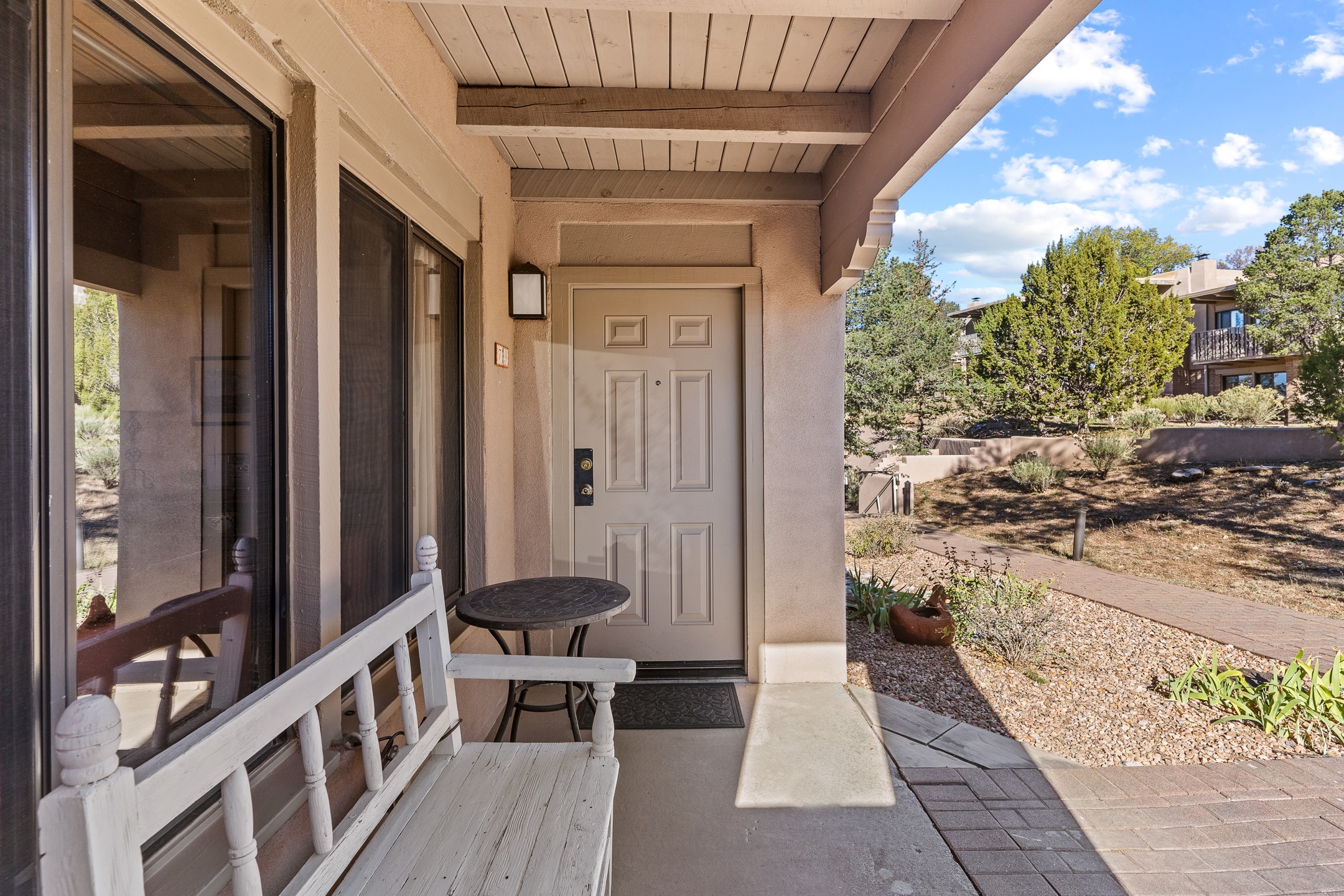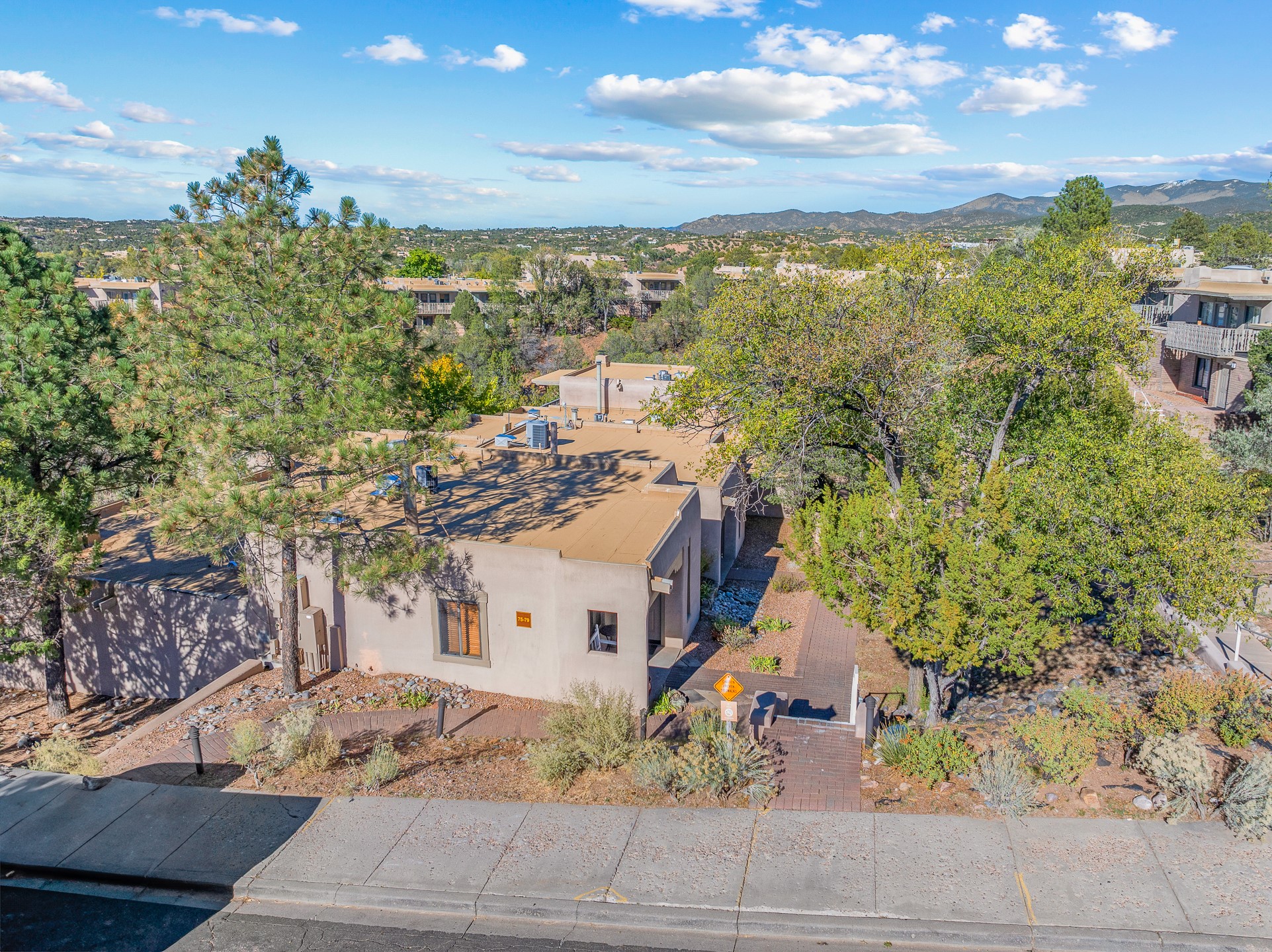 This welcoming one bedroom, one bathroom condo at the Fort Marcy Compound is just 6 blocks from the downtown plaza, and 1 block off Artist/Hyde Park road to 10,000 Waves, hiking & biking trails, and Ski Santa Fe. The pleasant interior is nicely updated, to include a washer/dryer, double sink vanity, and walk-in shower. The kitchen is open and roomy, and the wood-burning stove in the living room will keep you and your guests toasty all winter long! This end unit has no steps to access from parking, and features more windows than others, giving the interior a nice, cheery feel. New roof and HVAC system in 2024. This condo has been enjoyed by the same owner for 22 years over every season, with the east-facing porch cool for summer evenings, and walking a short distance up the hill to catch the sunset and expansive views. Although within walking distance to the downtown area, this condo provides a cozy, quiet retreat. Fort Marcy is a unique property with condos sited over 10 acres, and much of the site left in a natural state, some areas much like a small forest, right in town! This is truly a lock and leave, or can be used for short-term rentals. Full furniture [package conveys with sale at zero dollars. All contents included. Professional management company on-site offers a rental program, and manages the physical plant. Google All Seasons Resort Lodging for more information.
