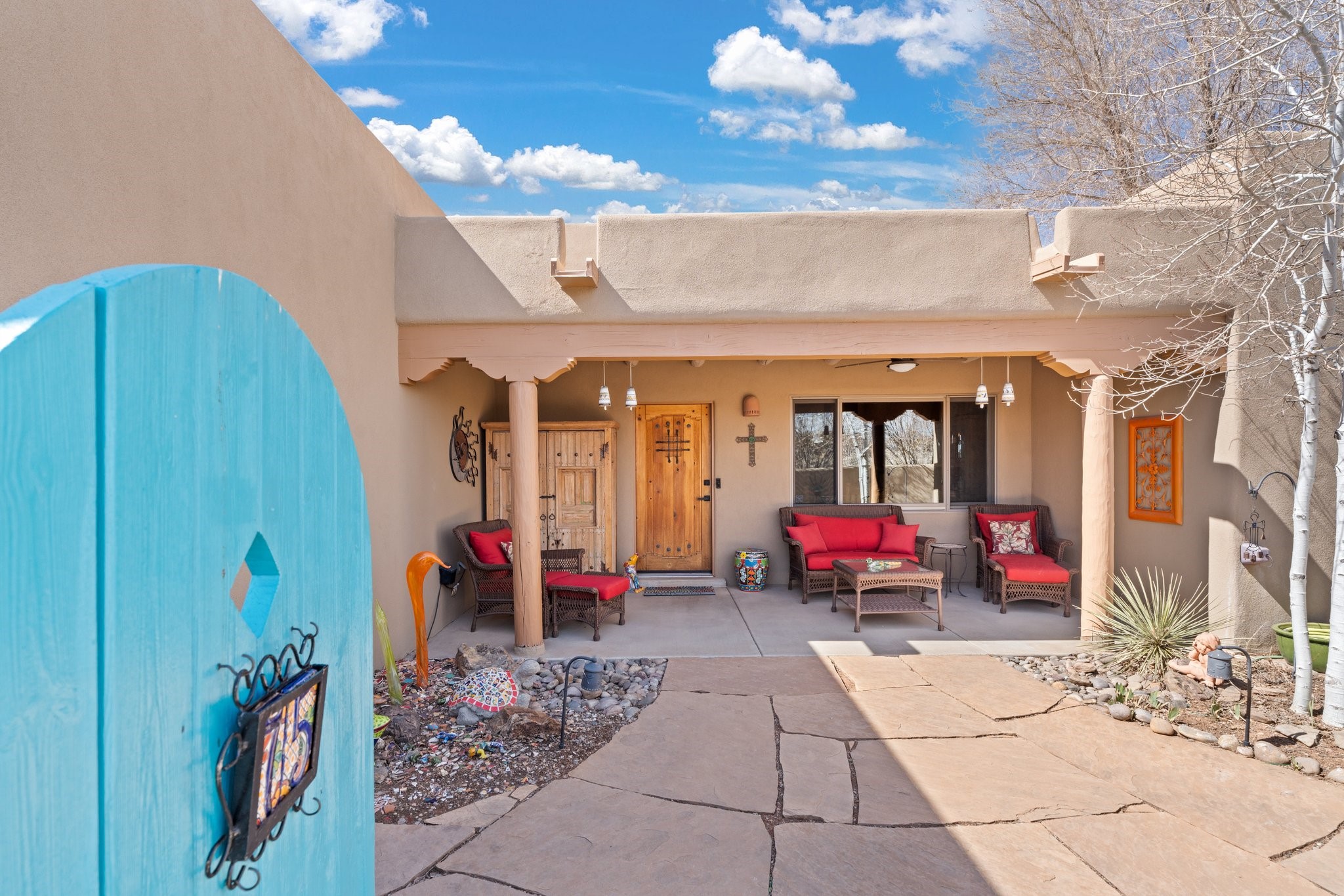 TALK ABOUT HAVING IT ALL!! This Eldorado beauty has wonderful mountain views and extraordinary outdoor spaces with hot tub, roof-top deck, built-in bar and BBQ, kiva fireplace, sun shades and a number of entertaining and seating options and a Bocce Ball court!. Kitchen features under cabinet lighting, hickory cabinetry, great storage, stainless appliances (range has never been used) and built-in desk area. Walk-in pantry has exceptional shelving and room for small appliances. Primary bedroom has viga ceilings, kiva fireplace and doors to rear portal and a library/media room/office is attached. A cedar closet and generous walk-in closet with drawers and shelves. Primary bath has double sinks, large jetted tub and separate shower. Silicone coating on roof in 2021 - six years left on the transferrable warranty. Single-level, no interior steps, in-floor natural gas radiant heat and two evaporative coolers. Sellers use Xfinity for internet. Eye On Water leak detection system through the Eldorado Water Dept. Whole house water filtration. Oversized, finished 2-car garage with overhead storage and lots of cabinets. Heated RV garage is 15 x 40 with 16' ceiling. Three kiva fireplaces. Proper laundry room with abundant storage. ADT alarm system is transferrable. Some outdoor furnishings are conveying with the property. LIST OF IMPROVEMENTS IN SUPPLEMENTS.