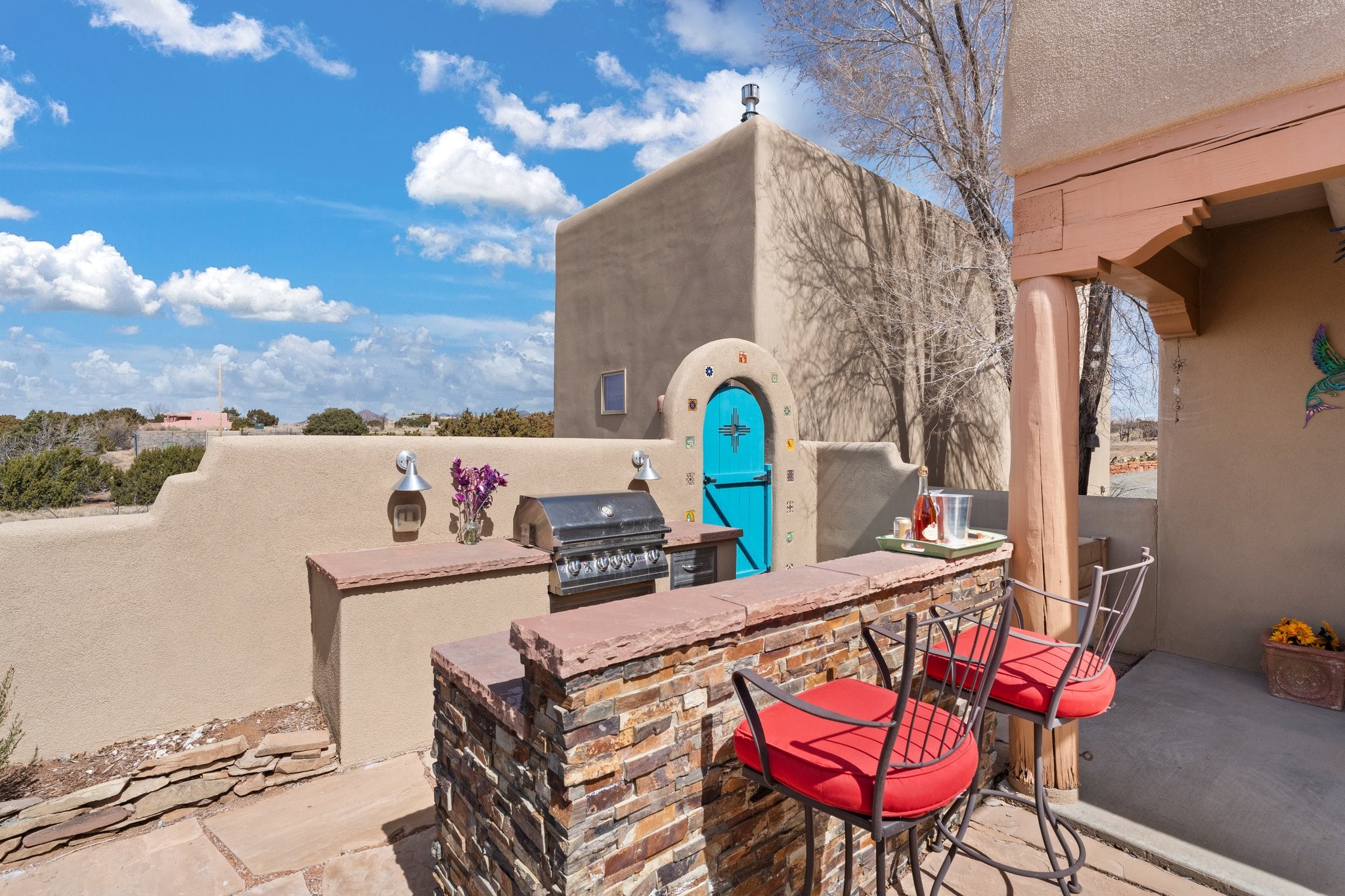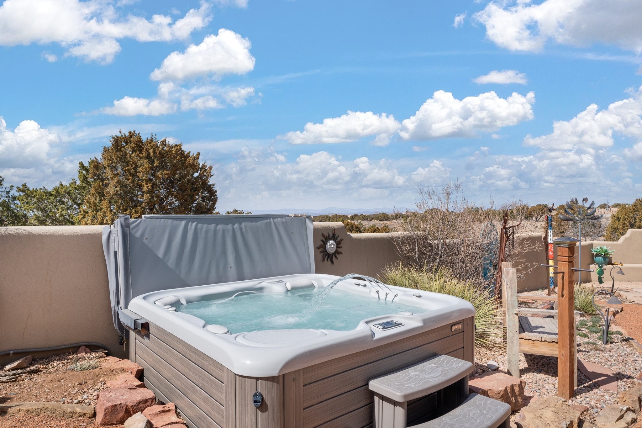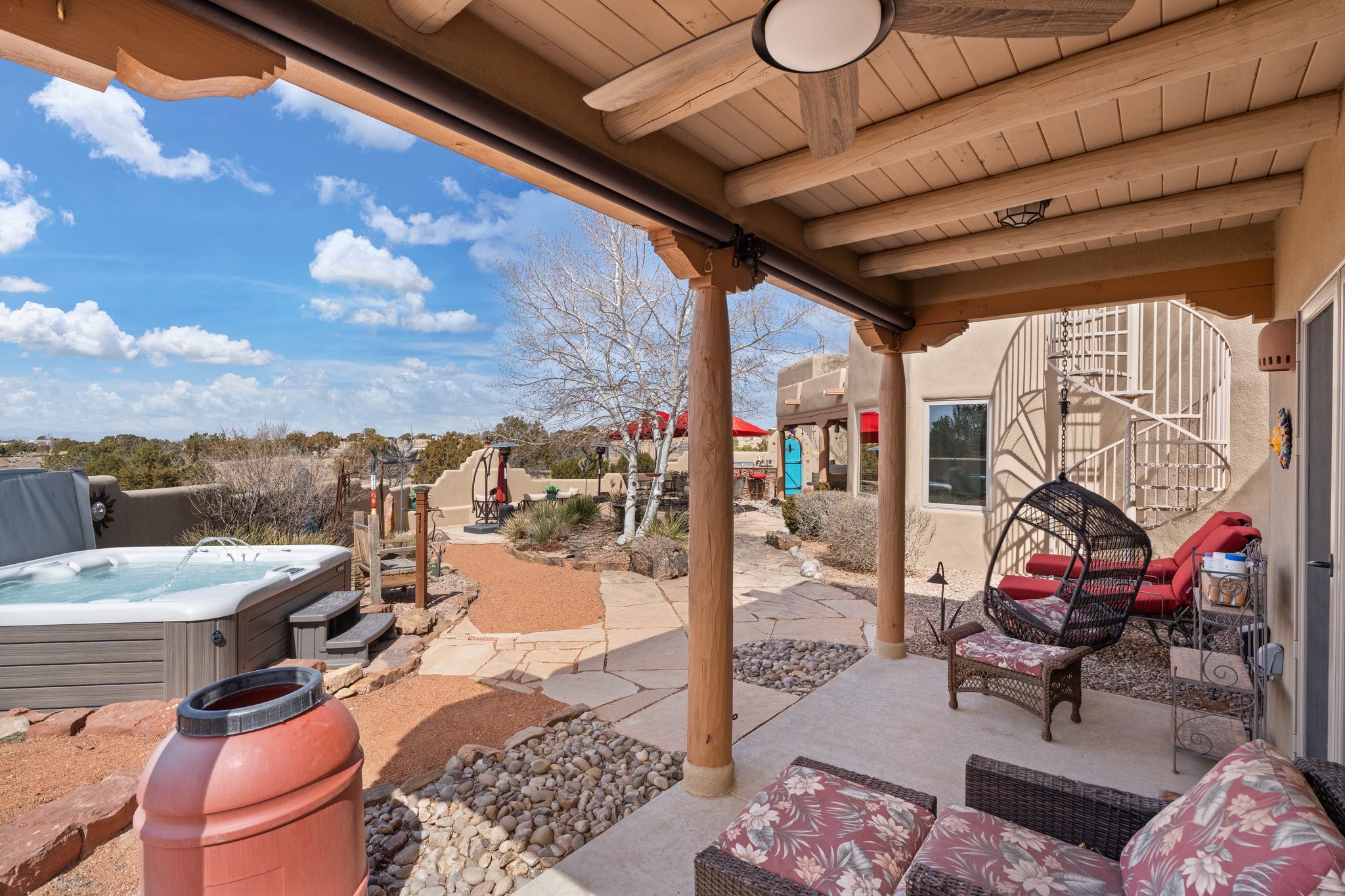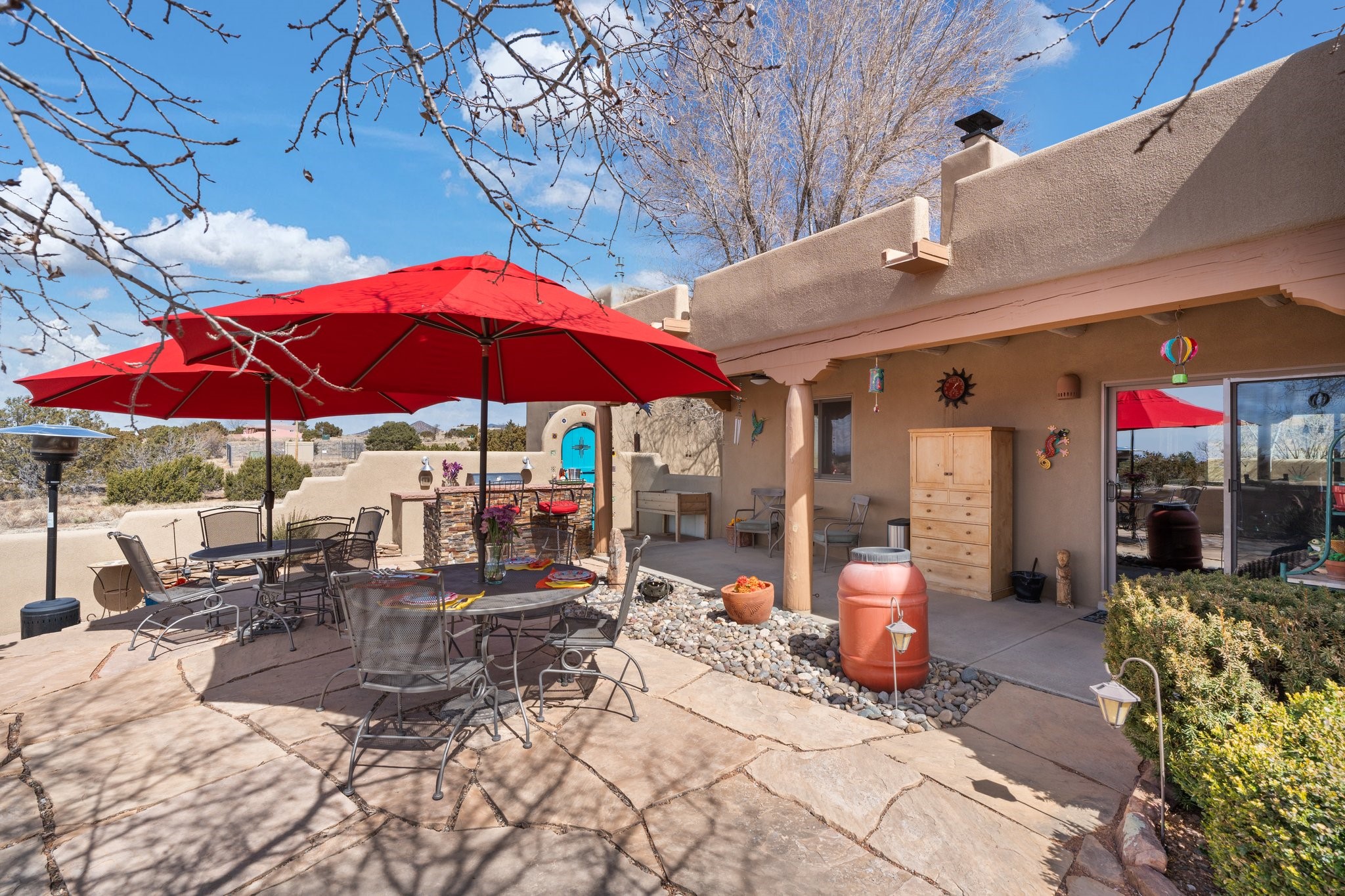 TALK ABOUT HAVING IT ALL!! This Eldorado beauty has wonderful mountain views and extraordinary outdoor spaces with hot tub, roof-top deck, built-in bar and BBQ, kiva fireplace, sun shades and a number of entertaining and seating options and a Bocce Ball court!. Kitchen features under cabinet lighting, hickory cabinetry, great storage, stainless appliances (range has never been used) and built-in desk area. Walk-in pantry has exceptional shelving and room for small appliances. Primary bedroom has viga ceilings, kiva fireplace and doors to rear portal and a library/media room/office is attached. A cedar closet and generous walk-in closet with drawers and shelves. Primary bath has double sinks, large jetted tub and separate shower. Silicone coating on roof in 2021 - six years left on the transferrable warranty. Single-level, no interior steps, in-floor natural gas radiant heat and two evaporative coolers. Sellers use Xfinity for internet. Eye On Water leak detection system through the Eldorado Water Dept. Whole house water filtration. Oversized, finished 2-car garage with overhead storage and lots of cabinets. Heated RV garage is 15 x 40 with 16' ceiling. Three kiva fireplaces. Proper laundry room with abundant storage. ADT alarm system is transferrable. Some outdoor furnishings are conveying with the property. LIST OF IMPROVEMENTS IN SUPPLEMENTS.