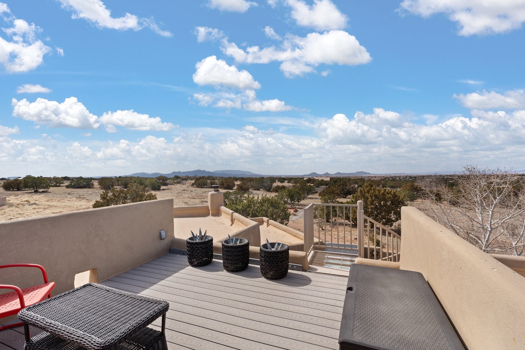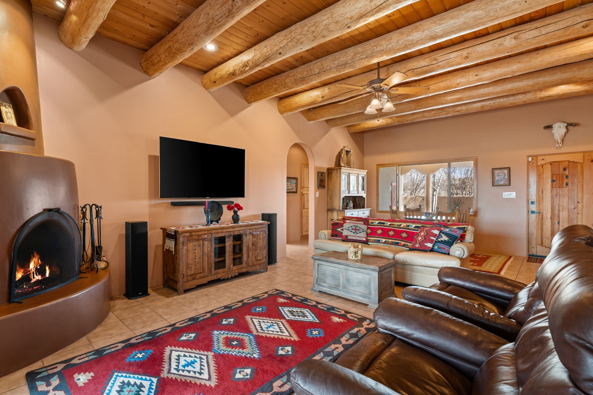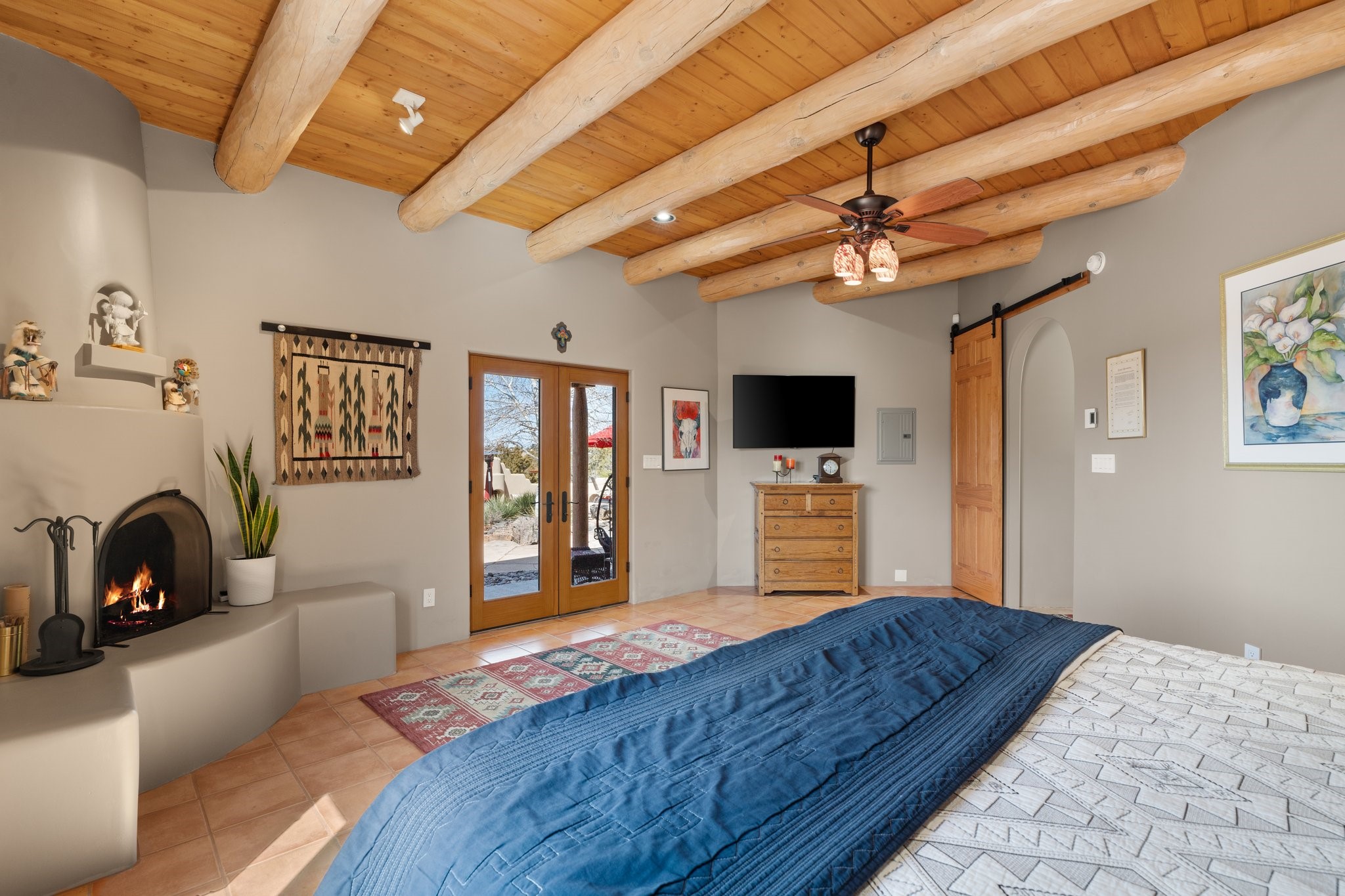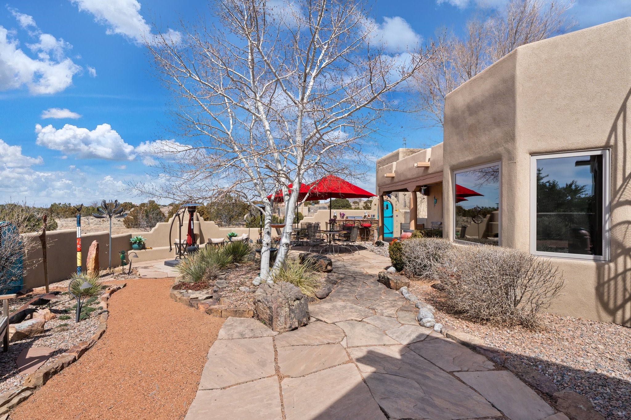 TALK ABOUT HAVING IT ALL!! This Eldorado beauty has wonderful mountain views and extraordinary outdoor spaces with hot tub, roof-top deck, built-in bar and BBQ, kiva fireplace, sun shades and a number of entertaining and seating options and a Bocce Ball court!. Kitchen features under cabinet lighting, hickory cabinetry, great storage, stainless appliances (range has never been used) and built-in desk area. Walk-in pantry has exceptional shelving and room for small appliances. Primary bedroom has viga ceilings, kiva fireplace and doors to rear portal and a library/media room/office is attached. A cedar closet and generous walk-in closet with drawers and shelves. Primary bath has double sinks, large jetted tub and separate shower. Silicone coating on roof in 2021 - six years left on the transferrable warranty. Single-level, no interior steps, in-floor natural gas radiant heat and two evaporative coolers. Sellers use Xfinity for internet. Eye On Water leak detection system through the Eldorado Water Dept. Whole house water filtration. Oversized, finished 2-car garage with overhead storage and lots of cabinets. Heated RV garage is 15 x 40 with 16' ceiling. Three kiva fireplaces. Proper laundry room with abundant storage. ADT alarm system is transferrable. Some outdoor furnishings are conveying with the property. LIST OF IMPROVEMENTS IN SUPPLEMENTS.