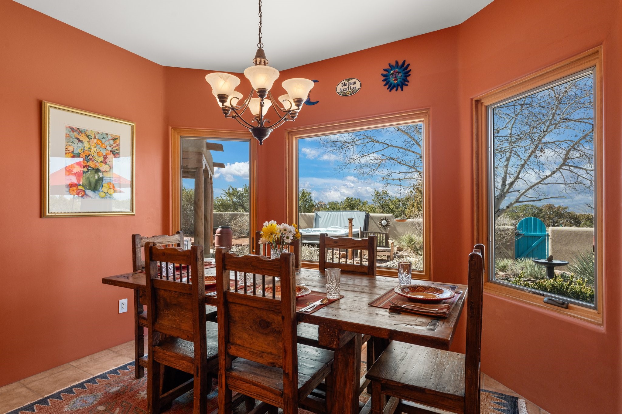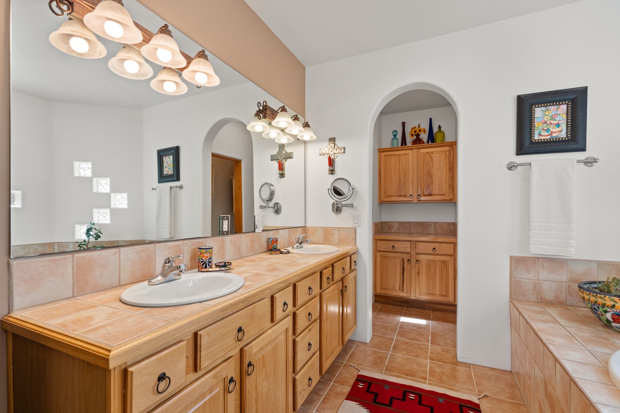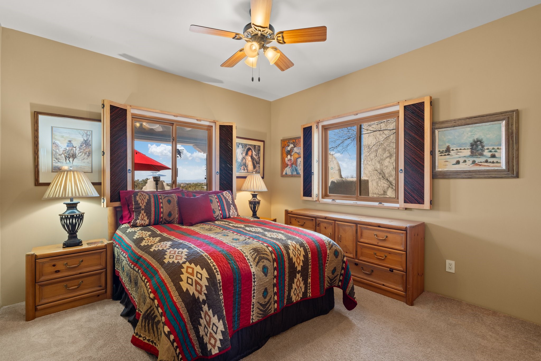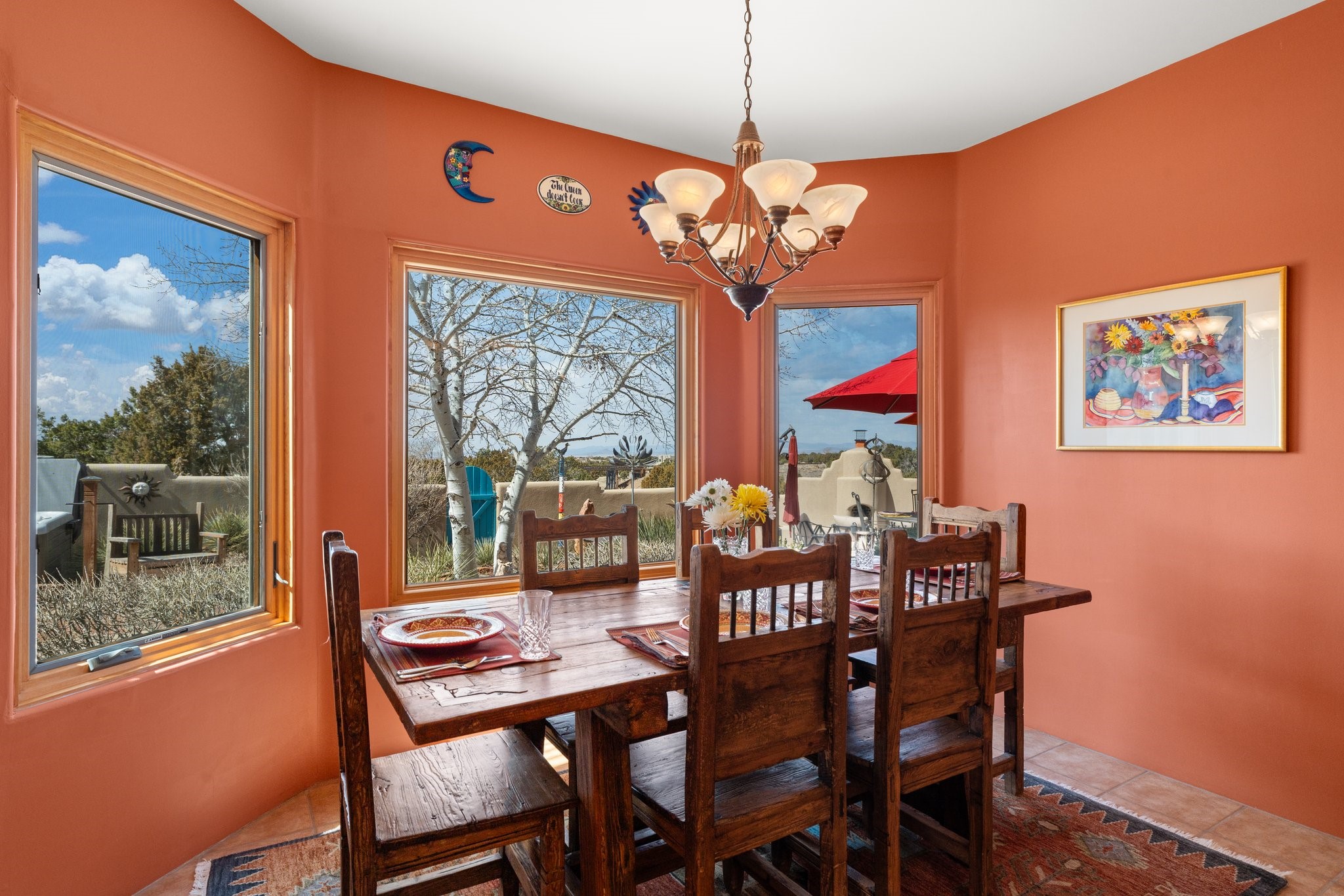 TALK ABOUT HAVING IT ALL!! This Eldorado beauty has wonderful mountain views and extraordinary outdoor spaces with hot tub, roof-top deck, built-in bar and BBQ, kiva fireplace, sun shades and a number of entertaining and seating options and a Bocce Ball court!. Kitchen features under cabinet lighting, hickory cabinetry, great storage, stainless appliances (range has never been used) and built-in desk area. Walk-in pantry has exceptional shelving and room for small appliances. Primary bedroom has viga ceilings, kiva fireplace and doors to rear portal and a library/media room/office is attached. A cedar closet and generous walk-in closet with drawers and shelves. Primary bath has double sinks, large jetted tub and separate shower. Silicone coating on roof in 2021 - six years left on the transferrable warranty. Single-level, no interior steps, in-floor natural gas radiant heat and two evaporative coolers. Sellers use Xfinity for internet. Eye On Water leak detection system through the Eldorado Water Dept. Whole house water filtration. Oversized, finished 2-car garage with overhead storage and lots of cabinets. Heated RV garage is 15 x 40 with 16' ceiling. Three kiva fireplaces. Proper laundry room with abundant storage. ADT alarm system is transferrable. Some outdoor furnishings are conveying with the property. LIST OF IMPROVEMENTS IN SUPPLEMENTS.