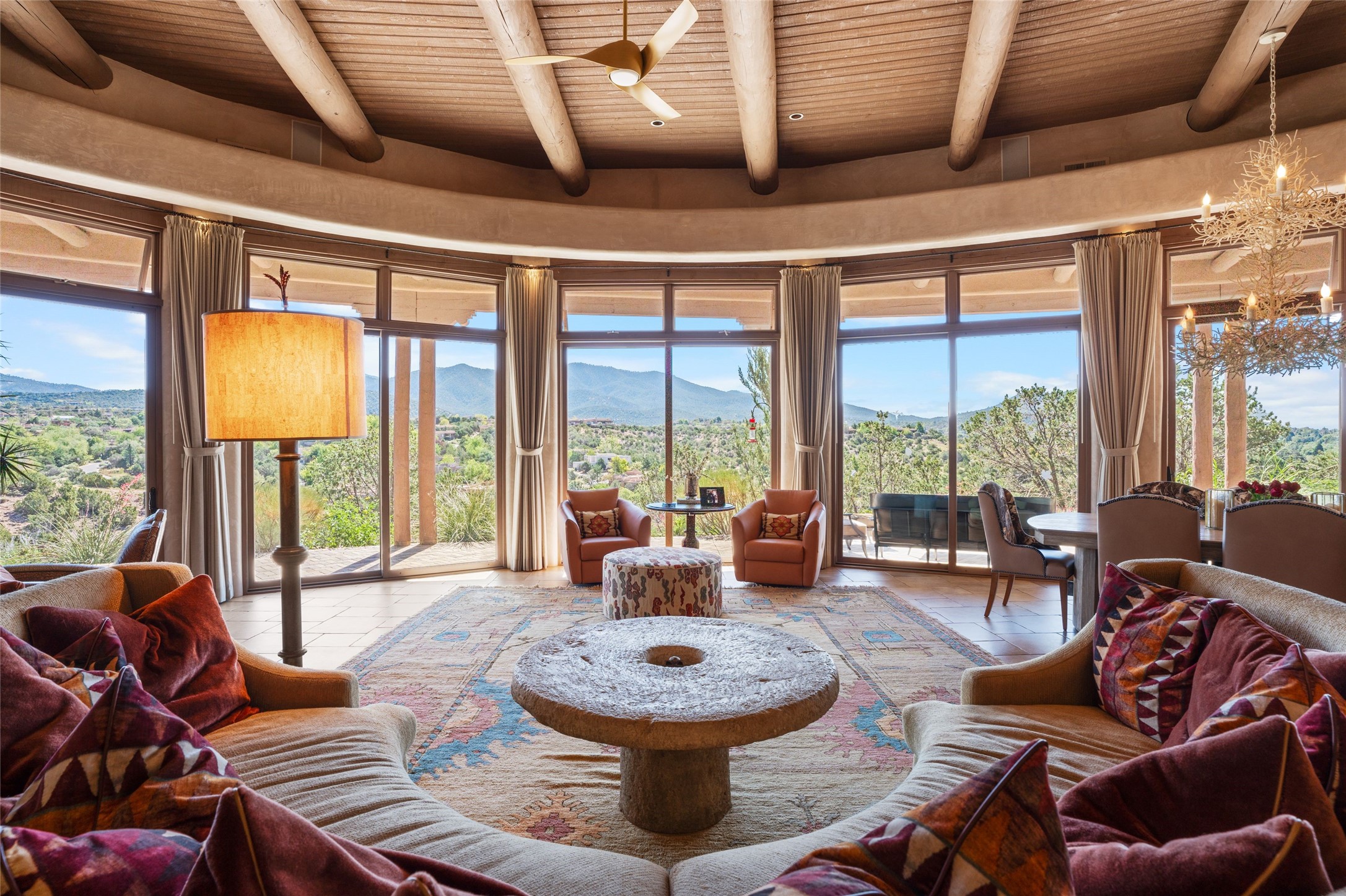 Los Altos/ Estancia Primera 3 bedroom 2.5 bath elegant home and sizable guest house with spectacular Sangre de Cristo mountain views. Strategically sited and custom designed by architect developer John Le Master. Single level; no interior steps. A striking entryway opens into the spacious living area with soaring ceilings, tile floors and soft, sculptural details in lustrous plaster walls as a curved wall of floor-to-ceiling windows brings the breathtaking view into the room. The wrap-around portal extends the living/dining space, perfect for enjoying the sun or al fresco entertaining in warm weather months. Open and artfully designed, the gourmet kitchen is appointed with center island, rounded bar, abundant storage, built-in sidebar, and superior-quality appliances. Split bedroom plan for privacy. Primary wing with bedroom with kiva fireplace and access to outside portal, a spa-like bathroom, a generous walk-in closet, study and hot tub on a separate private deck. Just off the kitchen are two additional en suite bedrooms, a laundry room, and access to the over-sized 2-car garage with a rooftop deck overlooking the downtown Plaza and city lights. The guesthouse includes a great room, full kitchen, 2 bedrooms and 2 baths. Mature landscaping, built in fountains. The community of Estancia Primera offers a clubhouse, pool and tennis court. Conveniently located close to the Historic Plaza, Canyon Road, Museum Hill, hiking trails, and with easy access to the Santa Fe Ski Basin.
