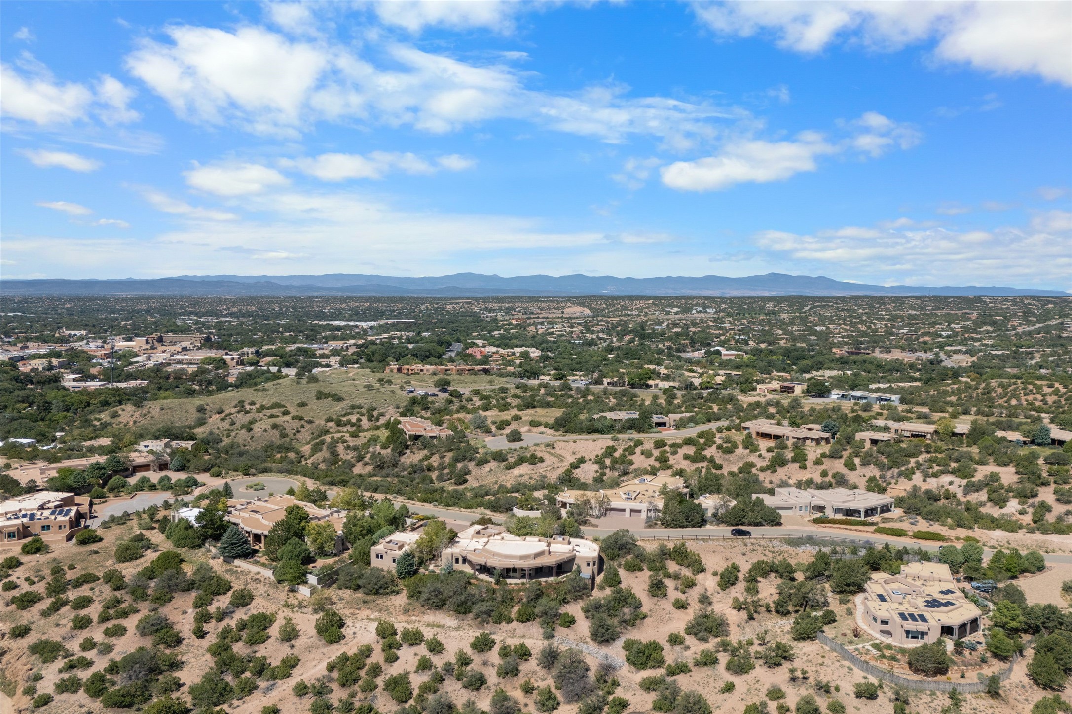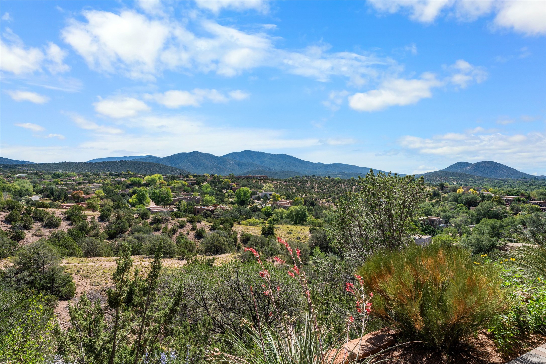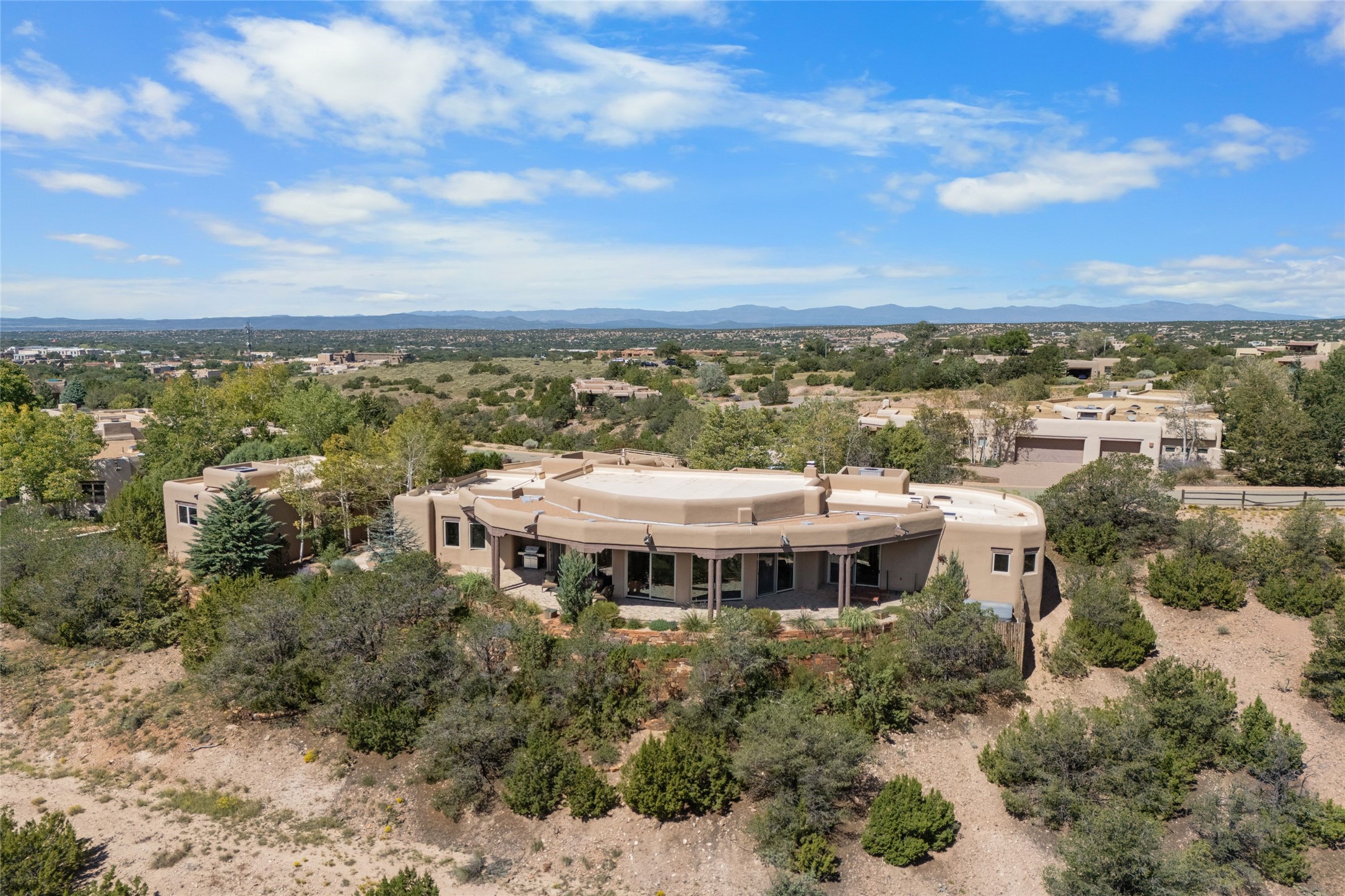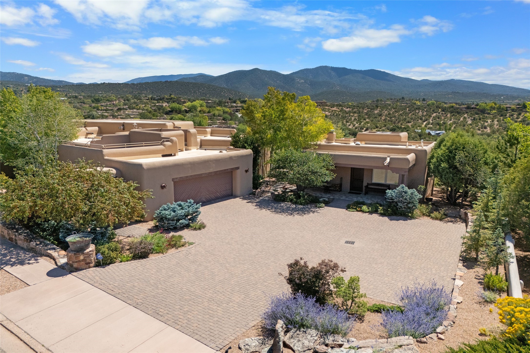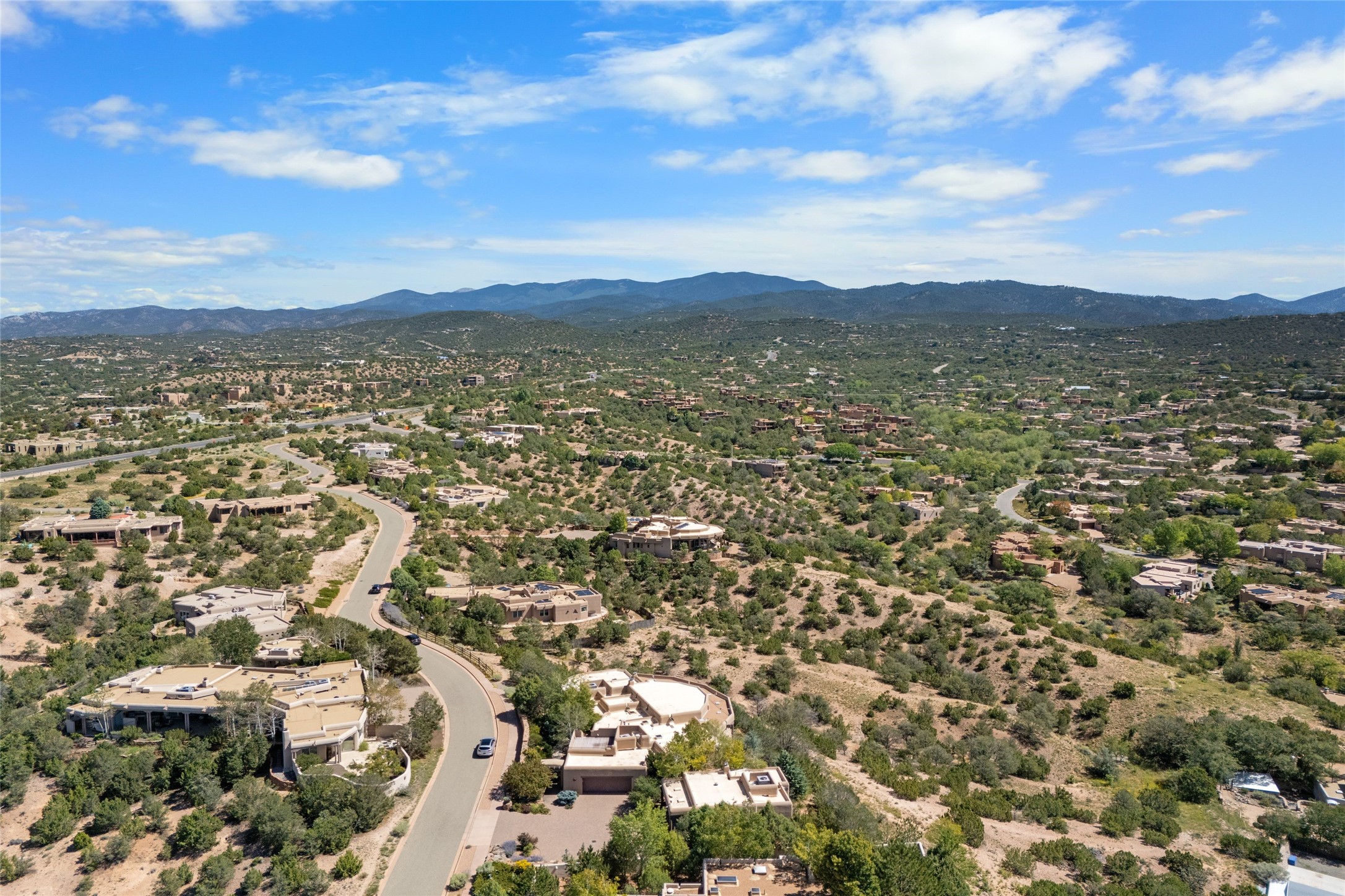 Los Altos/ Estancia Primera 3 bedroom 2.5 bath elegant home and sizable guest house with spectacular Sangre de Cristo mountain views. Strategically sited and custom designed by architect developer John Le Master. Single level; no interior steps. A striking entryway opens into the spacious living area with soaring ceilings, tile floors and soft, sculptural details in lustrous plaster walls as a curved wall of floor-to-ceiling windows brings the breathtaking view into the room. The wrap-around portal extends the living/dining space, perfect for enjoying the sun or al fresco entertaining in warm weather months. Open and artfully designed, the gourmet kitchen is appointed with center island, rounded bar, abundant storage, built-in sidebar, and superior-quality appliances. Split bedroom plan for privacy. Primary wing with bedroom with kiva fireplace and access to outside portal, a spa-like bathroom, a generous walk-in closet, study and hot tub on a separate private deck. Just off the kitchen are two additional en suite bedrooms, a laundry room, and access to the over-sized 2-car garage with a rooftop deck overlooking the downtown Plaza and city lights. The guesthouse includes a great room, full kitchen, 2 bedrooms and 2 baths. Mature landscaping, built in fountains. The community of Estancia Primera offers a clubhouse, pool and tennis court. Conveniently located close to the Historic Plaza, Canyon Road, Museum Hill, hiking trails, and with easy access to the Santa Fe Ski Basin.