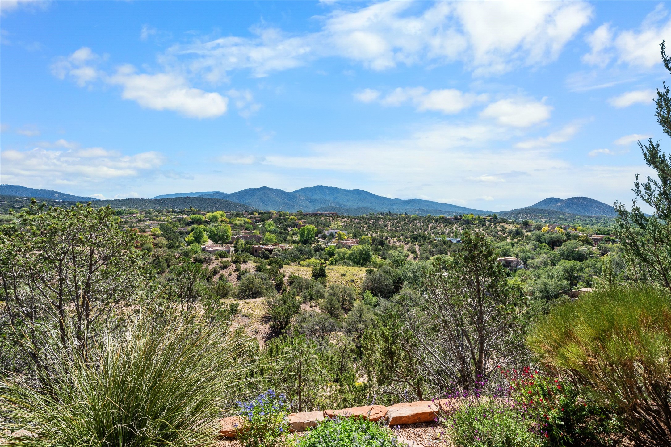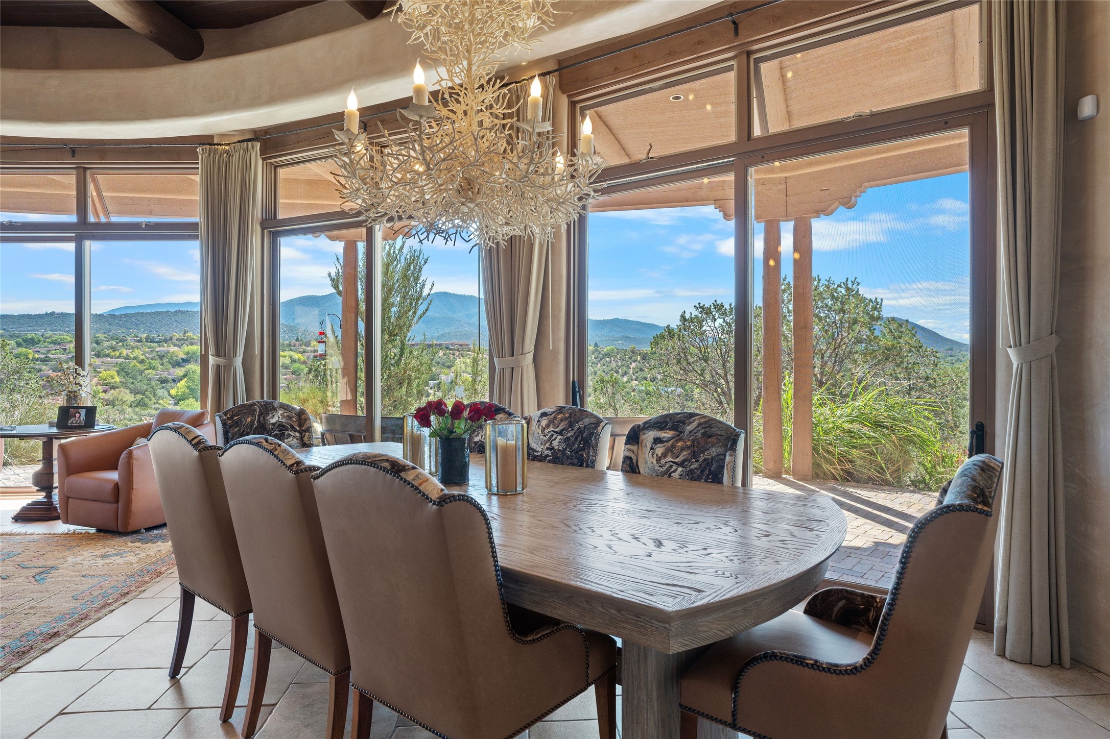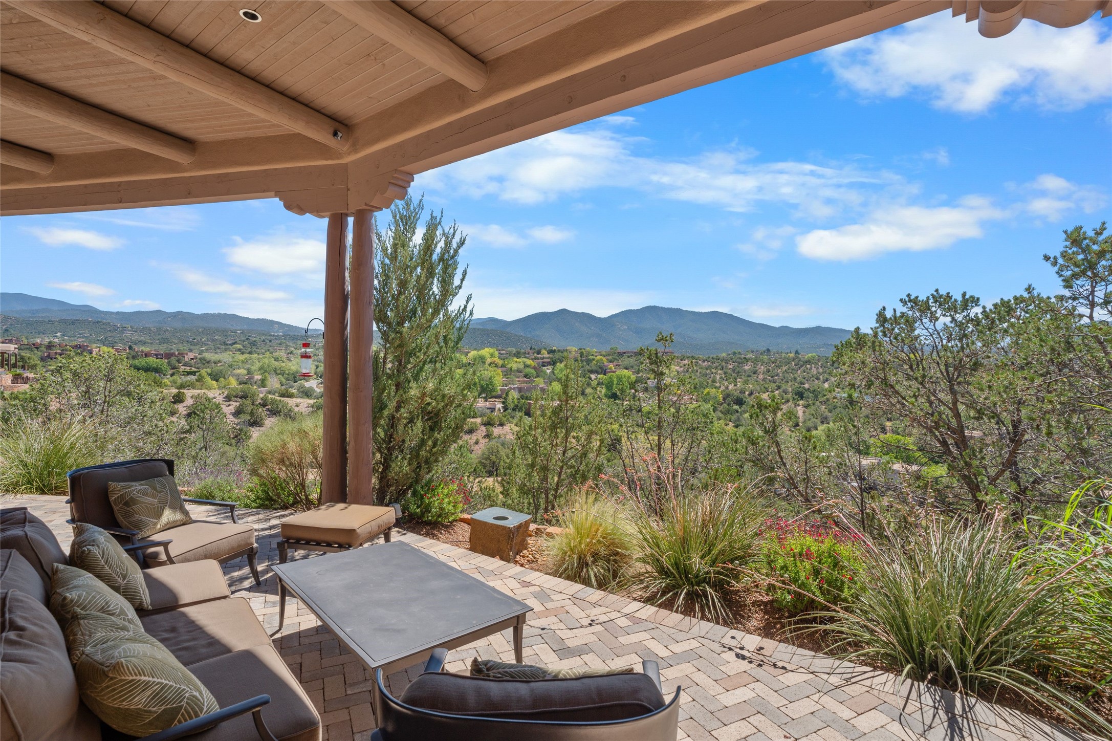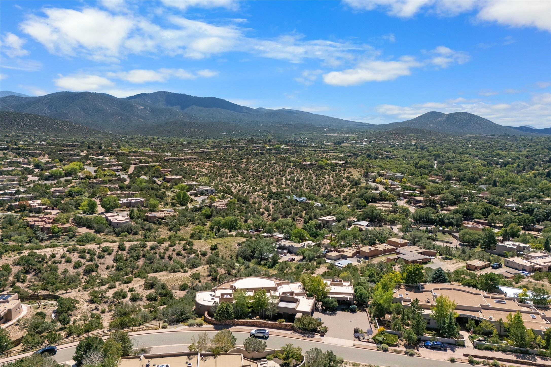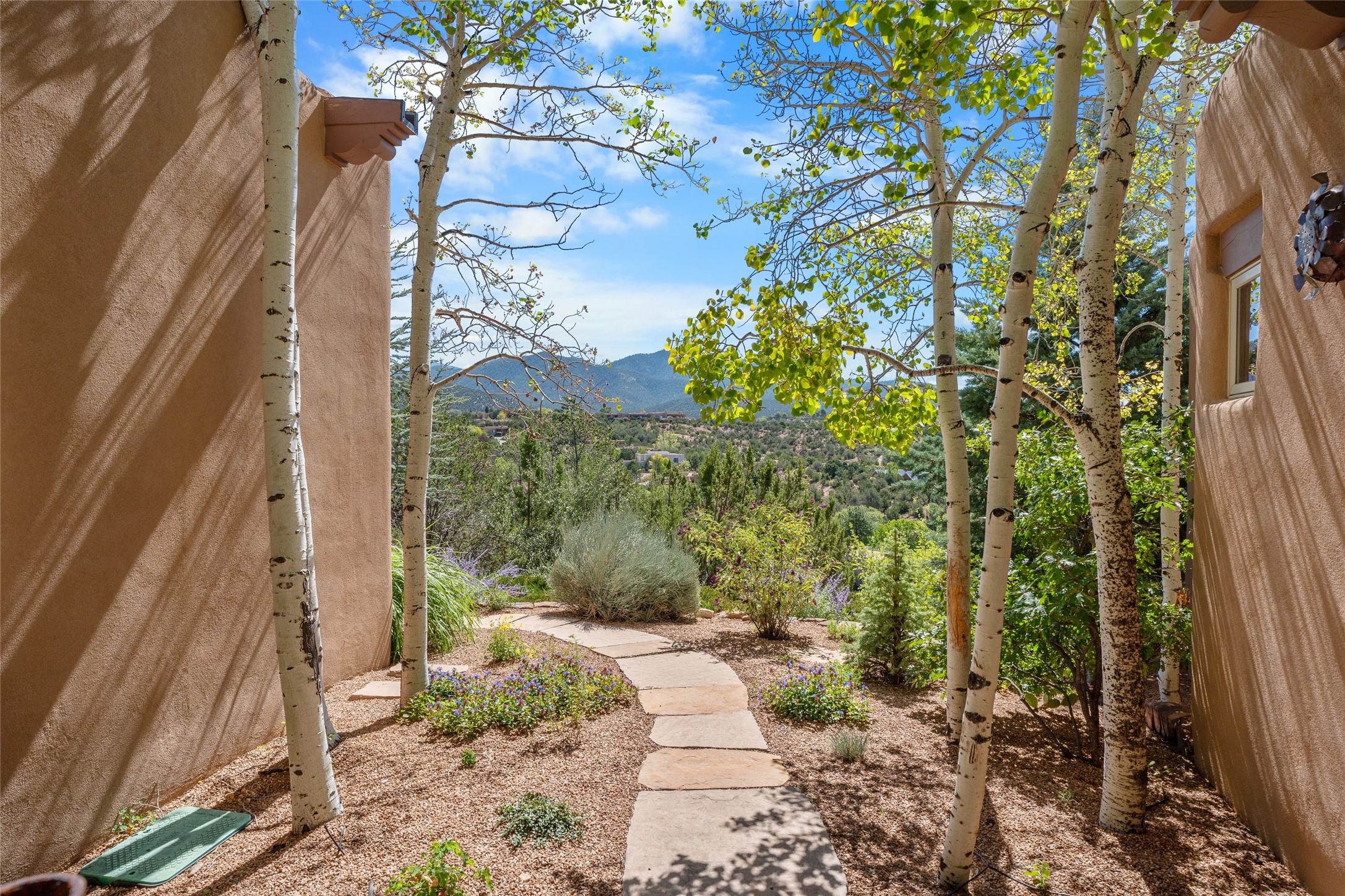 Los Altos/ Estancia Primera 3 bedroom 2.5 bath elegant home and sizable guest house with spectacular Sangre de Cristo mountain views. Strategically sited and custom designed by architect developer John Le Master. Single level; no interior steps. A striking entryway opens into the spacious living area with soaring ceilings, tile floors and soft, sculptural details in lustrous plaster walls as a curved wall of floor-to-ceiling windows brings the breathtaking view into the room. The wrap-around portal extends the living/dining space, perfect for enjoying the sun or al fresco entertaining in warm weather months. Open and artfully designed, the gourmet kitchen is appointed with center island, rounded bar, abundant storage, built-in sidebar, and superior-quality appliances. Split bedroom plan for privacy. Primary wing with bedroom with kiva fireplace and access to outside portal, a spa-like bathroom, a generous walk-in closet, study and hot tub on a separate private deck. Just off the kitchen are two additional en suite bedrooms, a laundry room, and access to the over-sized 2-car garage with a rooftop deck overlooking the downtown Plaza and city lights. The guesthouse includes a great room, full kitchen, 2 bedrooms and 2 baths. Mature landscaping, built in fountains. The community of Estancia Primera offers a clubhouse, pool and tennis court. Conveniently located close to the Historic Plaza, Canyon Road, Museum Hill, hiking trails, and with easy access to the Santa Fe Ski Basin.