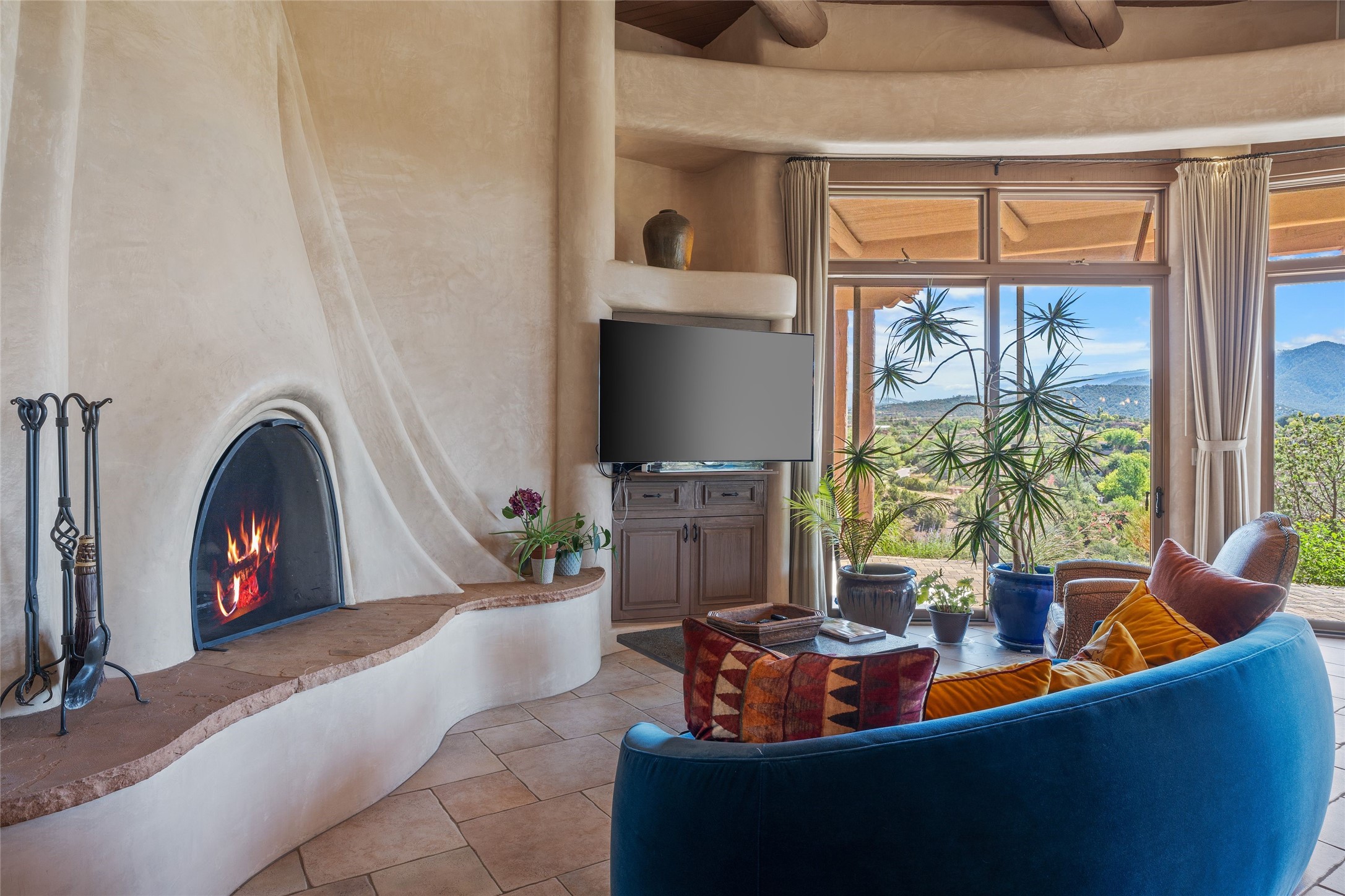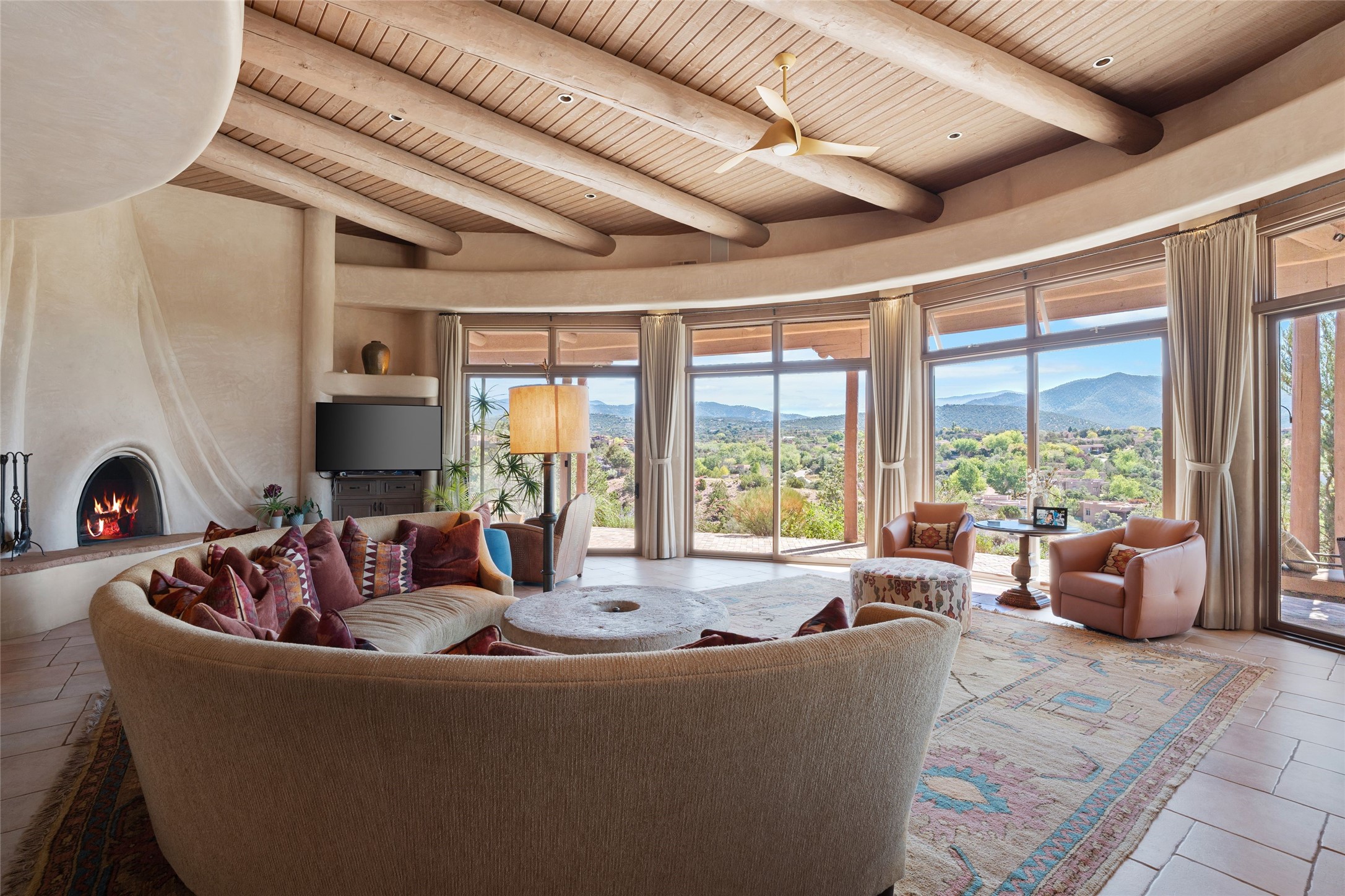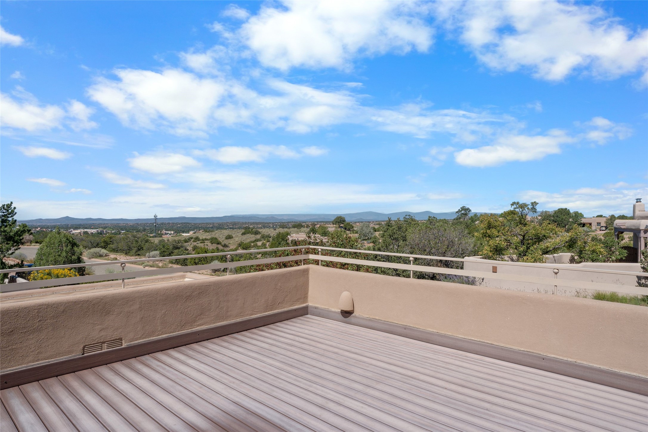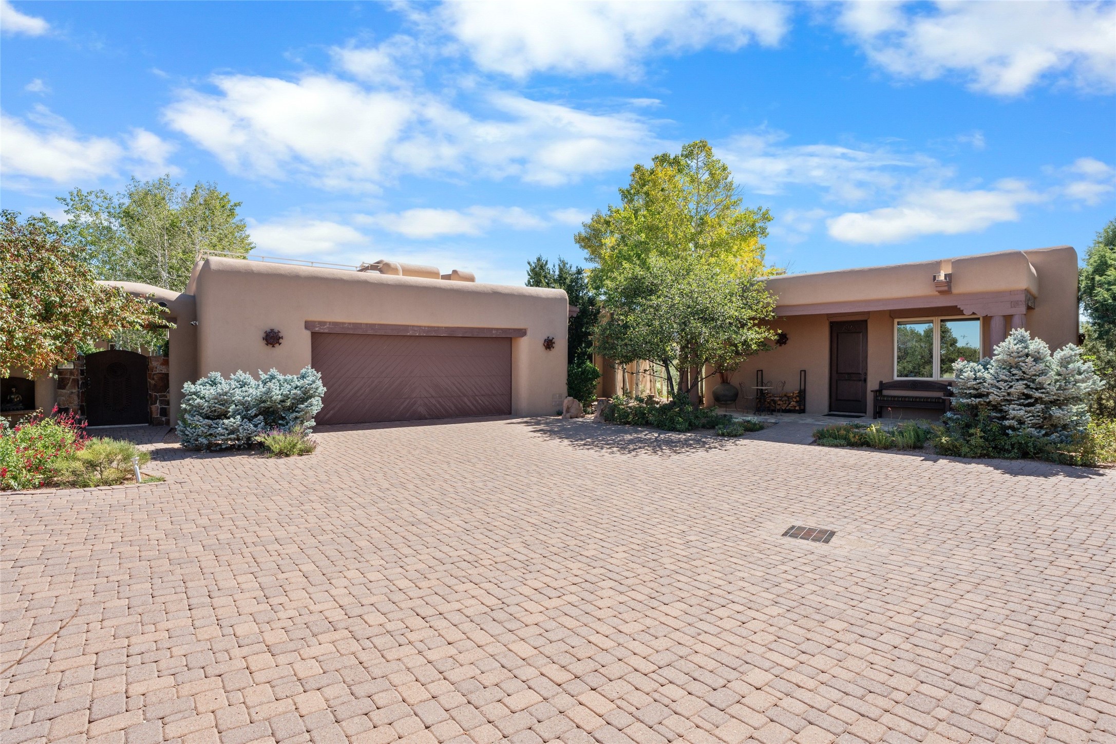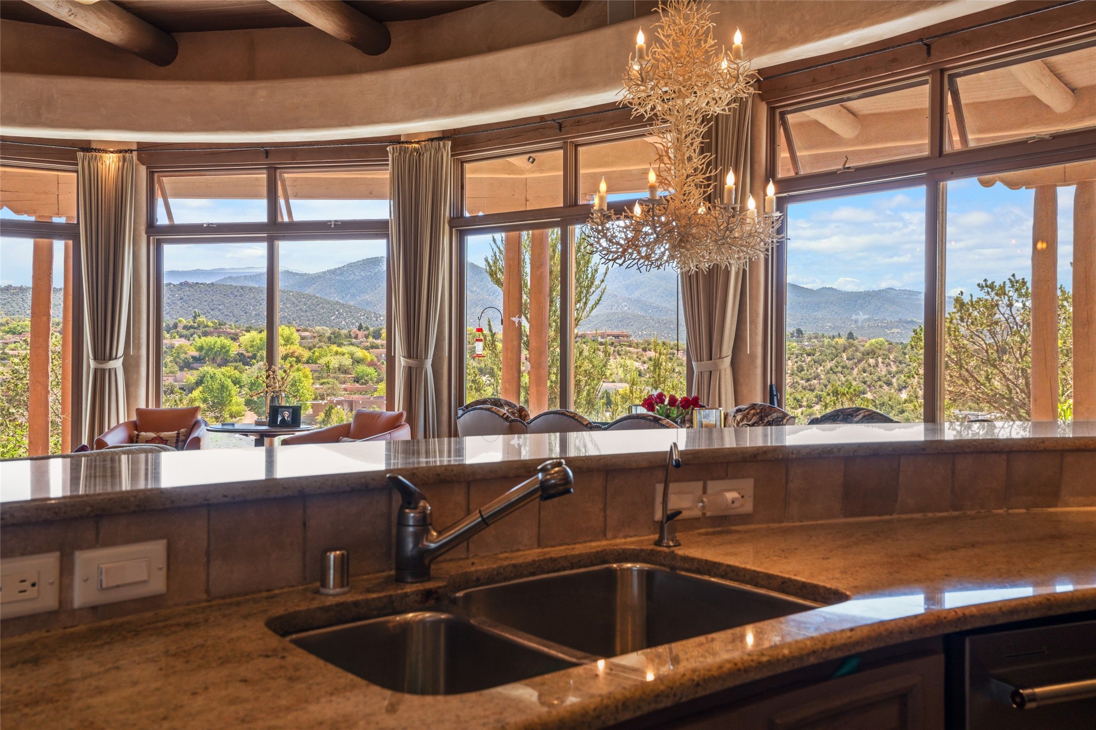 Los Altos/ Estancia Primera 3 bedroom 2.5 bath elegant home and sizable guest house with spectacular Sangre de Cristo mountain views. Strategically sited and custom designed by architect developer John Le Master. Single level; no interior steps. A striking entryway opens into the spacious living area with soaring ceilings, tile floors and soft, sculptural details in lustrous plaster walls as a curved wall of floor-to-ceiling windows brings the breathtaking view into the room. The wrap-around portal extends the living/dining space, perfect for enjoying the sun or al fresco entertaining in warm weather months. Open and artfully designed, the gourmet kitchen is appointed with center island, rounded bar, abundant storage, built-in sidebar, and superior-quality appliances. Split bedroom plan for privacy. Primary wing with bedroom with kiva fireplace and access to outside portal, a spa-like bathroom, a generous walk-in closet, study and hot tub on a separate private deck. Just off the kitchen are two additional en suite bedrooms, a laundry room, and access to the over-sized 2-car garage with a rooftop deck overlooking the downtown Plaza and city lights. The guesthouse includes a great room, full kitchen, 2 bedrooms and 2 baths. Mature landscaping, built in fountains. The community of Estancia Primera offers a clubhouse, pool and tennis court. Conveniently located close to the Historic Plaza, Canyon Road, Museum Hill, hiking trails, and with easy access to the Santa Fe Ski Basin.