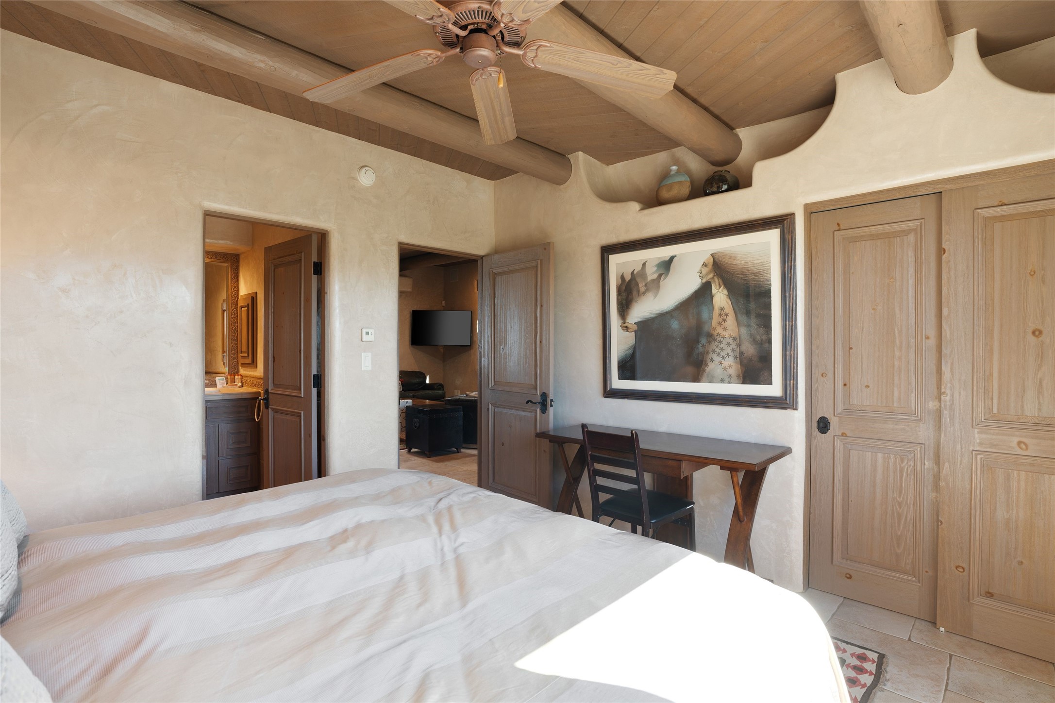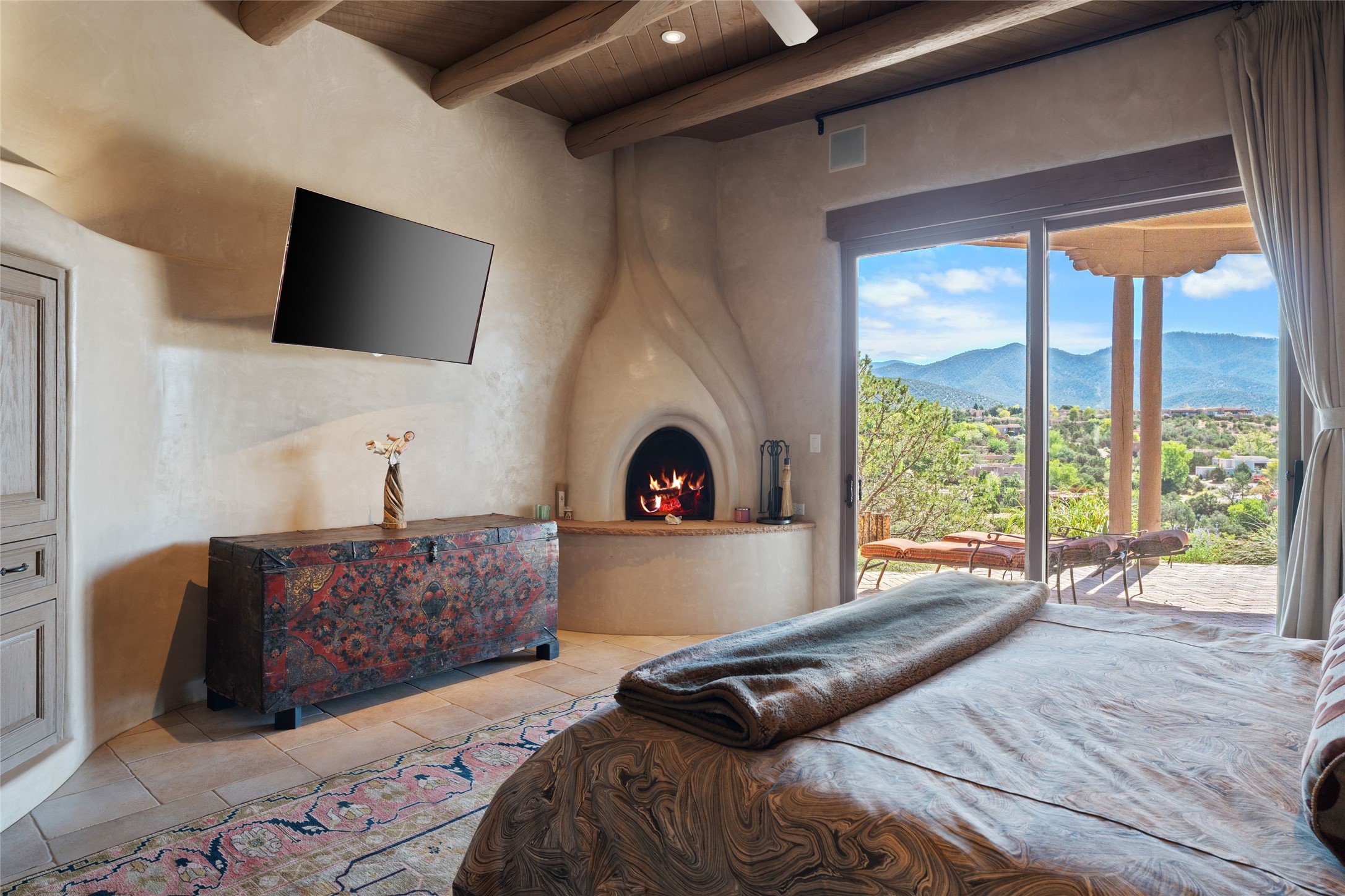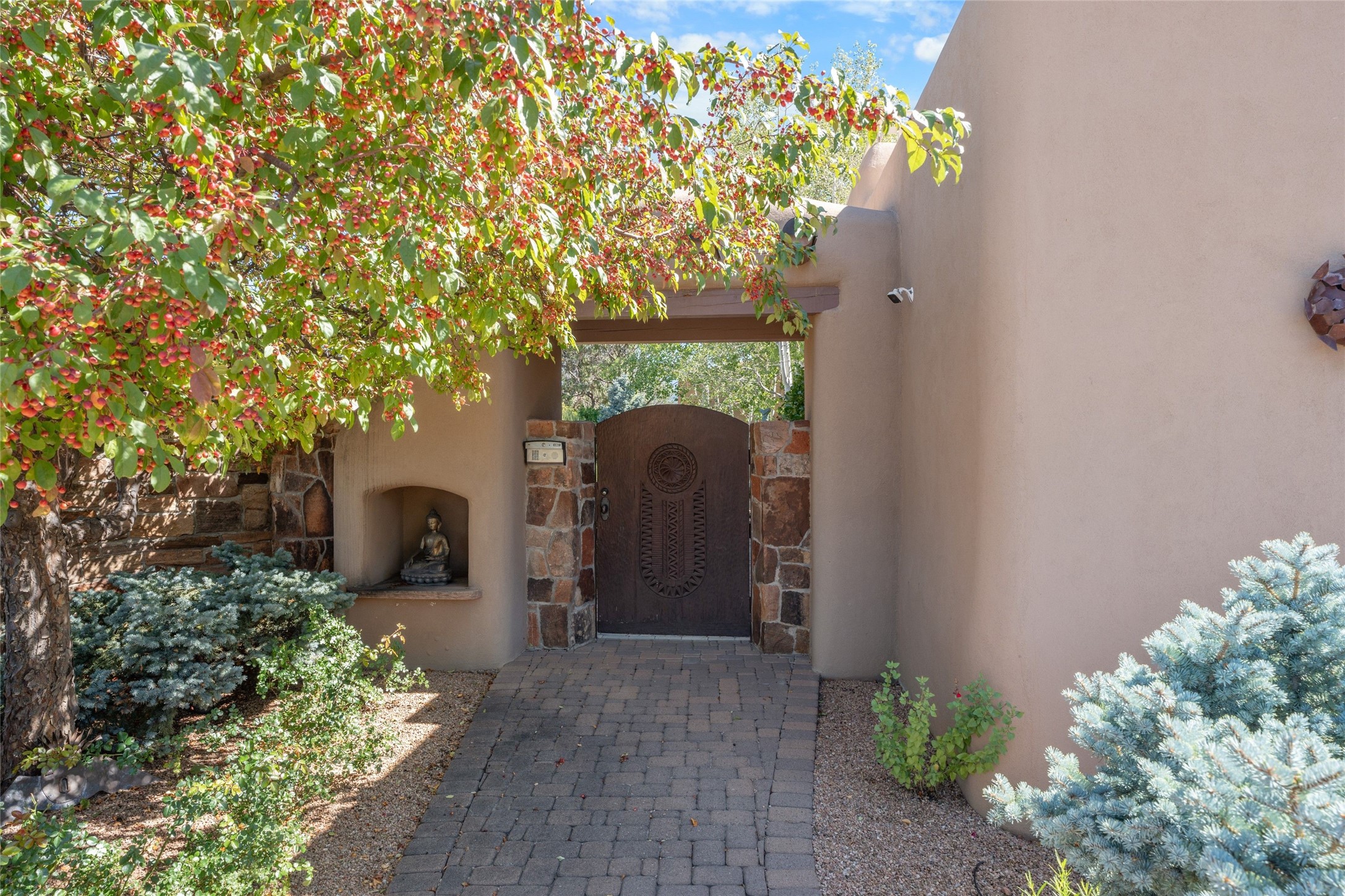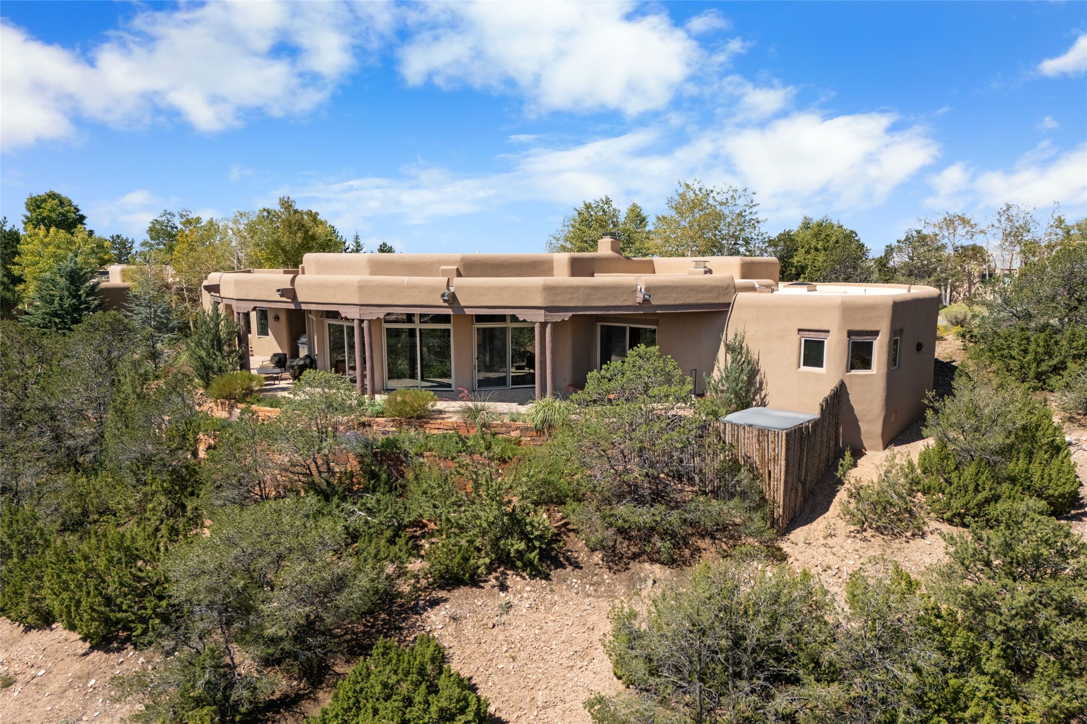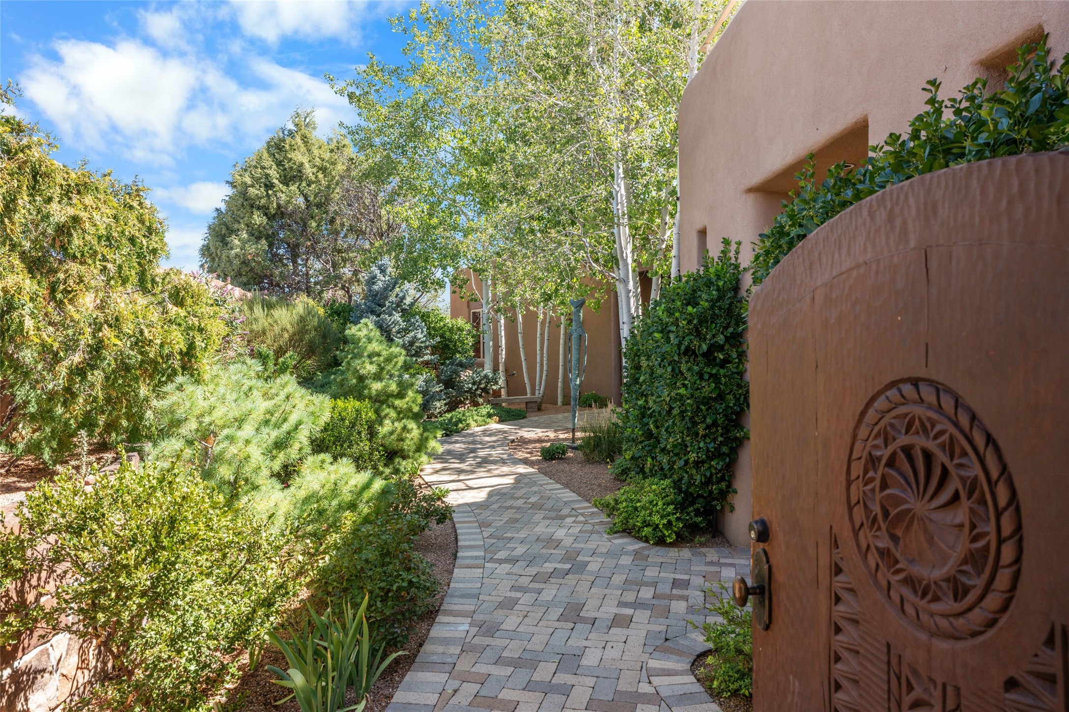 Los Altos/ Estancia Primera 3 bedroom 2.5 bath elegant home and sizable guest house with spectacular Sangre de Cristo mountain views. Strategically sited and custom designed by architect developer John Le Master. Single level; no interior steps. A striking entryway opens into the spacious living area with soaring ceilings, tile floors and soft, sculptural details in lustrous plaster walls as a curved wall of floor-to-ceiling windows brings the breathtaking view into the room. The wrap-around portal extends the living/dining space, perfect for enjoying the sun or al fresco entertaining in warm weather months. Open and artfully designed, the gourmet kitchen is appointed with center island, rounded bar, abundant storage, built-in sidebar, and superior-quality appliances. Split bedroom plan for privacy. Primary wing with bedroom with kiva fireplace and access to outside portal, a spa-like bathroom, a generous walk-in closet, study and hot tub on a separate private deck. Just off the kitchen are two additional en suite bedrooms, a laundry room, and access to the over-sized 2-car garage with a rooftop deck overlooking the downtown Plaza and city lights. The guesthouse includes a great room, full kitchen, 2 bedrooms and 2 baths. Mature landscaping, built in fountains. The community of Estancia Primera offers a clubhouse, pool and tennis court. Conveniently located close to the Historic Plaza, Canyon Road, Museum Hill, hiking trails, and with easy access to the Santa Fe Ski Basin.