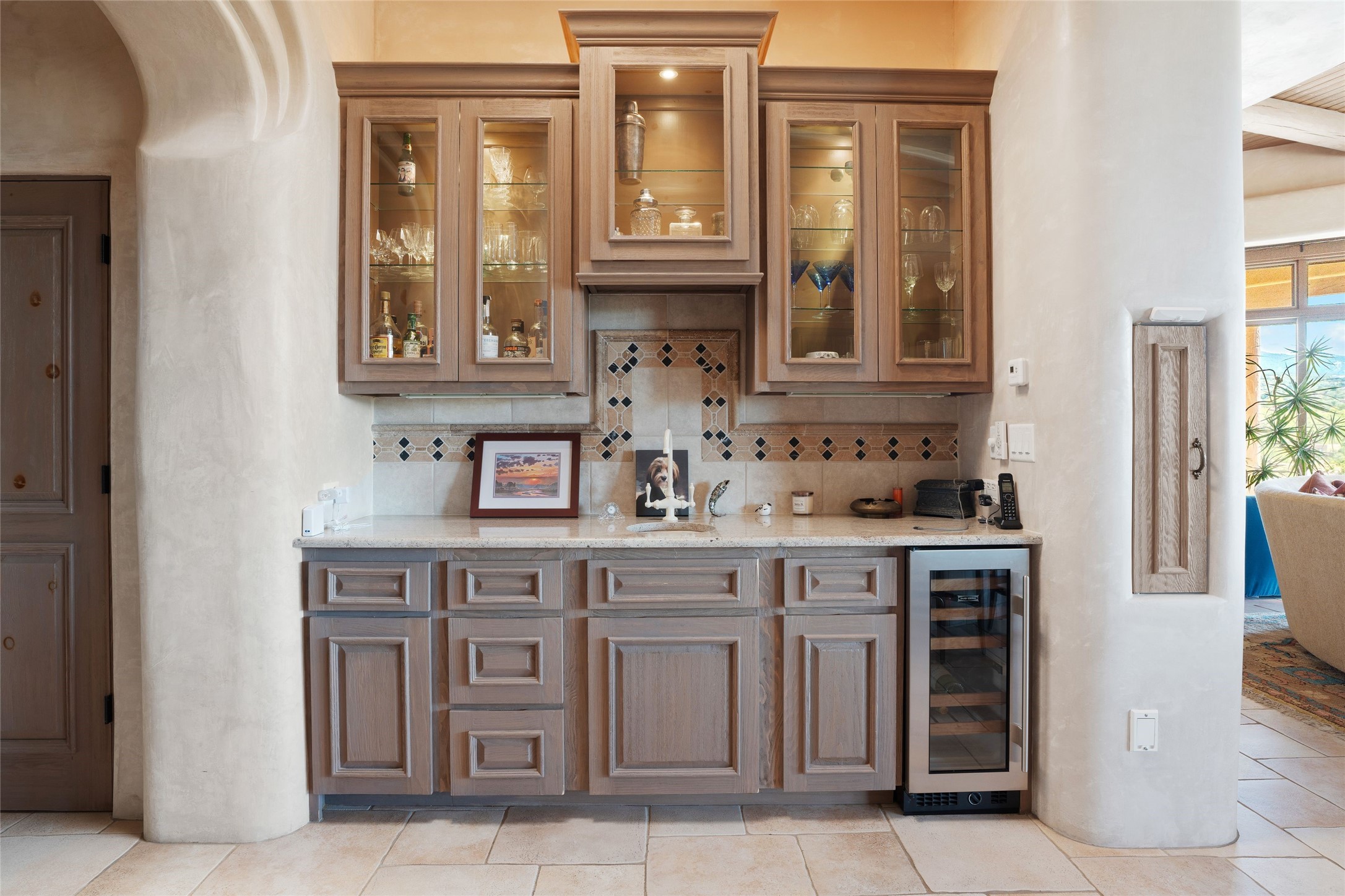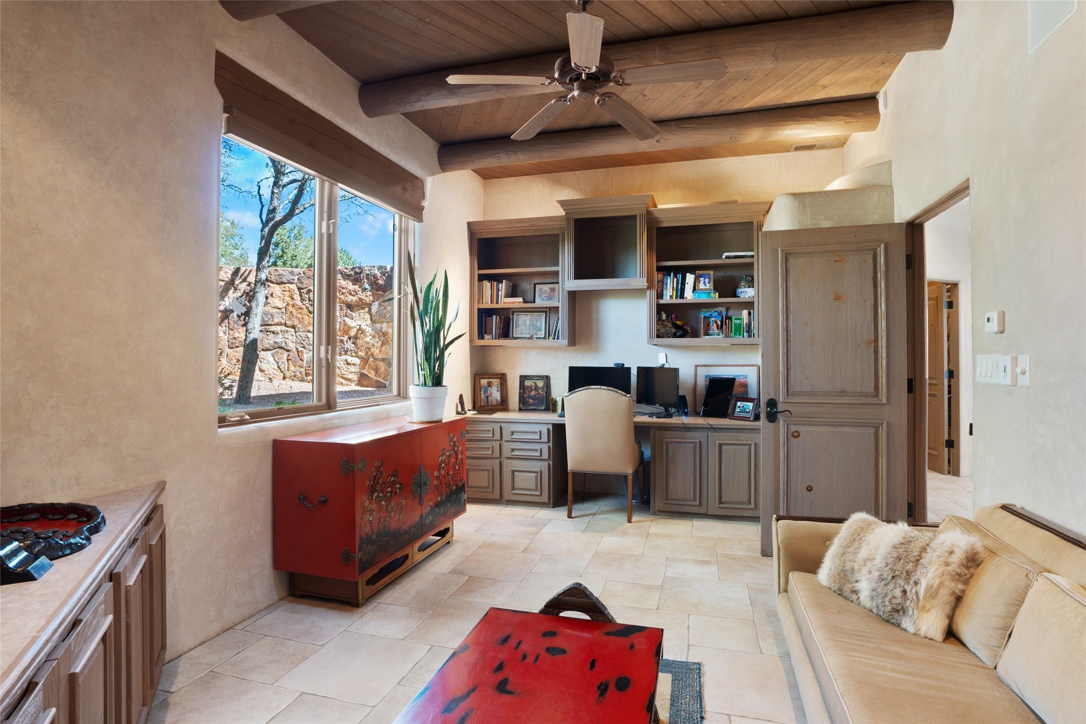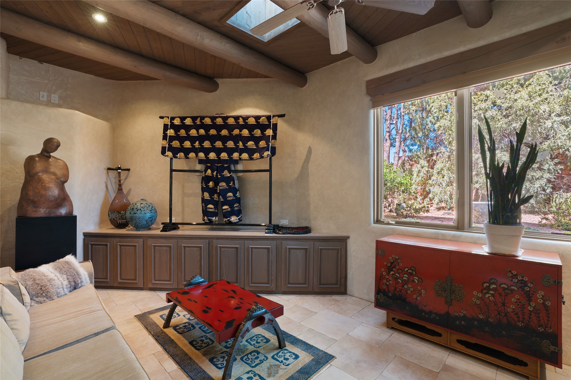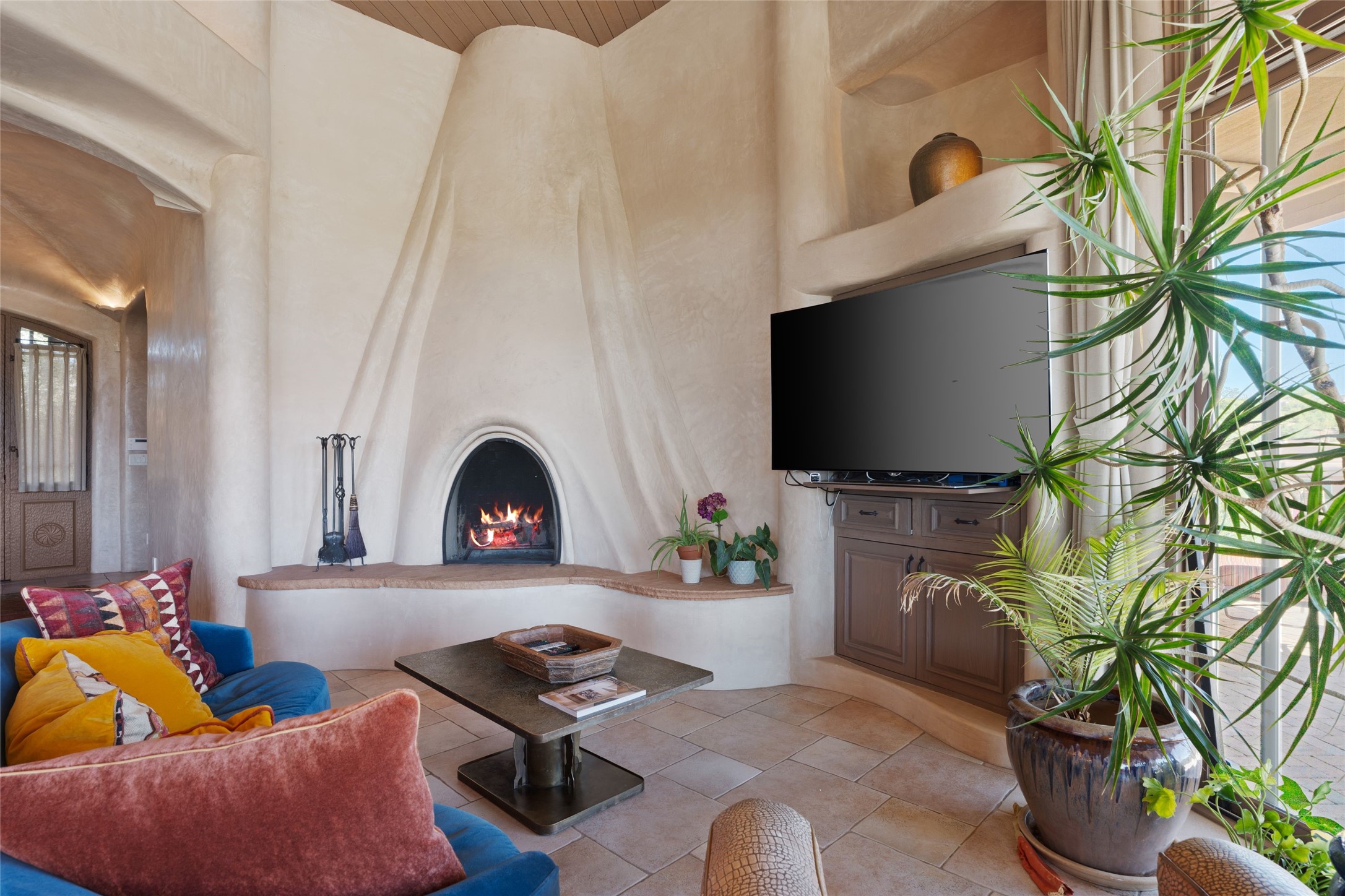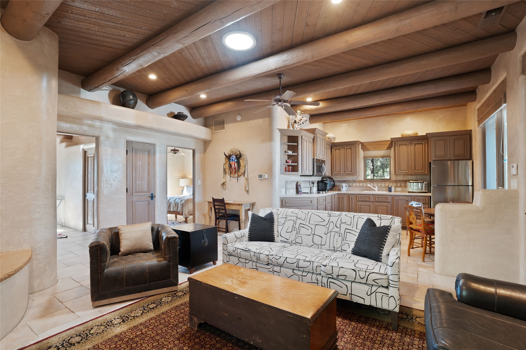 Los Altos/ Estancia Primera 3 bedroom 2.5 bath elegant home and sizable guest house with spectacular Sangre de Cristo mountain views. Strategically sited and custom designed by architect developer John Le Master. Single level; no interior steps. A striking entryway opens into the spacious living area with soaring ceilings, tile floors and soft, sculptural details in lustrous plaster walls as a curved wall of floor-to-ceiling windows brings the breathtaking view into the room. The wrap-around portal extends the living/dining space, perfect for enjoying the sun or al fresco entertaining in warm weather months. Open and artfully designed, the gourmet kitchen is appointed with center island, rounded bar, abundant storage, built-in sidebar, and superior-quality appliances. Split bedroom plan for privacy. Primary wing with bedroom with kiva fireplace and access to outside portal, a spa-like bathroom, a generous walk-in closet, study and hot tub on a separate private deck. Just off the kitchen are two additional en suite bedrooms, a laundry room, and access to the over-sized 2-car garage with a rooftop deck overlooking the downtown Plaza and city lights. The guesthouse includes a great room, full kitchen, 2 bedrooms and 2 baths. Mature landscaping, built in fountains. The community of Estancia Primera offers a clubhouse, pool and tennis court. Conveniently located close to the Historic Plaza, Canyon Road, Museum Hill, hiking trails, and with easy access to the Santa Fe Ski Basin.