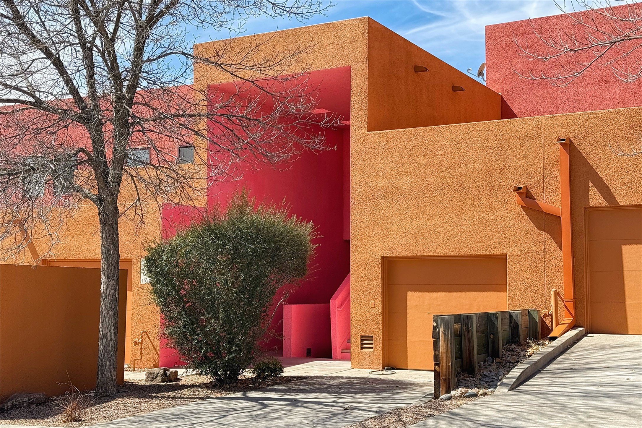 The nicest unit in Zocalo, spectacular views, superior patios, tastefully updated contemporary three bedroom, two bath condominium in Zocalo designed by award-winning architect Ricardo Legorreta. Light-filled, second-level home offers massive western views overlooking the natural arroyo and hillsides and eastern views that include Atalaya peak in the distance. New, giant picture windows do indeed make pictures of the surrounding classic Santa Fe colored landscape and skies so close you can almost touch! Updates include new insulated windows, remote controlled shades, new flooring and paint throughout, new stainless steel appliances and washer and dryer, updated kitchen with chef's appliances and bathrooms with solid surface counters, programmable lighting, Legrand switch and outlet covers, on-demand tankless hot water heater, new deck and refinished balcony. Community amenities include two fitness facilities, pool, hot tub, and clubhouse. Newly completed trail for walking and biking connects to the city trail system. Large garage with EV charger. Close to town yet far from the hustle and bustle, quiet and serene yet vibrant and alive! Check out the video and take the virtual tour!