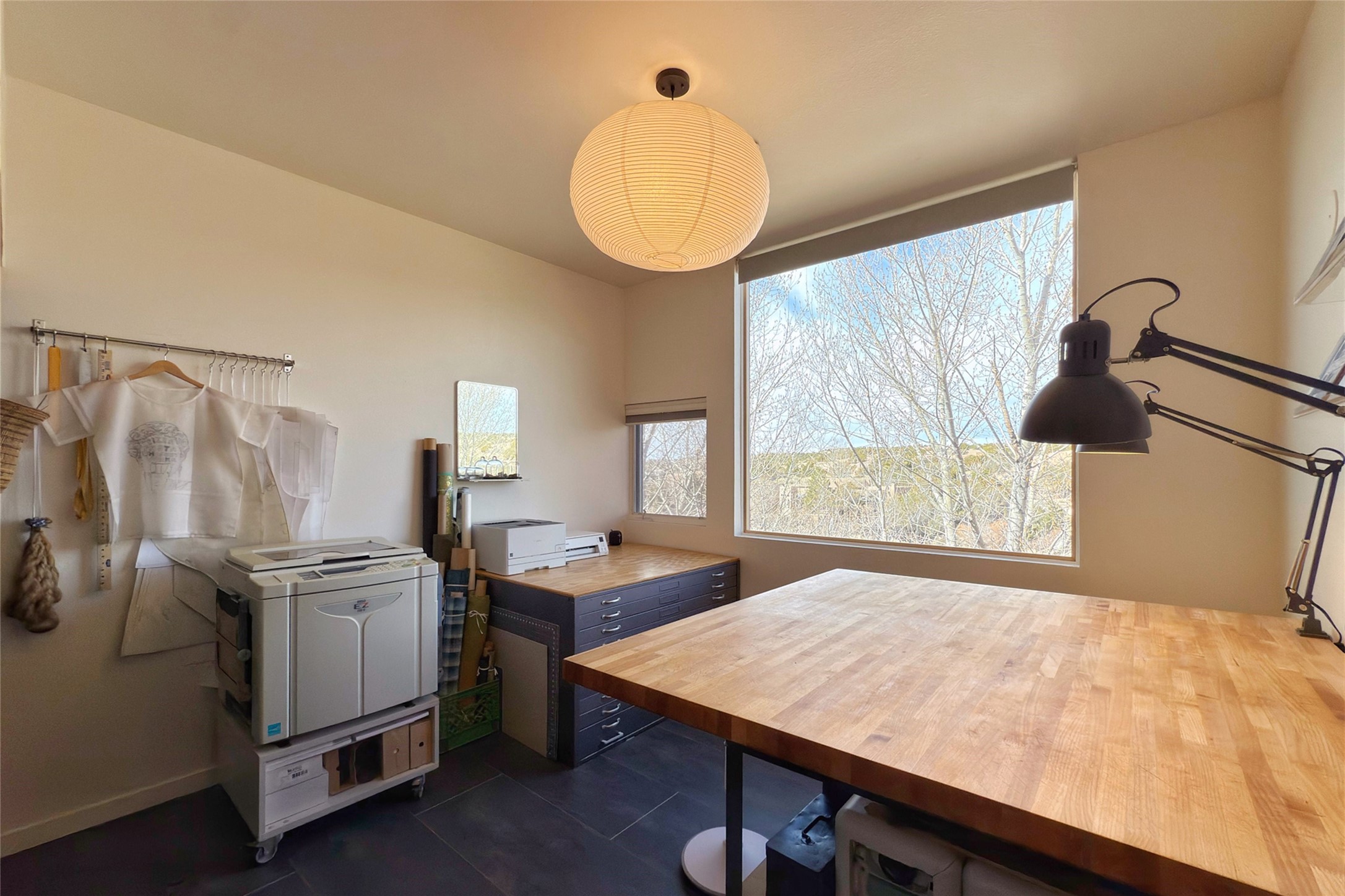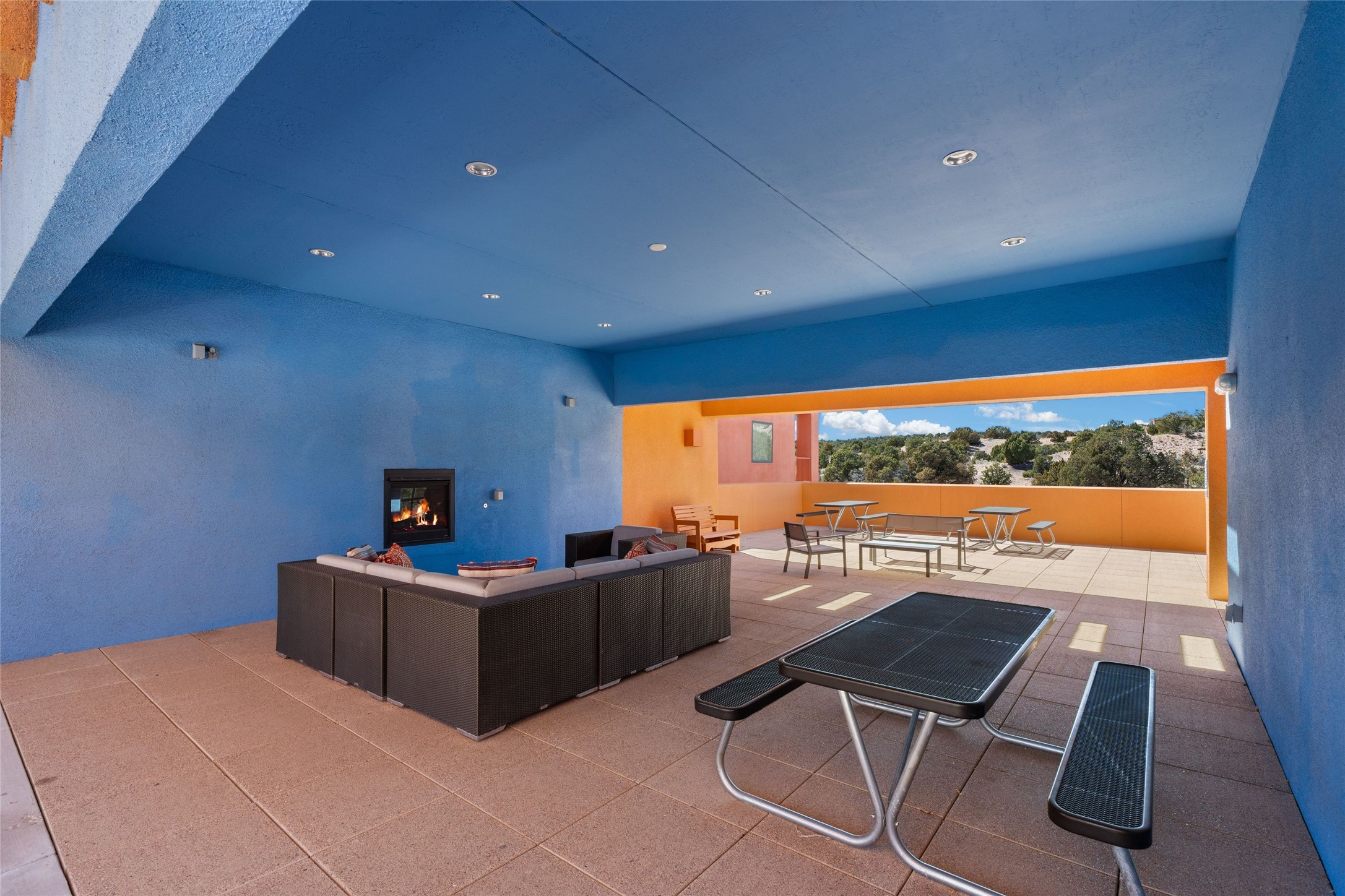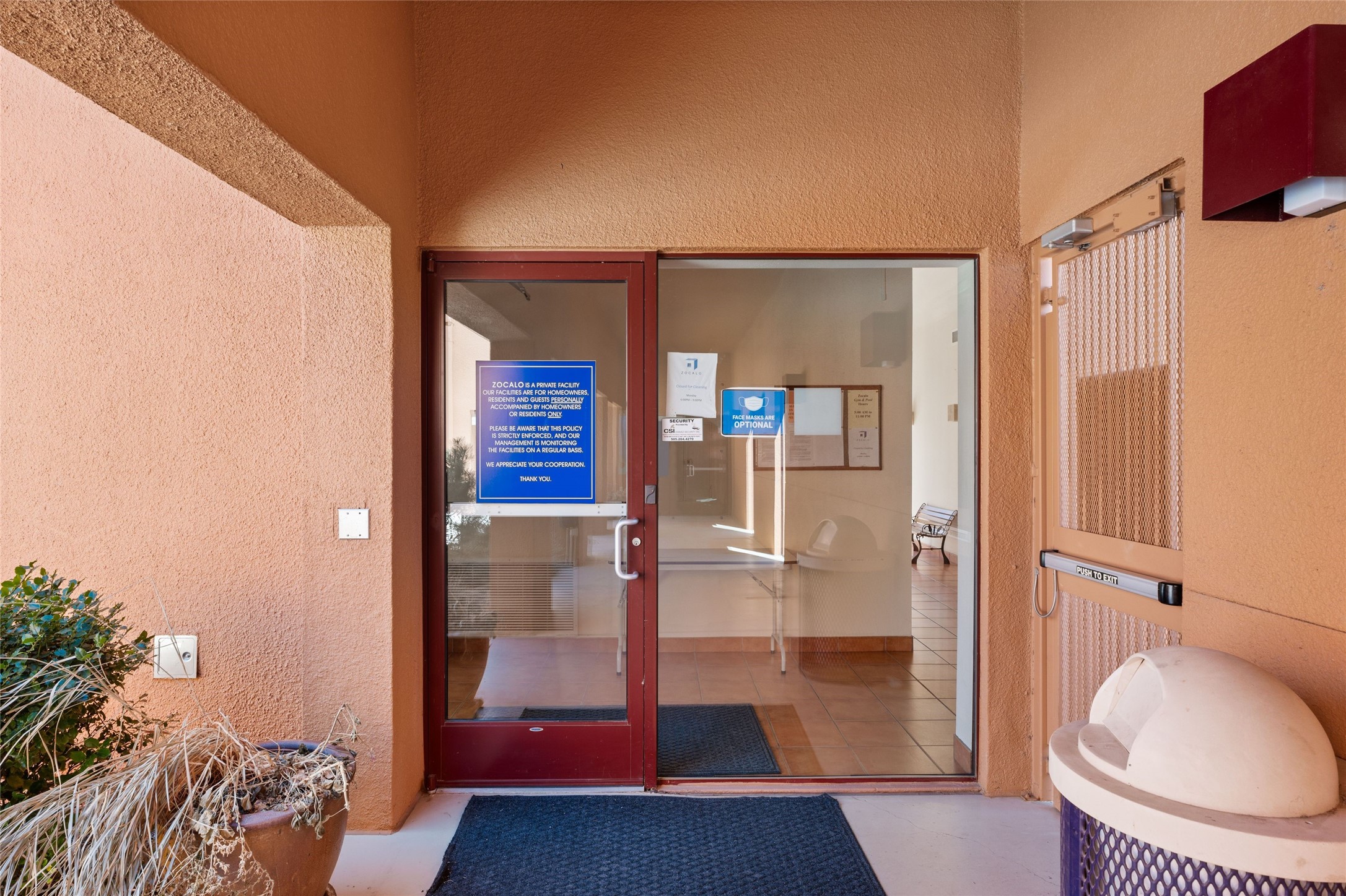 The nicest unit in Zocalo, spectacular views, superior patios, tastefully updated contemporary three bedroom, two bath condominium in Zocalo designed by award-winning architect Ricardo Legorreta. Light-filled, second-level home offers massive western views overlooking the natural arroyo and hillsides and eastern views that include Atalaya peak in the distance. New, giant picture windows do indeed make pictures of the surrounding classic Santa Fe colored landscape and skies so close you can almost touch! Updates include new insulated windows, remote controlled shades, new flooring and paint throughout, new stainless steel appliances and washer and dryer, updated kitchen with chef's appliances and bathrooms with solid surface counters, programmable lighting, Legrand switch and outlet covers, on-demand tankless hot water heater, new deck and refinished balcony. Community amenities include two fitness facilities, pool, hot tub, and clubhouse. Newly completed trail for walking and biking connects to the city trail system. Large garage with EV charger. Close to town yet far from the hustle and bustle, quiet and serene yet vibrant and alive! Check out the video and take the virtual tour!