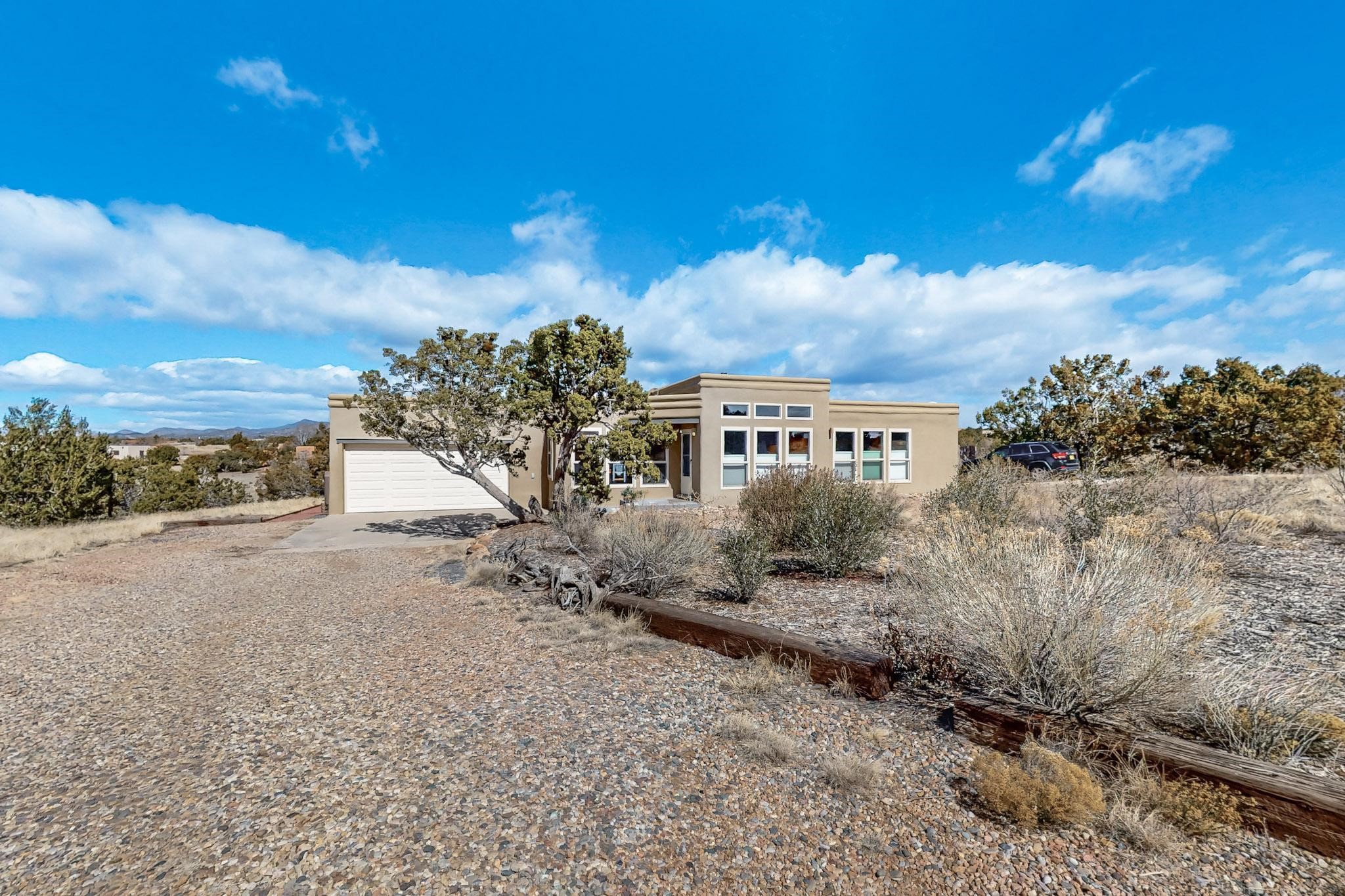 This home is a lovely, sparkling example of pride of ownership. Delightfully refreshed and remodelled, this passive solar design has gleaming brick floors and a bright and sunny aspect throughout. New kitchen and bathrooms, 4 mini splits, upsized electrical panel and new stucco in 2019. A new hot water heater, washer and dryer, and water softener in 2020. The roof and woodwork has been steadily maintained. Electrical has been installed in the She/He Shed and several raised beds ready for planting. The garage is an oversized one and one half car, plenty of storage. A new gate was installed to the privacy fence, extensive water barrel conservation, new landscaping and patios creates a wonderful private outside entertaining space with expansive views of the Jemez and northern mountains. This home is a gem in Eldorado, easy access to all the amenities, local hike/bike trails, shopping, schools, parks, library and senior center, only minutes into Santa Fe.