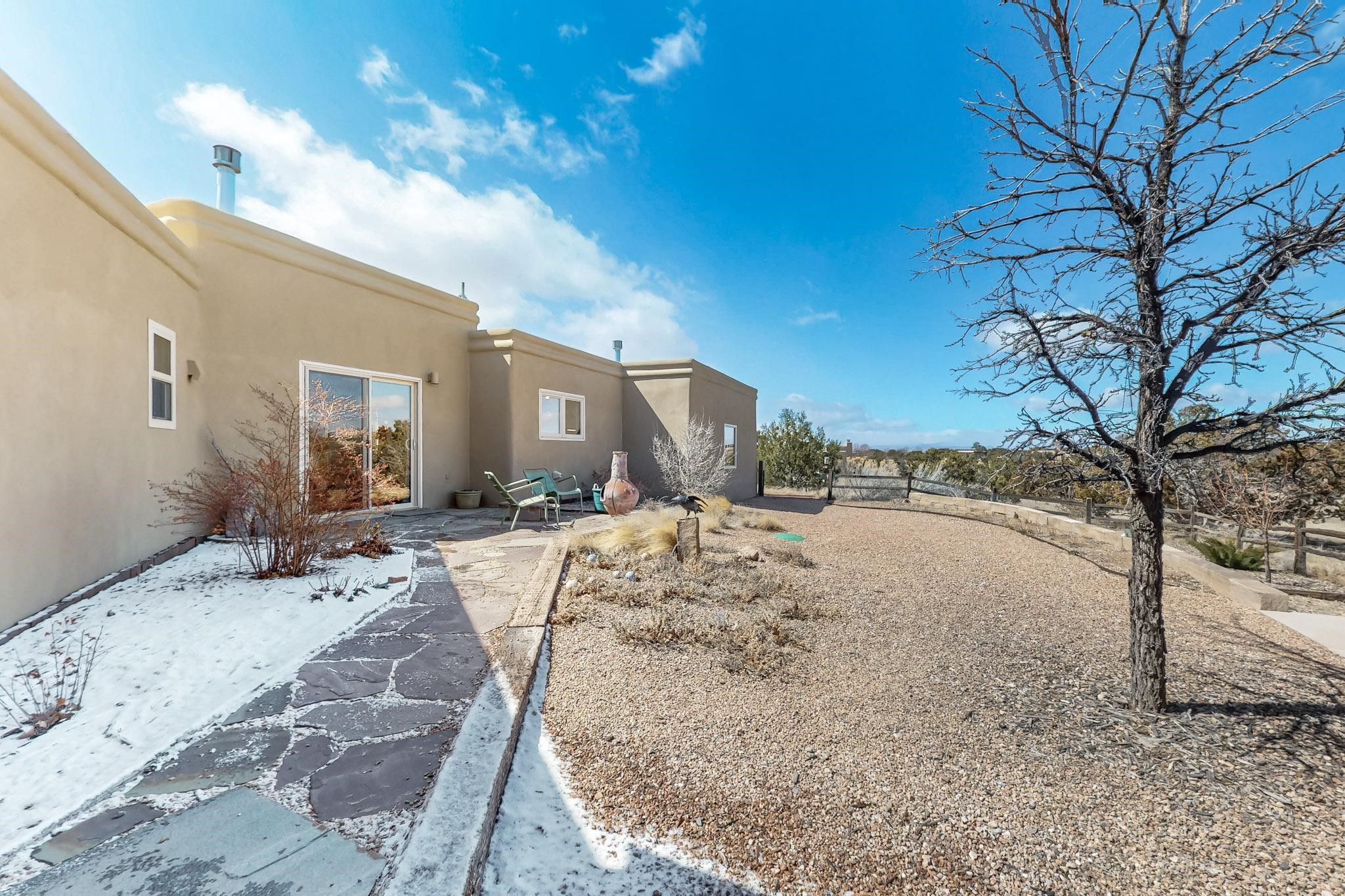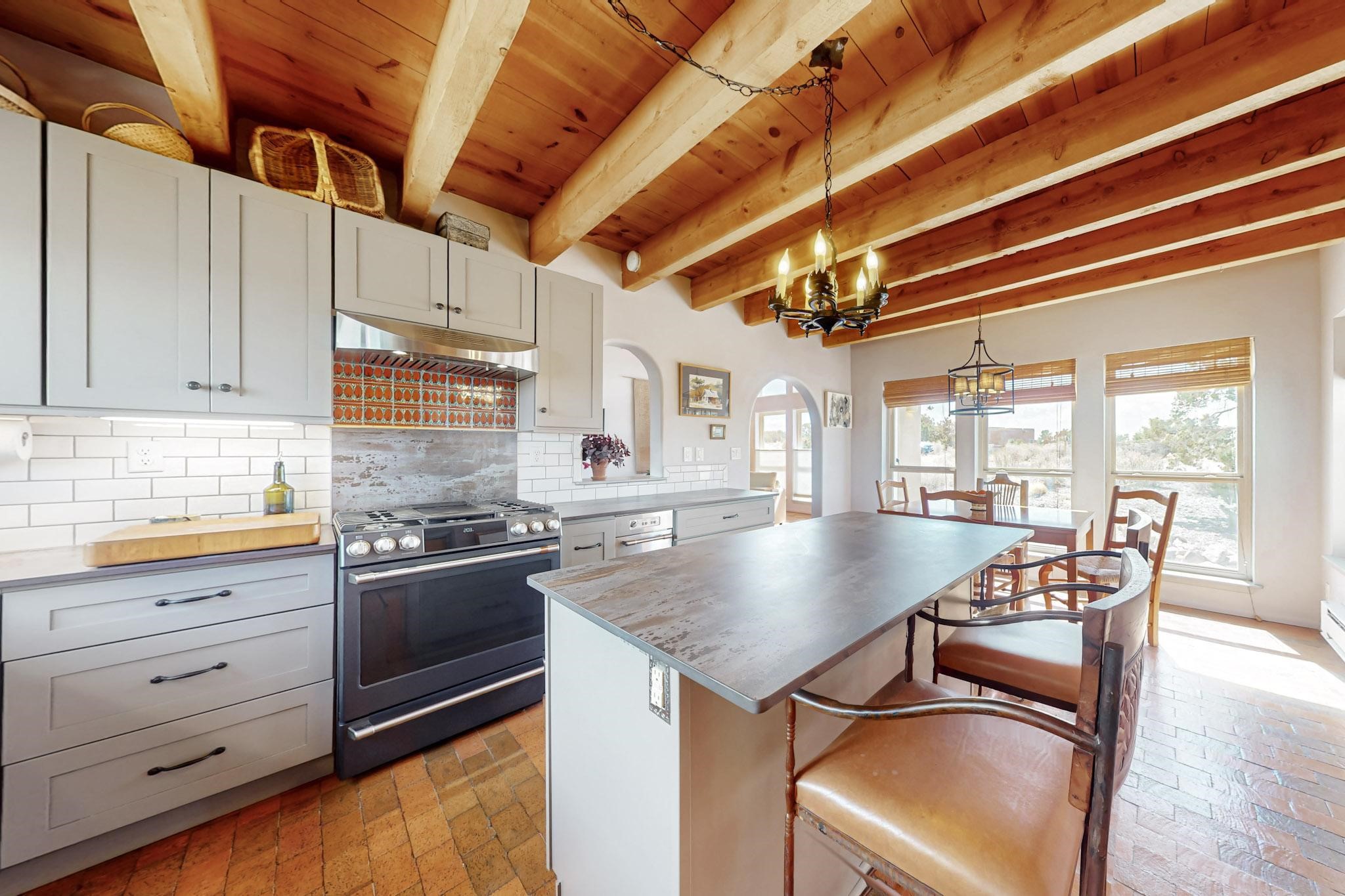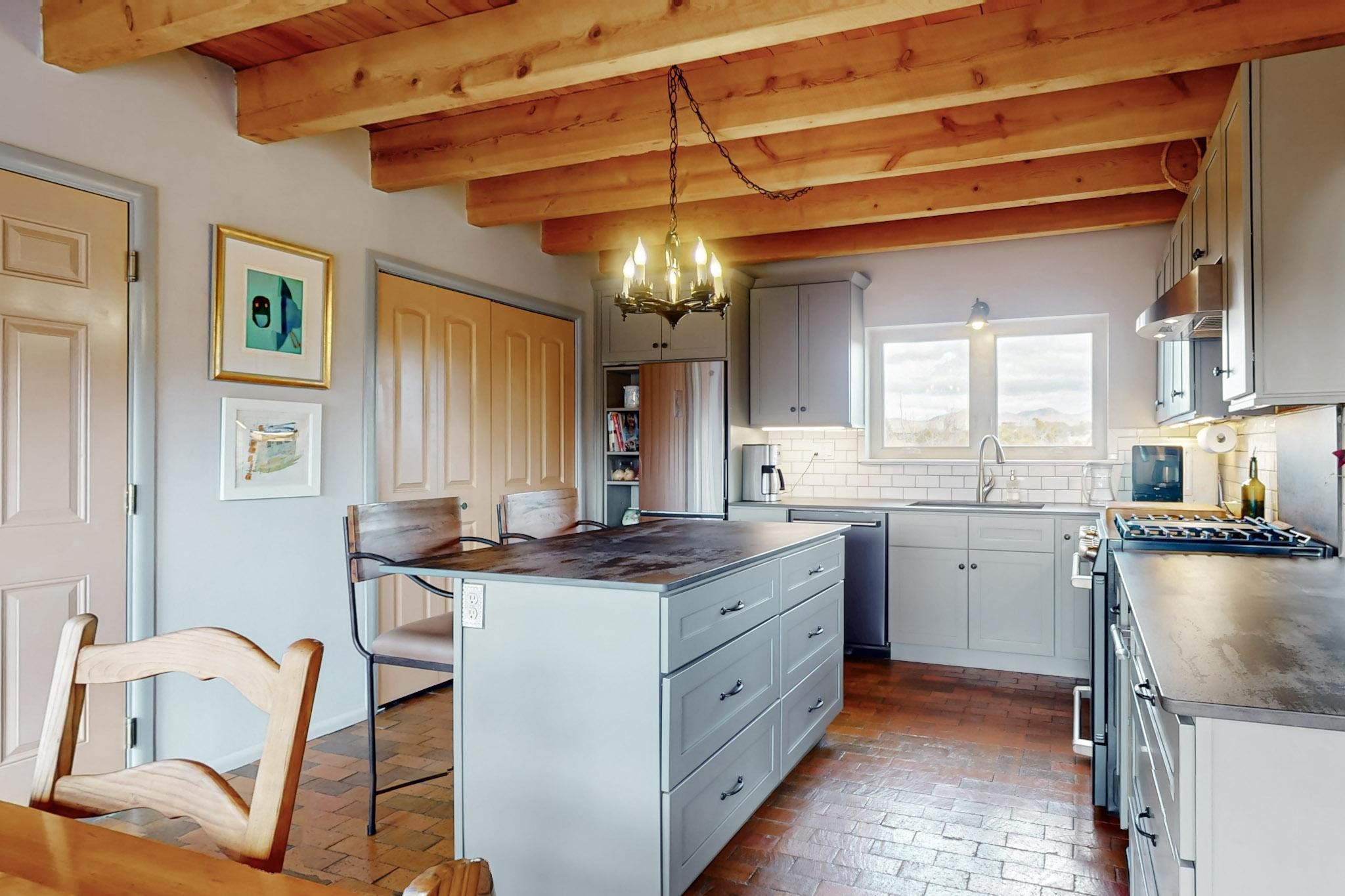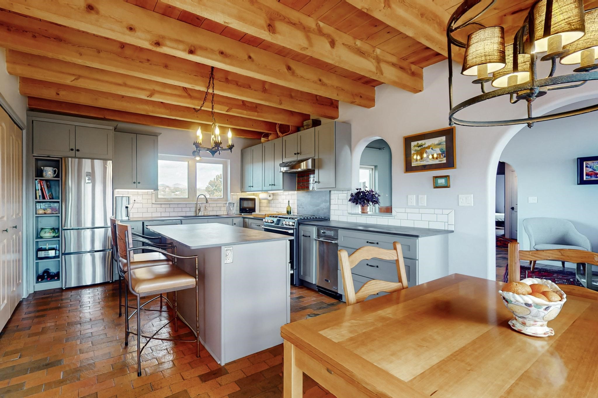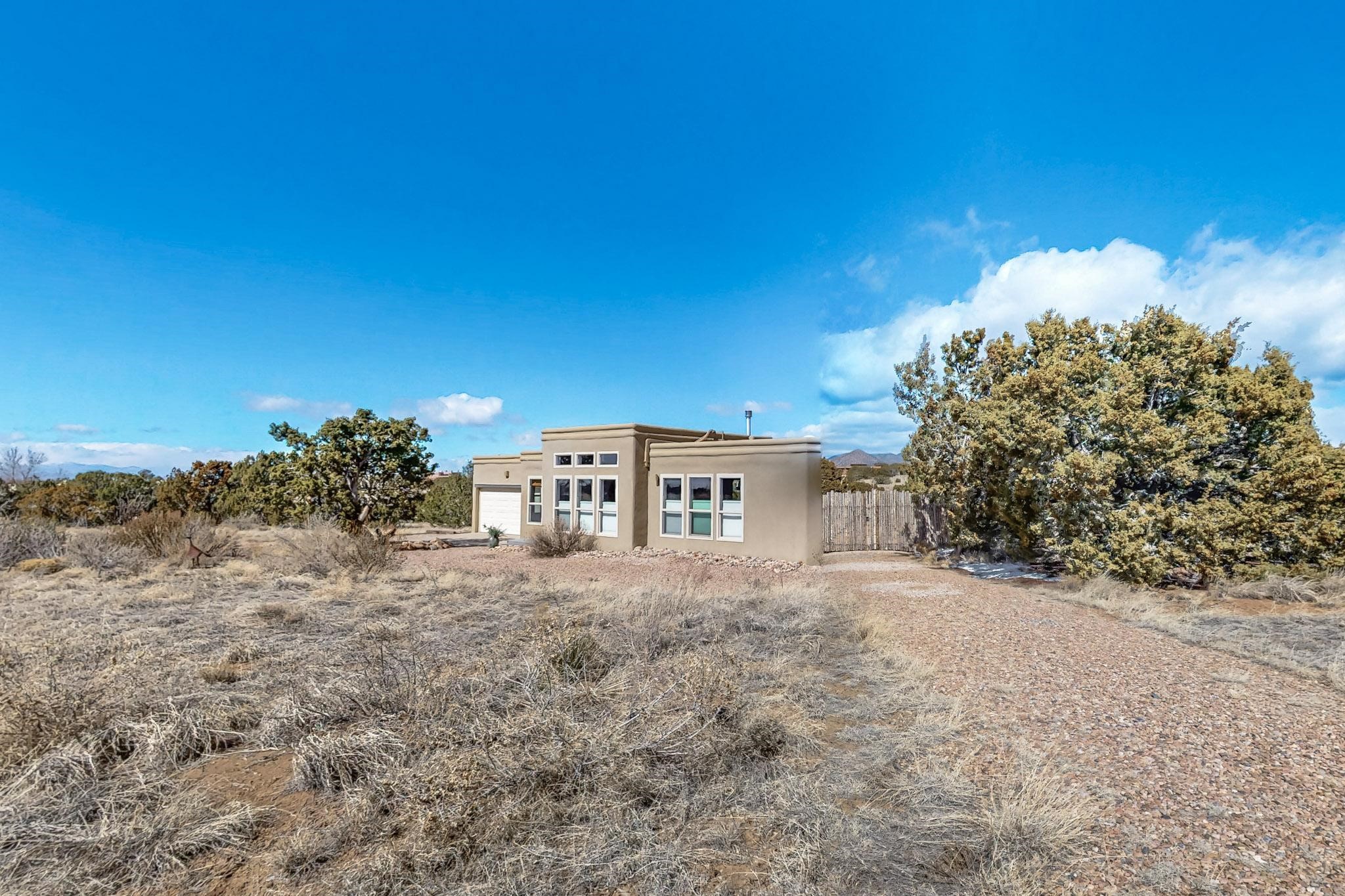 This home is a lovely, sparkling example of pride of ownership. Delightfully refreshed and remodelled, this passive solar design has gleaming brick floors and a bright and sunny aspect throughout. New kitchen and bathrooms, 4 mini splits, upsized electrical panel and new stucco in 2019. A new hot water heater, washer and dryer, and water softener in 2020. The roof and woodwork has been steadily maintained. Electrical has been installed in the She/He Shed and several raised beds ready for planting. The garage is an oversized one and one half car, plenty of storage. A new gate was installed to the privacy fence, extensive water barrel conservation, new landscaping and patios creates a wonderful private outside entertaining space with expansive views of the Jemez and northern mountains. This home is a gem in Eldorado, easy access to all the amenities, local hike/bike trails, shopping, schools, parks, library and senior center, only minutes into Santa Fe.
