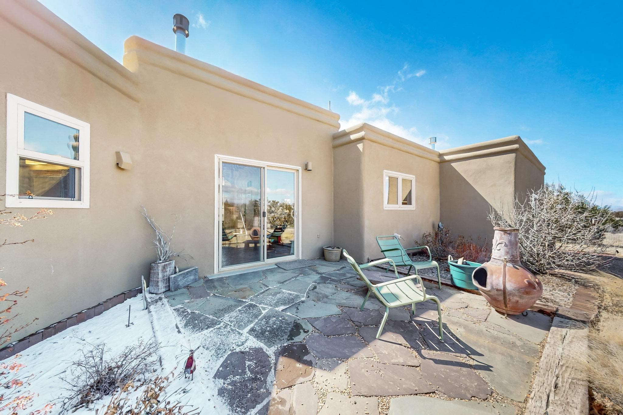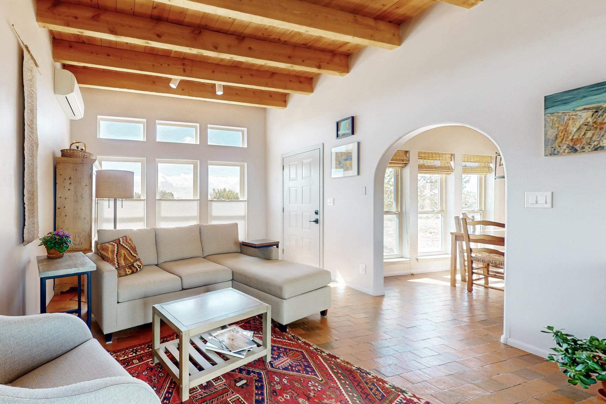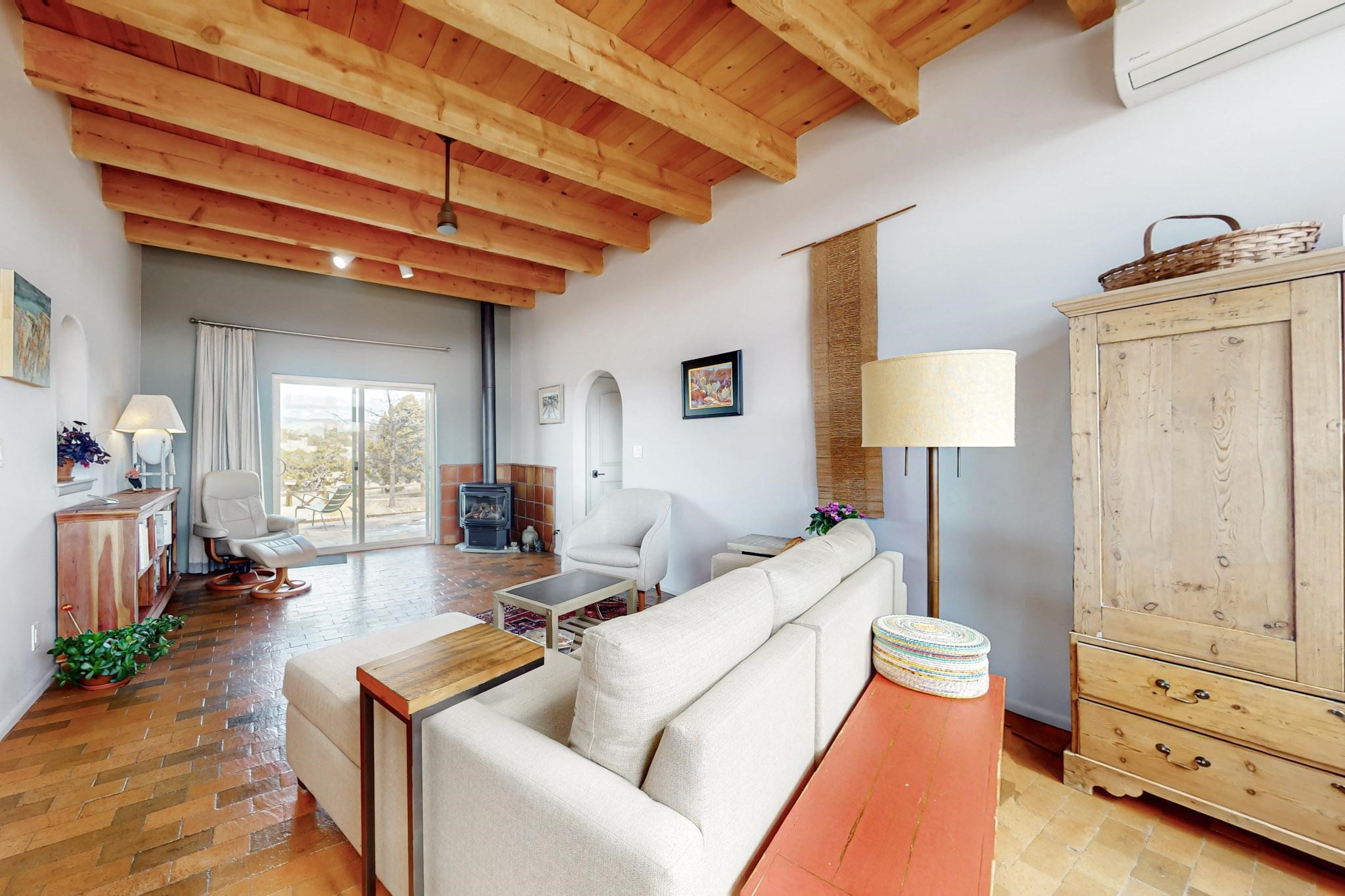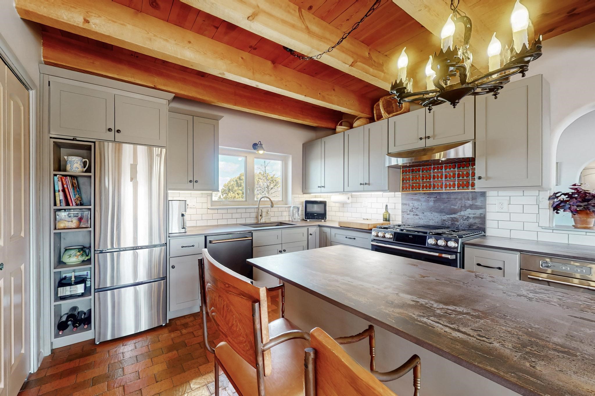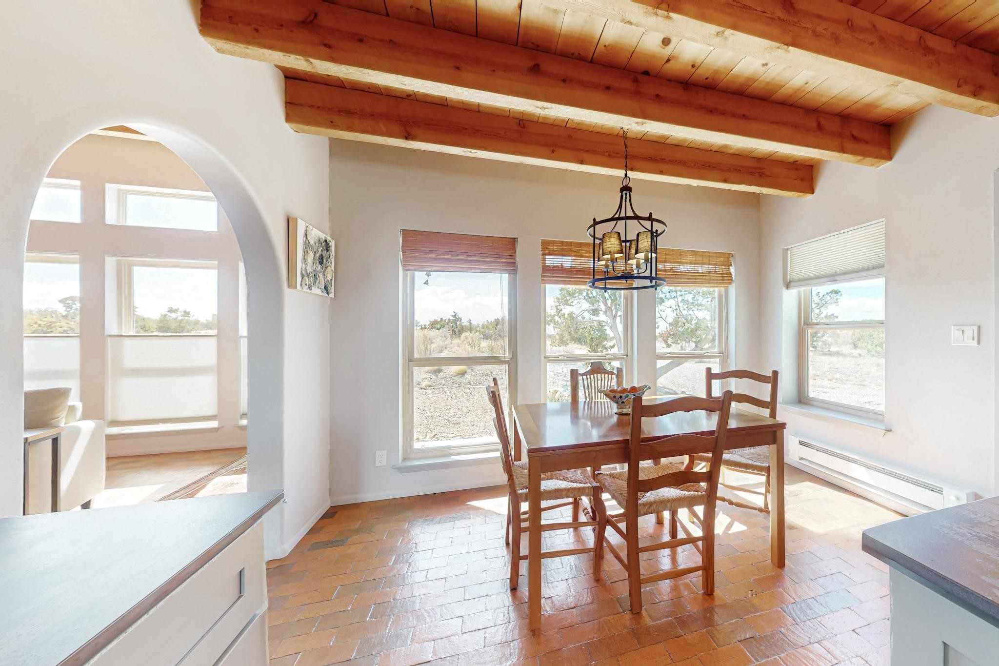 This home is a lovely, sparkling example of pride of ownership. Delightfully refreshed and remodelled, this passive solar design has gleaming brick floors and a bright and sunny aspect throughout. New kitchen and bathrooms, 4 mini splits, upsized electrical panel and new stucco in 2019. A new hot water heater, washer and dryer, and water softener in 2020. The roof and woodwork has been steadily maintained. Electrical has been installed in the She/He Shed and several raised beds ready for planting. The garage is an oversized one and one half car, plenty of storage. A new gate was installed to the privacy fence, extensive water barrel conservation, new landscaping and patios creates a wonderful private outside entertaining space with expansive views of the Jemez and northern mountains. This home is a gem in Eldorado, easy access to all the amenities, local hike/bike trails, shopping, schools, parks, library and senior center, only minutes into Santa Fe.