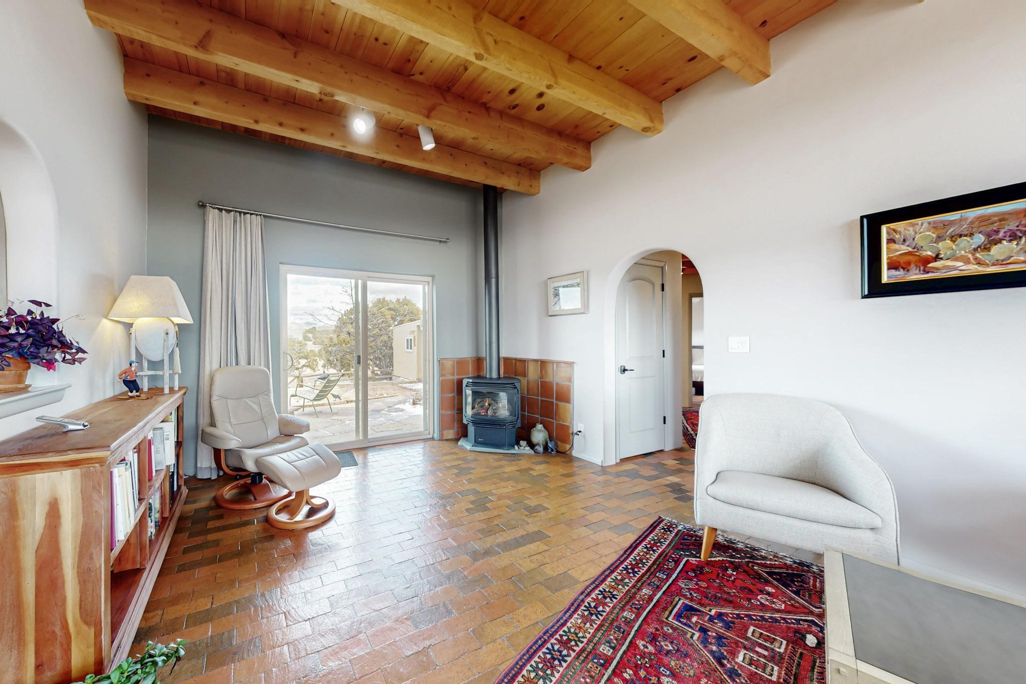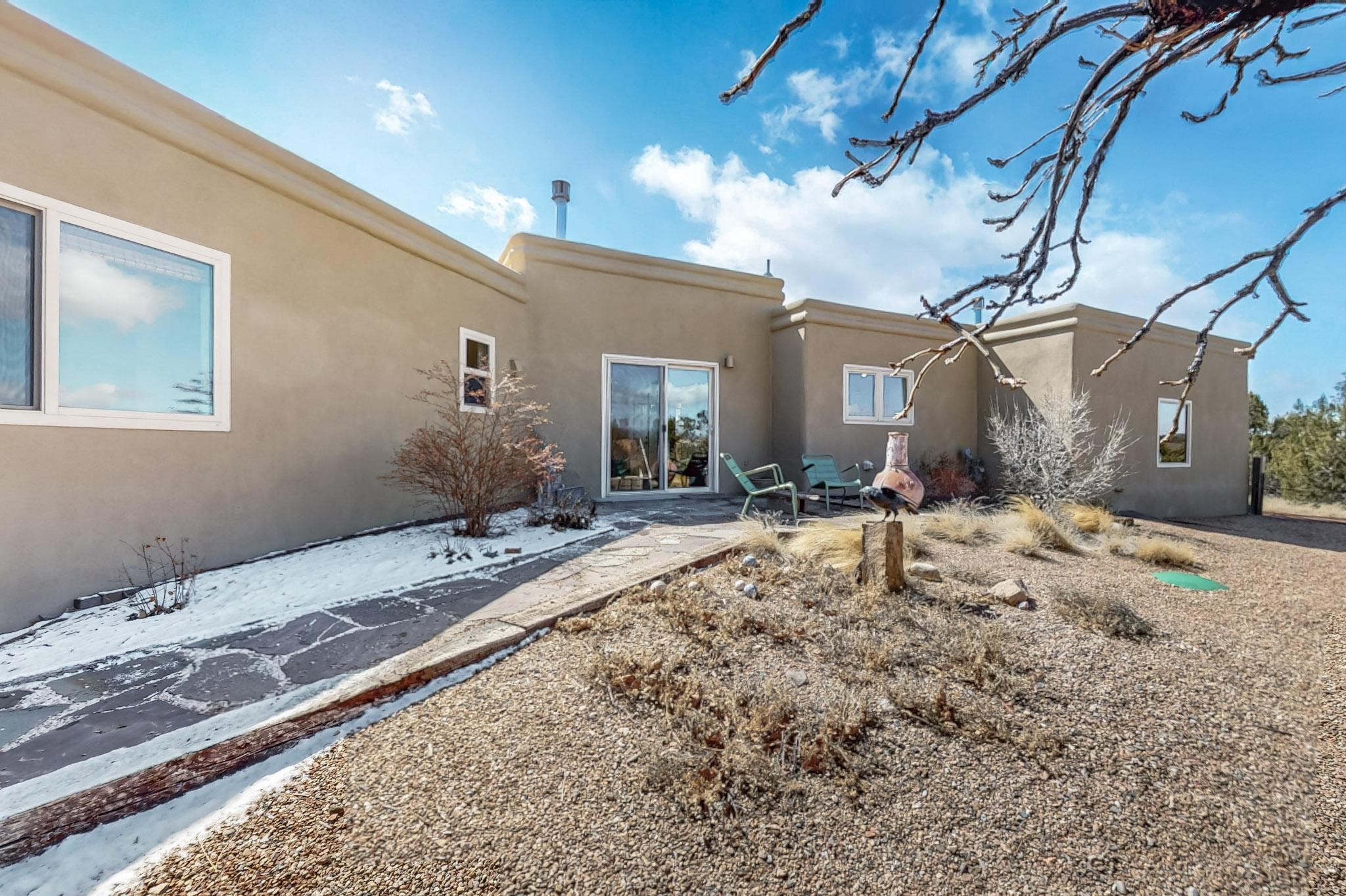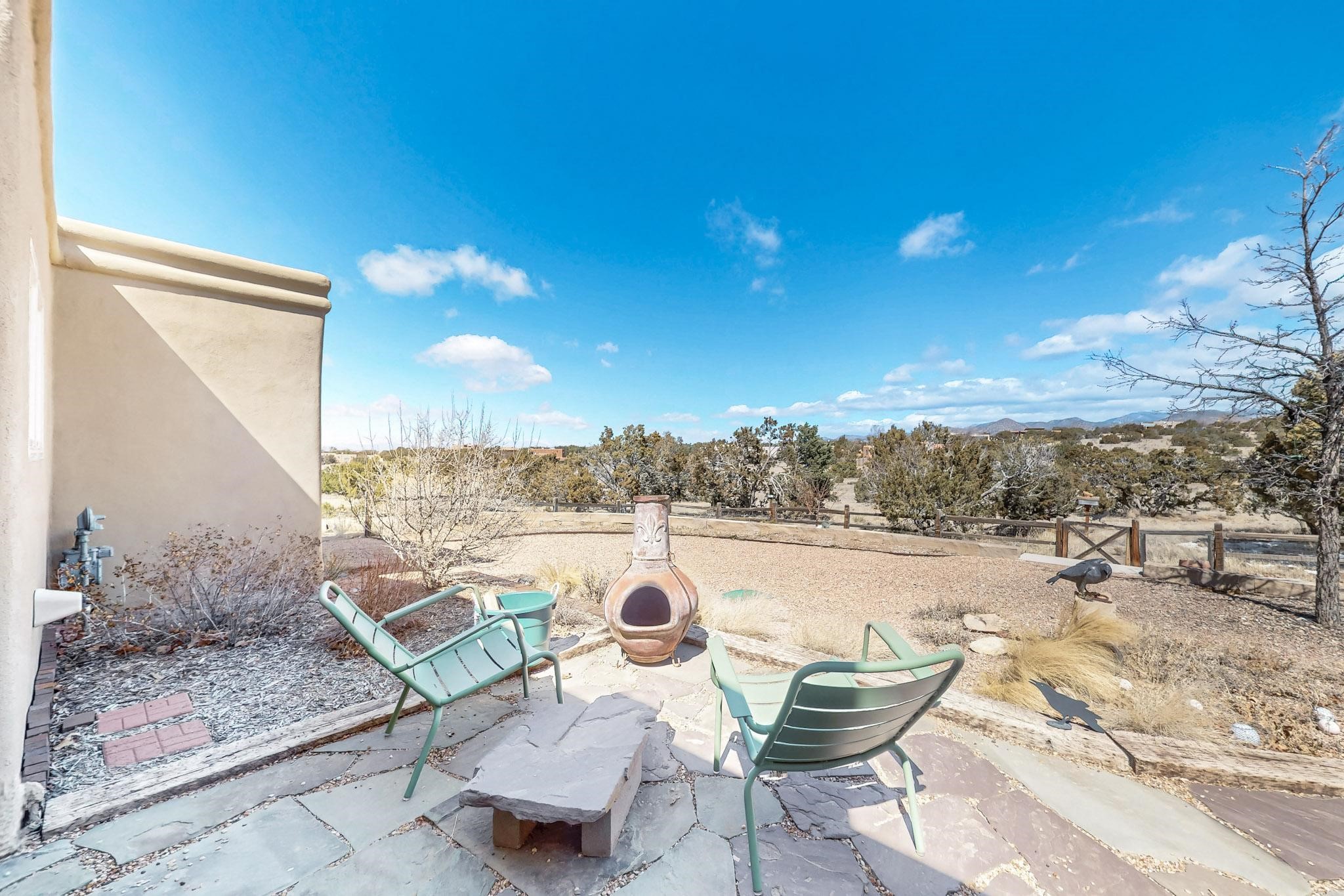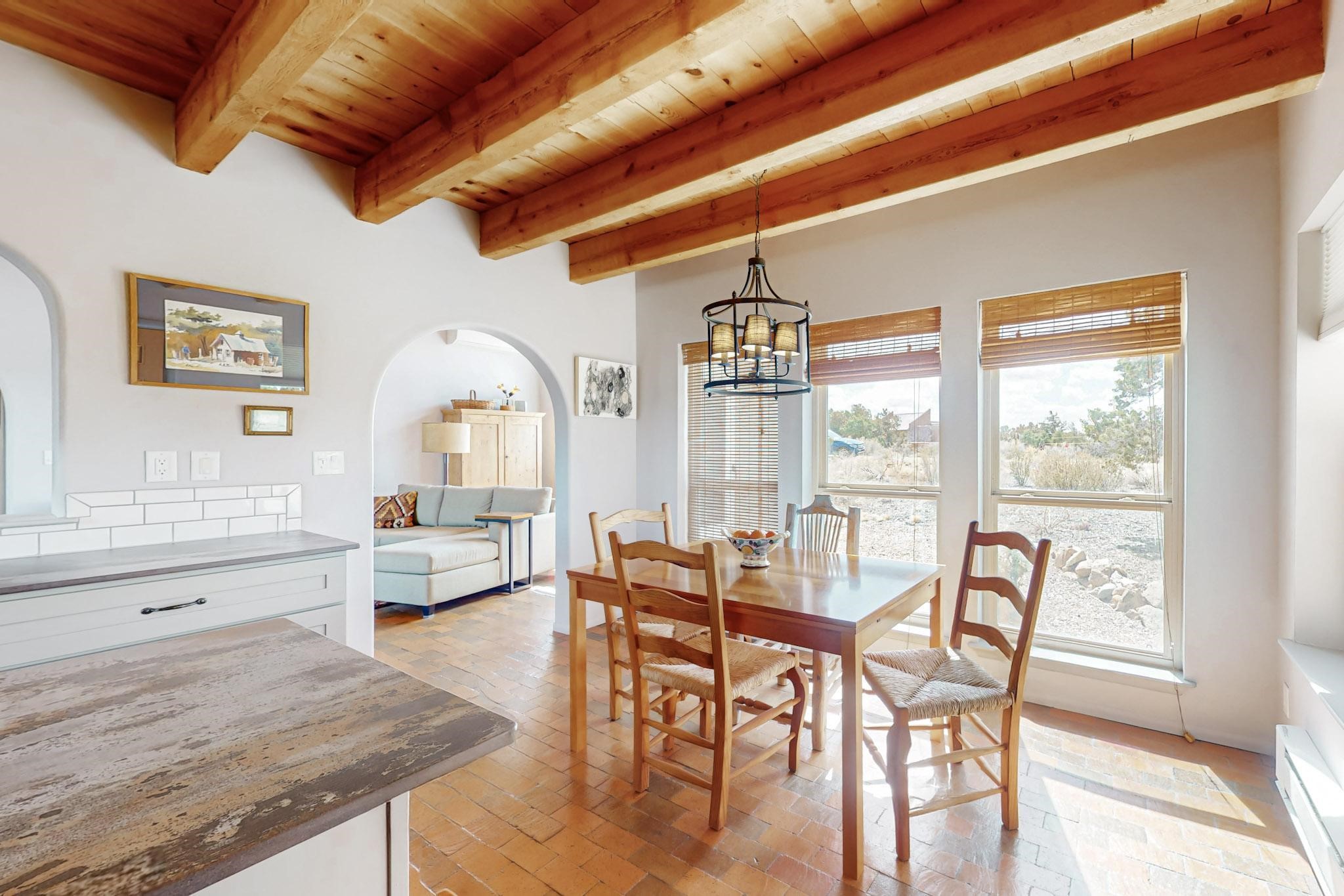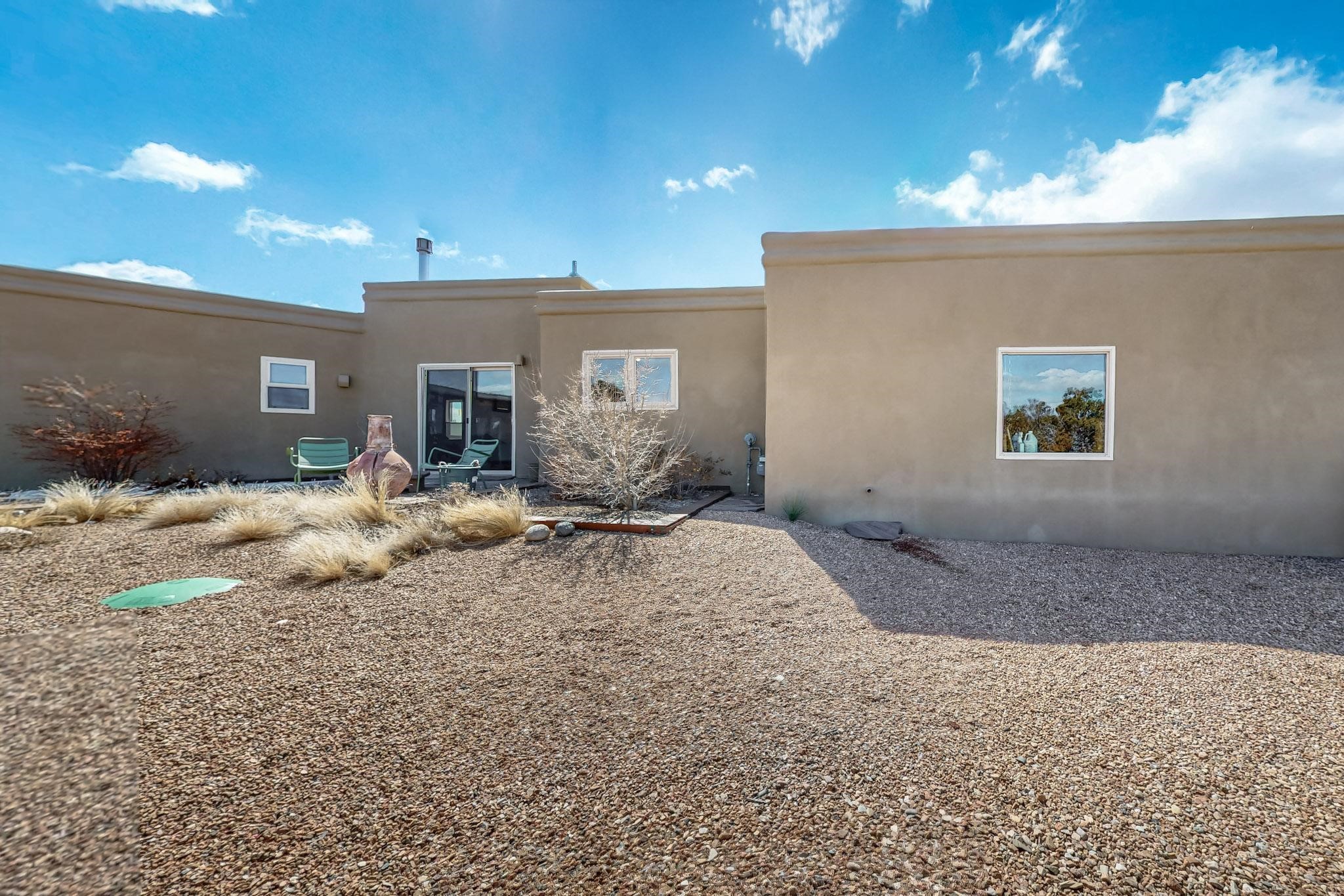 This home is a lovely, sparkling example of pride of ownership. Delightfully refreshed and remodelled, this passive solar design has gleaming brick floors and a bright and sunny aspect throughout. New kitchen and bathrooms, 4 mini splits, upsized electrical panel and new stucco in 2019. A new hot water heater, washer and dryer, and water softener in 2020. The roof and woodwork has been steadily maintained. Electrical has been installed in the She/He Shed and several raised beds ready for planting. The garage is an oversized one and one half car, plenty of storage. A new gate was installed to the privacy fence, extensive water barrel conservation, new landscaping and patios creates a wonderful private outside entertaining space with expansive views of the Jemez and northern mountains. This home is a gem in Eldorado, easy access to all the amenities, local hike/bike trails, shopping, schools, parks, library and senior center, only minutes into Santa Fe.