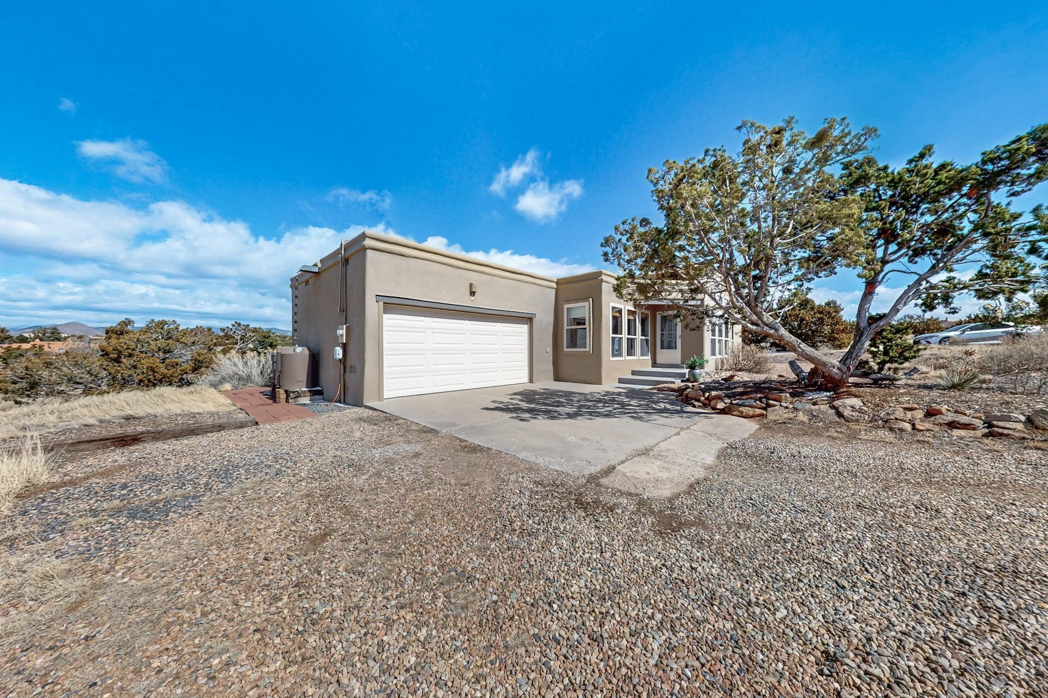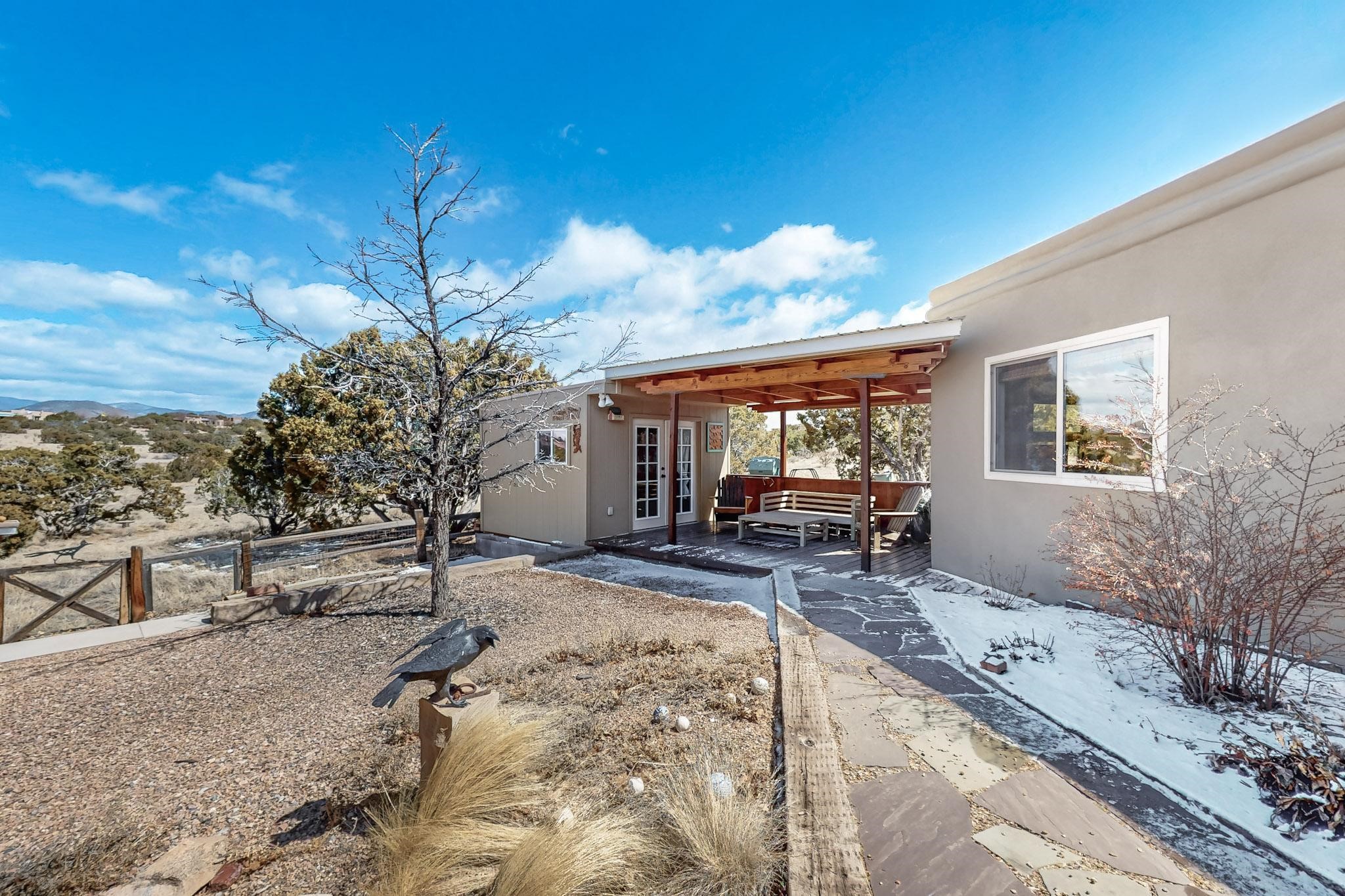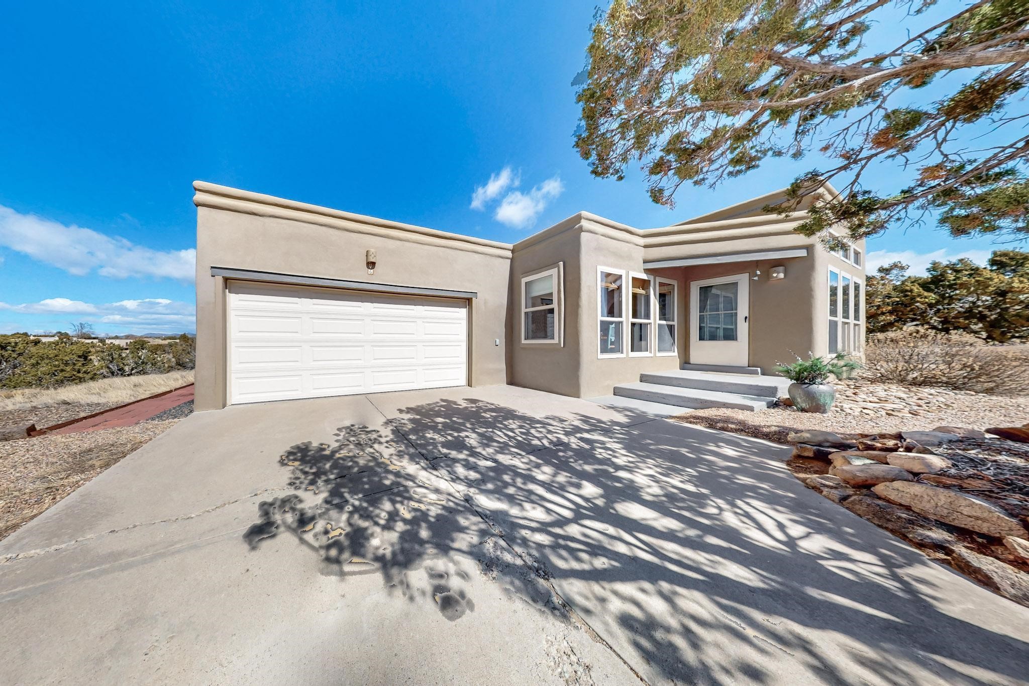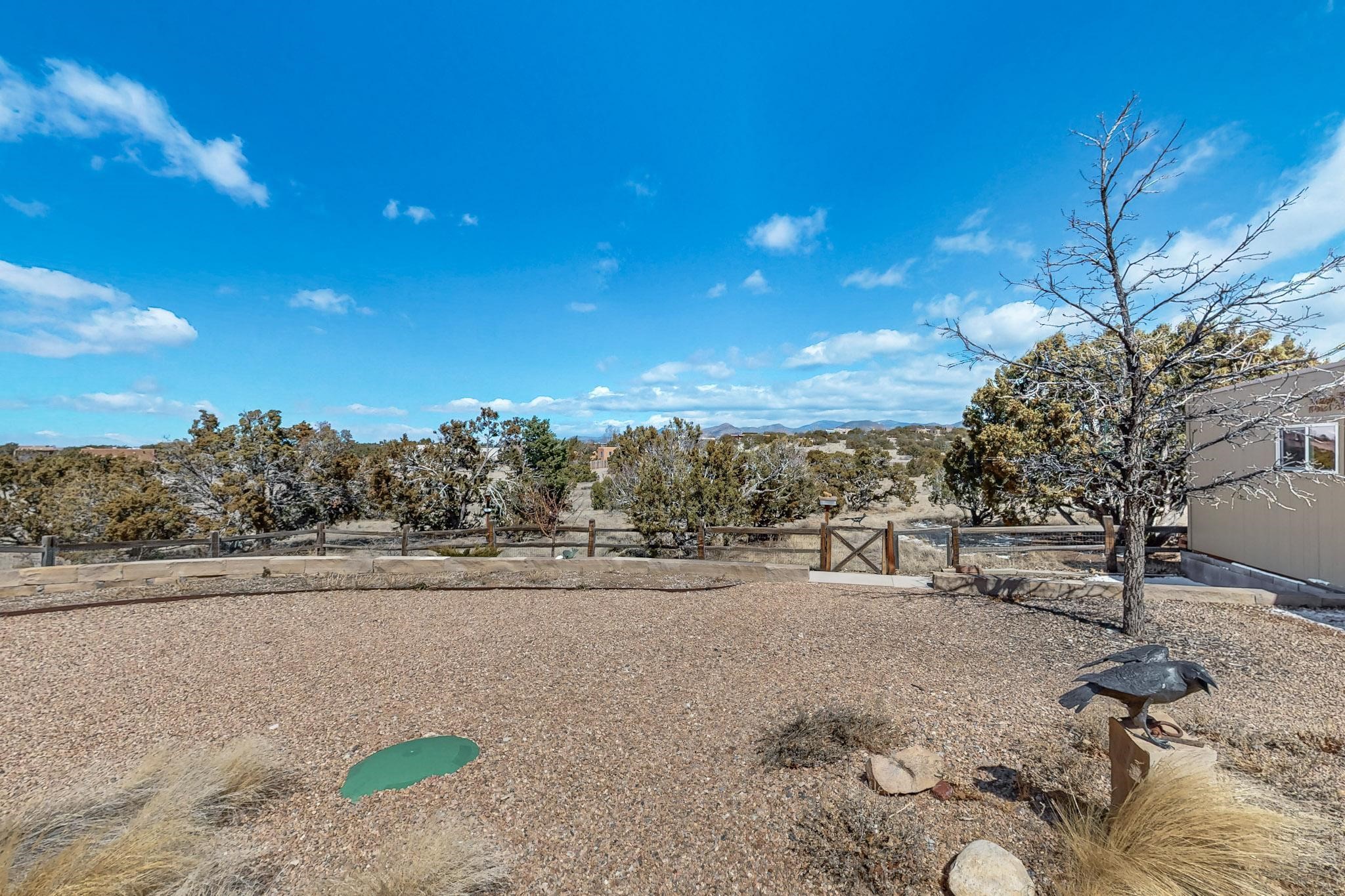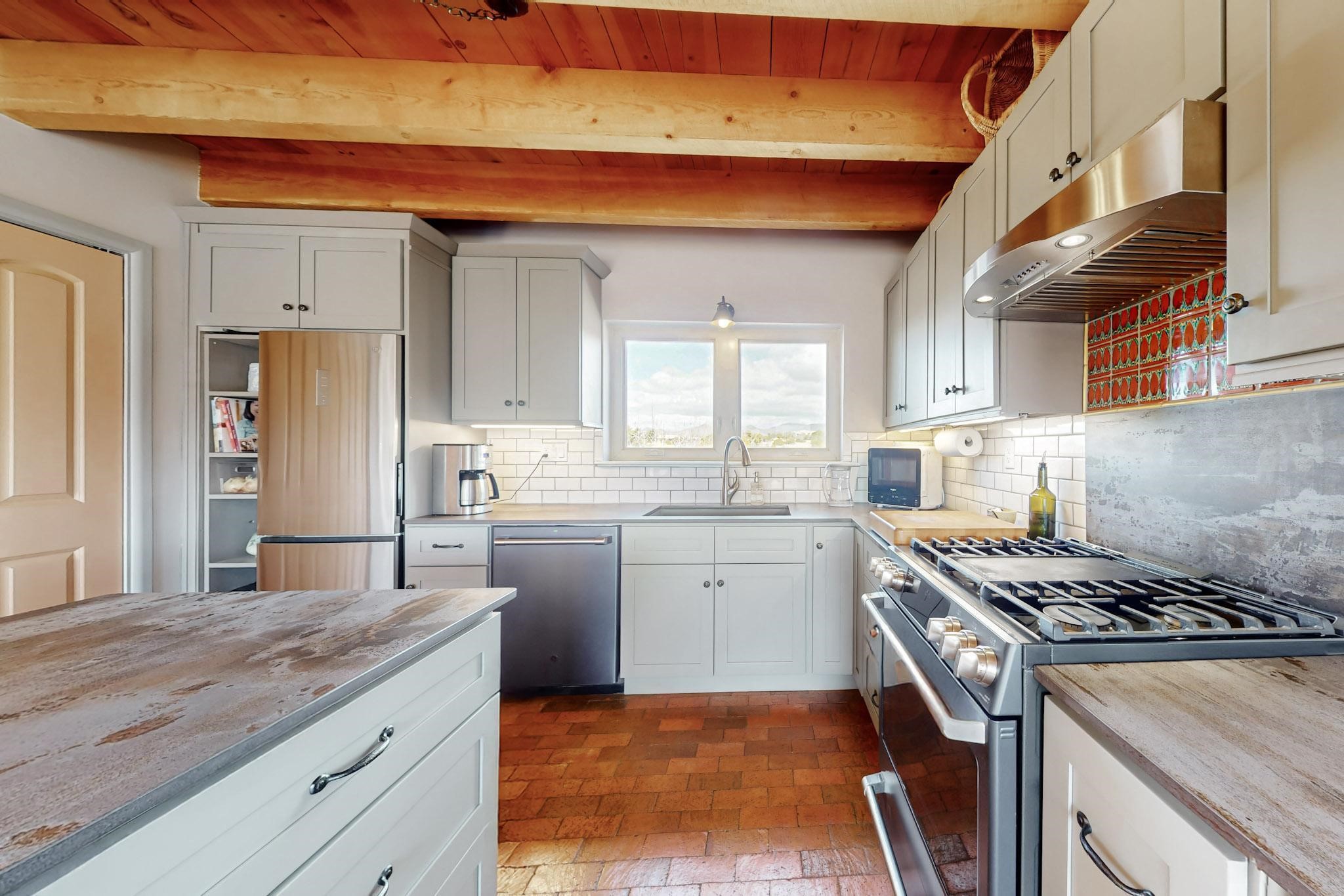 This home is a lovely, sparkling example of pride of ownership. Delightfully refreshed and remodelled, this passive solar design has gleaming brick floors and a bright and sunny aspect throughout. New kitchen and bathrooms, 4 mini splits, upsized electrical panel and new stucco in 2019. A new hot water heater, washer and dryer, and water softener in 2020. The roof and woodwork has been steadily maintained. Electrical has been installed in the She/He Shed and several raised beds ready for planting. The garage is an oversized one and one half car, plenty of storage. A new gate was installed to the privacy fence, extensive water barrel conservation, new landscaping and patios creates a wonderful private outside entertaining space with expansive views of the Jemez and northern mountains. This home is a gem in Eldorado, easy access to all the amenities, local hike/bike trails, shopping, schools, parks, library and senior center, only minutes into Santa Fe.