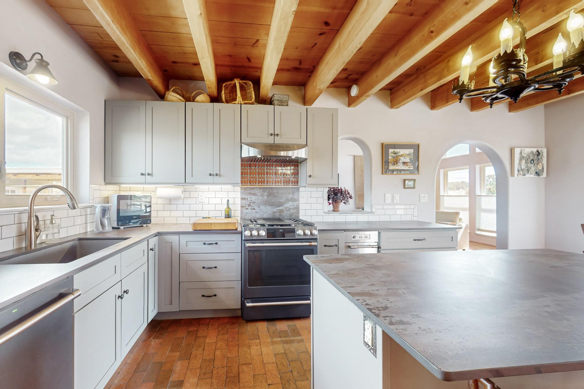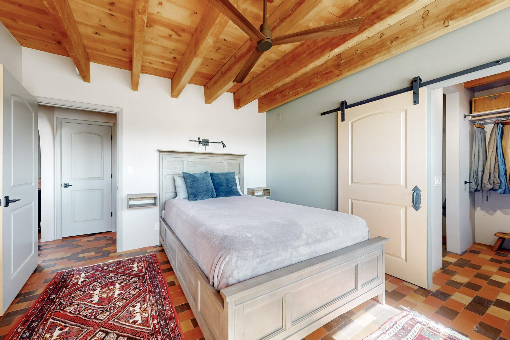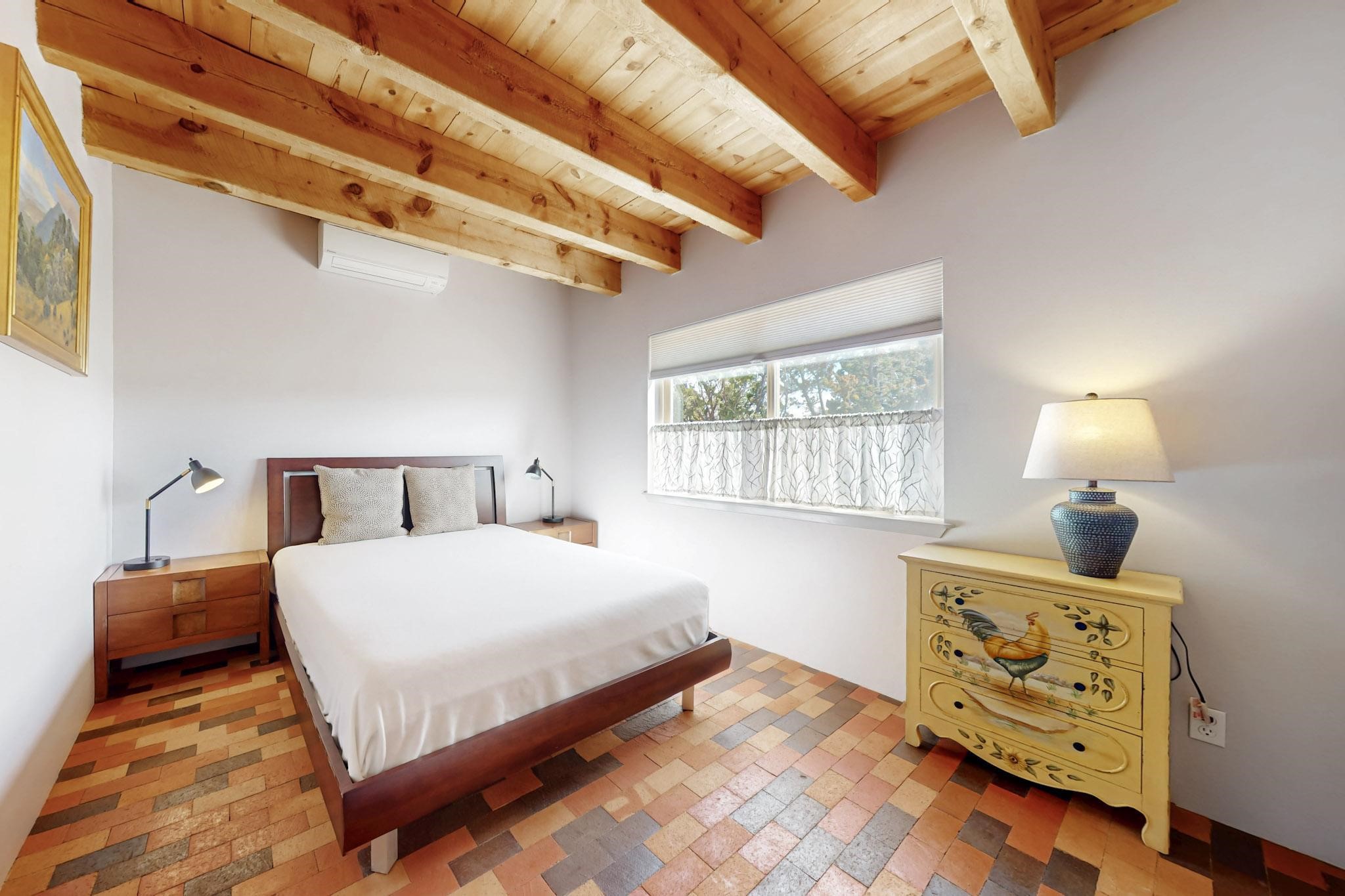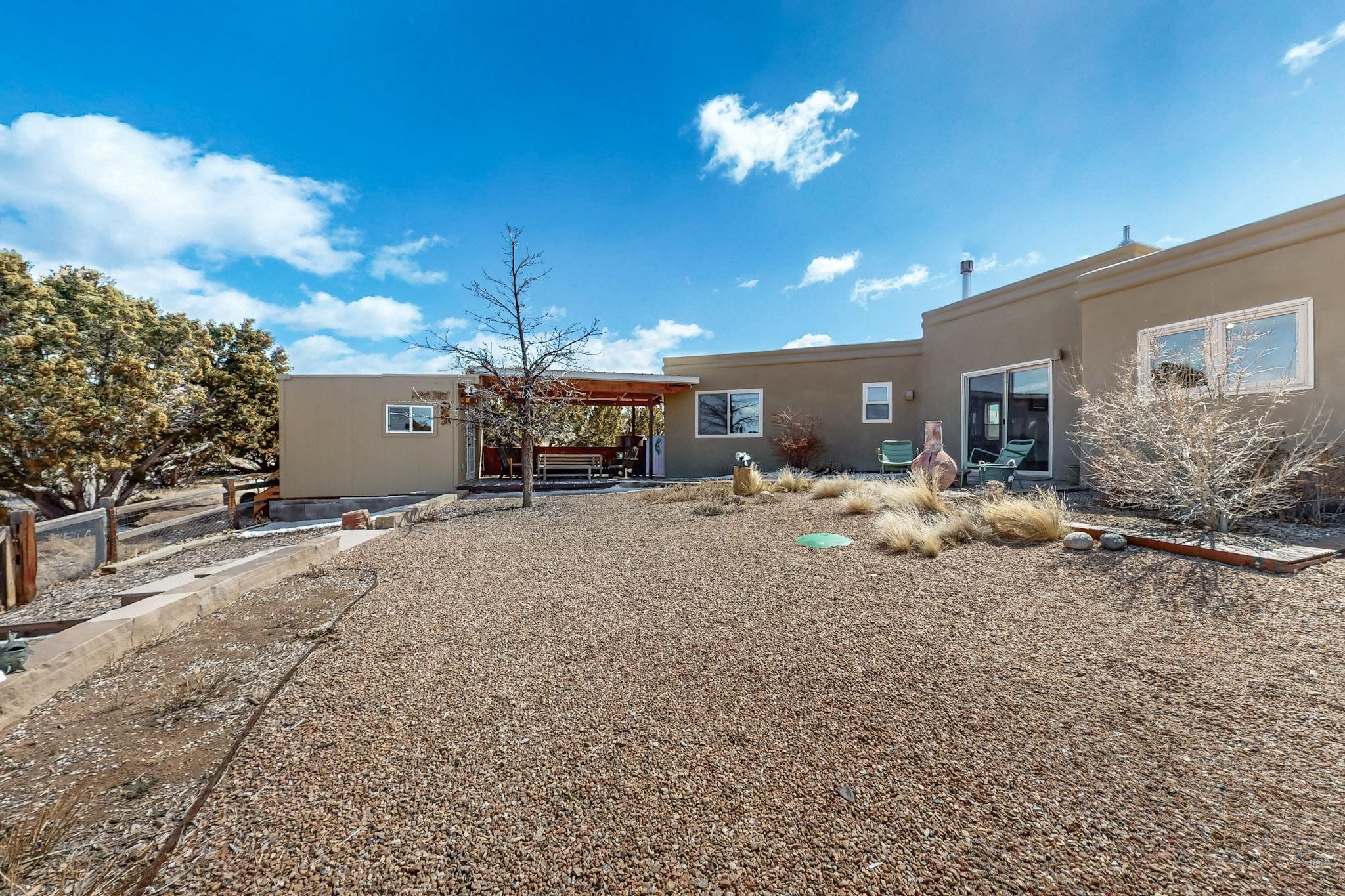 This home is a lovely, sparkling example of pride of ownership. Delightfully refreshed and remodelled, this passive solar design has gleaming brick floors and a bright and sunny aspect throughout. New kitchen and bathrooms, 4 mini splits, upsized electrical panel and new stucco in 2019. A new hot water heater, washer and dryer, and water softener in 2020. The roof and woodwork has been steadily maintained. Electrical has been installed in the She/He Shed and several raised beds ready for planting. The garage is an oversized one and one half car, plenty of storage. A new gate was installed to the privacy fence, extensive water barrel conservation, new landscaping and patios creates a wonderful private outside entertaining space with expansive views of the Jemez and northern mountains. This home is a gem in Eldorado, easy access to all the amenities, local hike/bike trails, shopping, schools, parks, library and senior center, only minutes into Santa Fe.