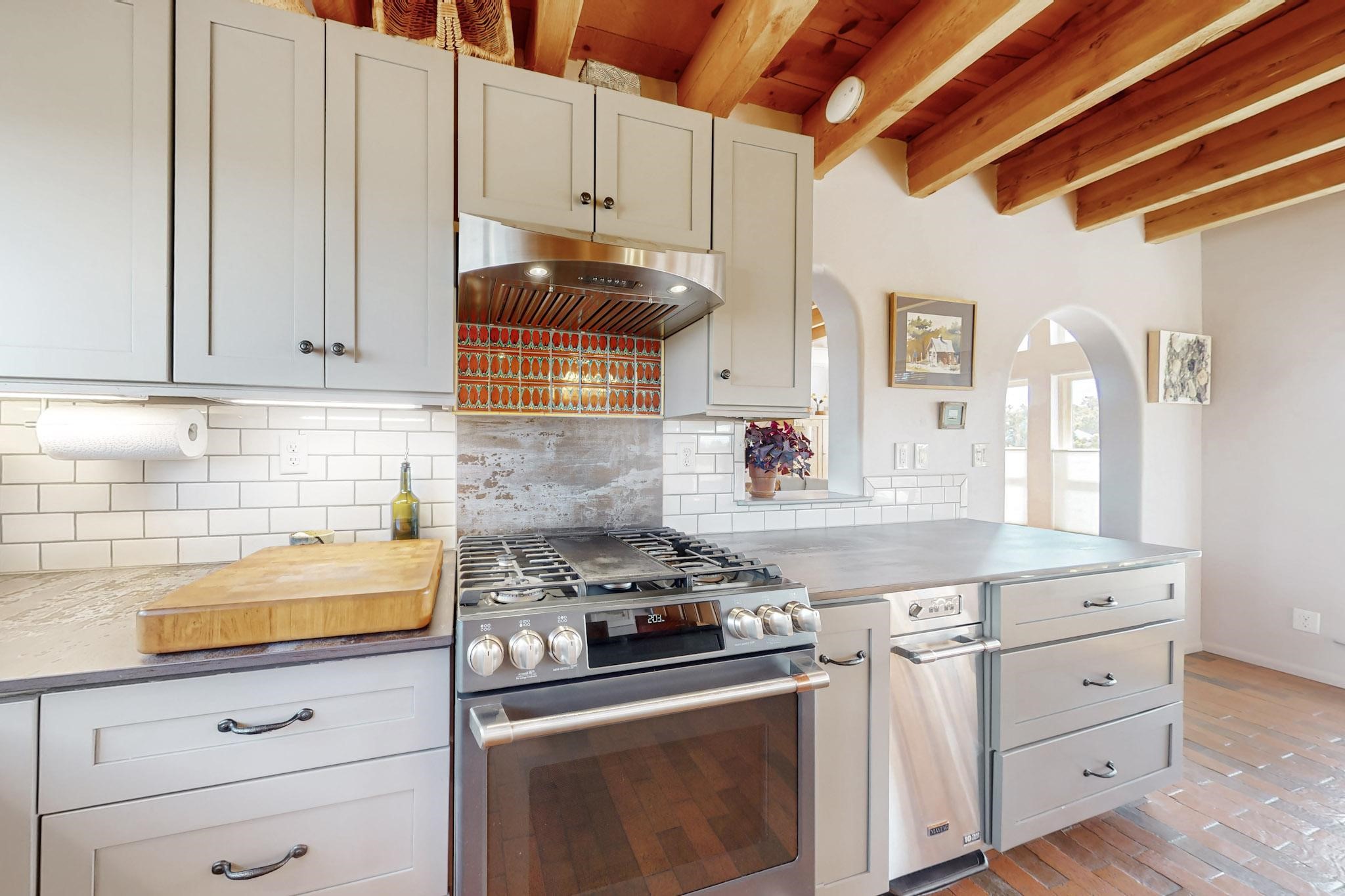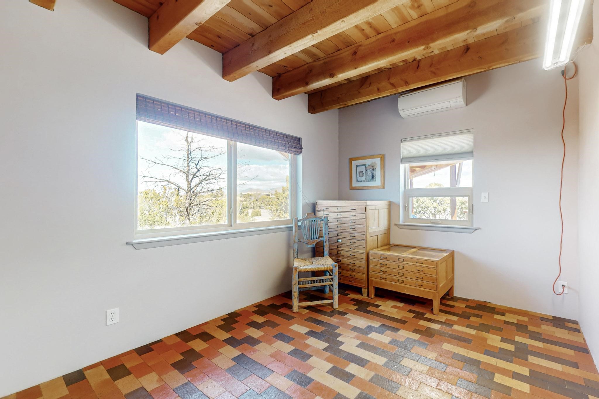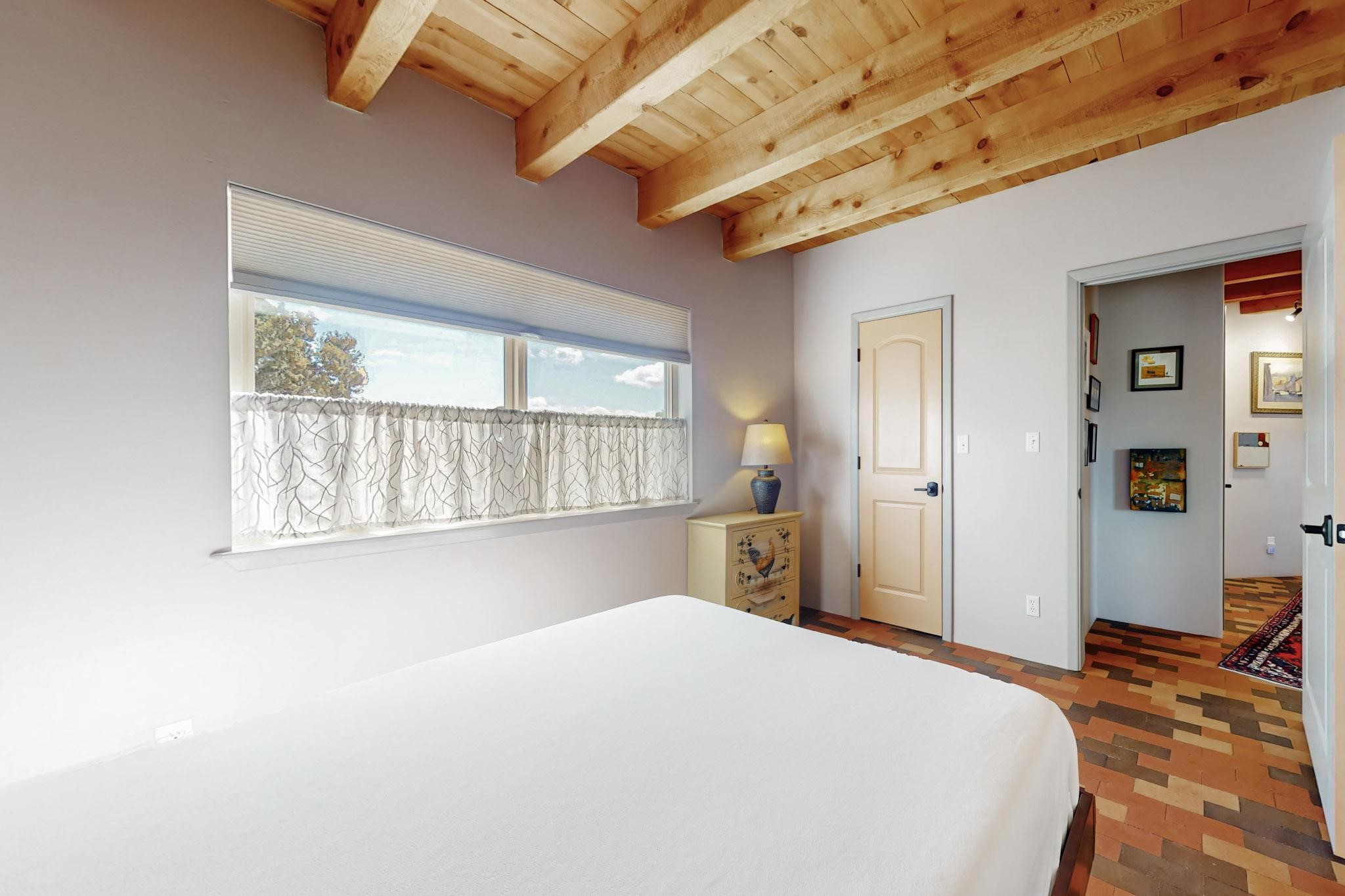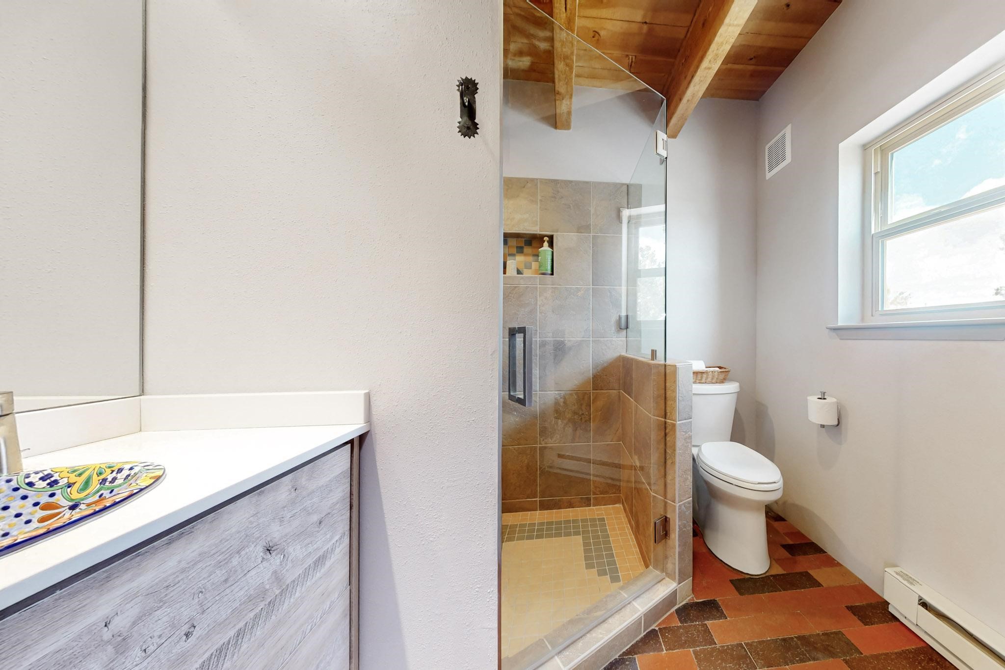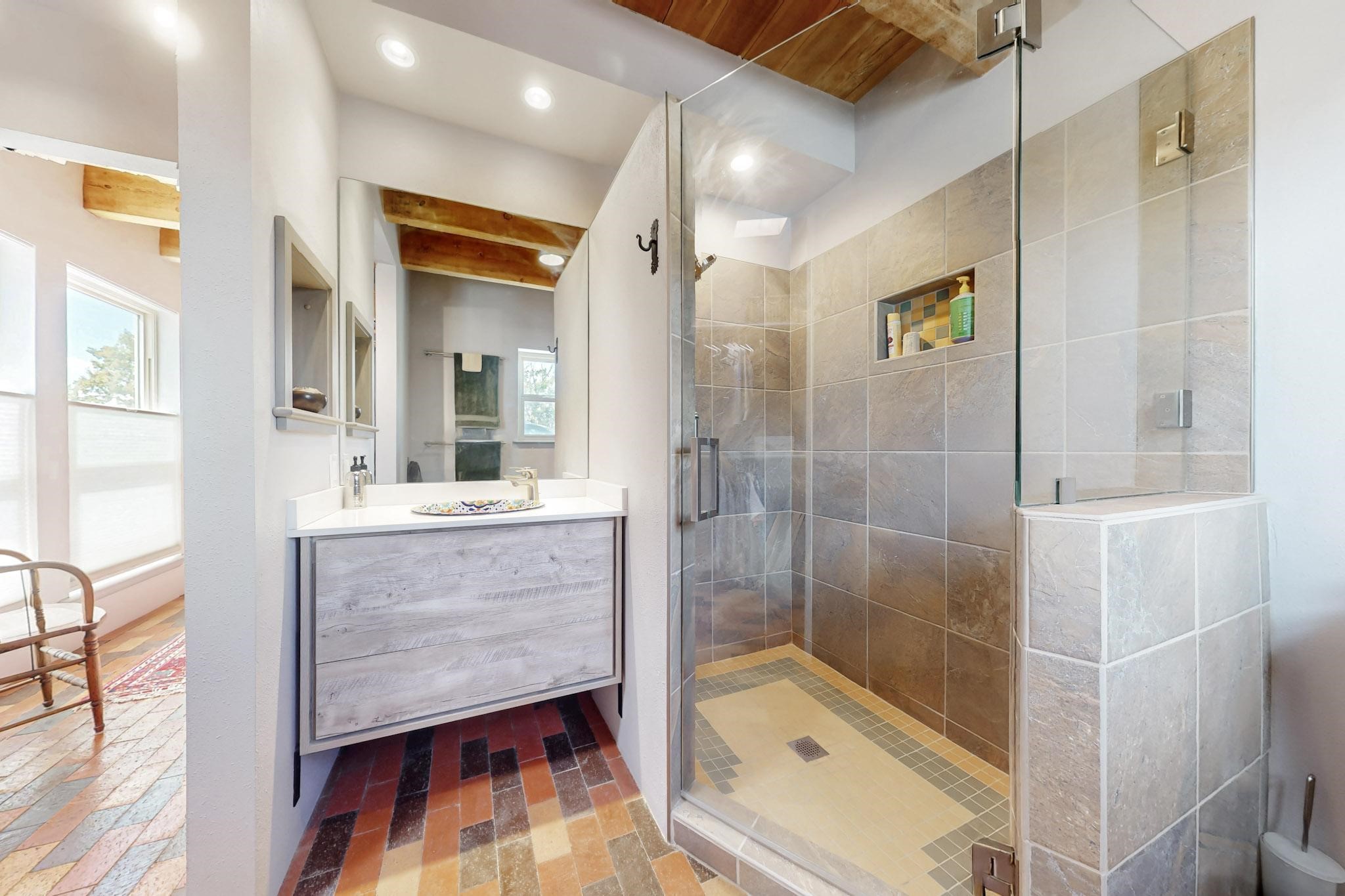 This home is a lovely, sparkling example of pride of ownership. Delightfully refreshed and remodelled, this passive solar design has gleaming brick floors and a bright and sunny aspect throughout. New kitchen and bathrooms, 4 mini splits, upsized electrical panel and new stucco in 2019. A new hot water heater, washer and dryer, and water softener in 2020. The roof and woodwork has been steadily maintained. Electrical has been installed in the She/He Shed and several raised beds ready for planting. The garage is an oversized one and one half car, plenty of storage. A new gate was installed to the privacy fence, extensive water barrel conservation, new landscaping and patios creates a wonderful private outside entertaining space with expansive views of the Jemez and northern mountains. This home is a gem in Eldorado, easy access to all the amenities, local hike/bike trails, shopping, schools, parks, library and senior center, only minutes into Santa Fe.