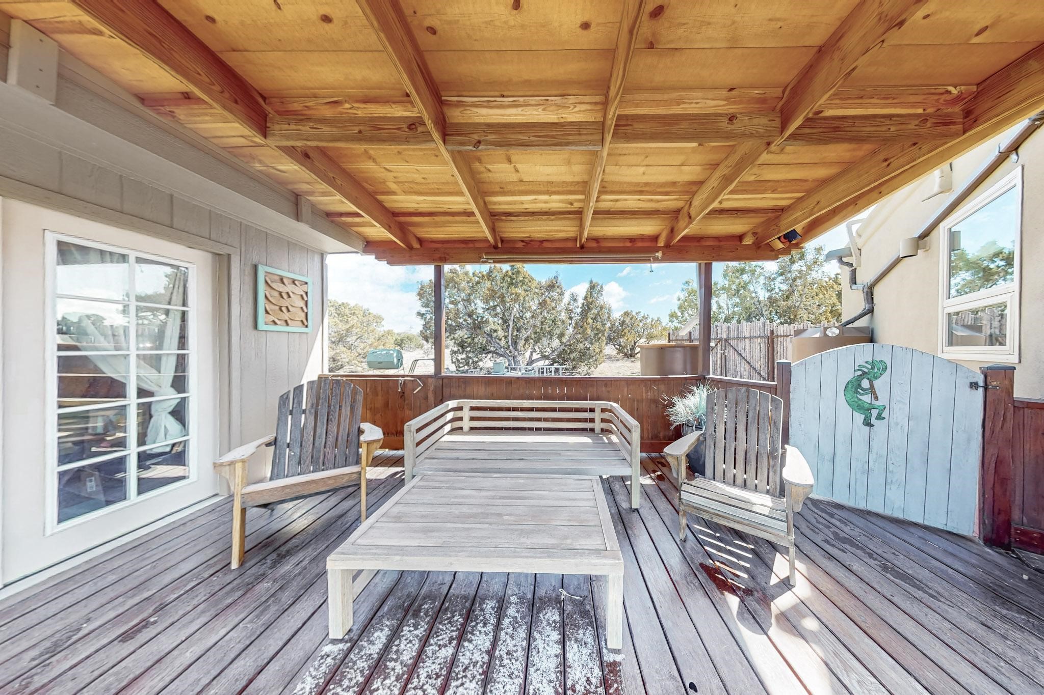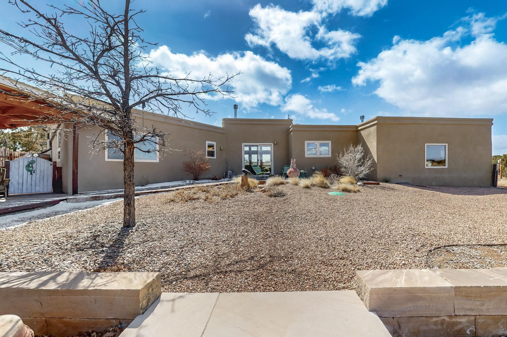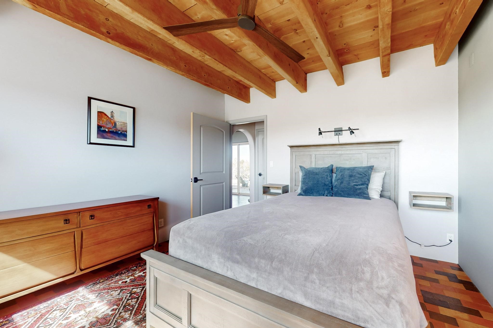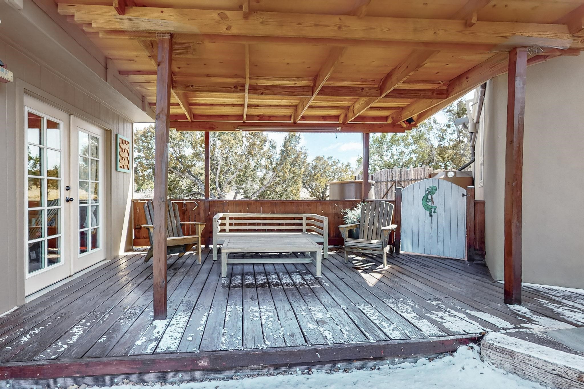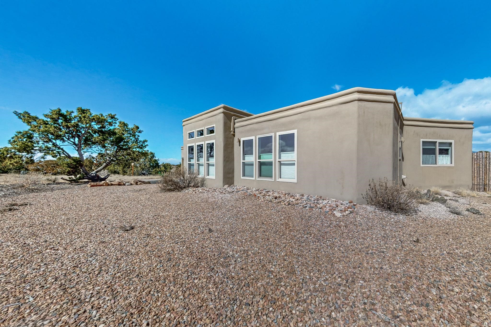 This home is a lovely, sparkling example of pride of ownership. Delightfully refreshed and remodelled, this passive solar design has gleaming brick floors and a bright and sunny aspect throughout. New kitchen and bathrooms, 4 mini splits, upsized electrical panel and new stucco in 2019. A new hot water heater, washer and dryer, and water softener in 2020. The roof and woodwork has been steadily maintained. Electrical has been installed in the She/He Shed and several raised beds ready for planting. The garage is an oversized one and one half car, plenty of storage. A new gate was installed to the privacy fence, extensive water barrel conservation, new landscaping and patios creates a wonderful private outside entertaining space with expansive views of the Jemez and northern mountains. This home is a gem in Eldorado, easy access to all the amenities, local hike/bike trails, shopping, schools, parks, library and senior center, only minutes into Santa Fe.