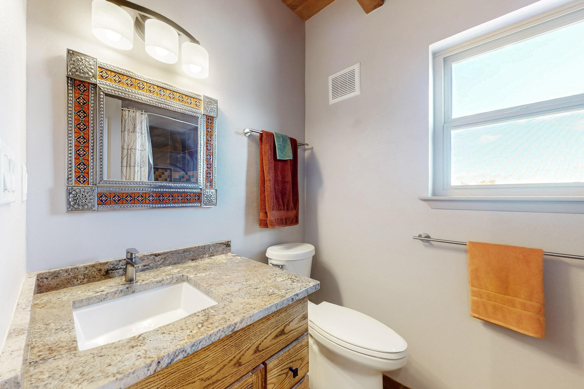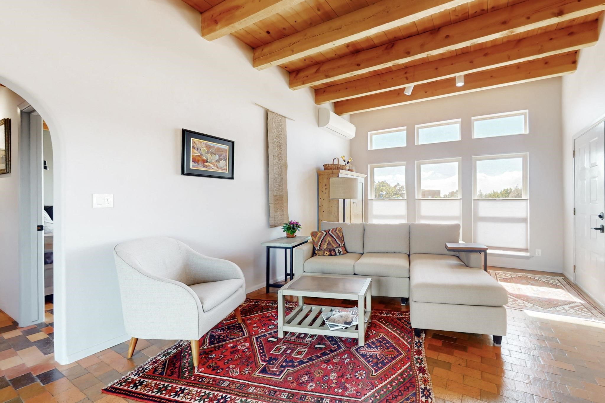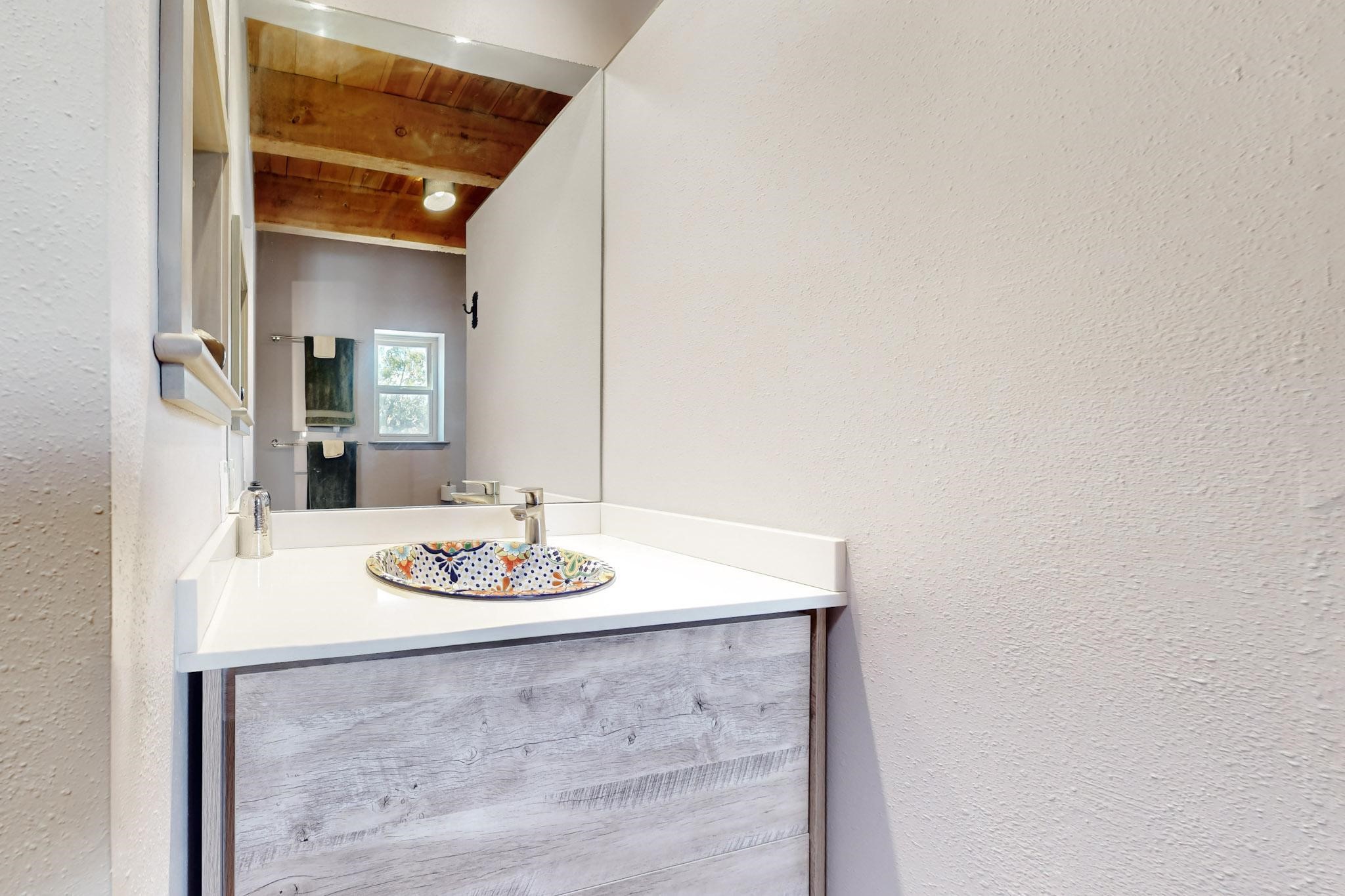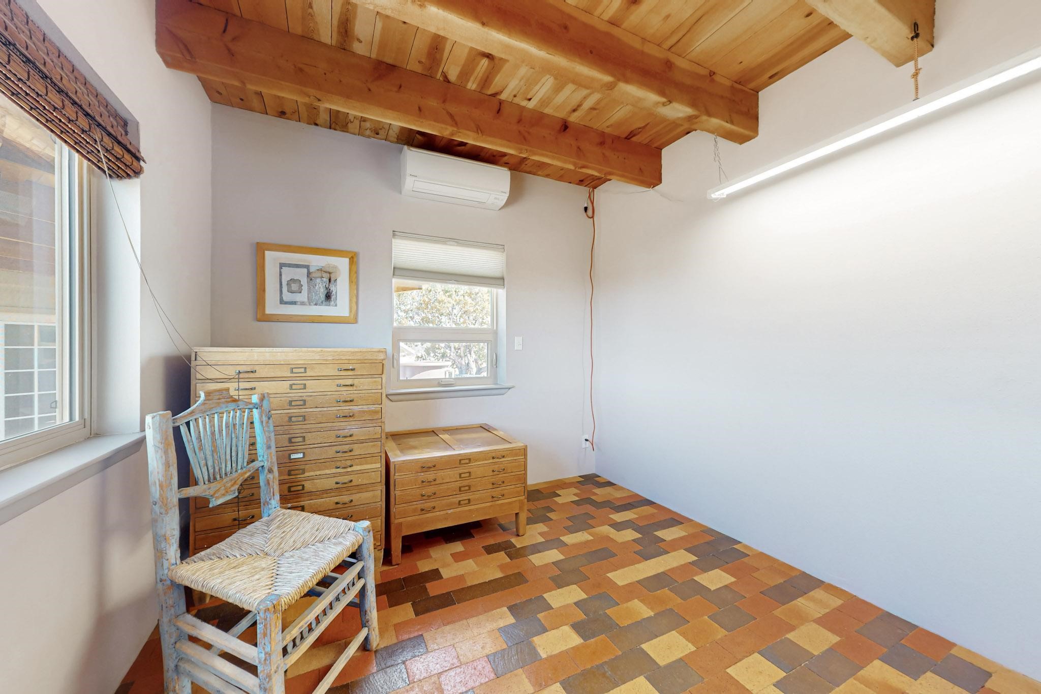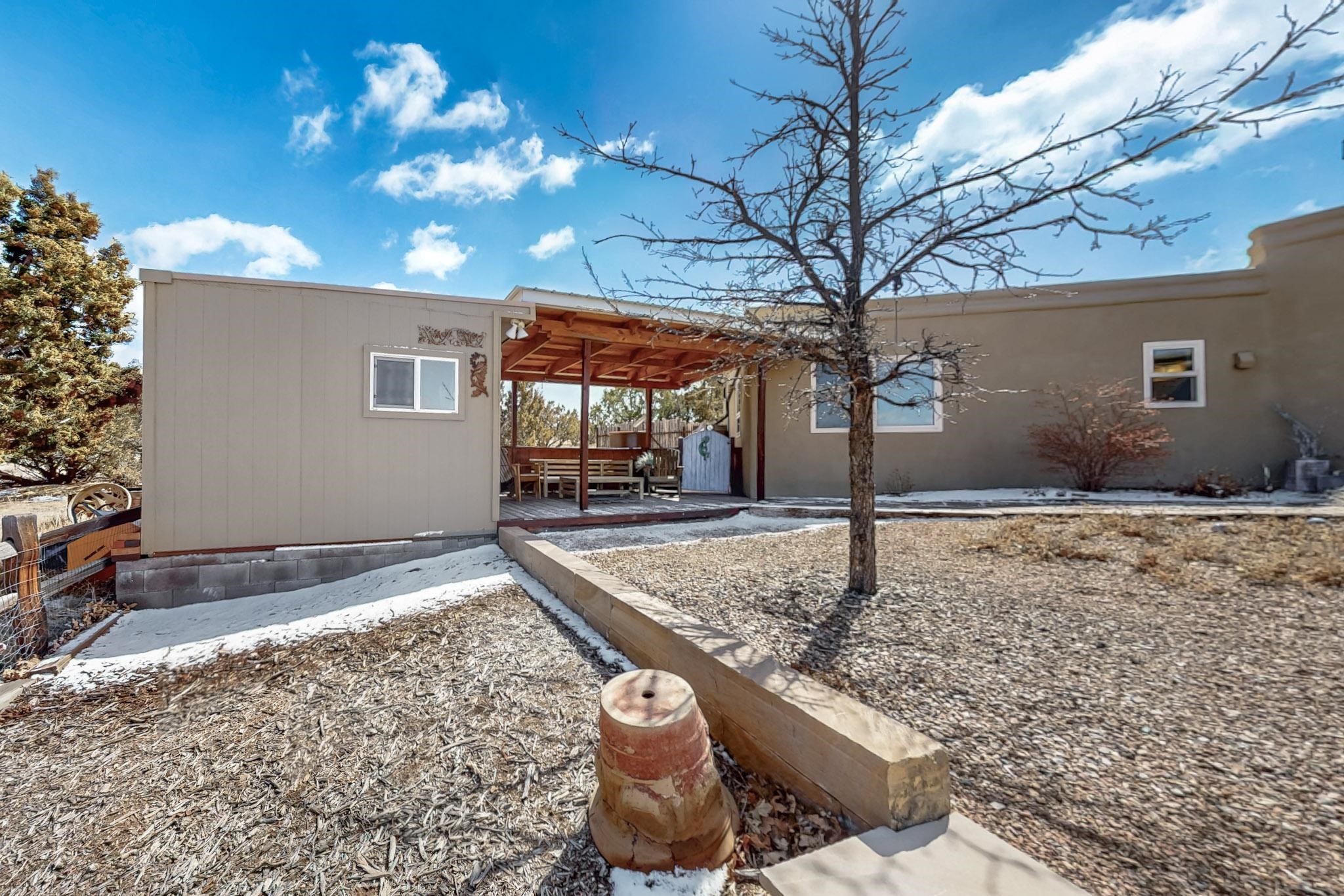 This home is a lovely, sparkling example of pride of ownership. Delightfully refreshed and remodelled, this passive solar design has gleaming brick floors and a bright and sunny aspect throughout. New kitchen and bathrooms, 4 mini splits, upsized electrical panel and new stucco in 2019. A new hot water heater, washer and dryer, and water softener in 2020. The roof and woodwork has been steadily maintained. Electrical has been installed in the She/He Shed and several raised beds ready for planting. The garage is an oversized one and one half car, plenty of storage. A new gate was installed to the privacy fence, extensive water barrel conservation, new landscaping and patios creates a wonderful private outside entertaining space with expansive views of the Jemez and northern mountains. This home is a gem in Eldorado, easy access to all the amenities, local hike/bike trails, shopping, schools, parks, library and senior center, only minutes into Santa Fe.