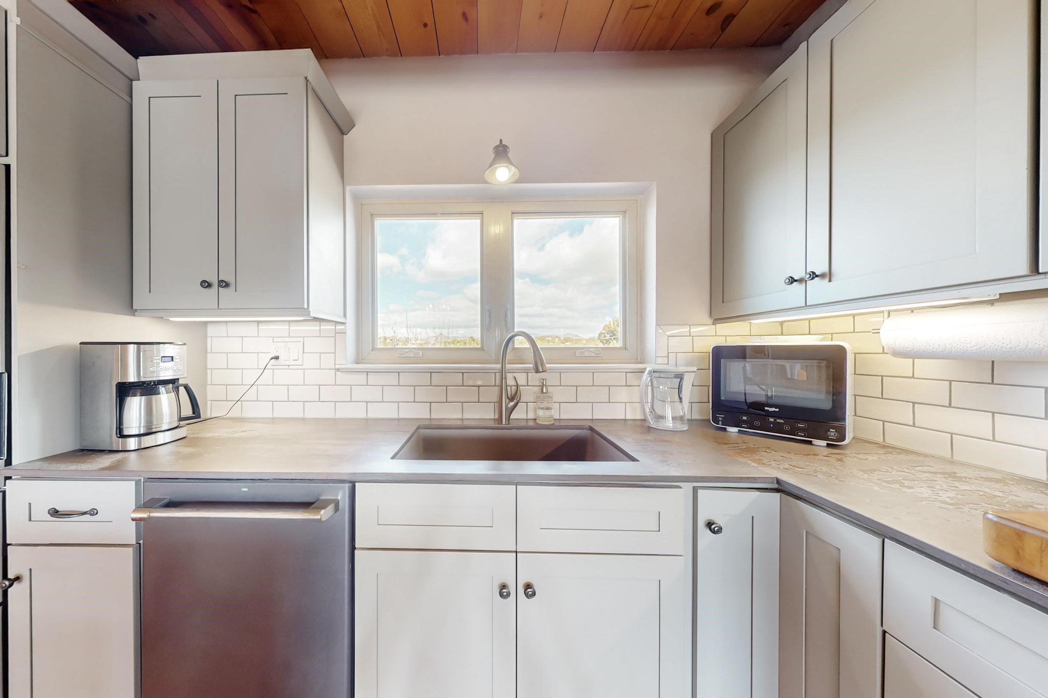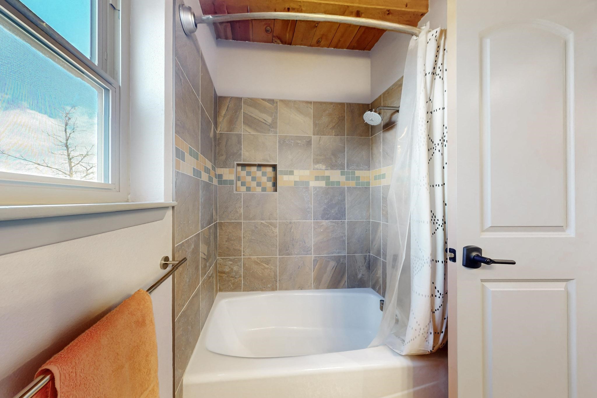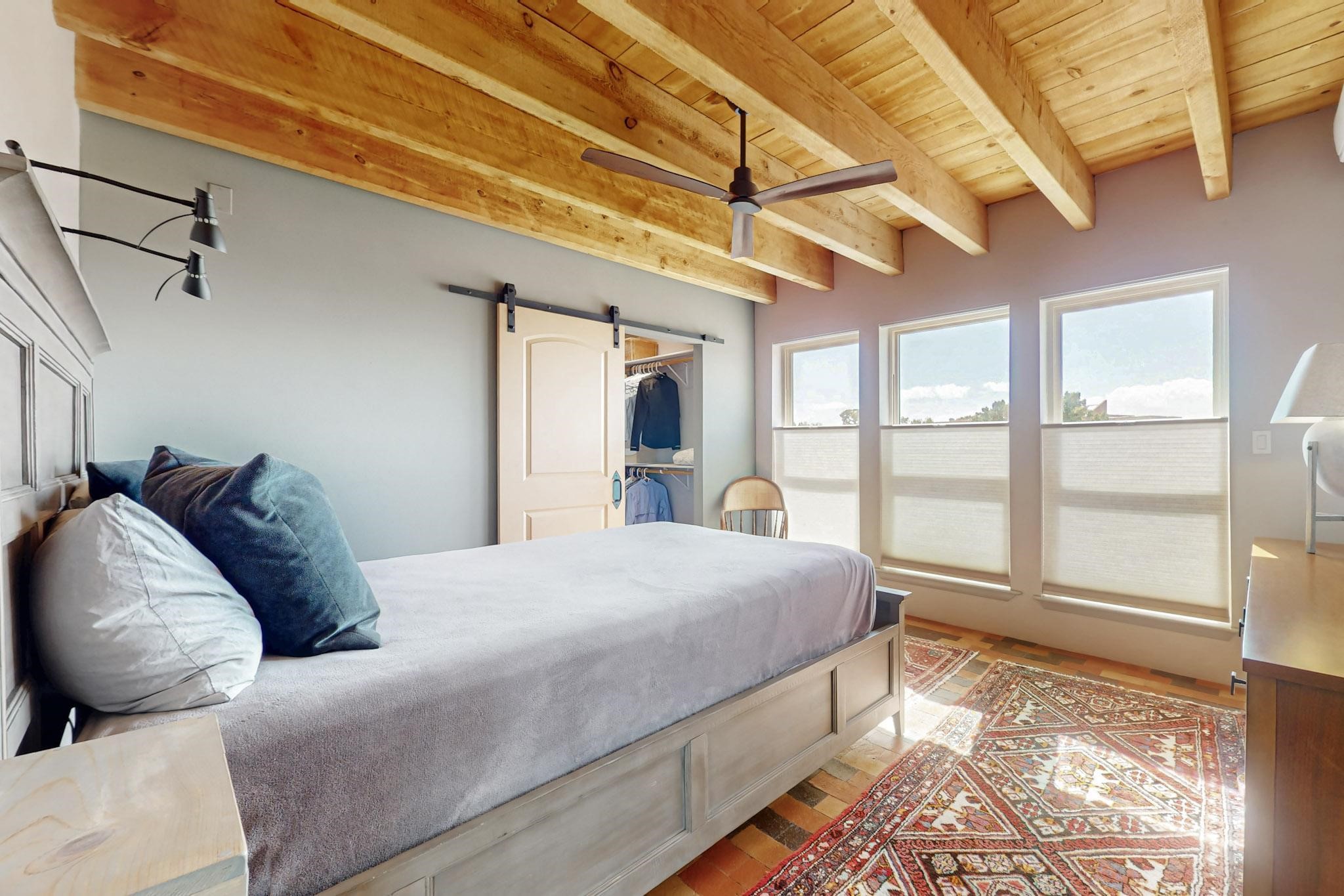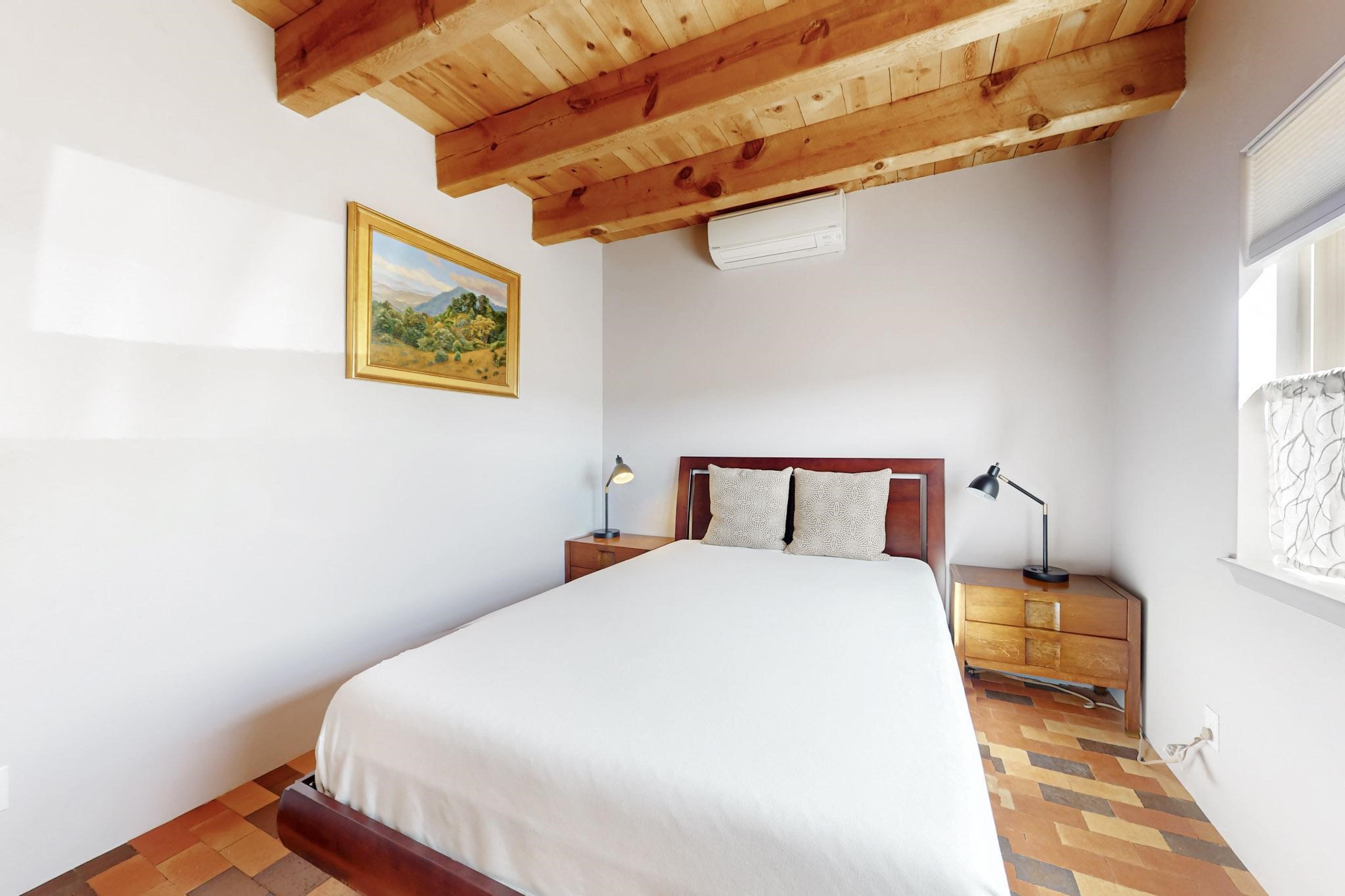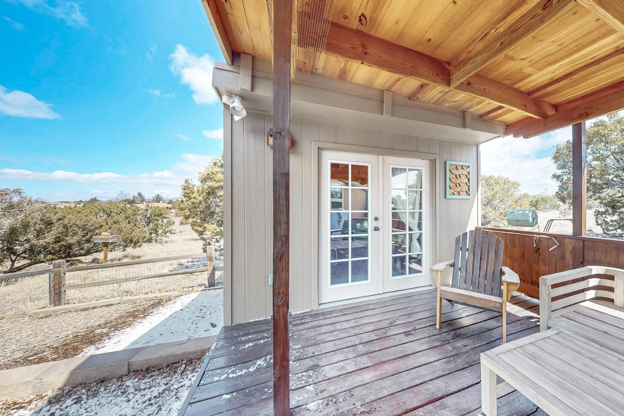 This home is a lovely, sparkling example of pride of ownership. Delightfully refreshed and remodelled, this passive solar design has gleaming brick floors and a bright and sunny aspect throughout. New kitchen and bathrooms, 4 mini splits, upsized electrical panel and new stucco in 2019. A new hot water heater, washer and dryer, and water softener in 2020. The roof and woodwork has been steadily maintained. Electrical has been installed in the She/He Shed and several raised beds ready for planting. The garage is an oversized one and one half car, plenty of storage. A new gate was installed to the privacy fence, extensive water barrel conservation, new landscaping and patios creates a wonderful private outside entertaining space with expansive views of the Jemez and northern mountains. This home is a gem in Eldorado, easy access to all the amenities, local hike/bike trails, shopping, schools, parks, library and senior center, only minutes into Santa Fe.