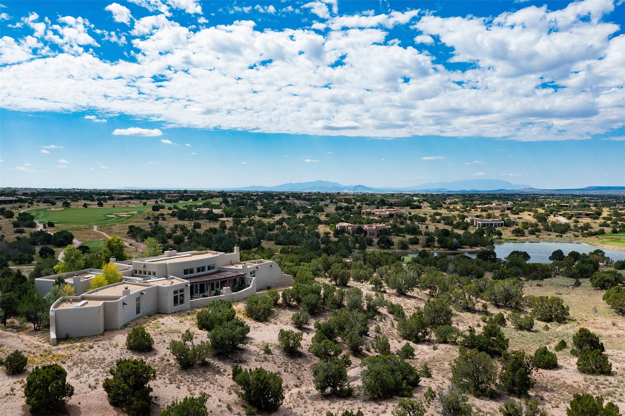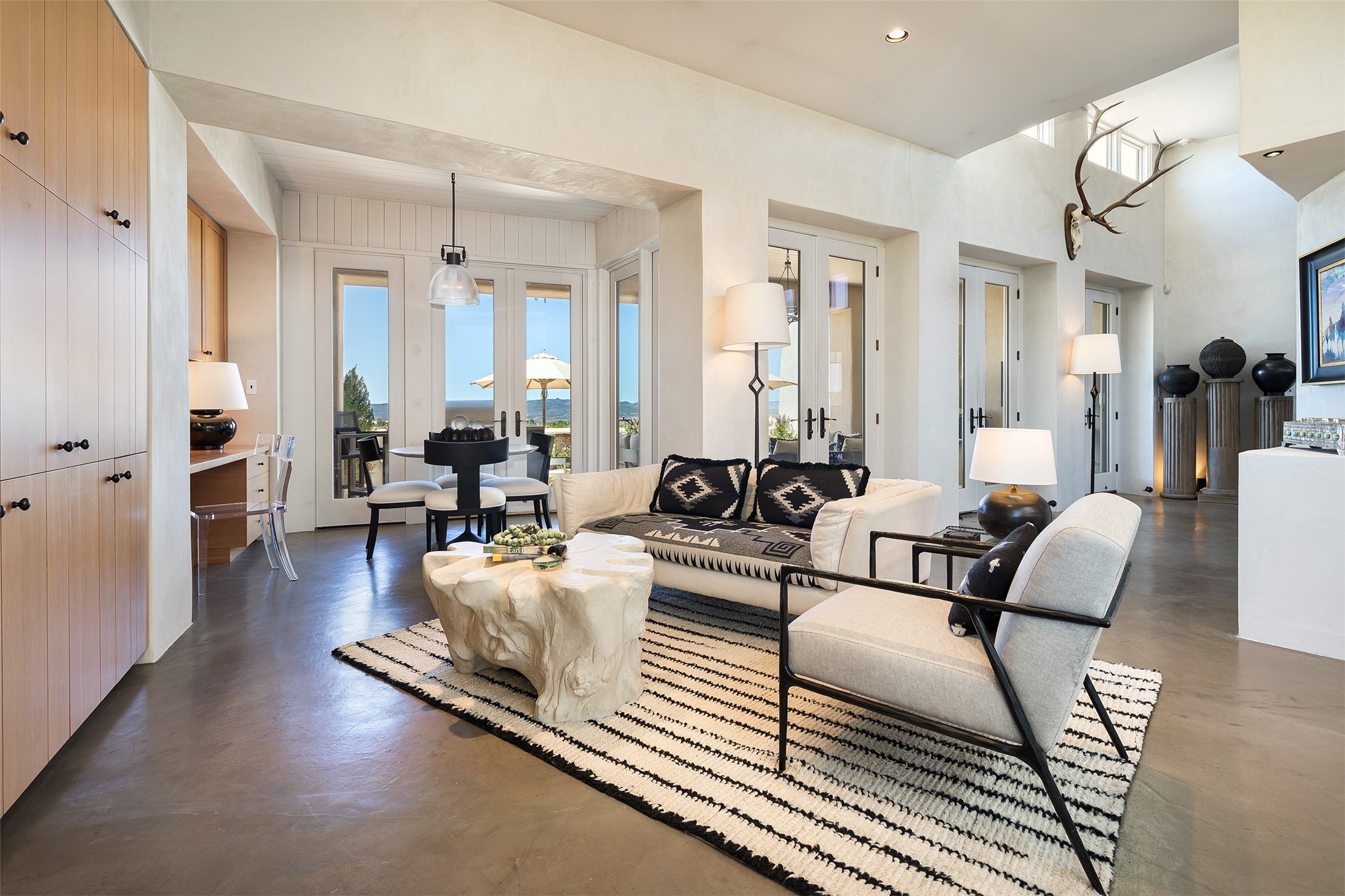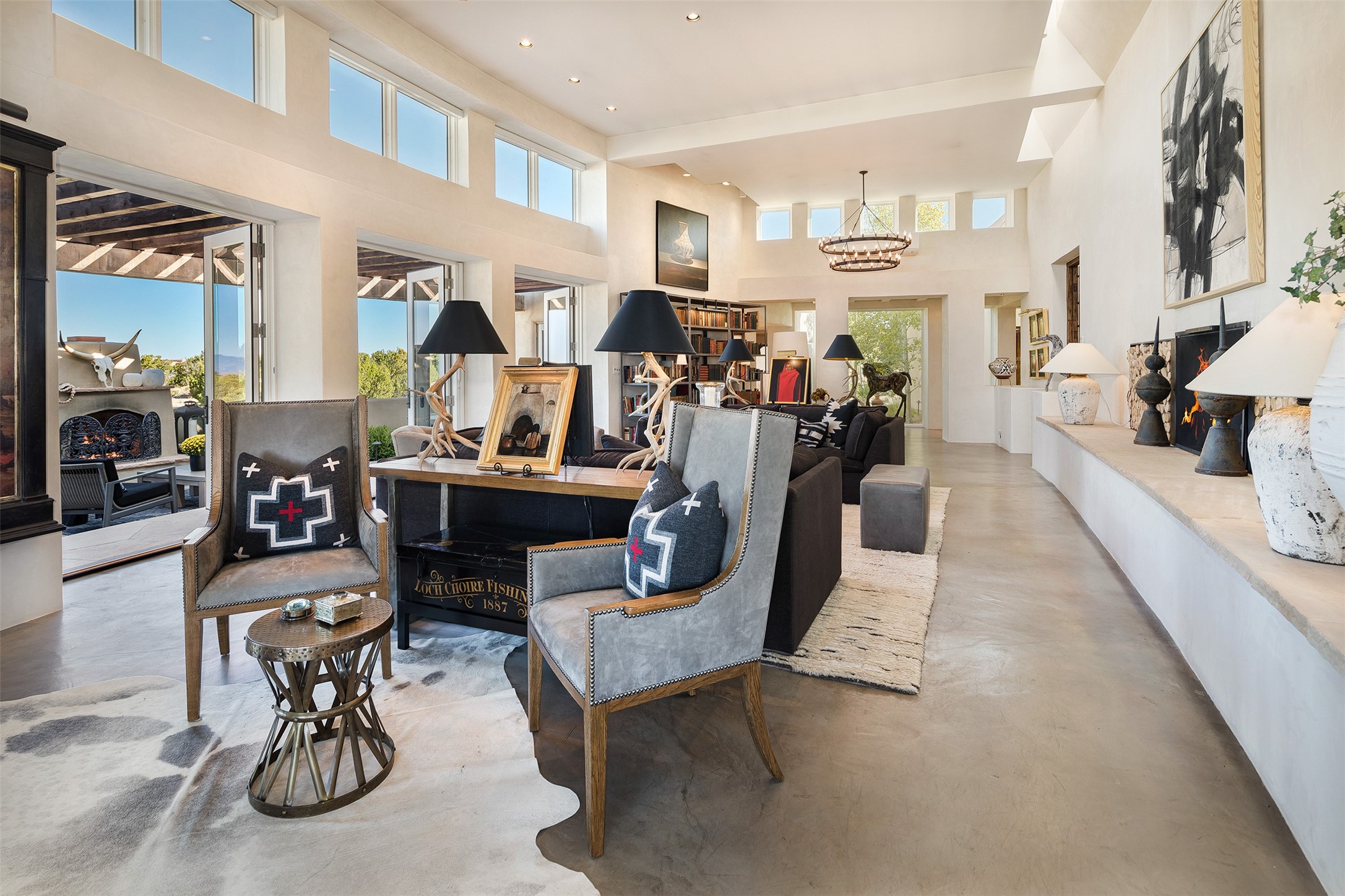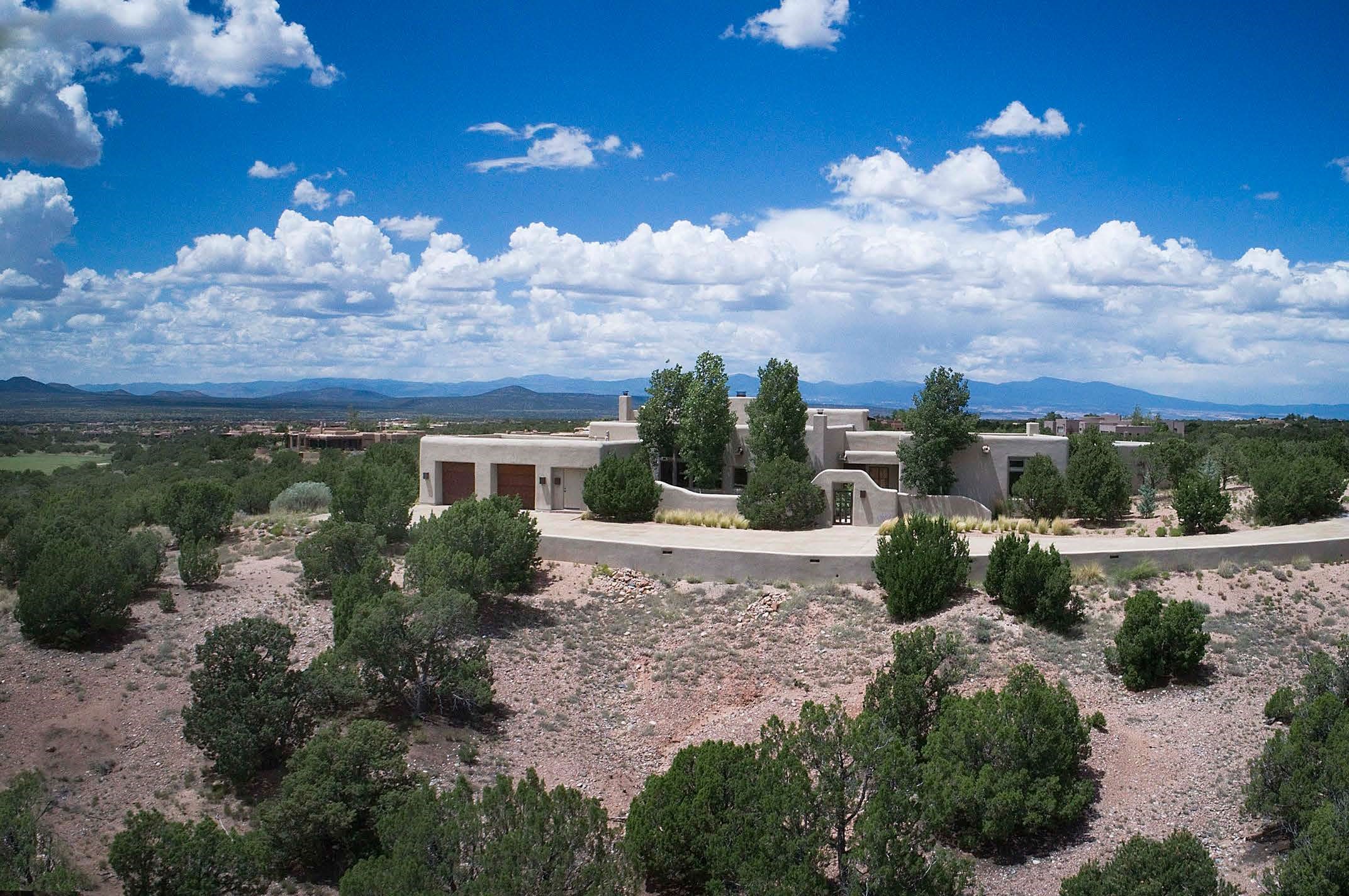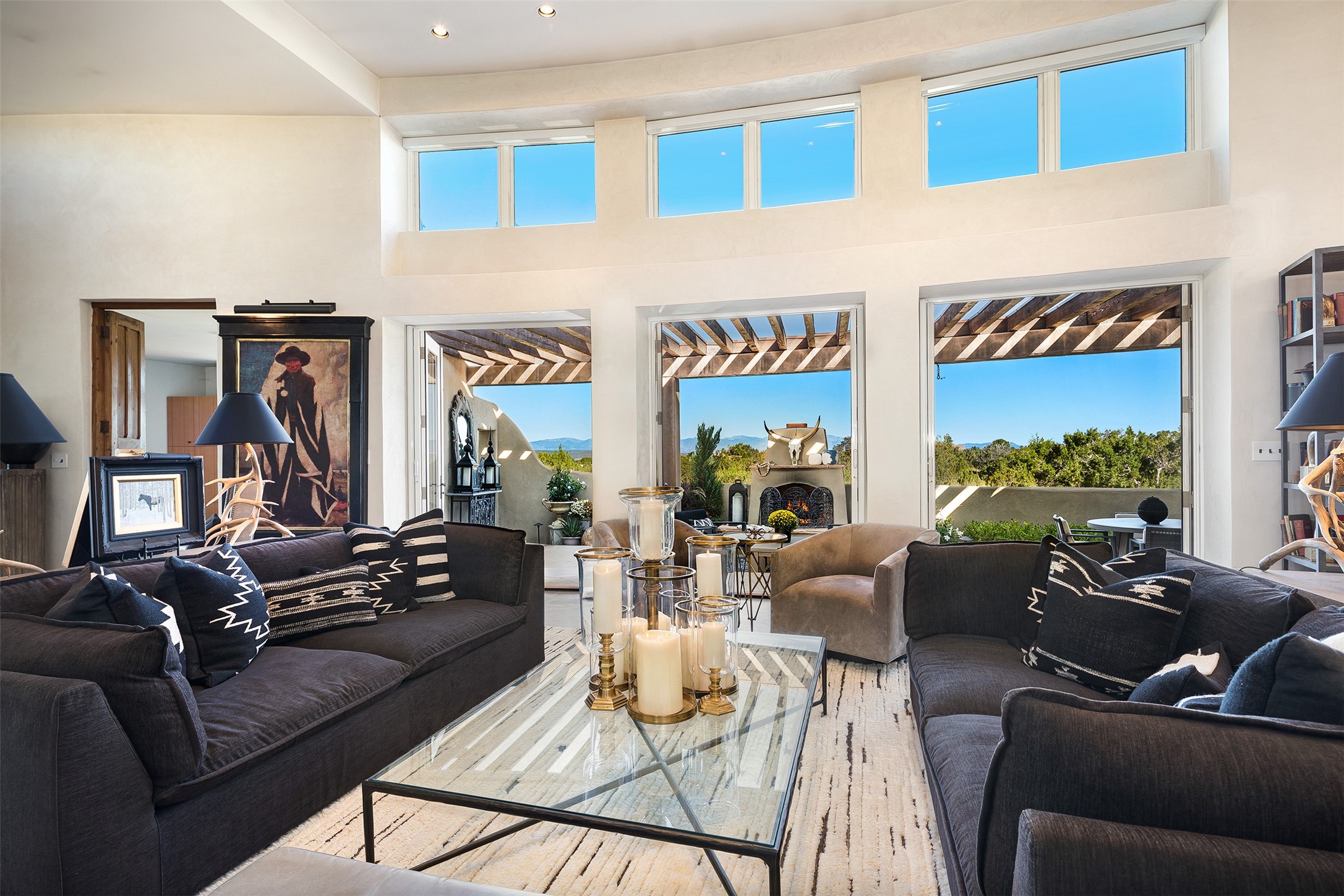One of the most extraordinary homes in all of Santa Fe, this captivating residence by the award-winning builder, Tierra Concepts, stuns with contemporary architecture, majestic, expansive mountain, golf course and sunset views. Perched on an elevated double lot, with unmatched privacy on 4.5 acres, overlooking the Jack Nicklaus designed Sunrise Golf Course, within the famed community of Las Campanas and the coveted Wildhorse Estates, this exquisite home exemplifies the unique blend of modern design with the warmth of New Mexican accents. Defining features begin with the long, private, concrete driveway, entering the custom carved courtyard doors and vibrant landscape. This tranquil retreat offers 3 bedrooms, 4 baths, plus a media room/office with portal access. The 55' great room excites with surround mountain views, high ceilings, vast walls for art, clerestory windows, 9 double atrium glass doors which lead to the dual outdoor portals. The well-appointed kitchen with fireplace impresses with a large island and seating, walk-in pantry, dual sinks, and Wolf, Viking, Sub-Zero, Bosch, and Miele appliances, all of which opens to a breakfast dining area, casual sitting room, outdoor built-in BBQ and dining area. Off the kitchen is a wine bar and formal dining room with a 350-bottle glassed wine wall and fireplace. Luxurious owner's suite with a sitting area, fireplace, spa-like bath, floating vanity, dual sinks, soaking tub, steam shower and walk-in closet. Two spacious ensuite bedrooms with views, built-in desks, and fireplaces. Seamless outdoor living experience is enhanced with 2 generous, private, walled courtyards with deep portals, 2 fireplaces and RH Design outdoor furnishings. Highlights include soft, natural light, with 7 fireplaces, 14 recessed skylights, 6 imported double antique doors, and creamy white plaster walls. Substantially furnished by RH Design, inside and out. Featured in an 8-page spread in Western Art Collector Magazine and Su Casa Magazine.