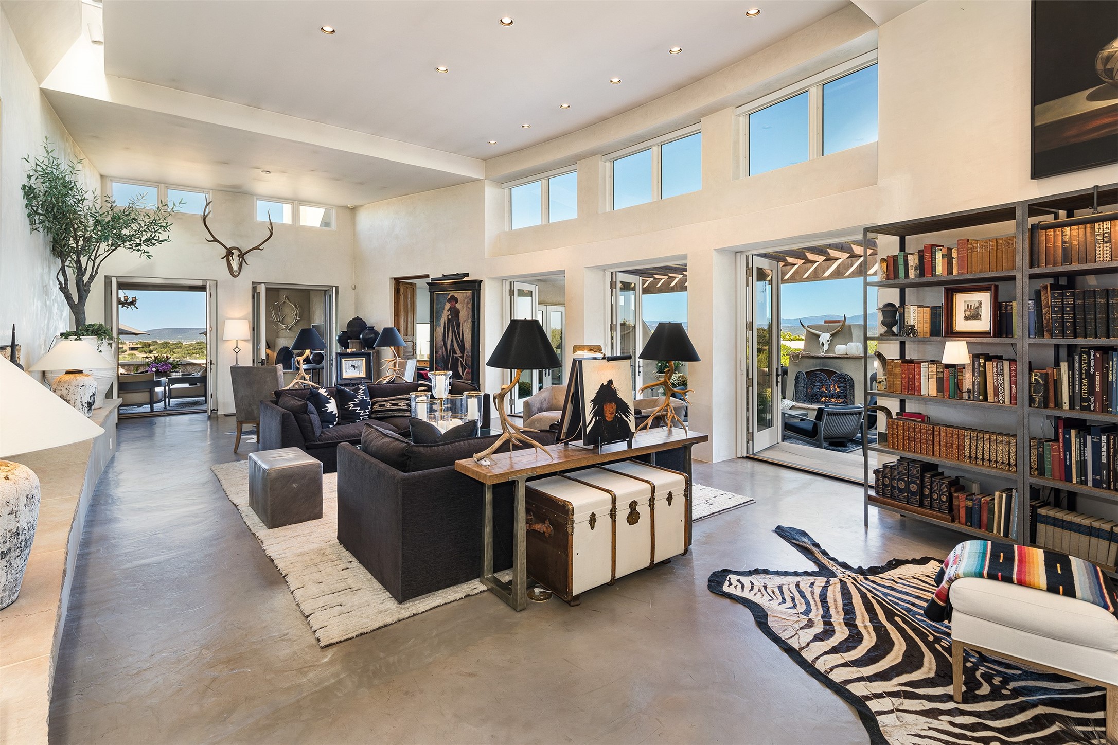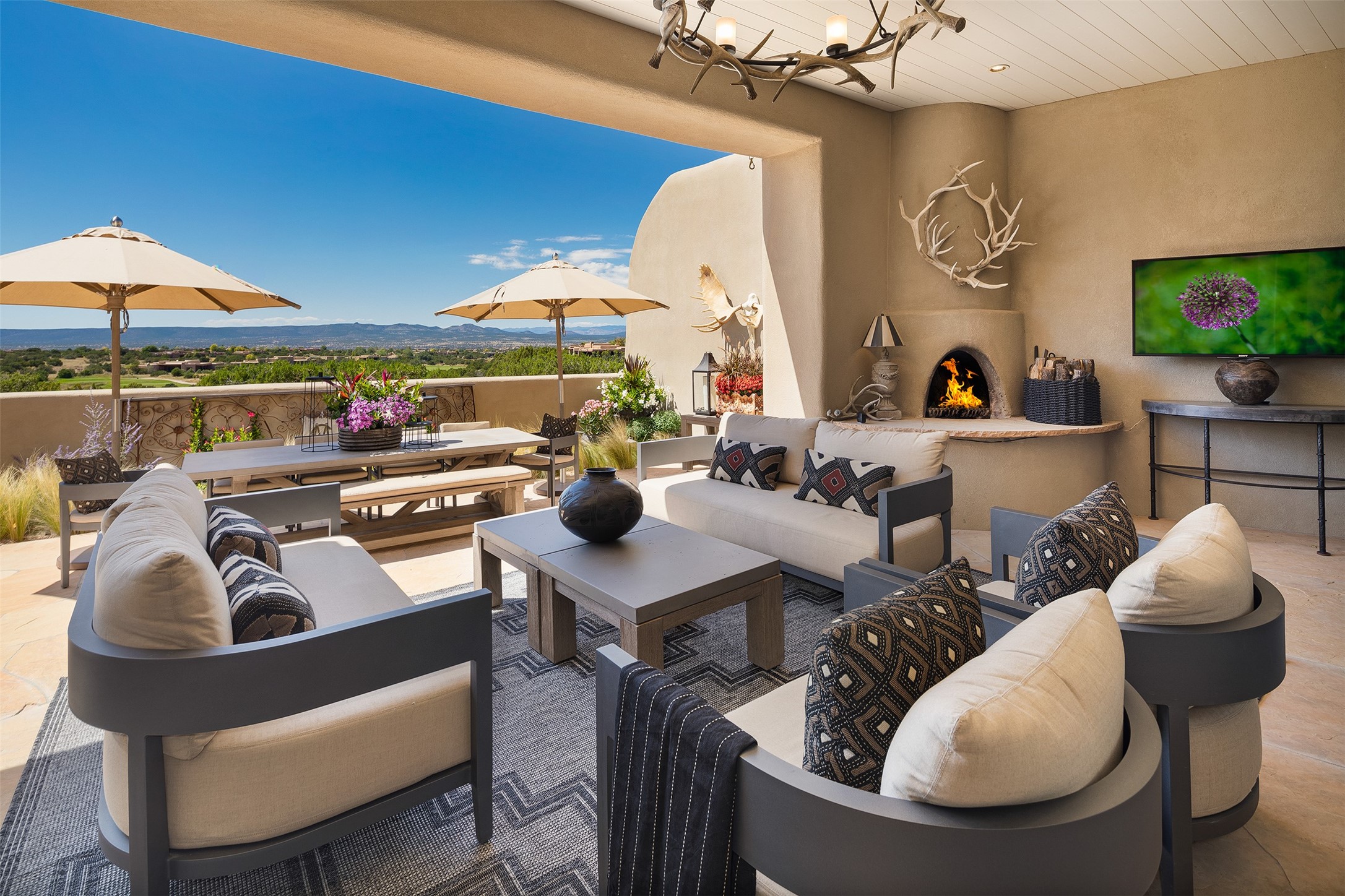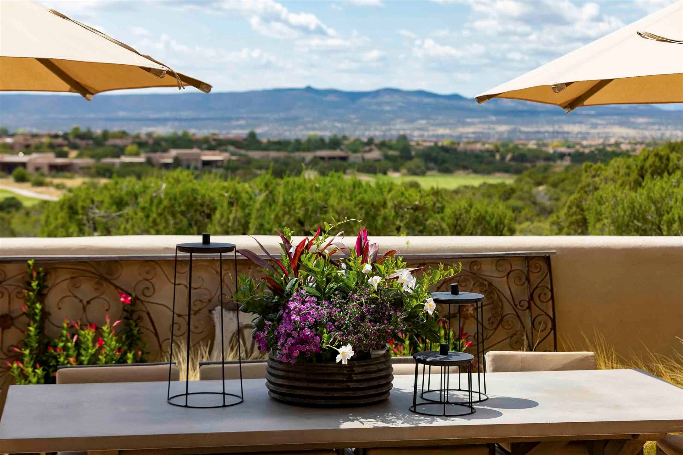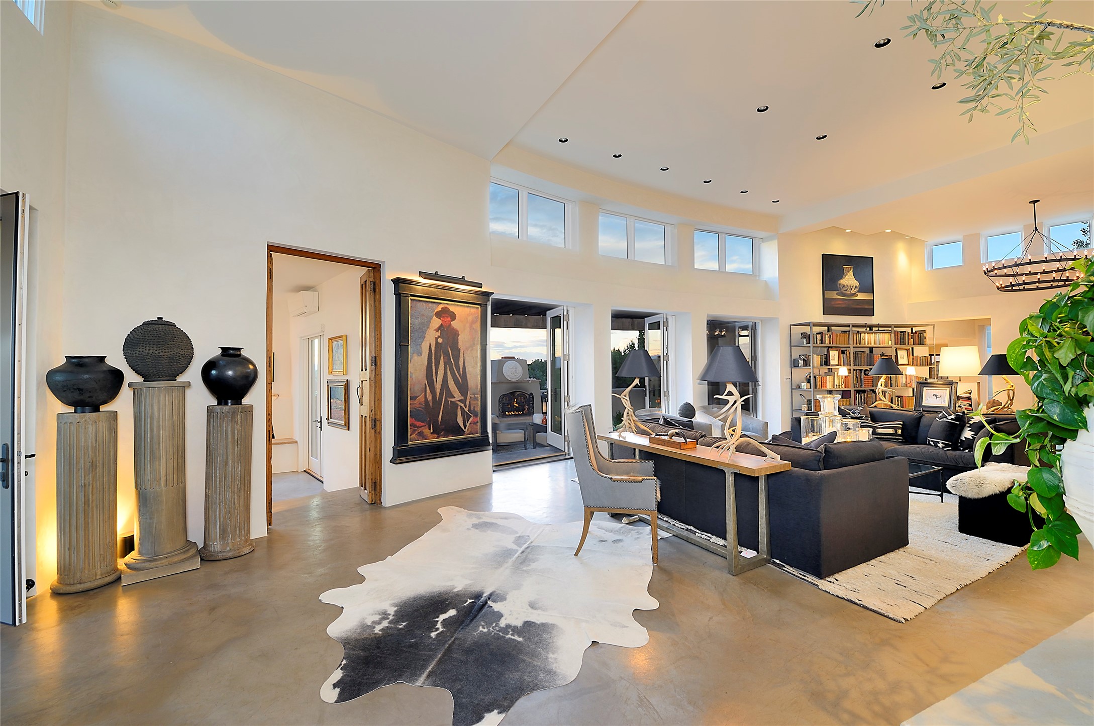 One of the most extraordinary homes in all of Santa Fe, this captivating residence by the award-winning builder, Tierra Concepts, stuns with contemporary architecture, majestic, expansive mountain, golf course and sunset views. Perched on an elevated double lot, with unmatched privacy on 4.5 acres, overlooking the Jack Nicklaus designed Sunrise Golf Course, within the famed community of Las Campanas and the coveted Wildhorse Estates, this exquisite home exemplifies the unique blend of modern design with the warmth of New Mexican accents. Defining features begin with the long, private, concrete driveway, entering the custom carved courtyard doors and vibrant landscape. This tranquil retreat offers 3 bedrooms, 4 baths, plus a media room/office with portal access. The 55' great room excites with surround mountain views, high ceilings, vast walls for art, clerestory windows, 9 double atrium glass doors which lead to the dual outdoor portals. The well-appointed kitchen with fireplace impresses with a large island and seating, walk-in pantry, dual sinks, and Wolf, Viking, Sub-Zero, Bosch, and Miele appliances, all of which opens to a breakfast dining area, casual sitting room, outdoor built-in BBQ and dining area. Off the kitchen is a wine bar and formal dining room with a 350-bottle glassed wine wall and fireplace. Luxurious owner's suite with a sitting area, fireplace, spa-like bath, floating vanity, dual sinks, soaking tub, steam shower and walk-in closet. Two spacious ensuite bedrooms with views, built-in desks, and fireplaces. Seamless outdoor living experience is enhanced with 2 generous, private, walled courtyards with deep portals, 2 fireplaces and RH Design outdoor furnishings. Highlights include soft, natural light, with 7 fireplaces, 14 recessed skylights, 6 imported double antique doors, and creamy white plaster walls. Substantially furnished by RH Design, inside and out. Featured in an 8-page spread in Western Art Collector Magazine and Su Casa Magazine.