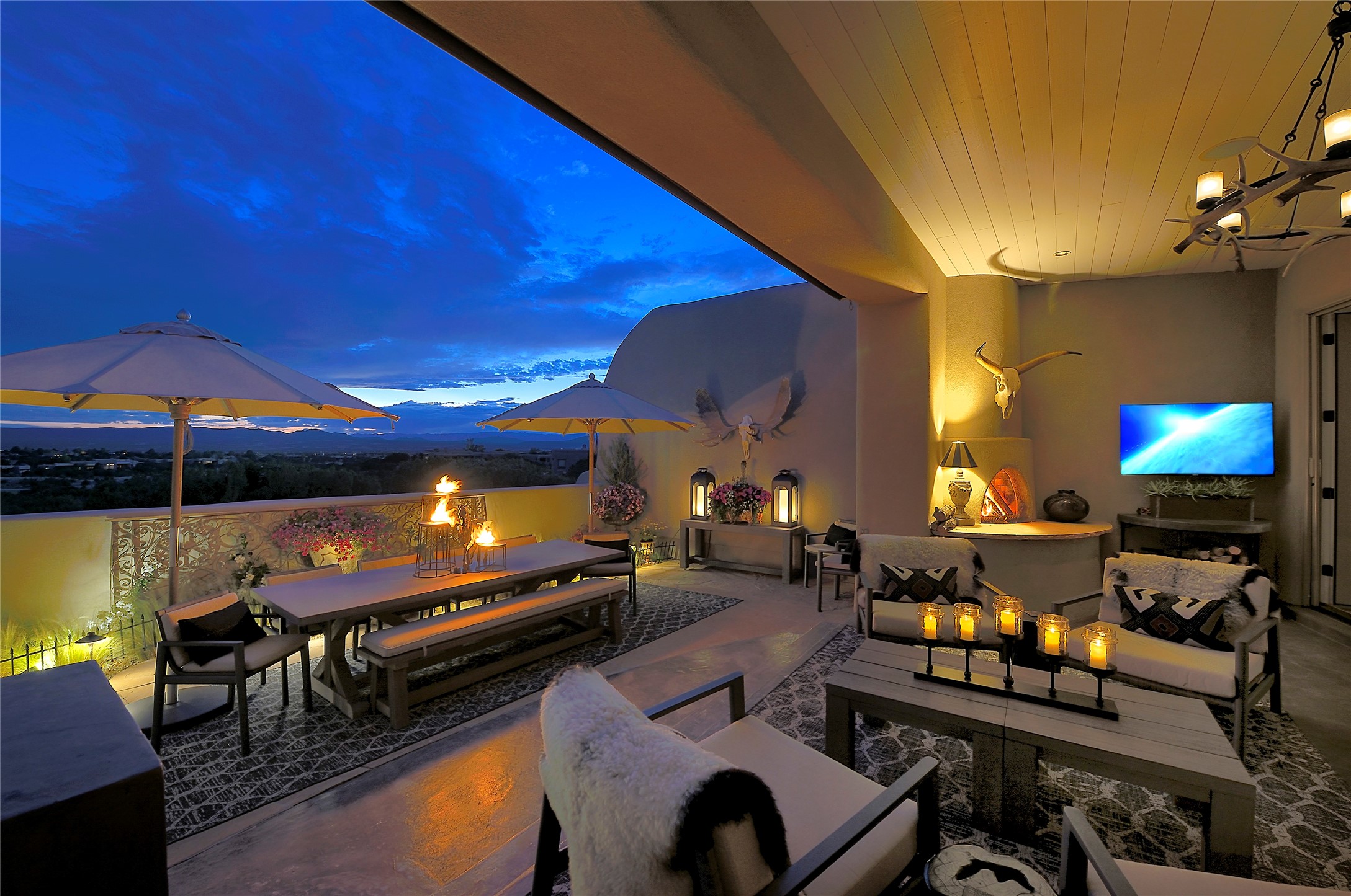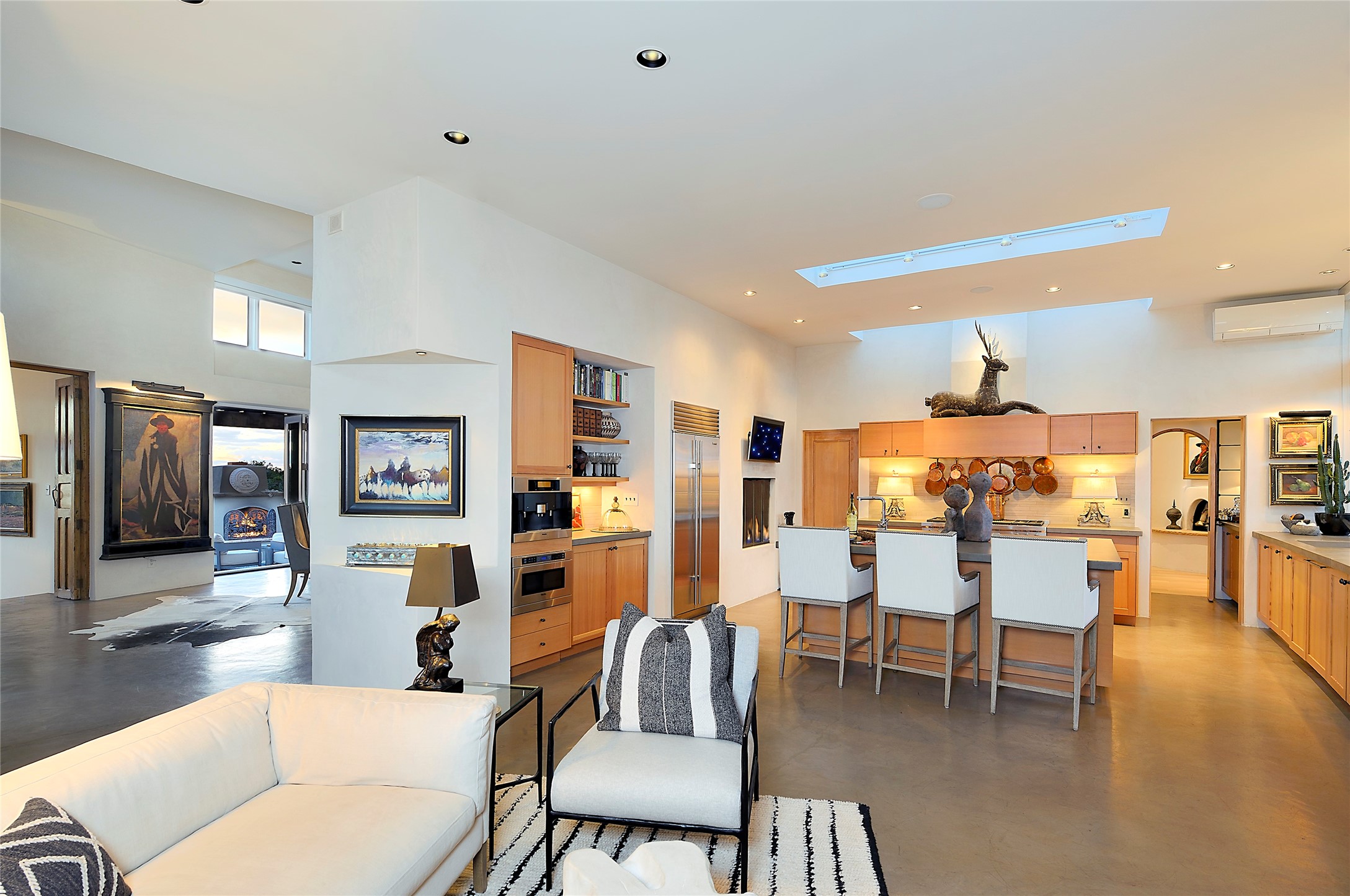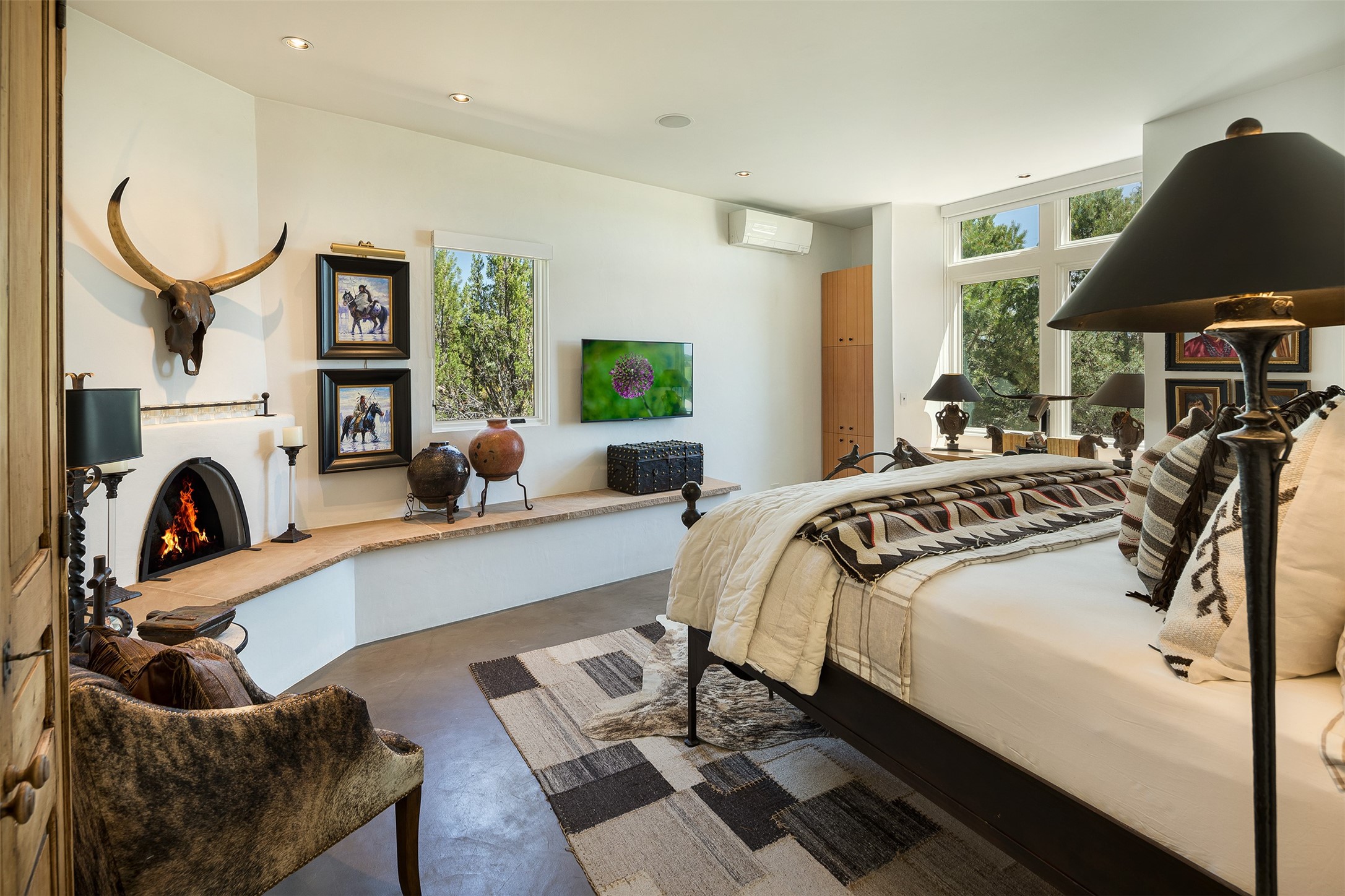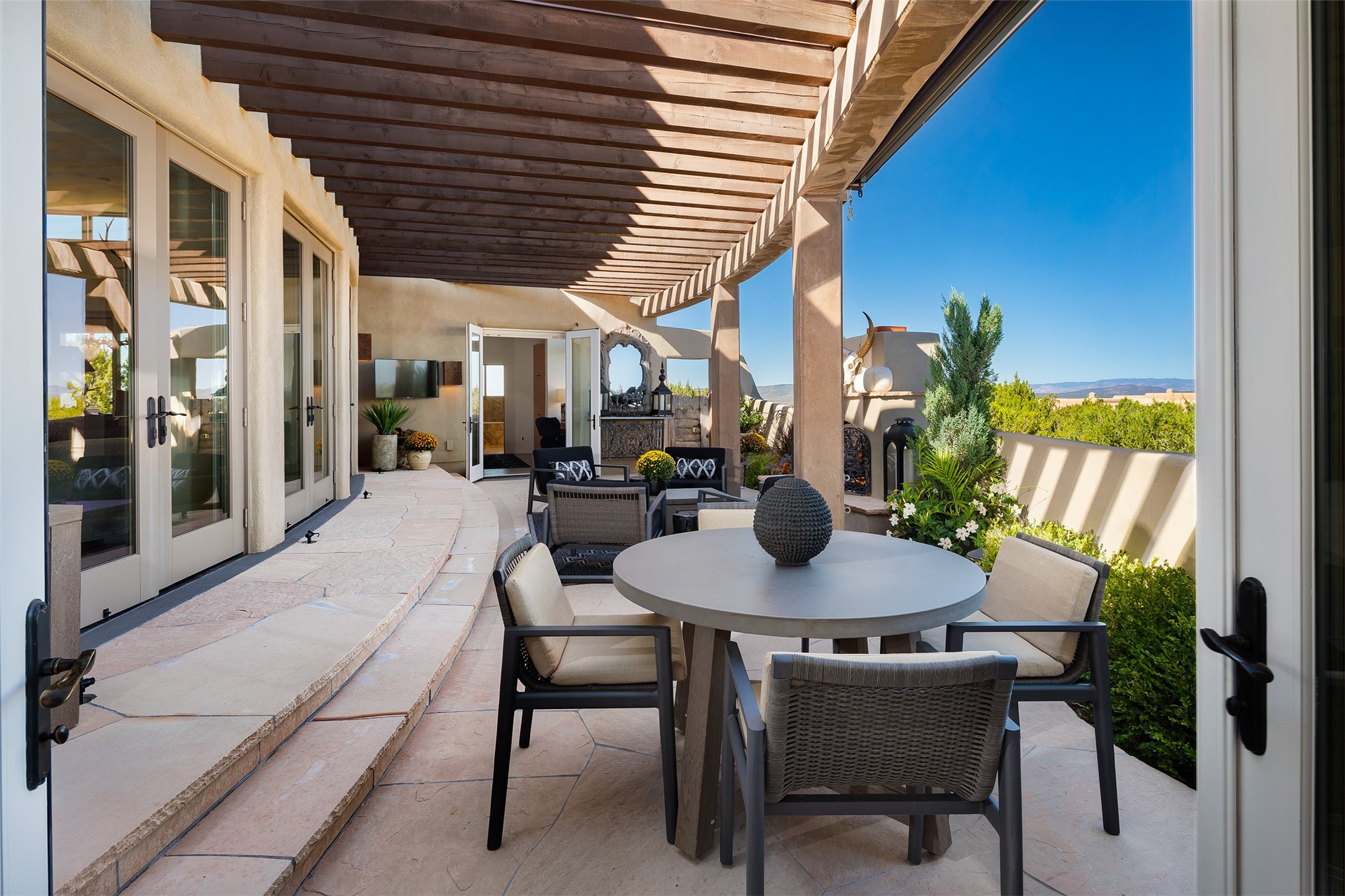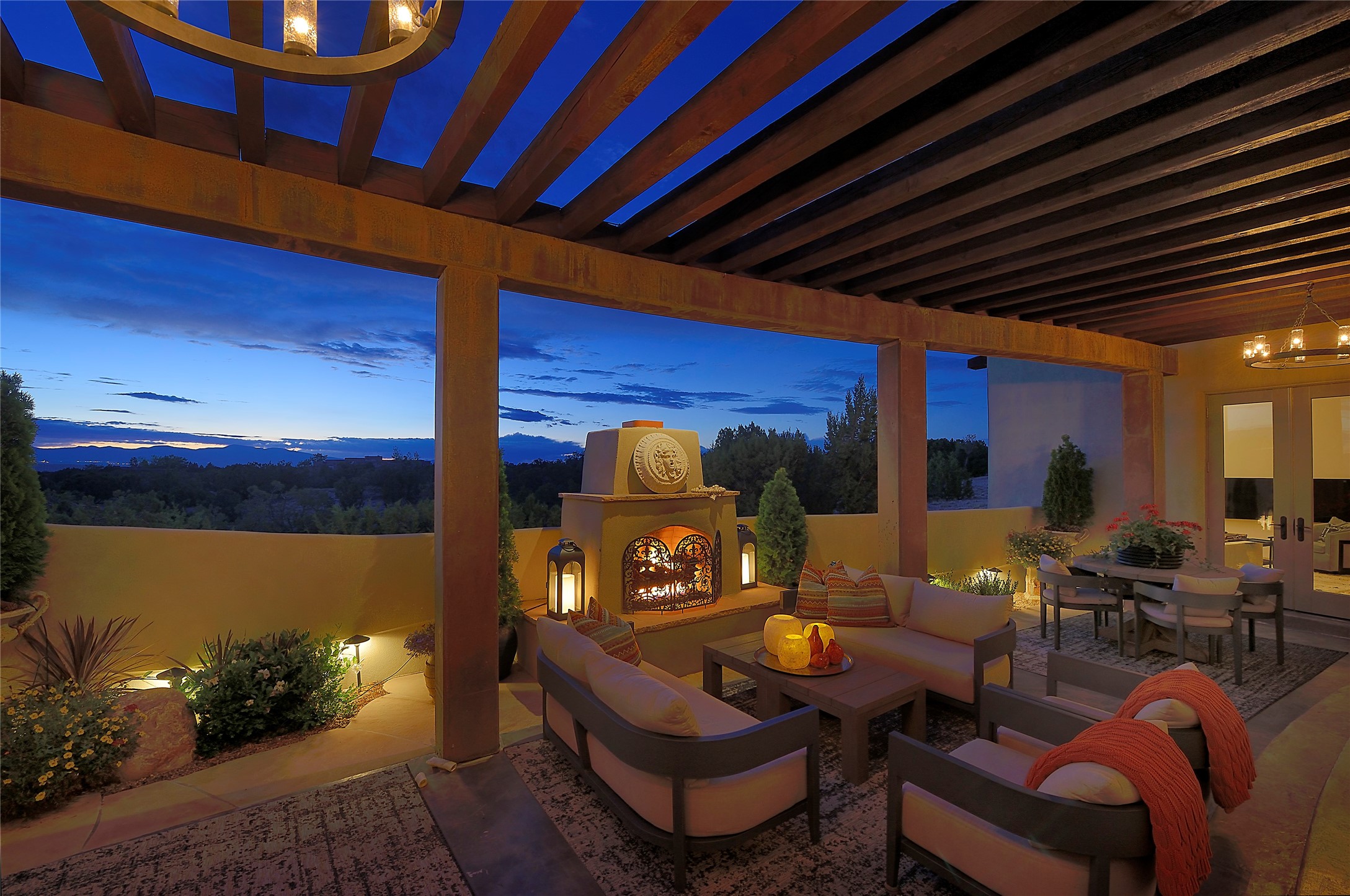 One of the most extraordinary homes in all of Santa Fe, this captivating residence by the award-winning builder, Tierra Concepts, stuns with contemporary architecture, majestic, expansive mountain, golf course and sunset views. Perched on an elevated double lot, with unmatched privacy on 4.5 acres, overlooking the Jack Nicklaus designed Sunrise Golf Course, within the famed community of Las Campanas and the coveted Wildhorse Estates, this exquisite home exemplifies the unique blend of modern design with the warmth of New Mexican accents. Defining features begin with the long, private, concrete driveway, entering the custom carved courtyard doors and vibrant landscape. This tranquil retreat offers 3 bedrooms, 4 baths, plus a media room/office with portal access. The 55' great room excites with surround mountain views, high ceilings, vast walls for art, clerestory windows, 9 double atrium glass doors which lead to the dual outdoor portals. The well-appointed kitchen with fireplace impresses with a large island and seating, walk-in pantry, dual sinks, and Wolf, Viking, Sub-Zero, Bosch, and Miele appliances, all of which opens to a breakfast dining area, casual sitting room, outdoor built-in BBQ and dining area. Off the kitchen is a wine bar and formal dining room with a 350-bottle glassed wine wall and fireplace. Luxurious owner's suite with a sitting area, fireplace, spa-like bath, floating vanity, dual sinks, soaking tub, steam shower and walk-in closet. Two spacious ensuite bedrooms with views, built-in desks, and fireplaces. Seamless outdoor living experience is enhanced with 2 generous, private, walled courtyards with deep portals, 2 fireplaces and RH Design outdoor furnishings. Highlights include soft, natural light, with 7 fireplaces, 14 recessed skylights, 6 imported double antique doors, and creamy white plaster walls. Substantially furnished by RH Design, inside and out. Featured in an 8-page spread in Western Art Collector Magazine and Su Casa Magazine.