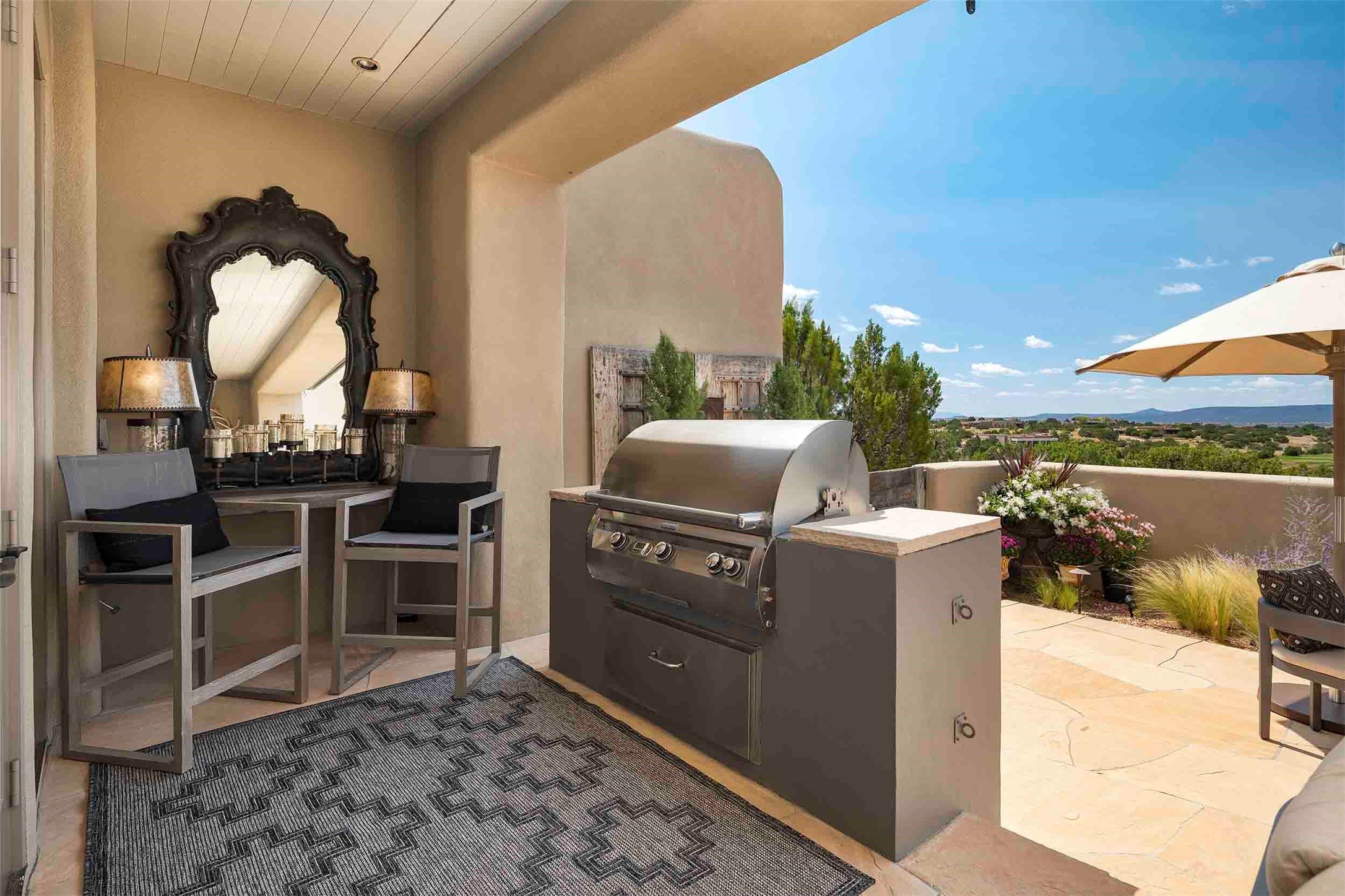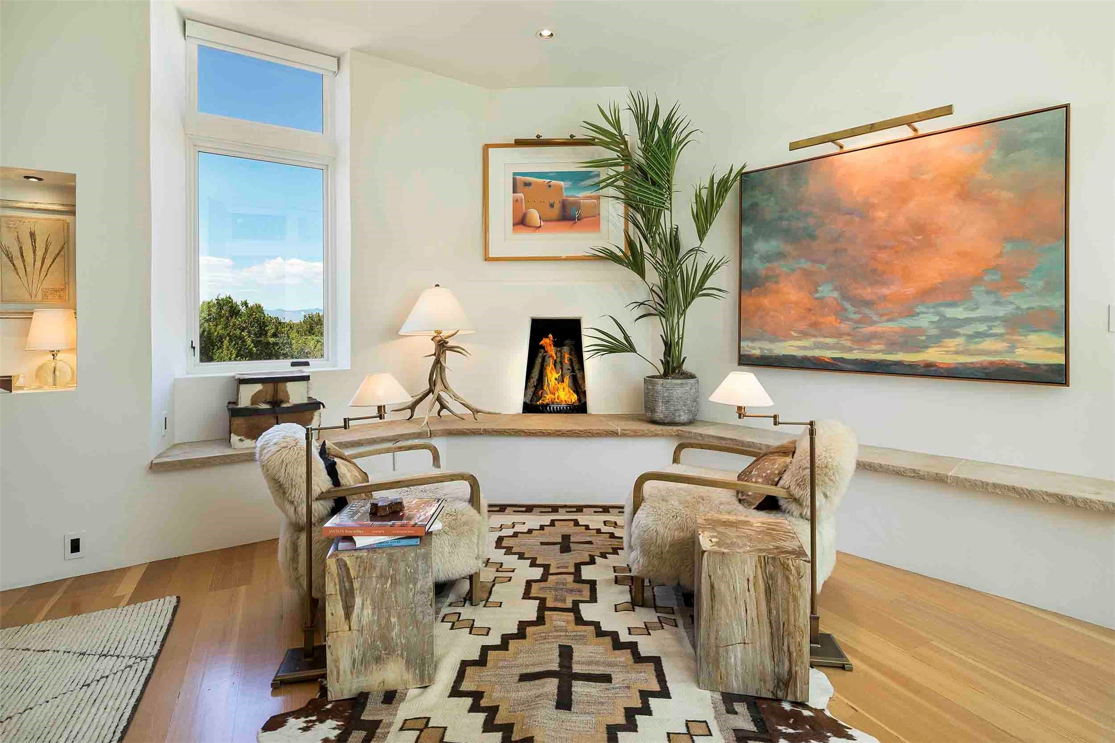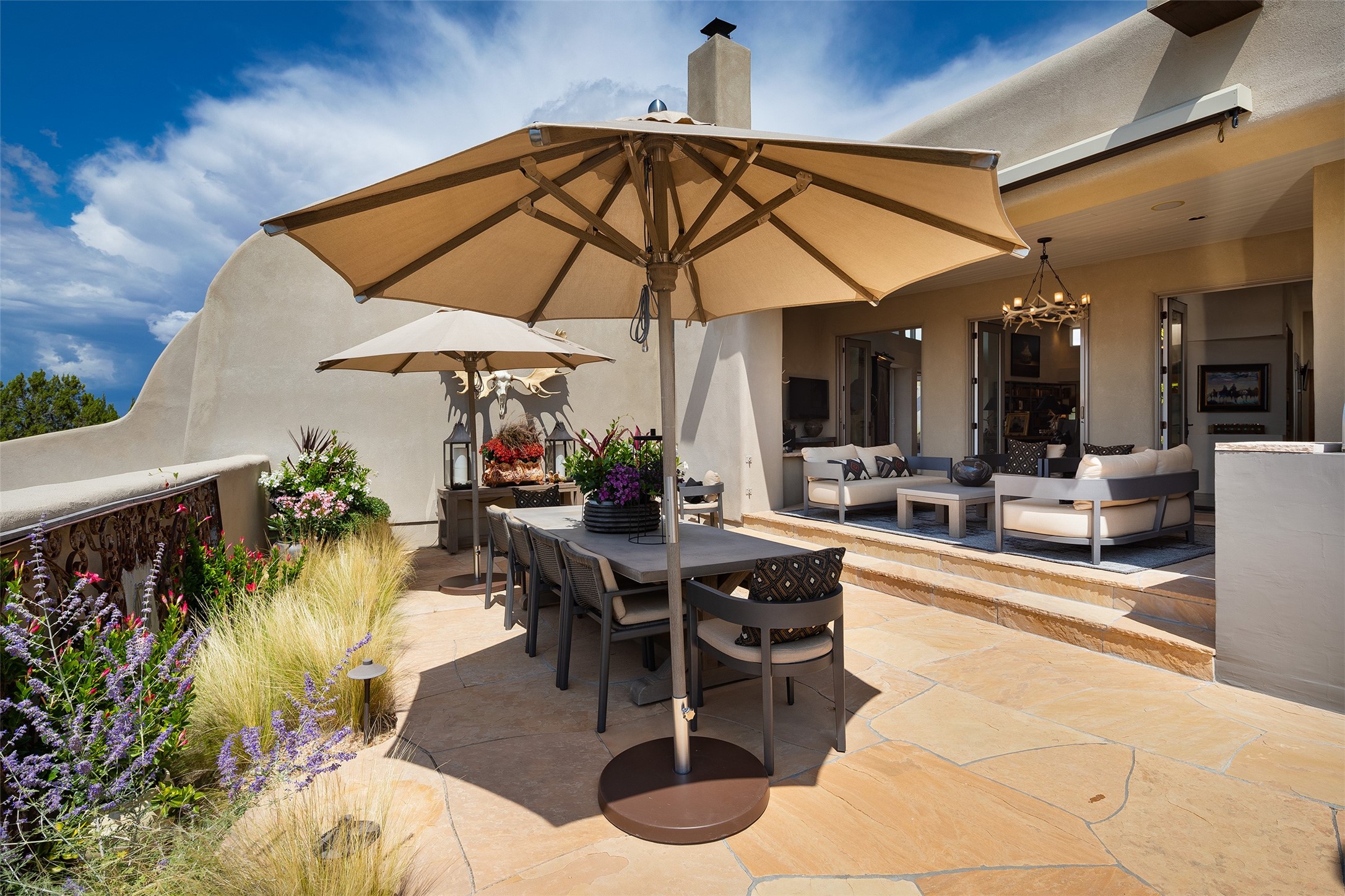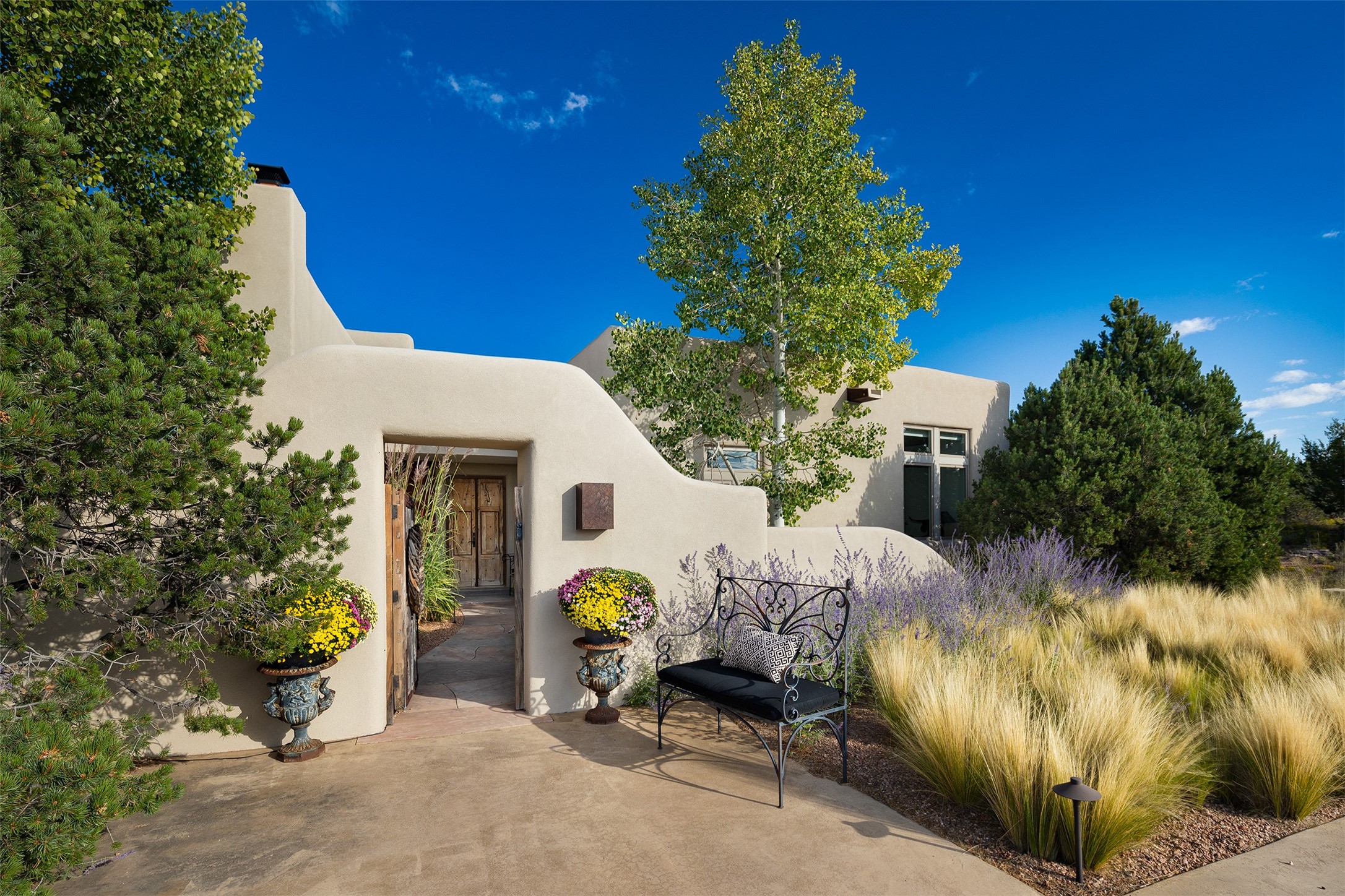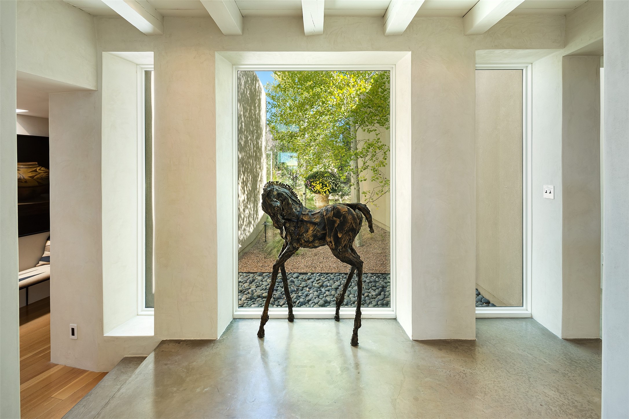One of the most extraordinary homes in all of Santa Fe, this captivating residence by the award-winning builder, Tierra Concepts, stuns with contemporary architecture, majestic, expansive mountain, golf course and sunset views. Perched on an elevated double lot, with unmatched privacy on 4.5 acres, overlooking the Jack Nicklaus designed Sunrise Golf Course, within the famed community of Las Campanas and the coveted Wildhorse Estates, this exquisite home exemplifies the unique blend of modern design with the warmth of New Mexican accents. Defining features begin with the long, private, concrete driveway, entering the custom carved courtyard doors and vibrant landscape. This tranquil retreat offers 3 bedrooms, 4 baths, plus a media room/office with portal access. The 55' great room excites with surround mountain views, high ceilings, vast walls for art, clerestory windows, 9 double atrium glass doors which lead to the dual outdoor portals. The well-appointed kitchen with fireplace impresses with a large island and seating, walk-in pantry, dual sinks, and Wolf, Viking, Sub-Zero, Bosch, and Miele appliances, all of which opens to a breakfast dining area, casual sitting room, outdoor built-in BBQ and dining area. Off the kitchen is a wine bar and formal dining room with a 350-bottle glassed wine wall and fireplace. Luxurious owner's suite with a sitting area, fireplace, spa-like bath, floating vanity, dual sinks, soaking tub, steam shower and walk-in closet. Two spacious ensuite bedrooms with views, built-in desks, and fireplaces. Seamless outdoor living experience is enhanced with 2 generous, private, walled courtyards with deep portals, 2 fireplaces and RH Design outdoor furnishings. Highlights include soft, natural light, with 7 fireplaces, 14 recessed skylights, 6 imported double antique doors, and creamy white plaster walls. Substantially furnished by RH Design, inside and out. Featured in an 8-page spread in Western Art Collector Magazine and Su Casa Magazine.
