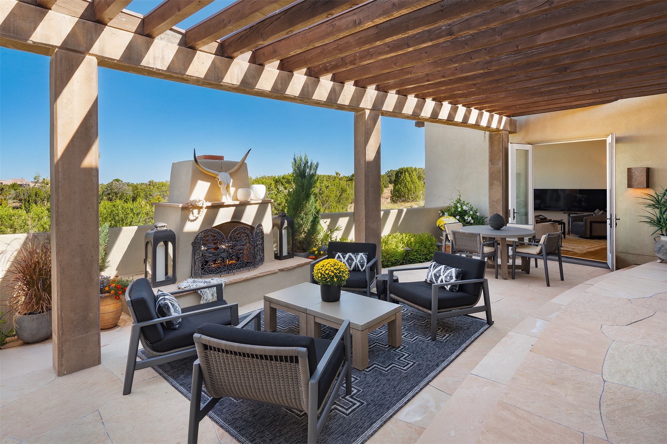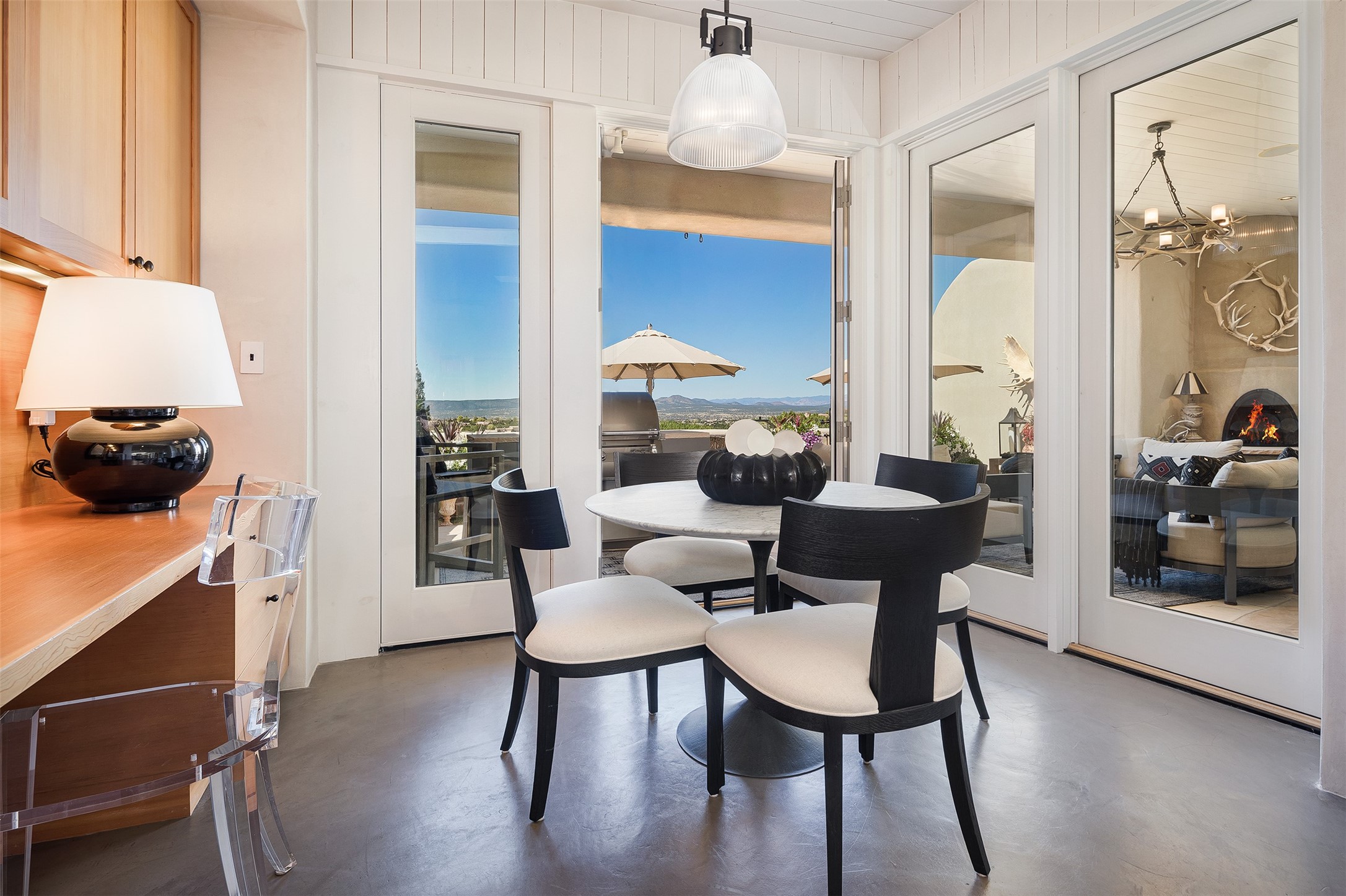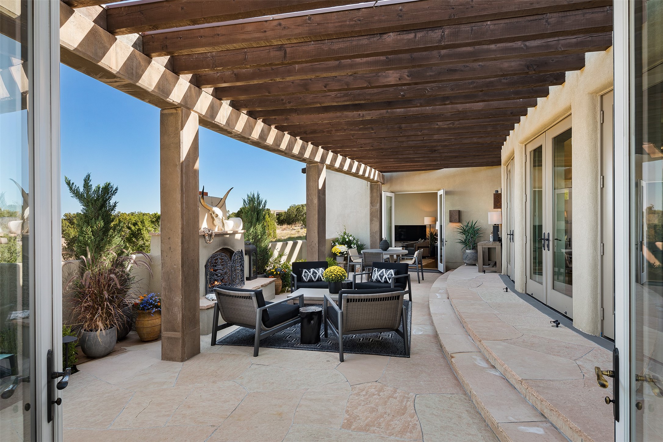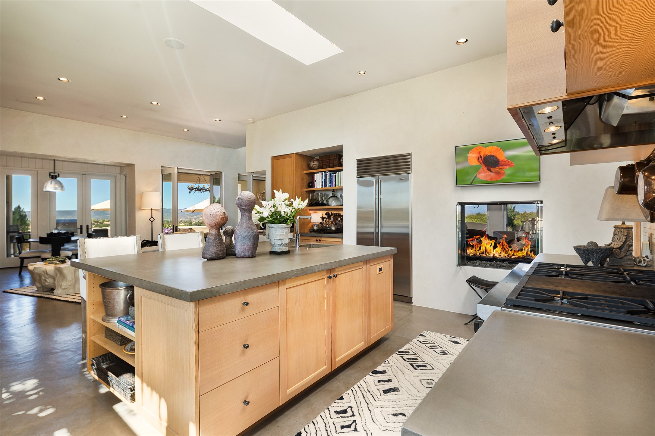 One of the most extraordinary homes in all of Santa Fe, this captivating residence by the award-winning builder, Tierra Concepts, stuns with contemporary architecture, majestic, expansive mountain, golf course and sunset views. Perched on an elevated double lot, with unmatched privacy on 4.5 acres, overlooking the Jack Nicklaus designed Sunrise Golf Course, within the famed community of Las Campanas and the coveted Wildhorse Estates, this exquisite home exemplifies the unique blend of modern design with the warmth of New Mexican accents. Defining features begin with the long, private, concrete driveway, entering the custom carved courtyard doors and vibrant landscape. This tranquil retreat offers 3 bedrooms, 4 baths, plus a media room/office with portal access. The 55' great room excites with surround mountain views, high ceilings, vast walls for art, clerestory windows, 9 double atrium glass doors which lead to the dual outdoor portals. The well-appointed kitchen with fireplace impresses with a large island and seating, walk-in pantry, dual sinks, and Wolf, Viking, Sub-Zero, Bosch, and Miele appliances, all of which opens to a breakfast dining area, casual sitting room, outdoor built-in BBQ and dining area. Off the kitchen is a wine bar and formal dining room with a 350-bottle glassed wine wall and fireplace. Luxurious owner's suite with a sitting area, fireplace, spa-like bath, floating vanity, dual sinks, soaking tub, steam shower and walk-in closet. Two spacious ensuite bedrooms with views, built-in desks, and fireplaces. Seamless outdoor living experience is enhanced with 2 generous, private, walled courtyards with deep portals, 2 fireplaces and RH Design outdoor furnishings. Highlights include soft, natural light, with 7 fireplaces, 14 recessed skylights, 6 imported double antique doors, and creamy white plaster walls. Substantially furnished by RH Design, inside and out. Featured in an 8-page spread in Western Art Collector Magazine and Su Casa Magazine.