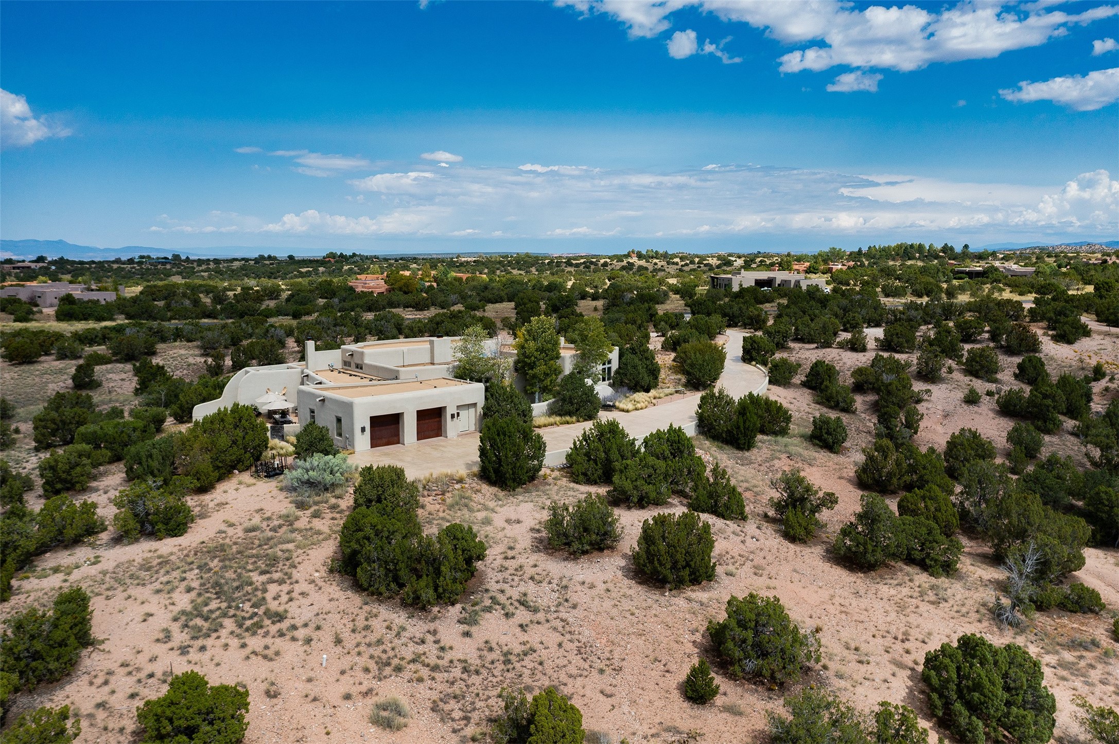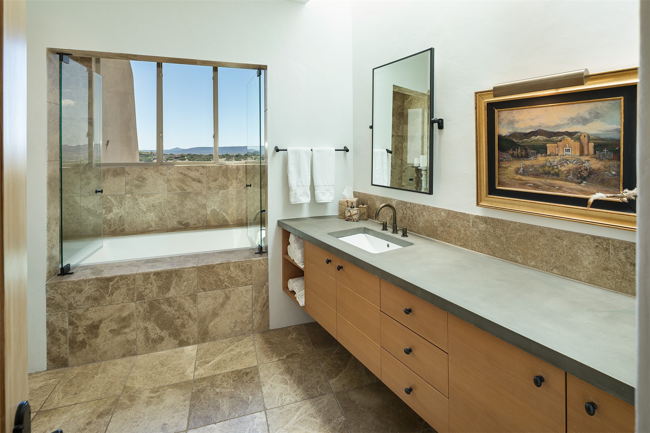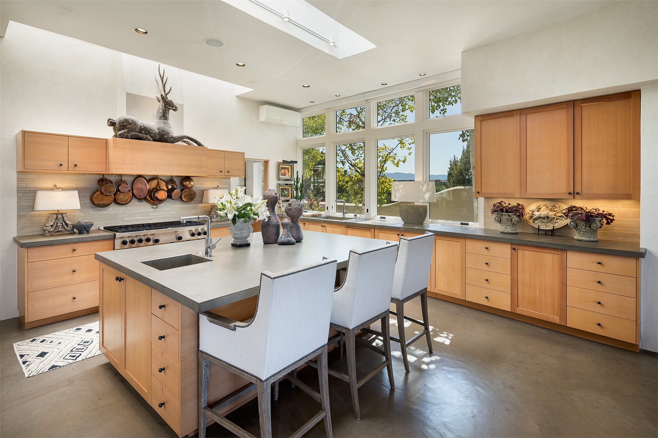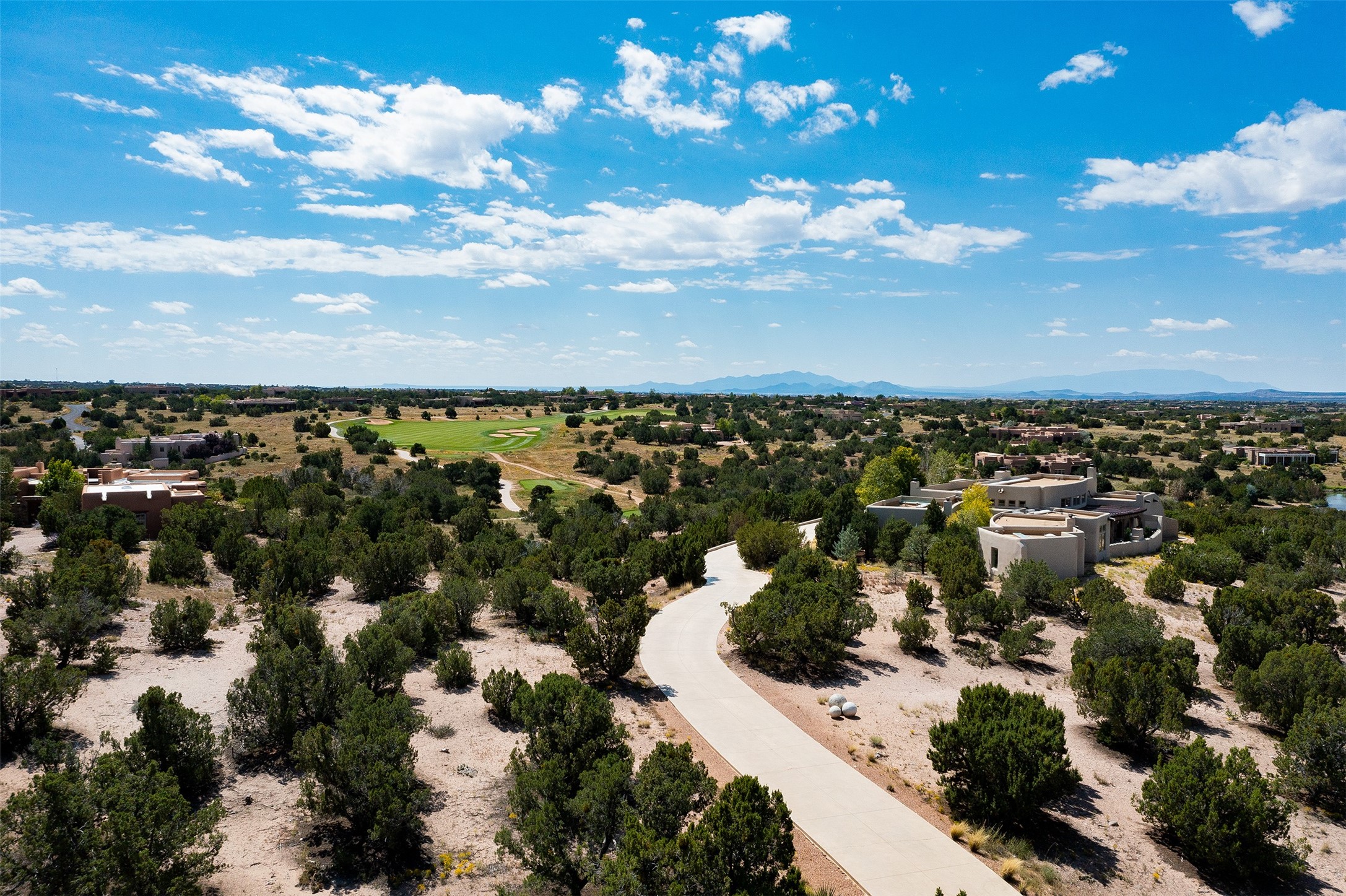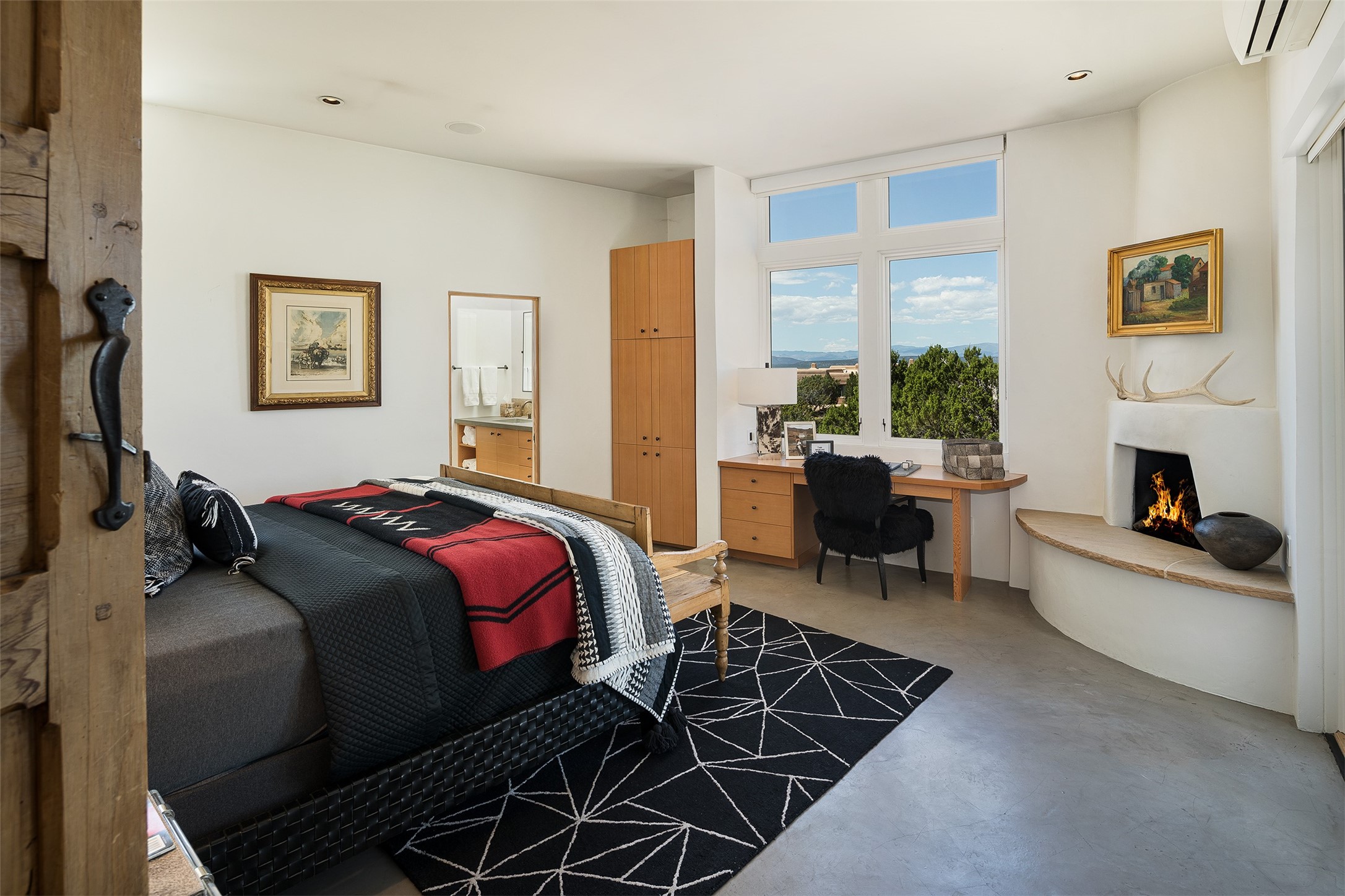 One of the most extraordinary homes in all of Santa Fe, this captivating residence by the award-winning builder, Tierra Concepts, stuns with contemporary architecture, majestic, expansive mountain, golf course and sunset views. Perched on an elevated double lot, with unmatched privacy on 4.5 acres, overlooking the Jack Nicklaus designed Sunrise Golf Course, within the famed community of Las Campanas and the coveted Wildhorse Estates, this exquisite home exemplifies the unique blend of modern design with the warmth of New Mexican accents. Defining features begin with the long, private, concrete driveway, entering the custom carved courtyard doors and vibrant landscape. This tranquil retreat offers 3 bedrooms, 4 baths, plus a media room/office with portal access. The 55' great room excites with surround mountain views, high ceilings, vast walls for art, clerestory windows, 9 double atrium glass doors which lead to the dual outdoor portals. The well-appointed kitchen with fireplace impresses with a large island and seating, walk-in pantry, dual sinks, and Wolf, Viking, Sub-Zero, Bosch, and Miele appliances, all of which opens to a breakfast dining area, casual sitting room, outdoor built-in BBQ and dining area. Off the kitchen is a wine bar and formal dining room with a 350-bottle glassed wine wall and fireplace. Luxurious owner's suite with a sitting area, fireplace, spa-like bath, floating vanity, dual sinks, soaking tub, steam shower and walk-in closet. Two spacious ensuite bedrooms with views, built-in desks, and fireplaces. Seamless outdoor living experience is enhanced with 2 generous, private, walled courtyards with deep portals, 2 fireplaces and RH Design outdoor furnishings. Highlights include soft, natural light, with 7 fireplaces, 14 recessed skylights, 6 imported double antique doors, and creamy white plaster walls. Substantially furnished by RH Design, inside and out. Featured in an 8-page spread in Western Art Collector Magazine and Su Casa Magazine.